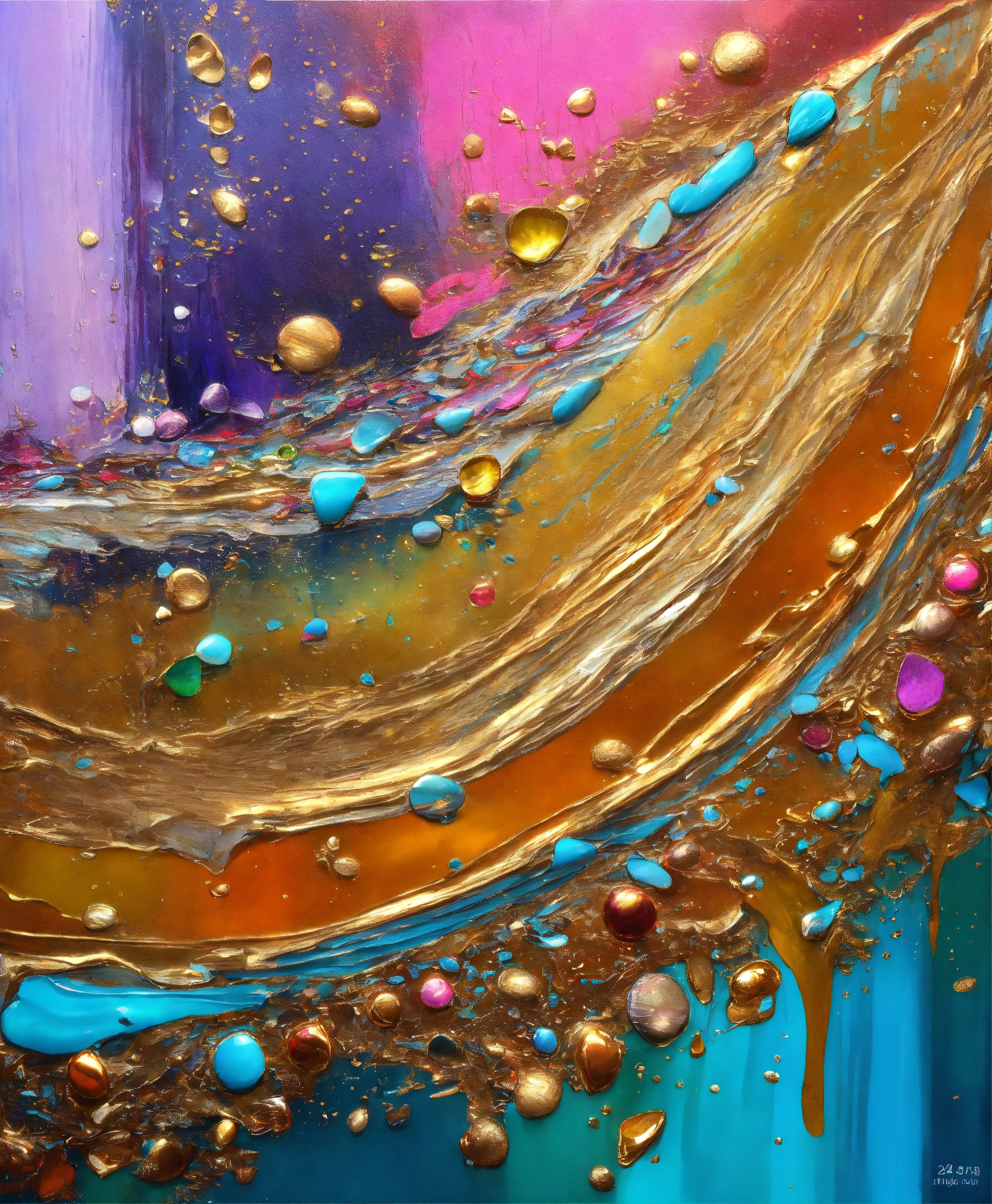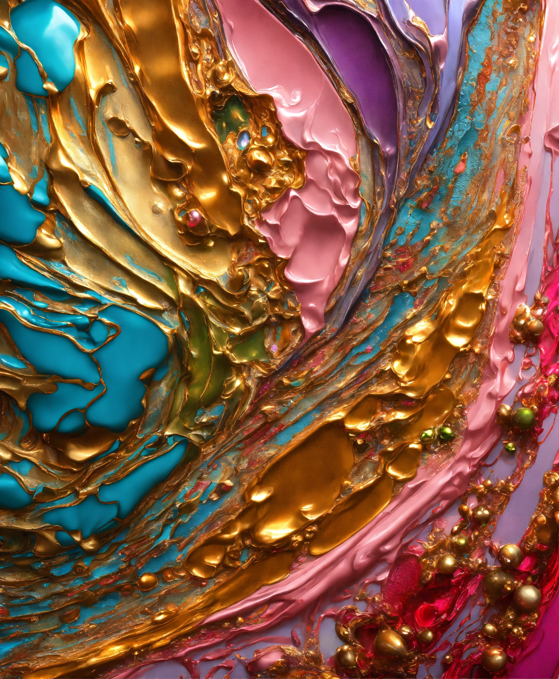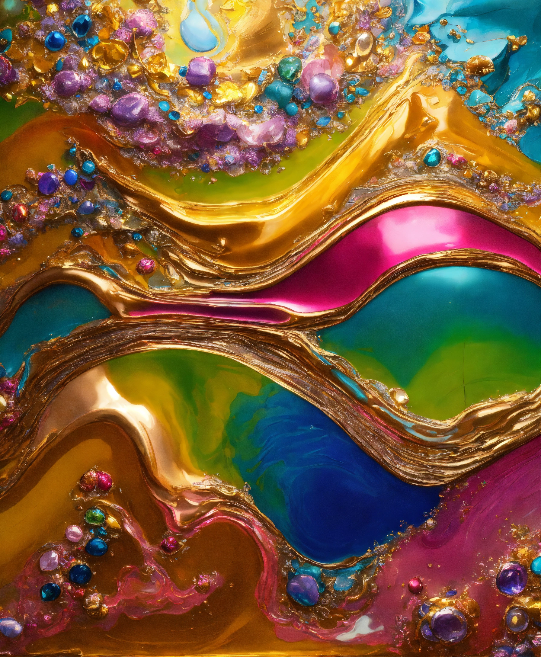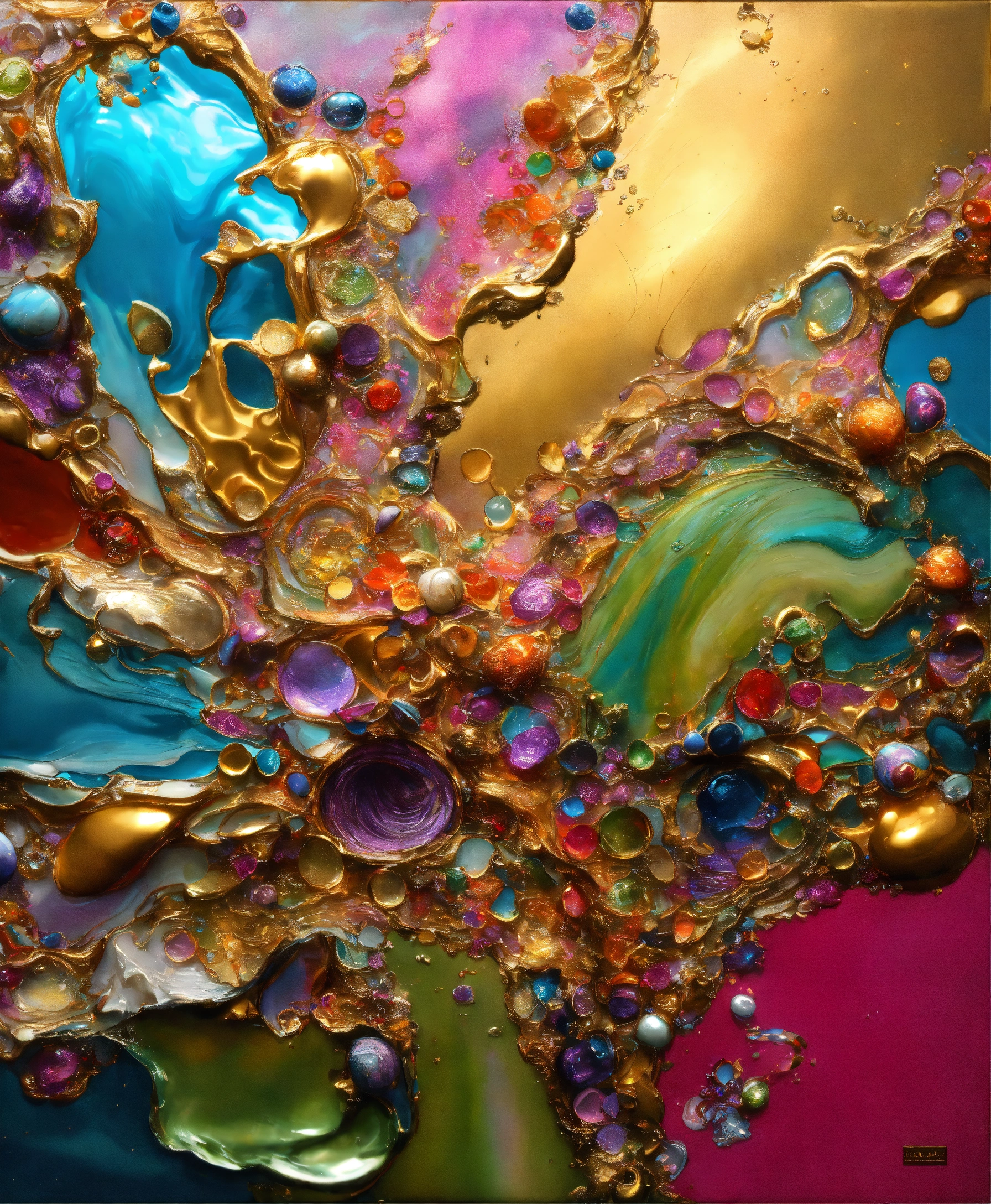 Colorful abstract painting oil and water complex complicated bright vivid colors beautiful opulent wealthy intricate all hues primary secondary and tertiary colors pink peridot sky blue lilac green magenta orange gold silver bronze copper mother of pearl magnificent amazing sublime delicate hyperdetailed masterpiece complex extraordinary metallic sheen elaborate awesome 24k bright gold and silver trims everywhere oil and water abstract art 24k gold trim everywhere glossy hyperdetailed 12k