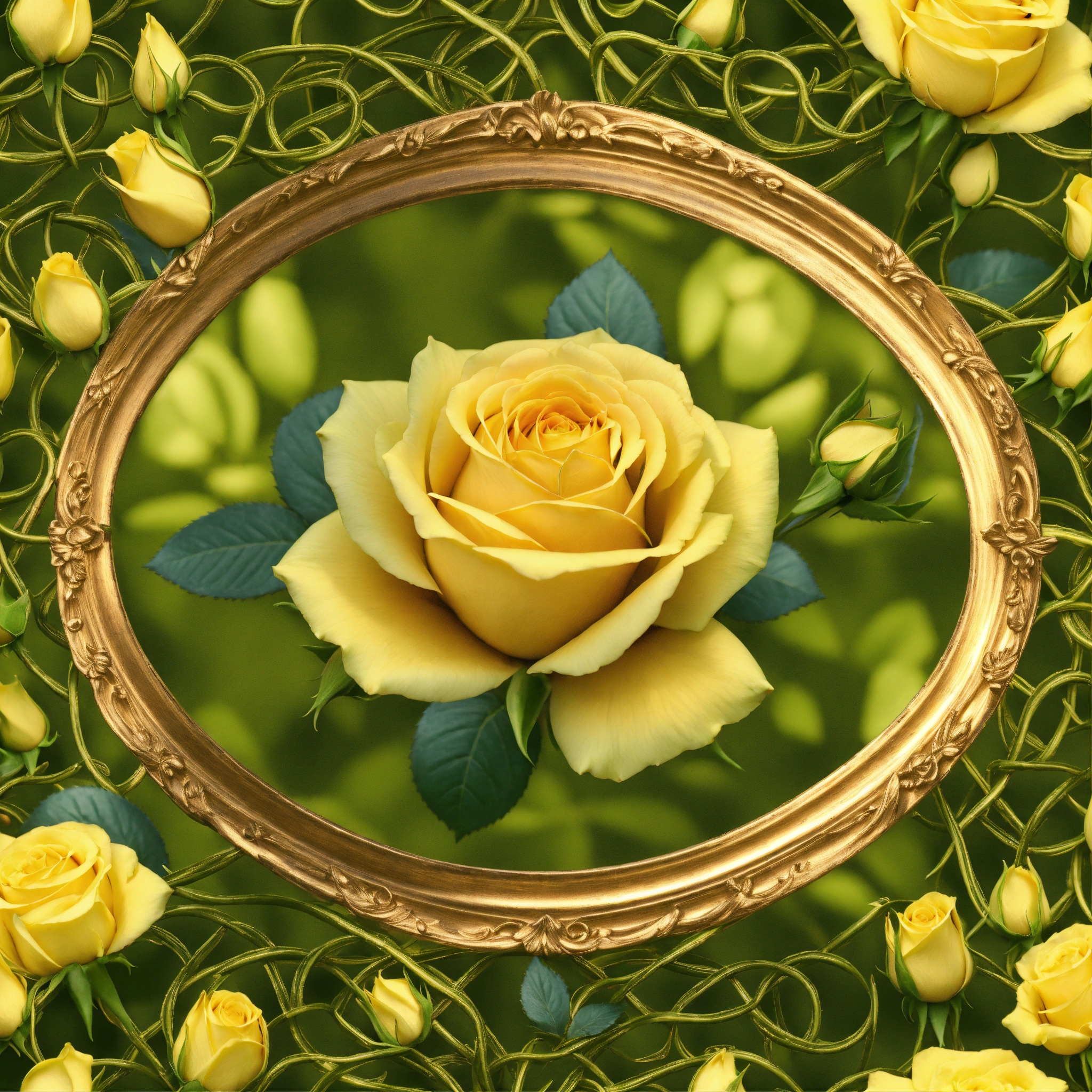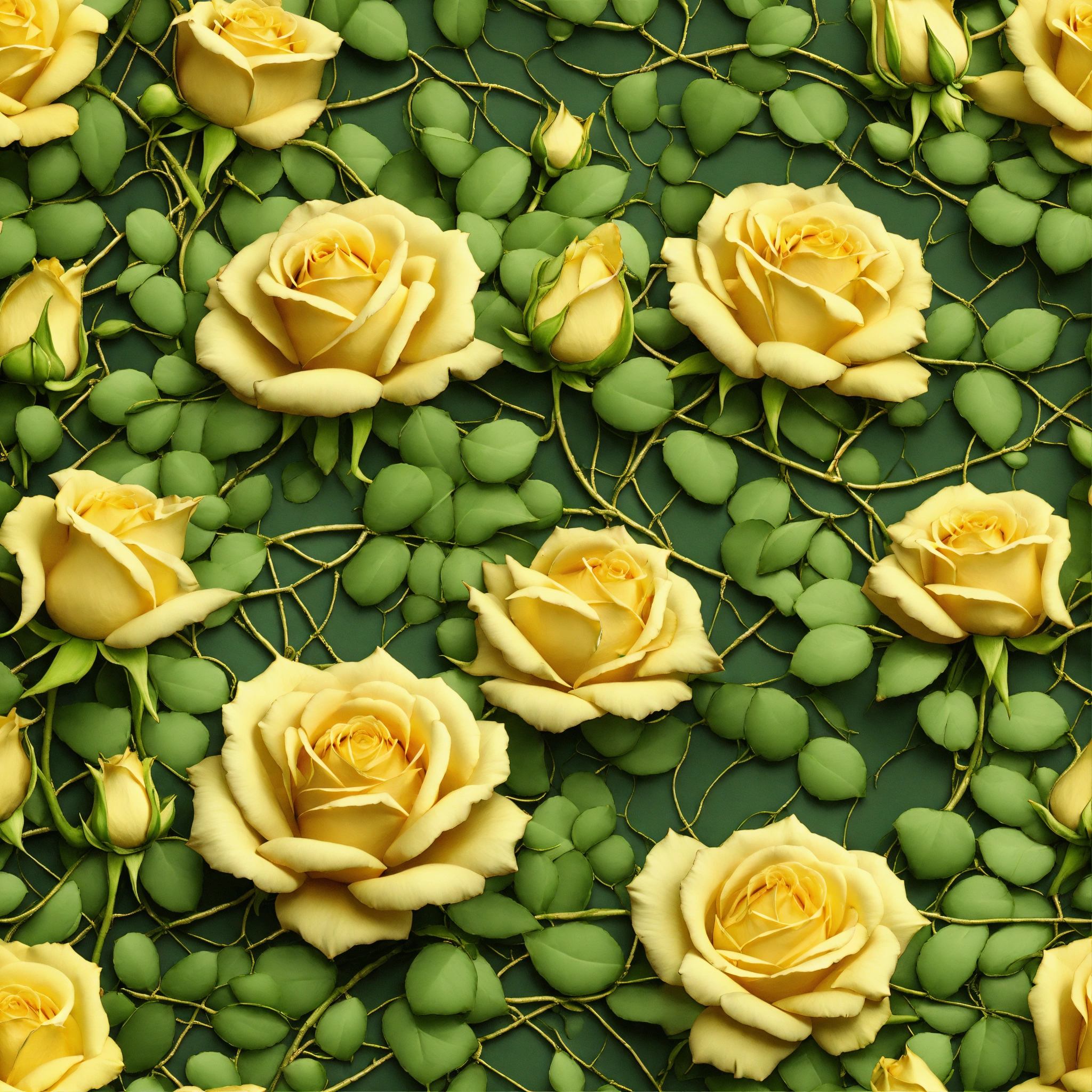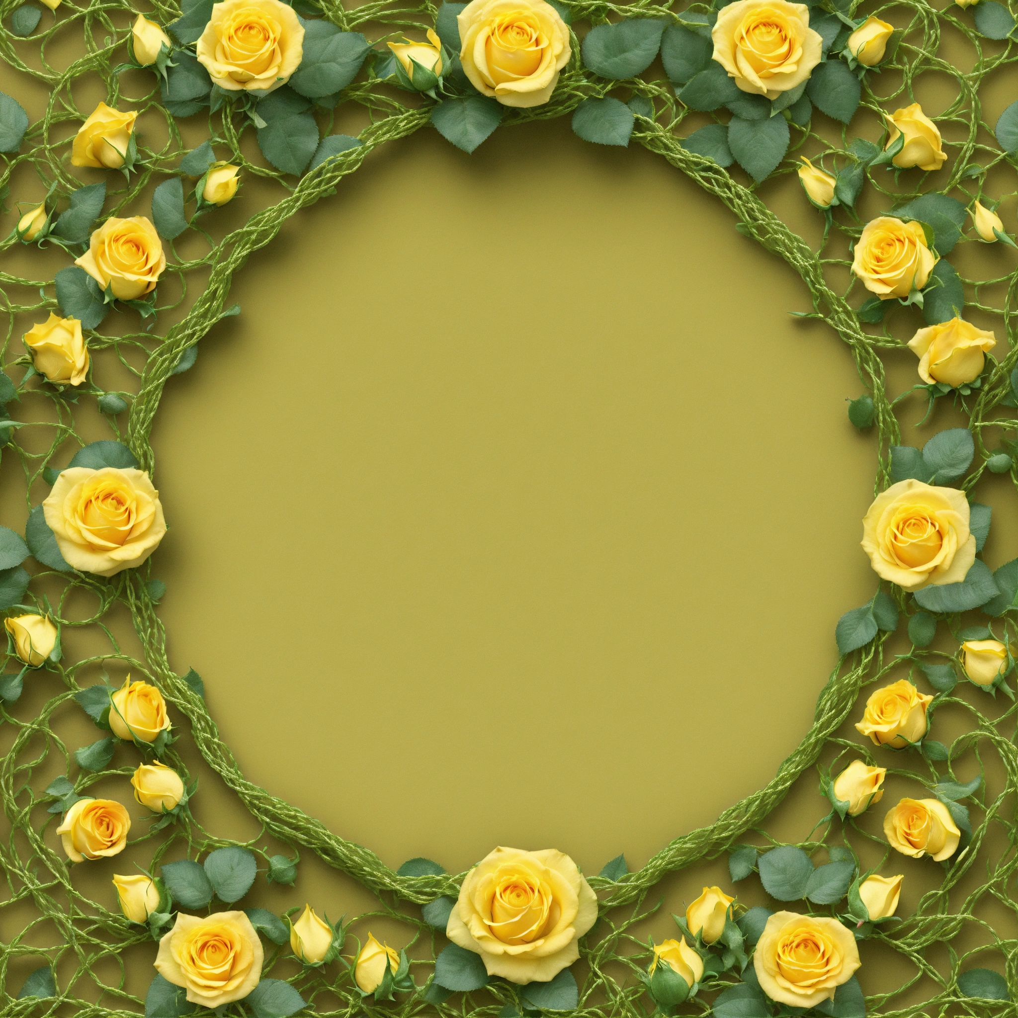 Imagine vines of many intertwined small yellow rose buds growing on an oval-shaped frame, lacy background, make it a seamless pattern, photo realistic 16k