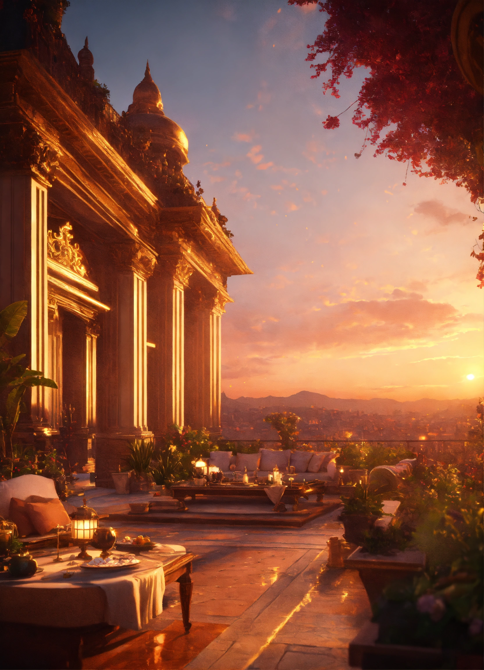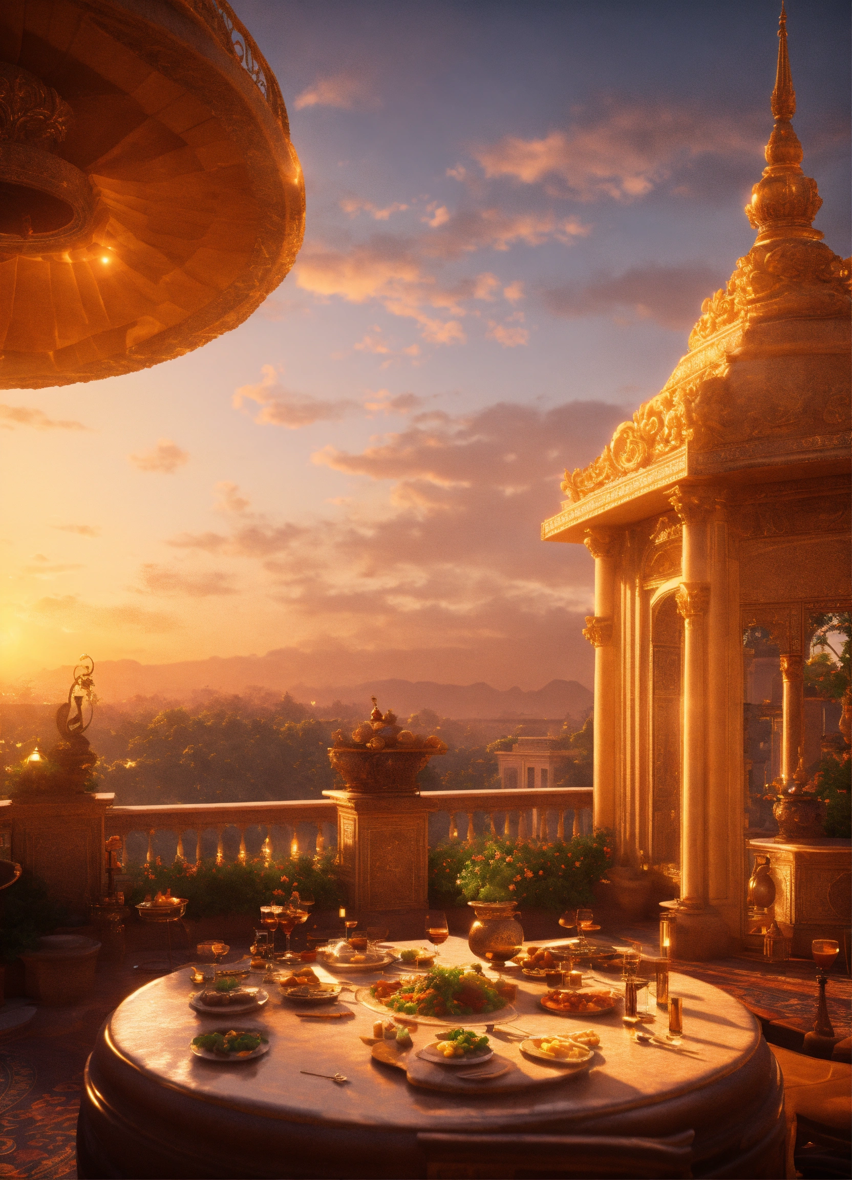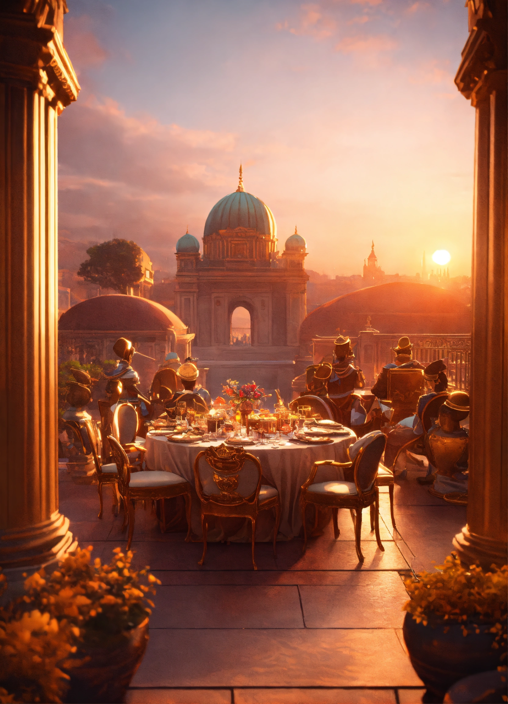 A sumptuous palace terrace at sunset. alien orchestra playing instruments, culinary extravaganza. 8k, unreal engine