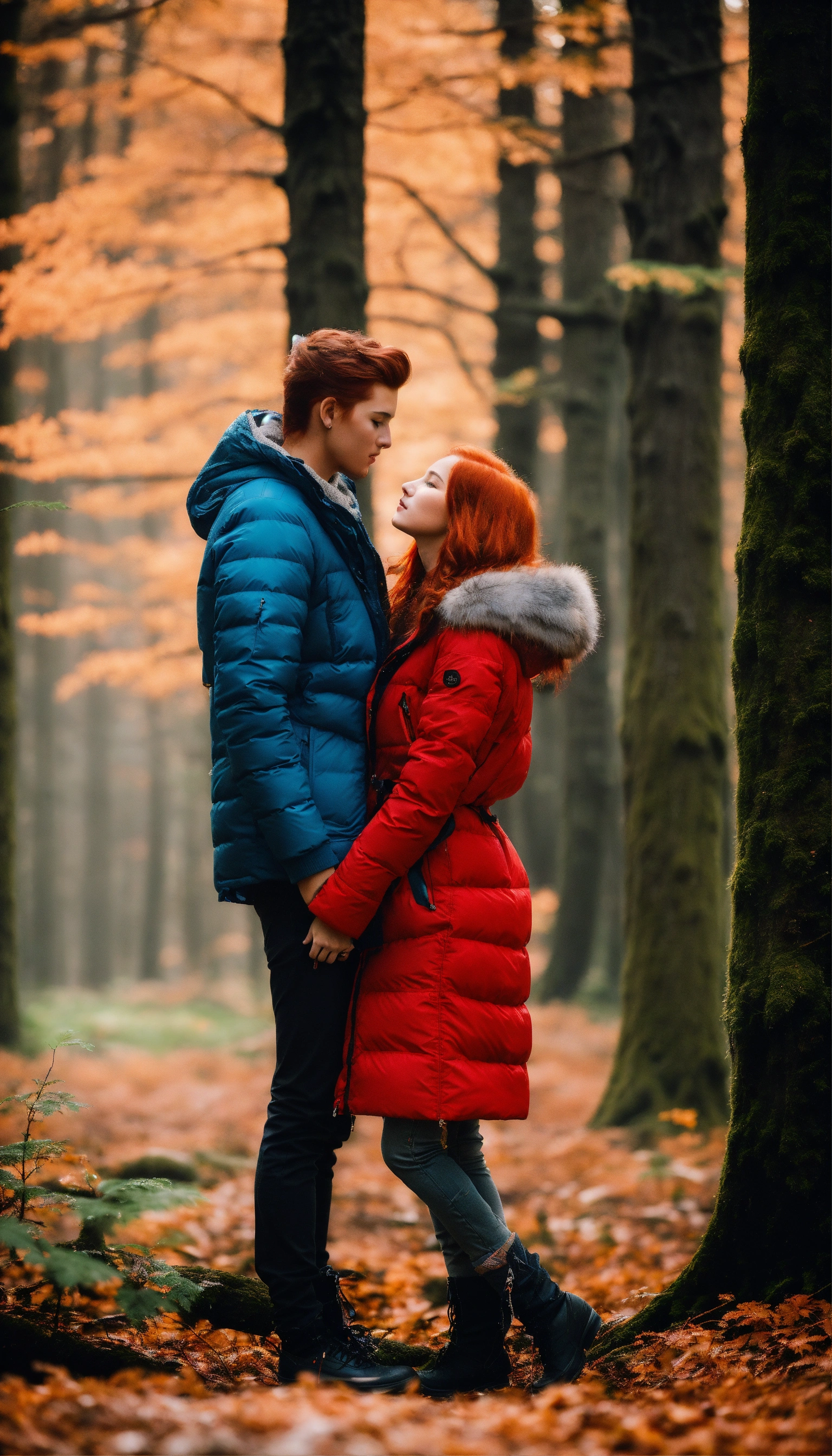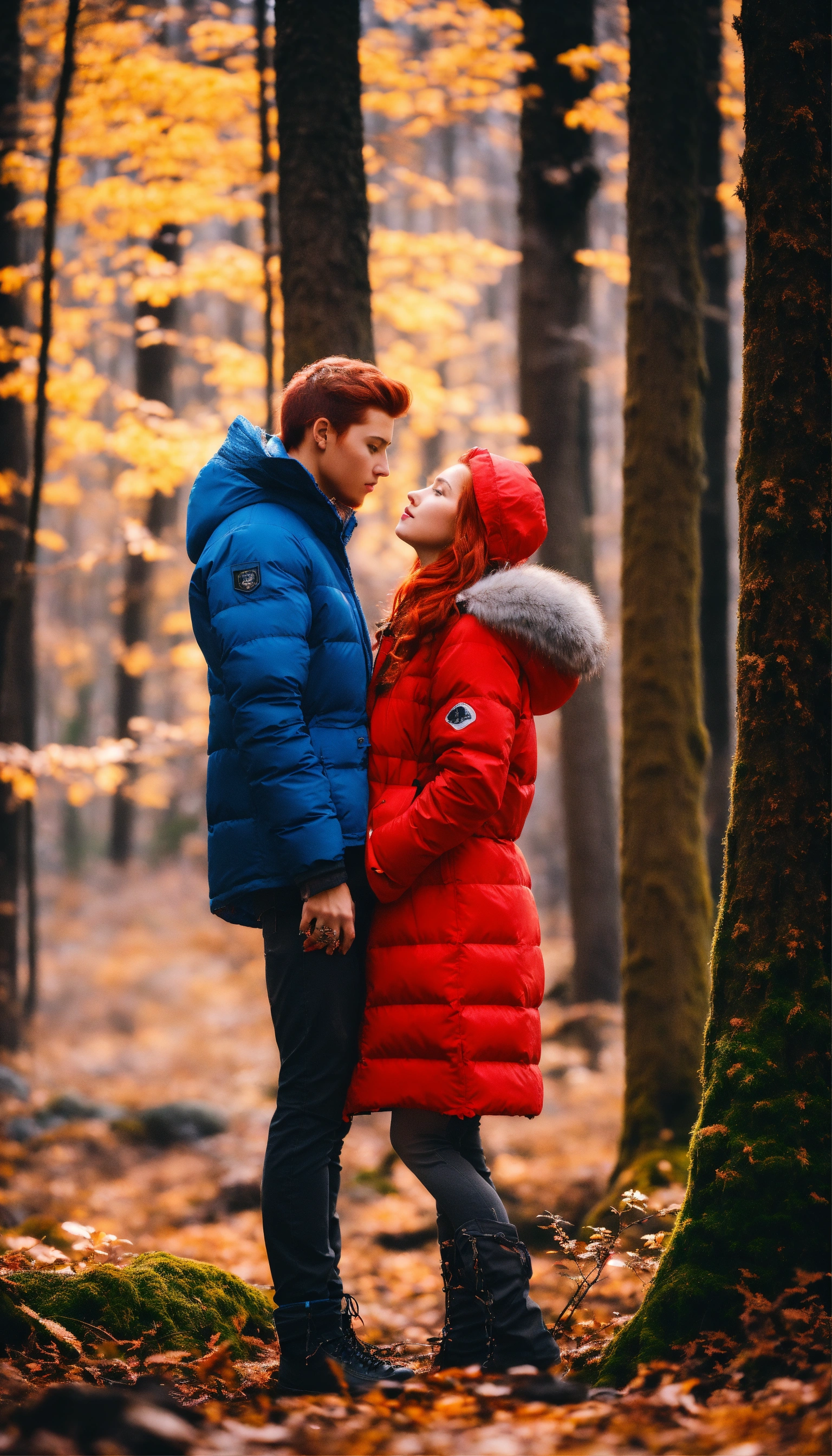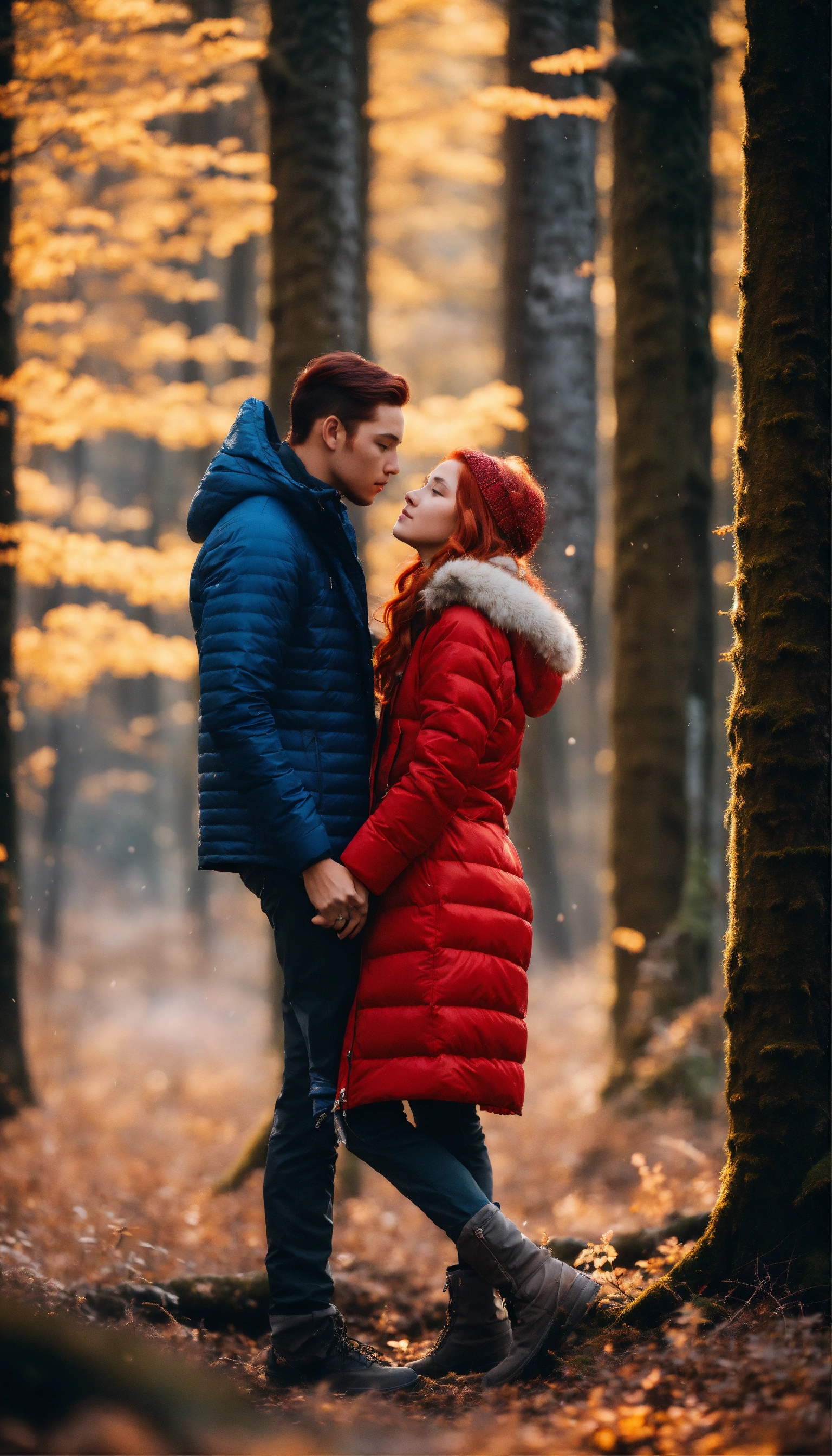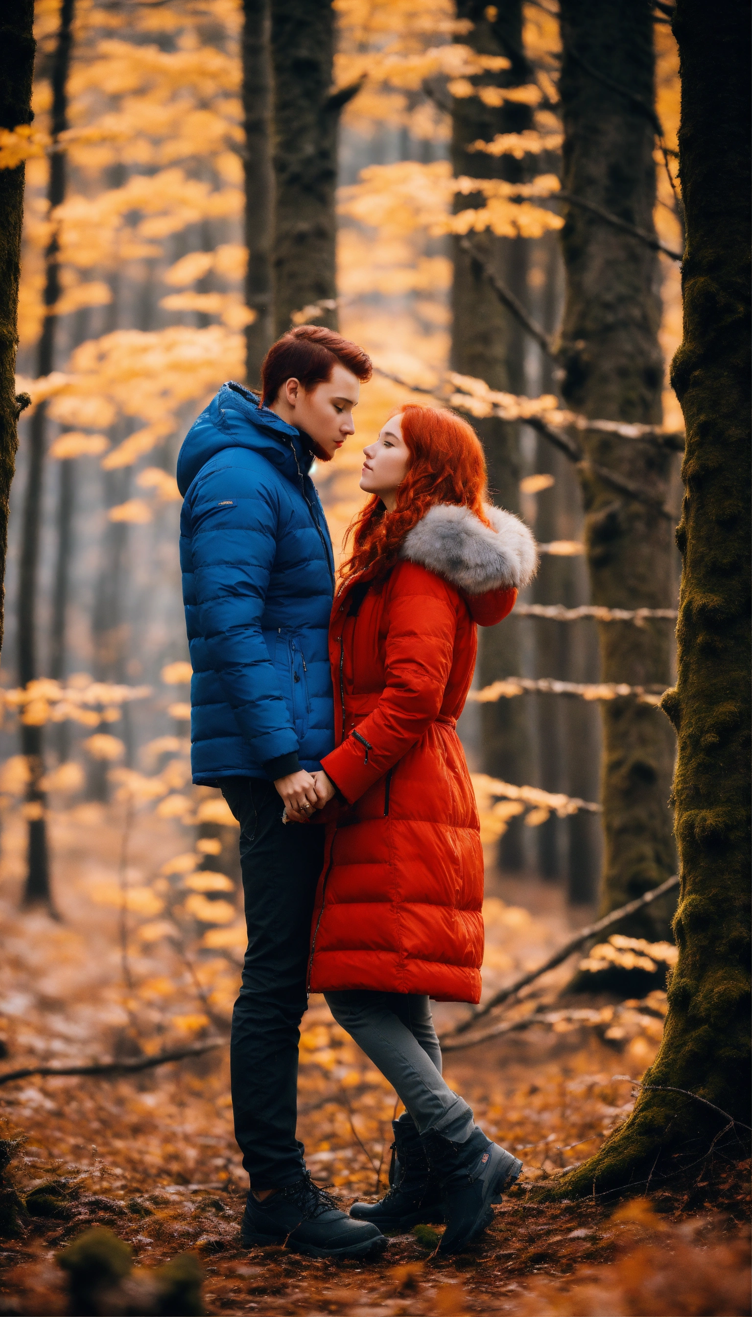 A couple in love in the forest. a guy and a girl. they stand facing each other and kiss. he is very handsome with masculine features. he's wearing a blue down jacket, she's wearing a white parka. she is a beautiful girl with red hair and gray eyes. her shoulder-length hair is wavy. capricious lighting, best quality, full-length portrait, real image, complex details, depth of field. she is standing in the forest, blizzard, bright day, beautiful lighting, raw photography, 8k, film grain, unreal