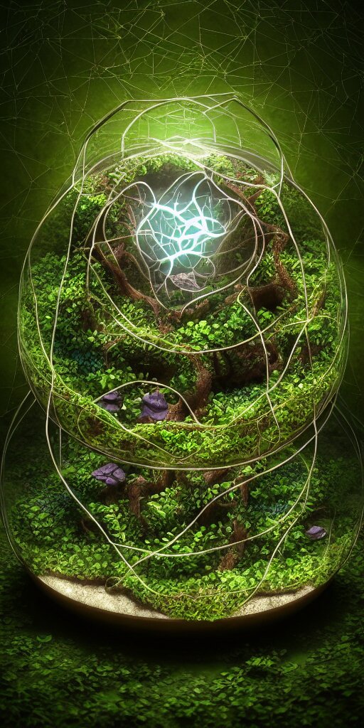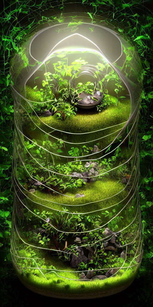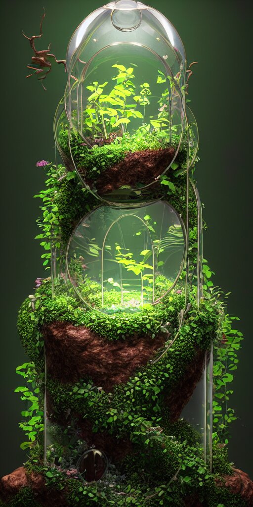 Graphic of enchanted terrarium, vines wrap around the terrarium, unreal engine 5, blender, depth of field, ultra realistic, cinematic, macro, artstation, megascan, intricate, epic, quixel, weta digital, focus, octane render, v-ray, digital art, highly detailed illustration, golden ratio, prism undertones, rule of thirds