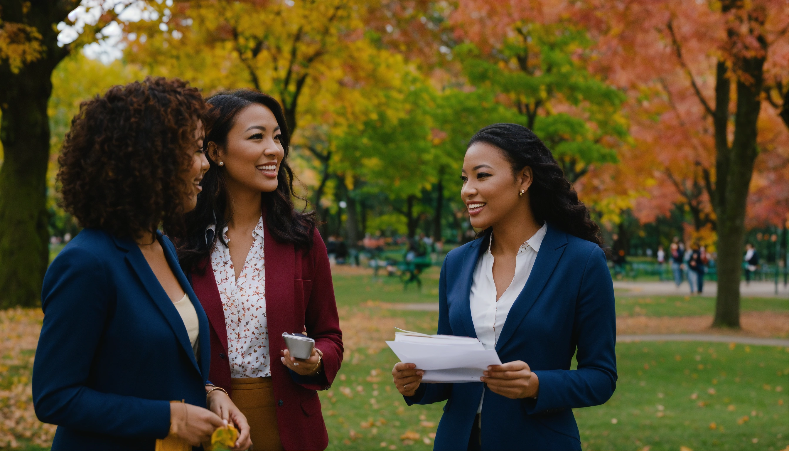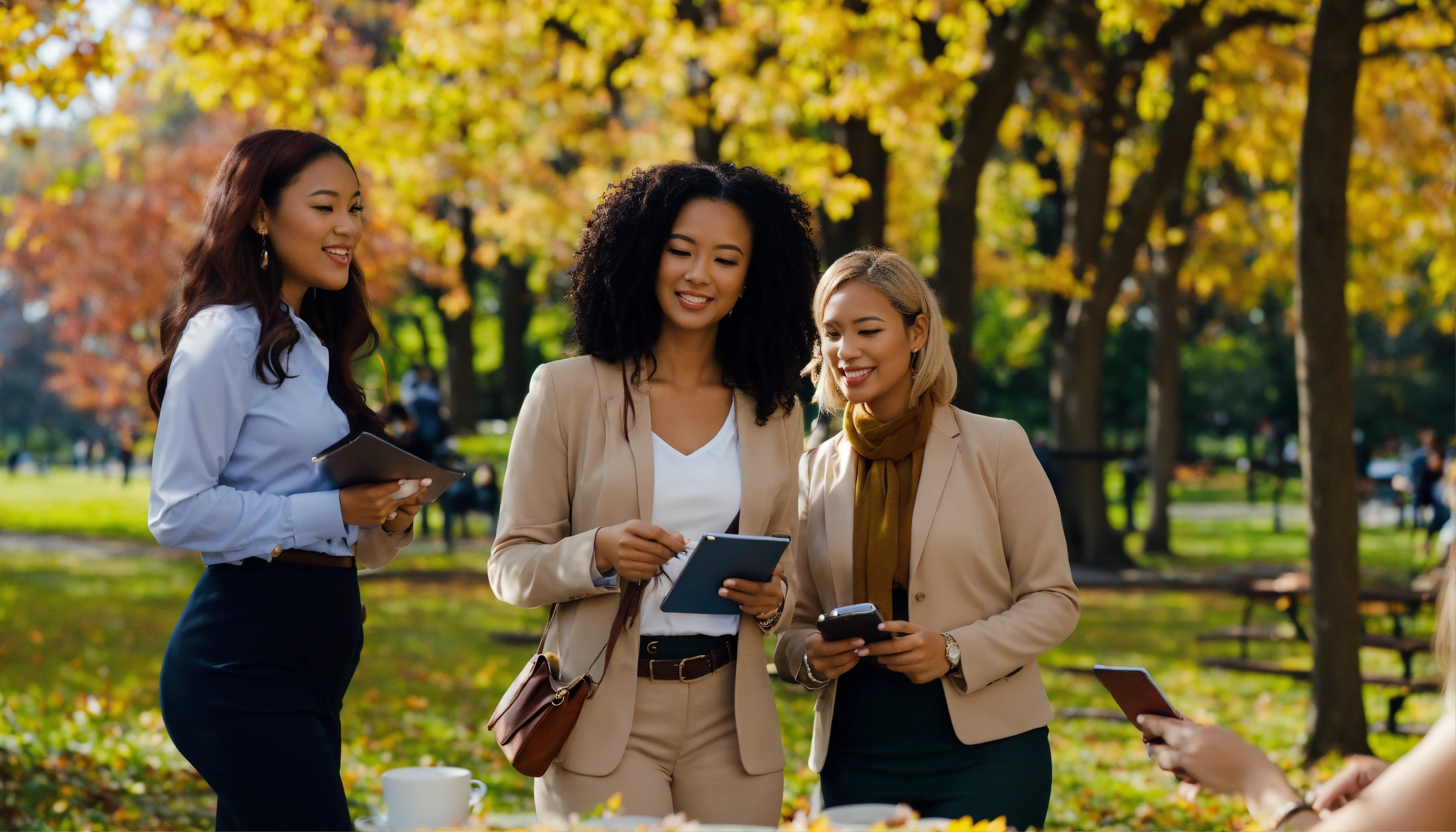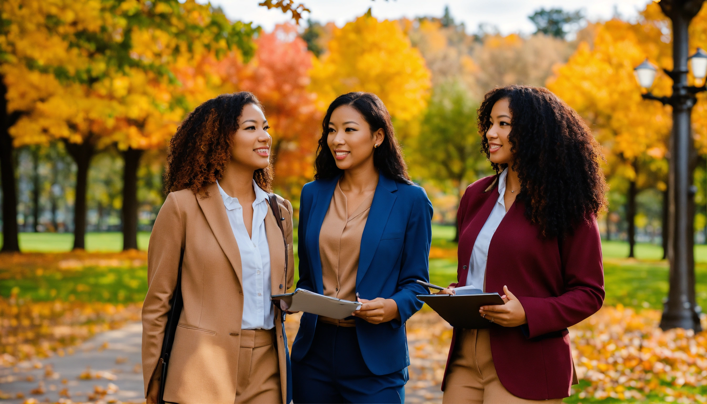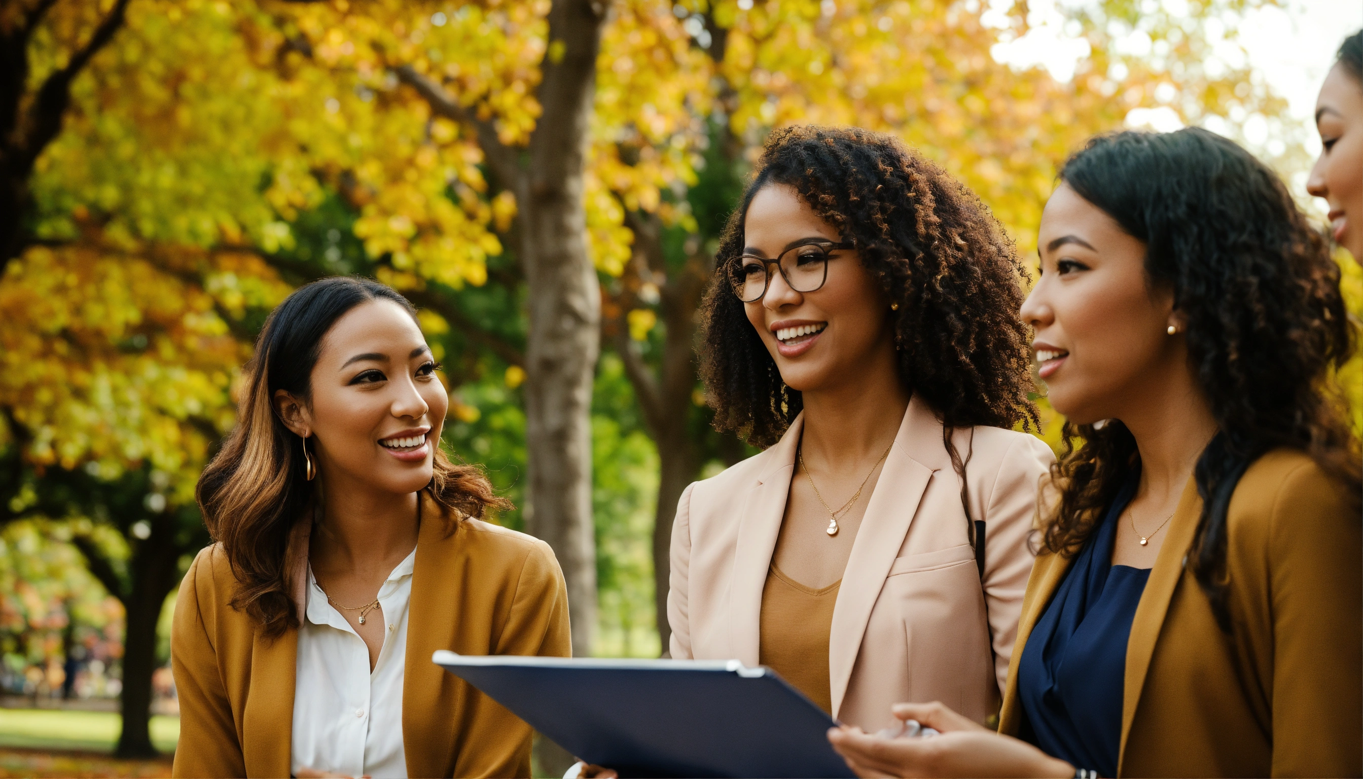 A group of women with diverse ethnicities in business casual clothes, they are discussing exciting news outside in a park with the trees changing to the gorgeous autumn colors