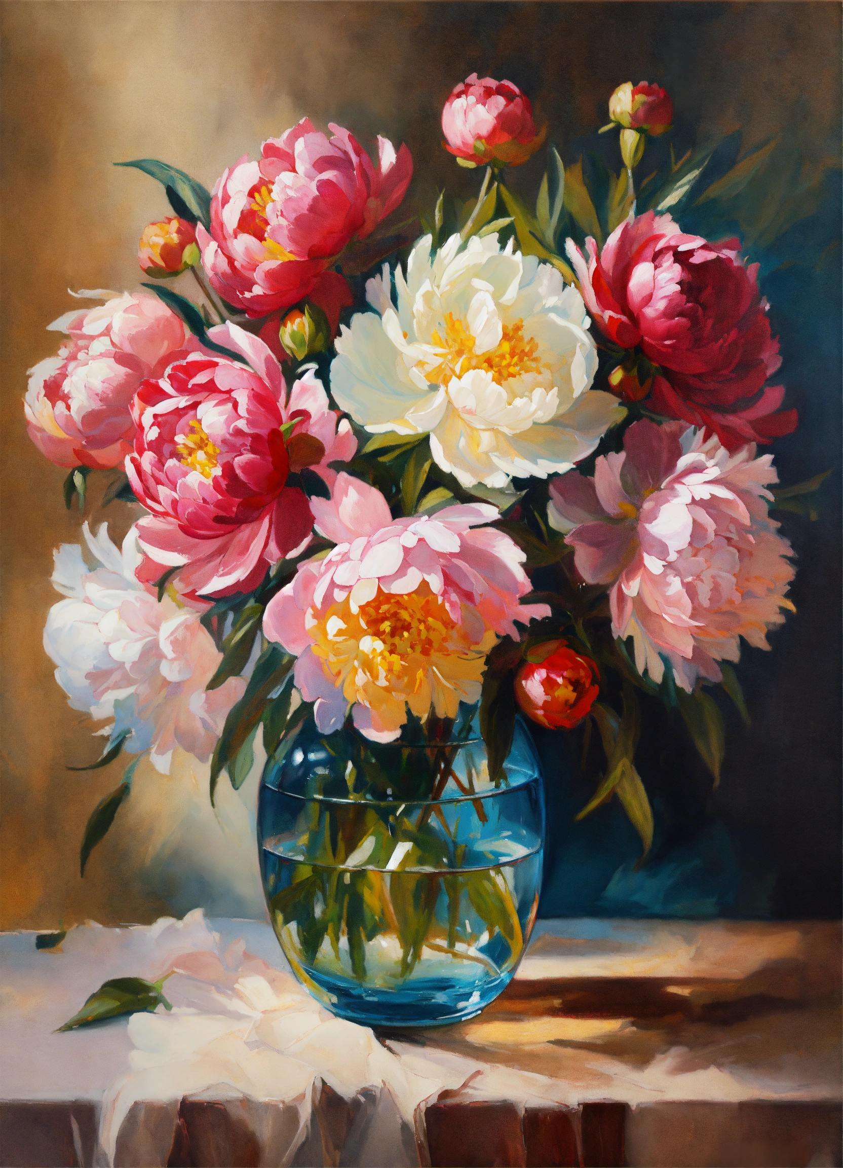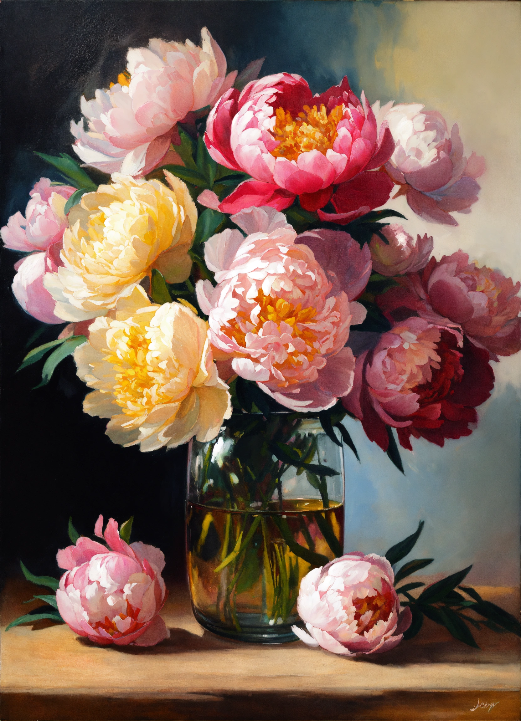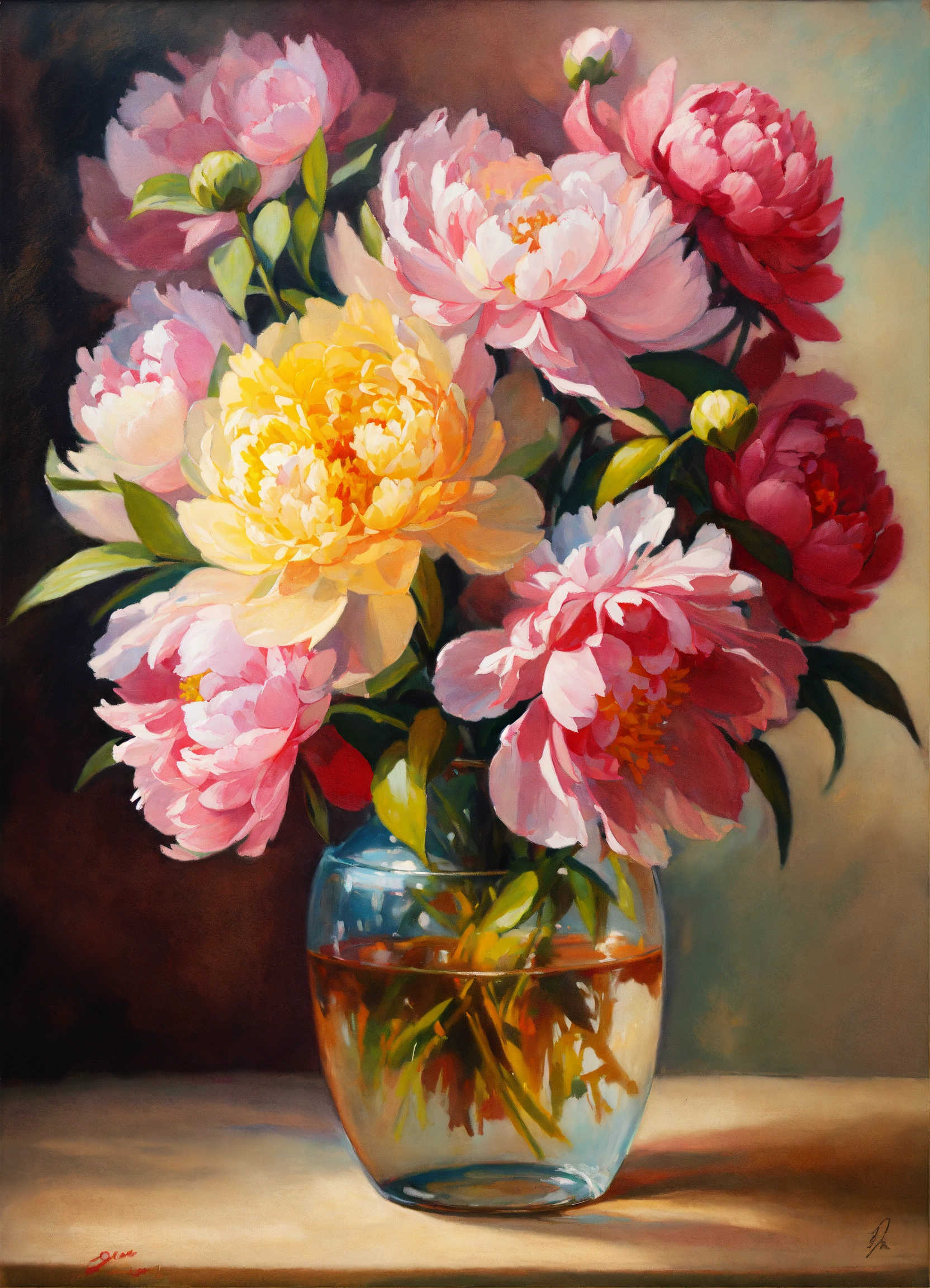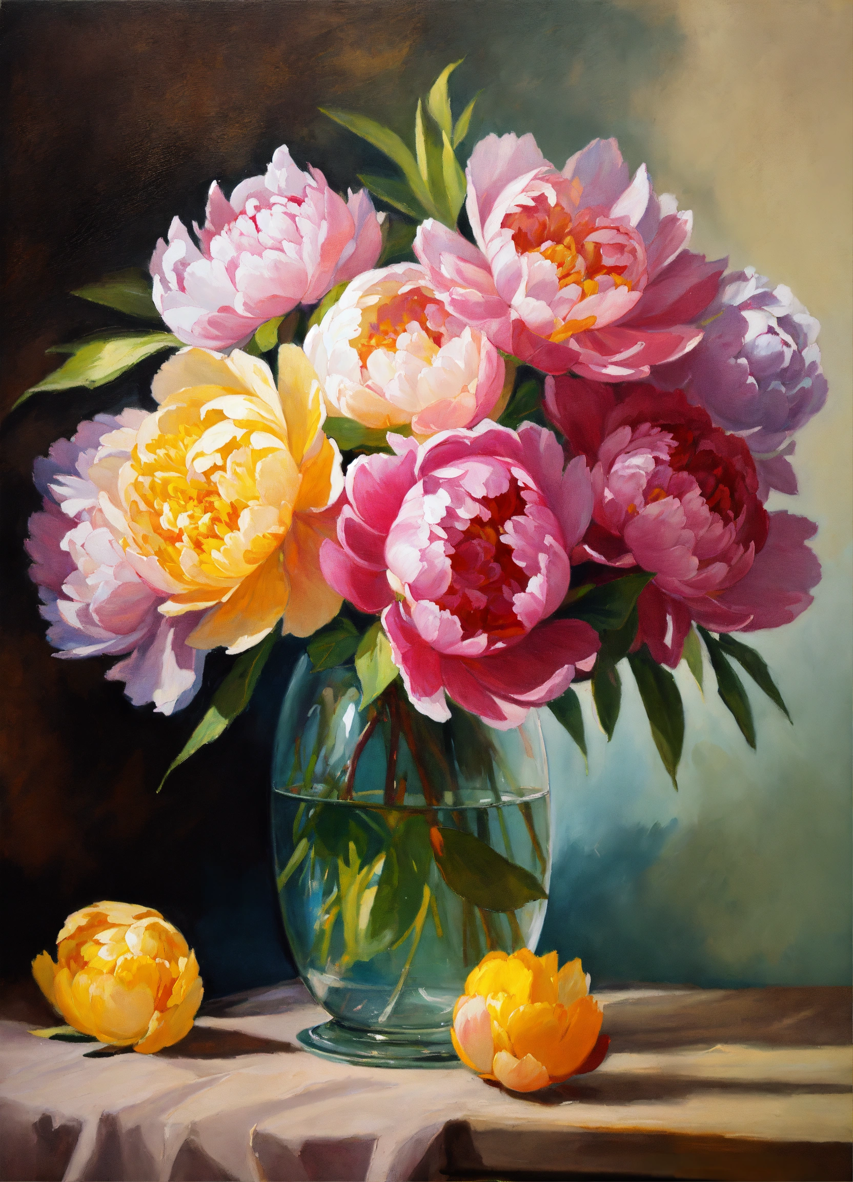 Oil painting of a colorful bouquet of peonies flowers in a glass vase, in the style of john singer sargent