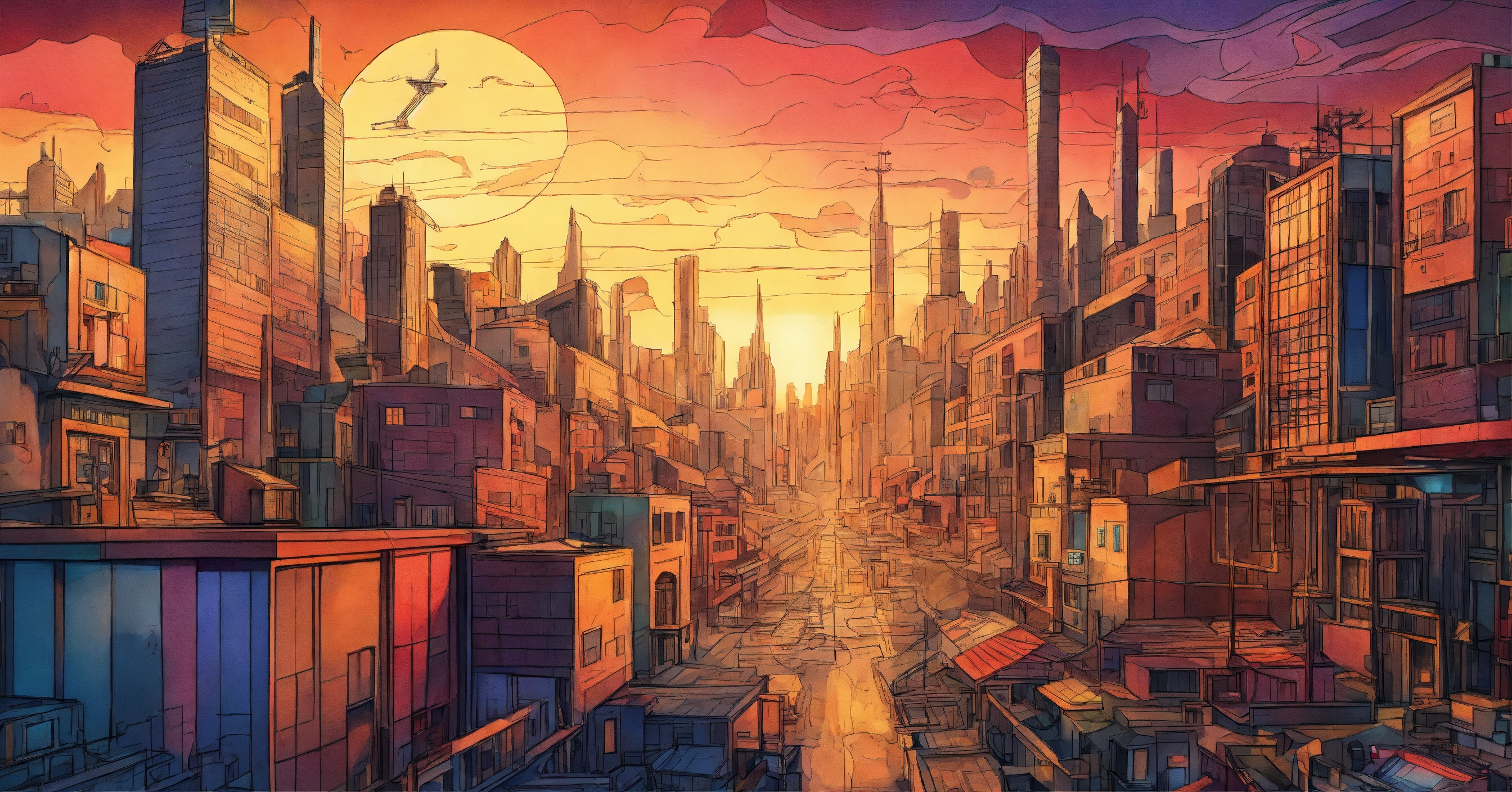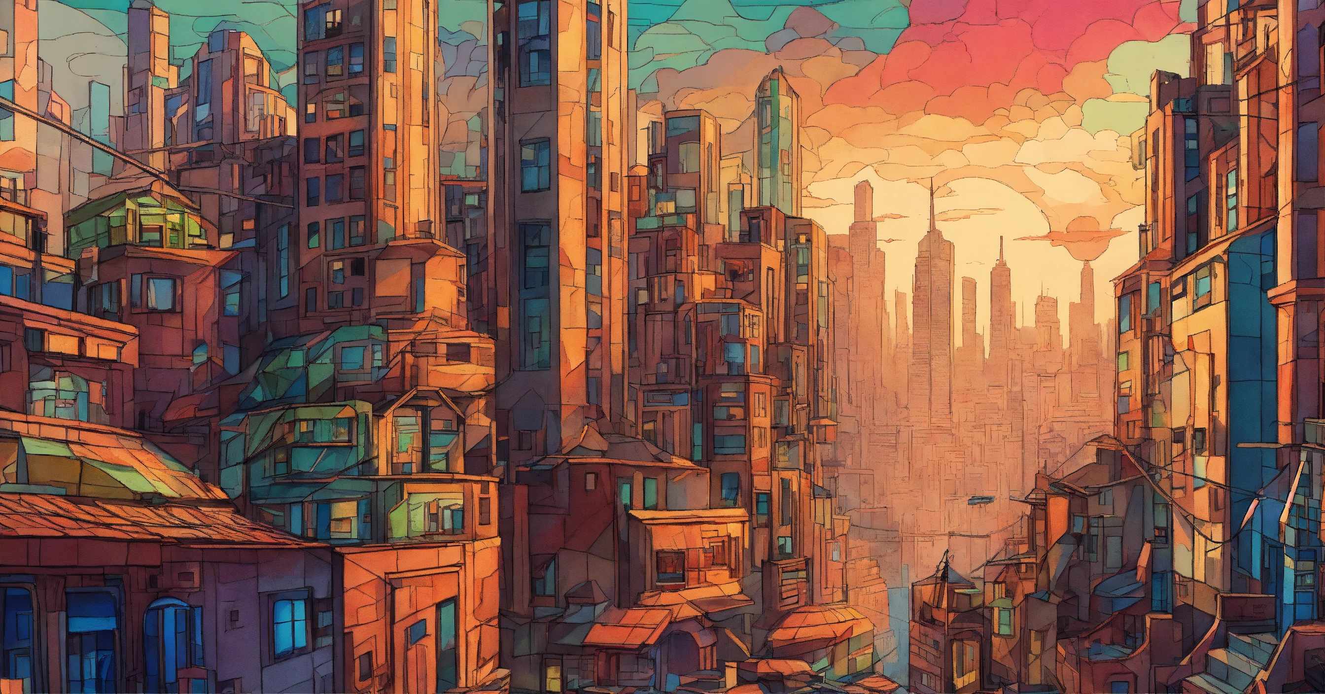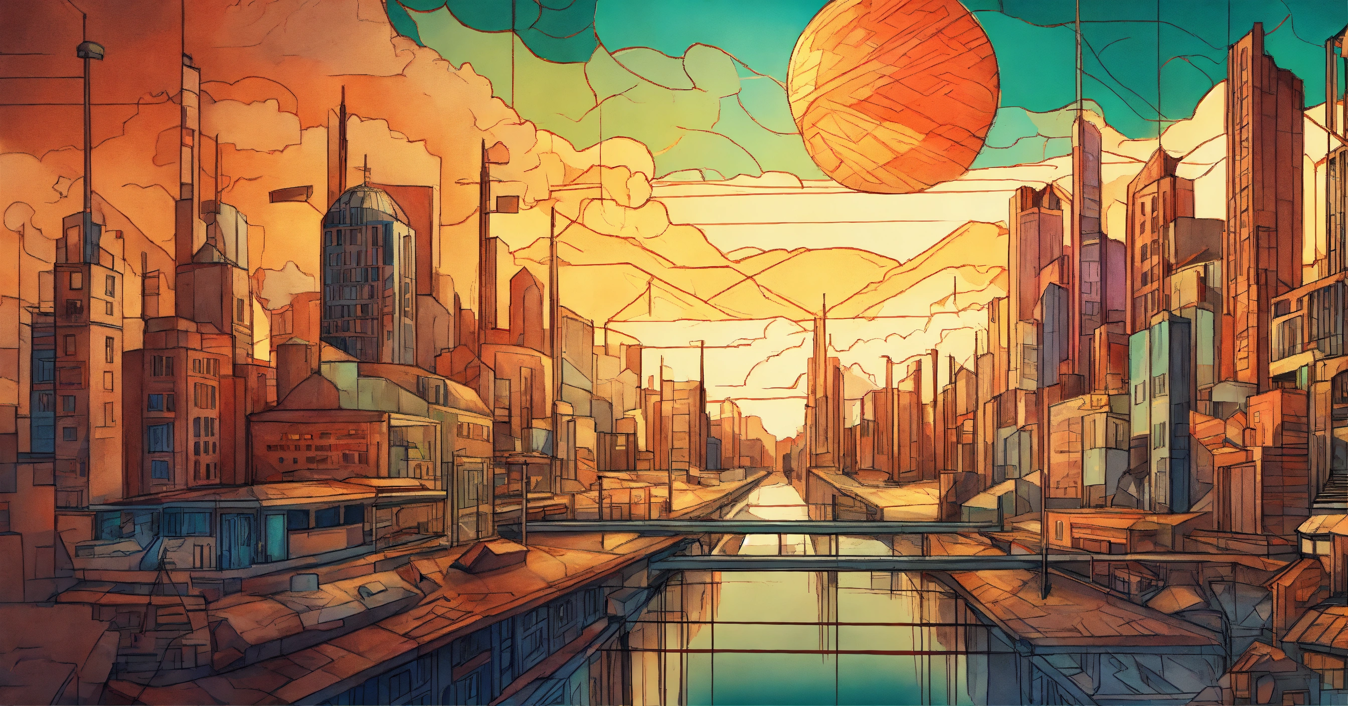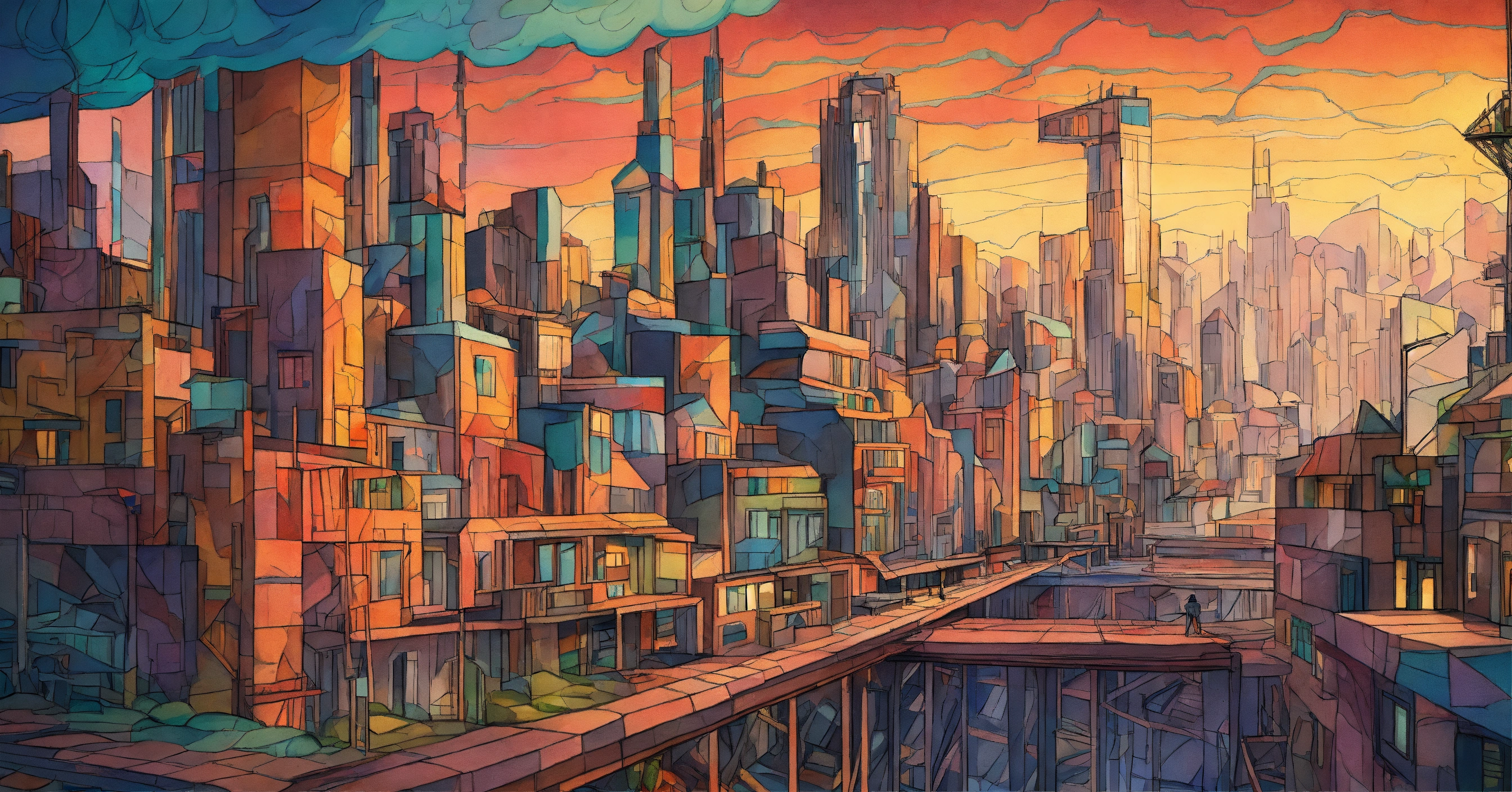 Create a vector pencil sketch of the retro and dystopian post-apocalyptic cityscape on earth using colored pencils, inspired by cubism.