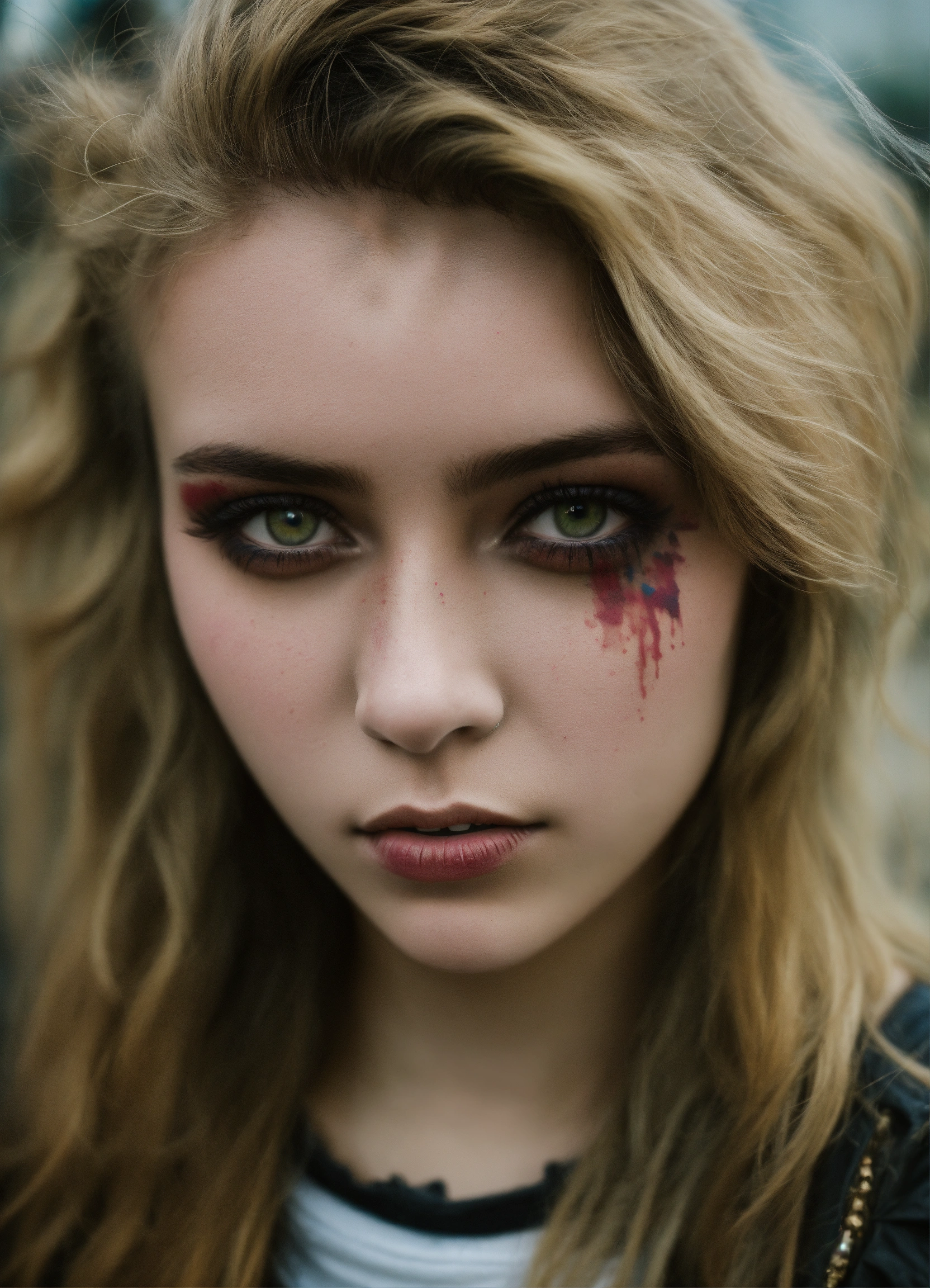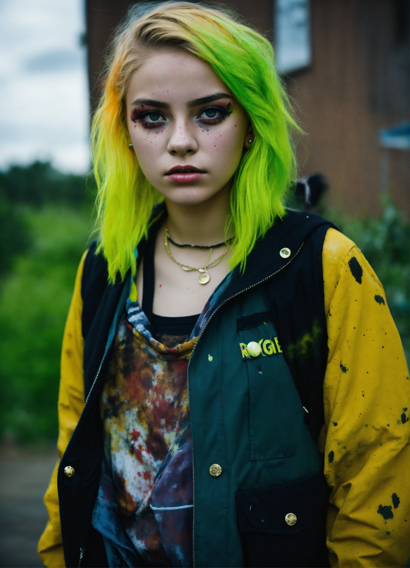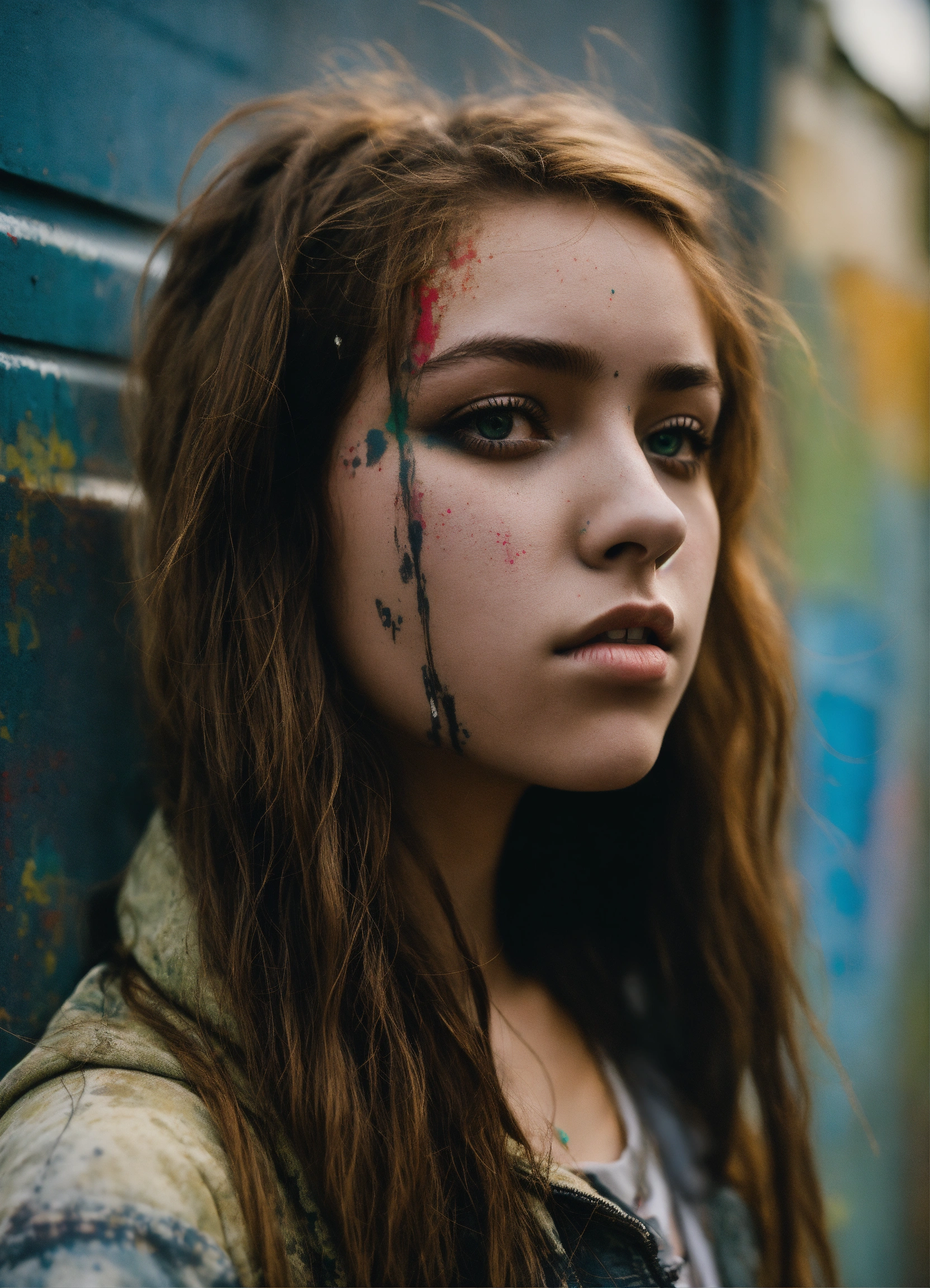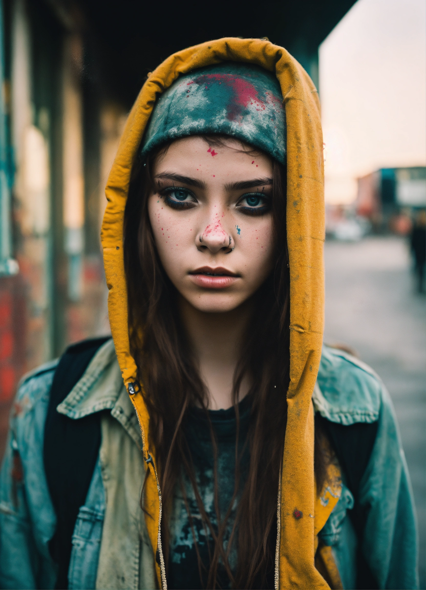 16 year old girl, tamsin adisa, hazel eyes, post apocalypses world, rogue street fashion, grunge, spray paint