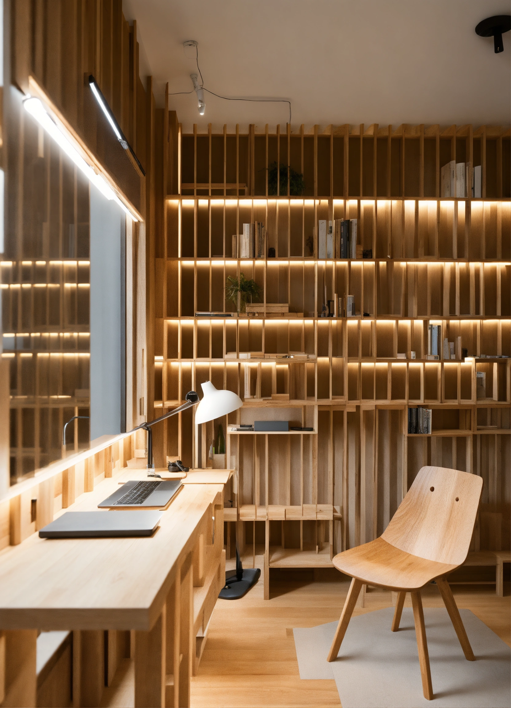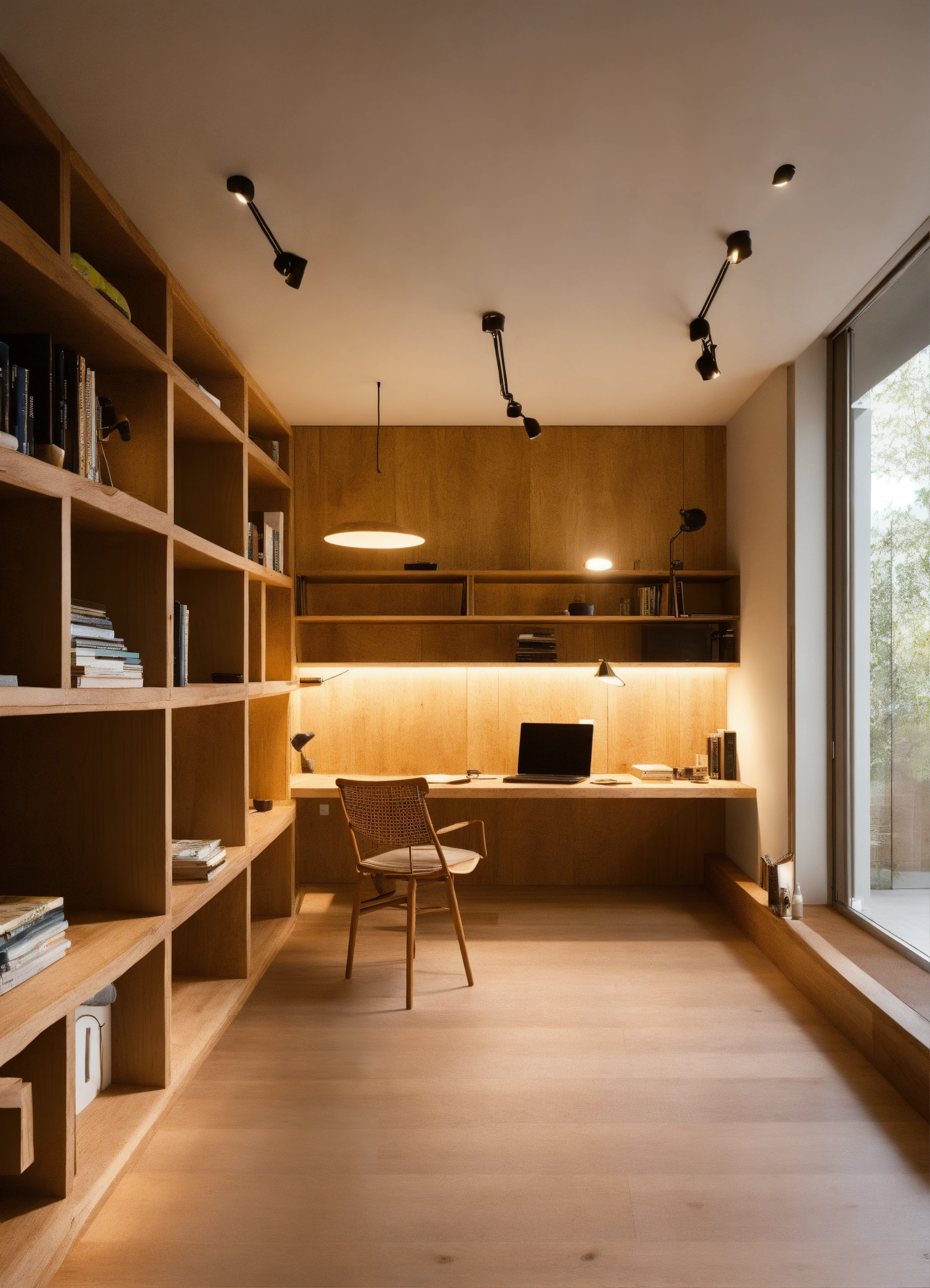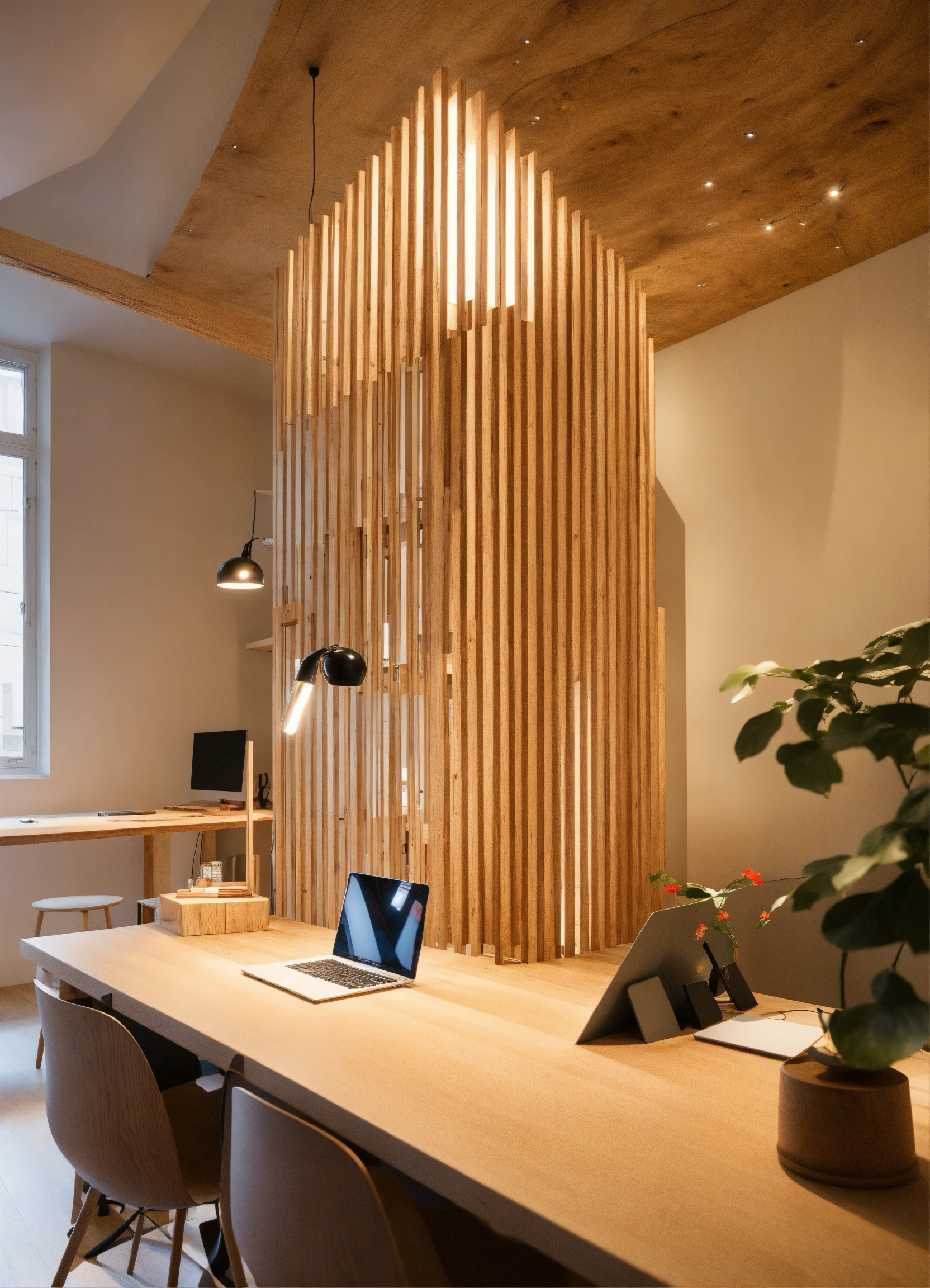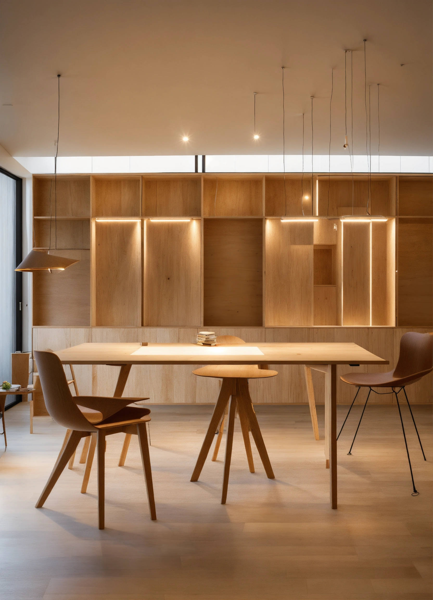 Diseño interior de estudio de arquitectura, estilo nordico, calido, iluminacion led, mobiliario de diseño, puestos de trabajo, madera roble, espacio diafano
