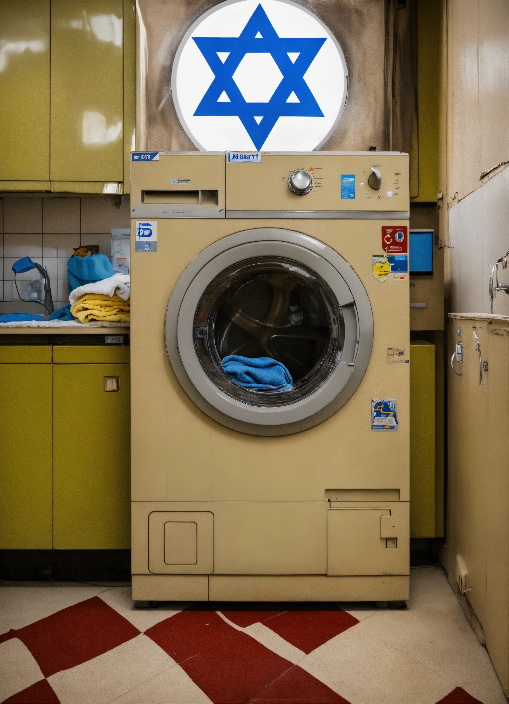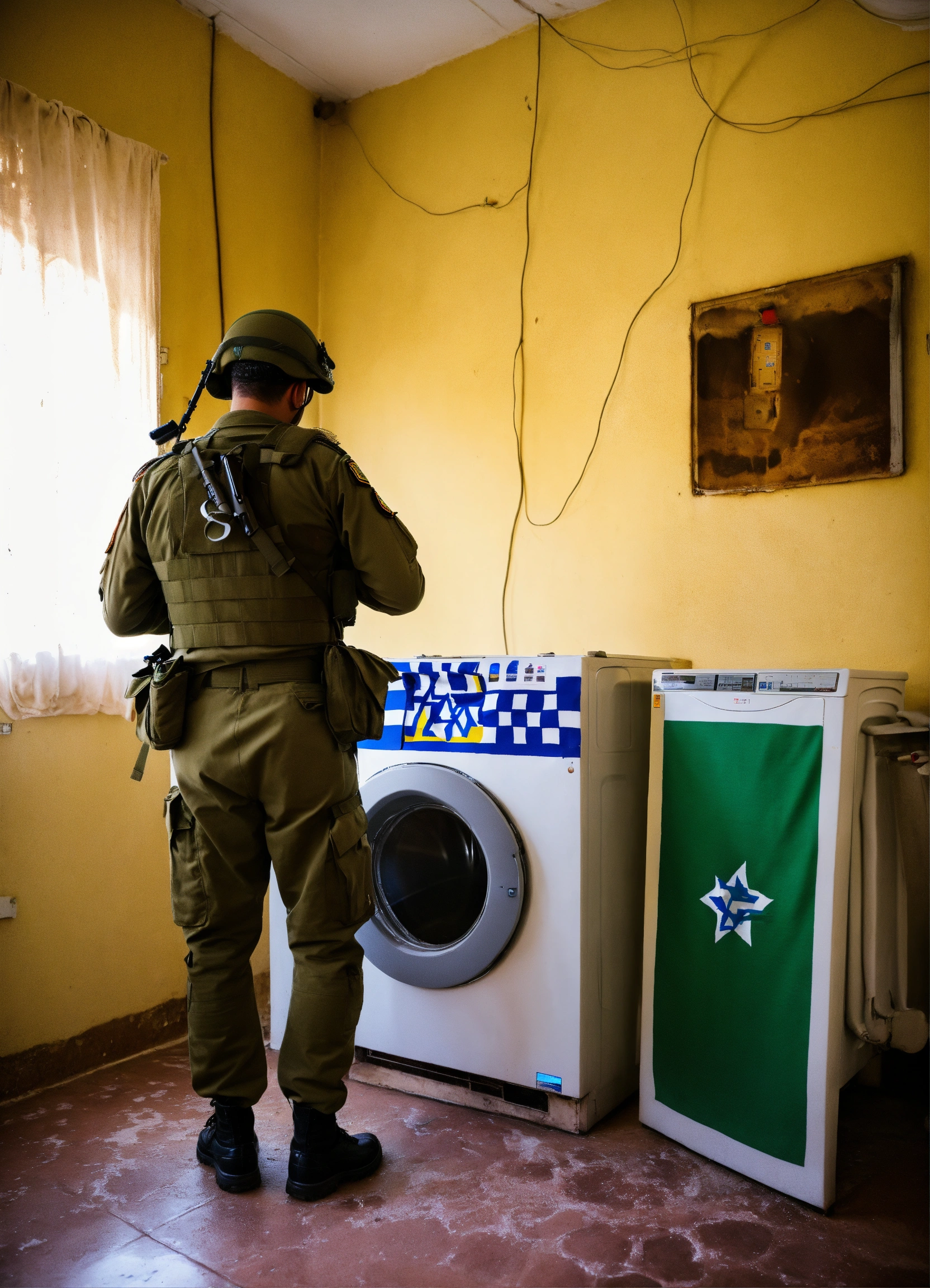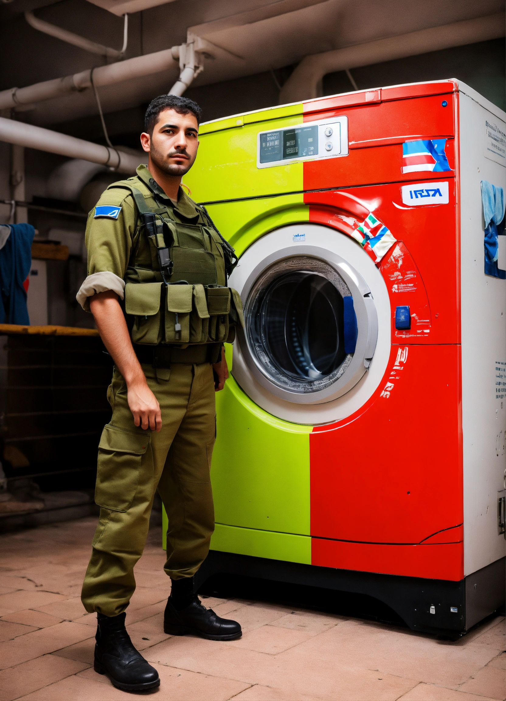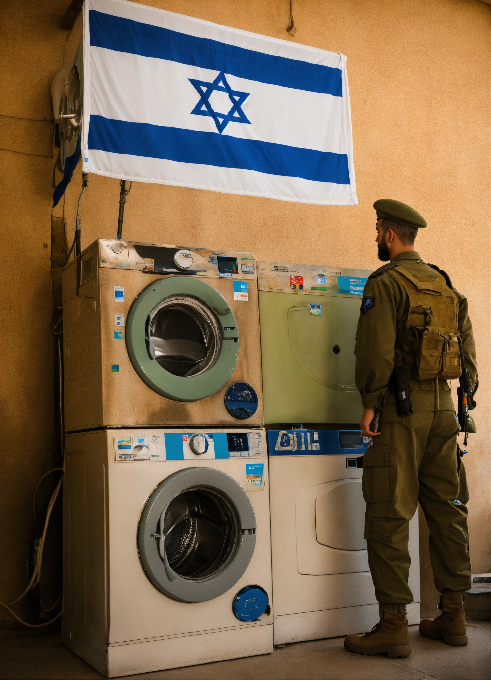 An israeli soldier stands next to a washing machine in the design of the israeli flag