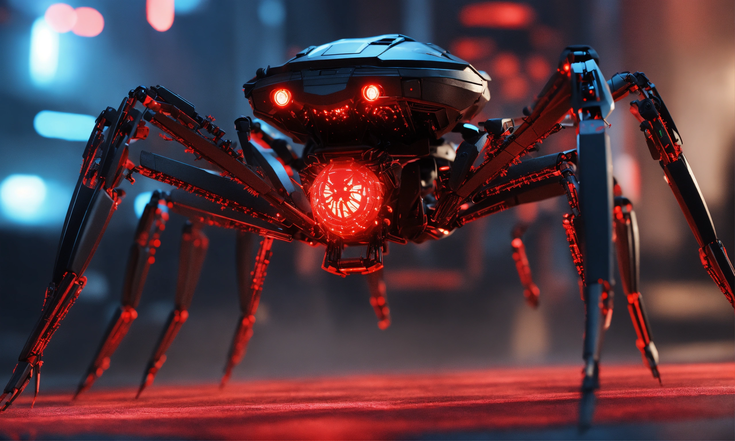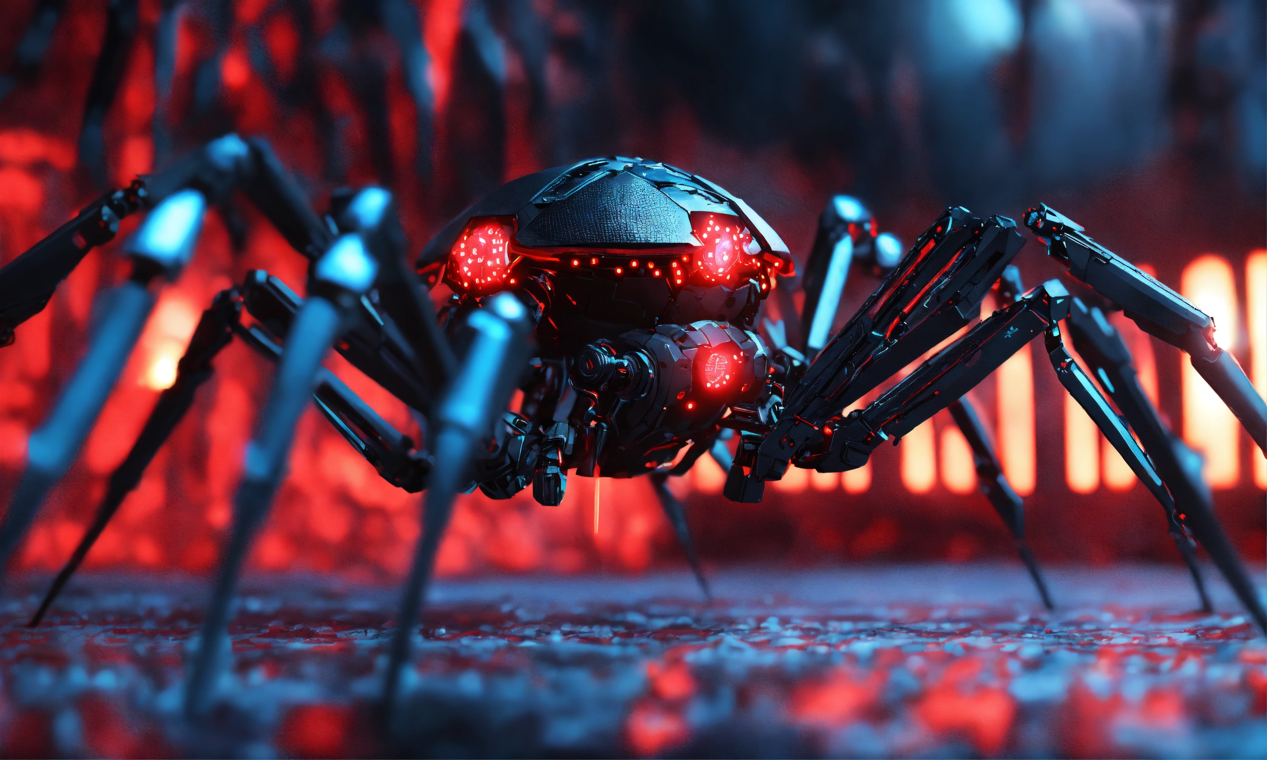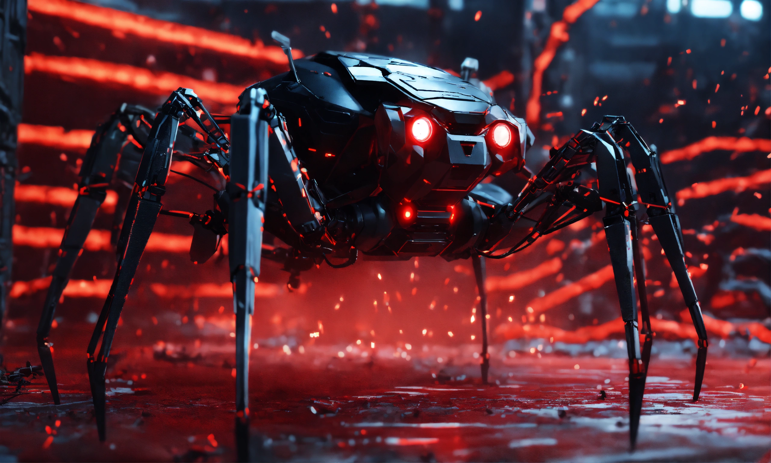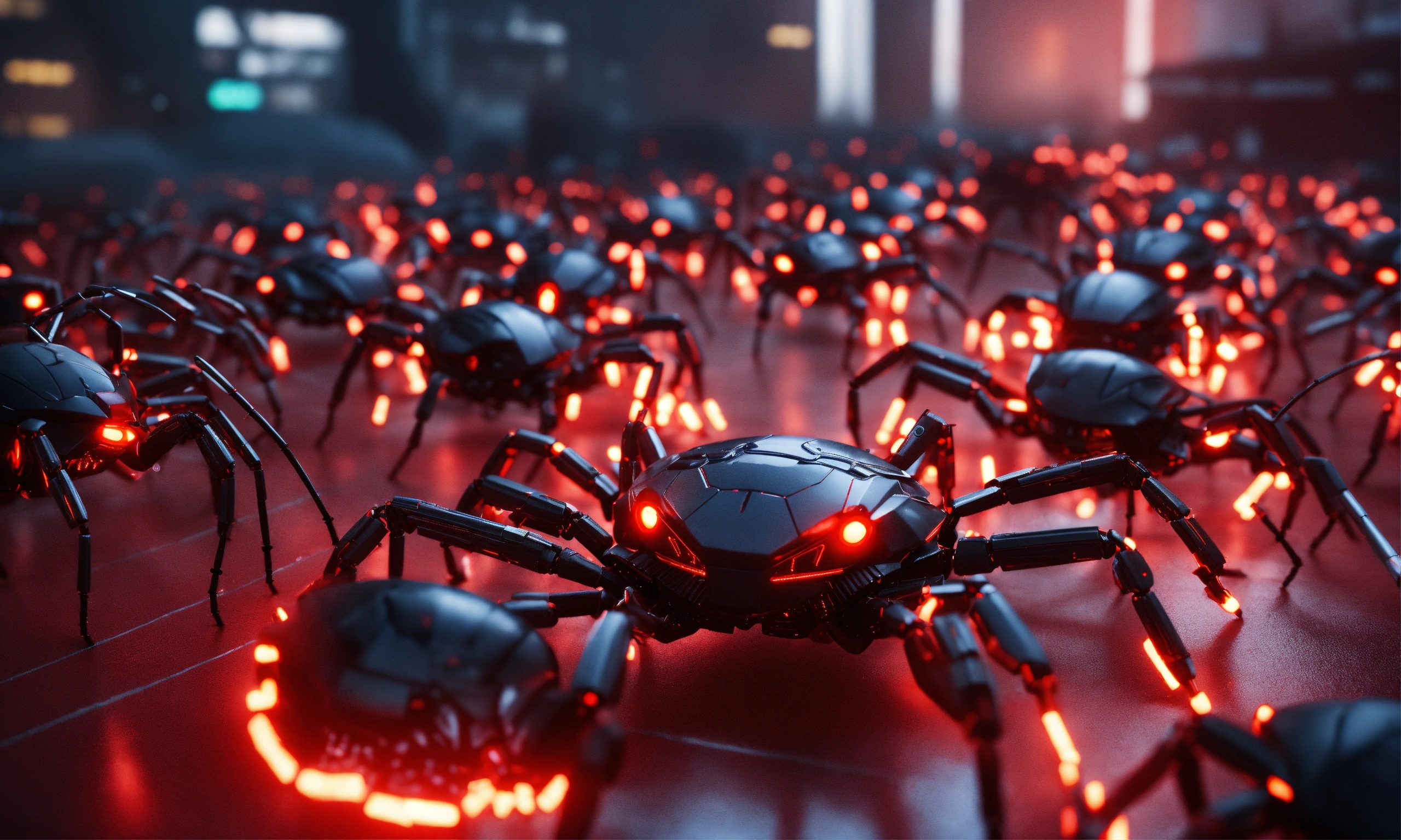 Hundreds of black armored robotic spiders with glowing red circuitry, robotic arms, swarm attacking, invasion, realistic, 8k