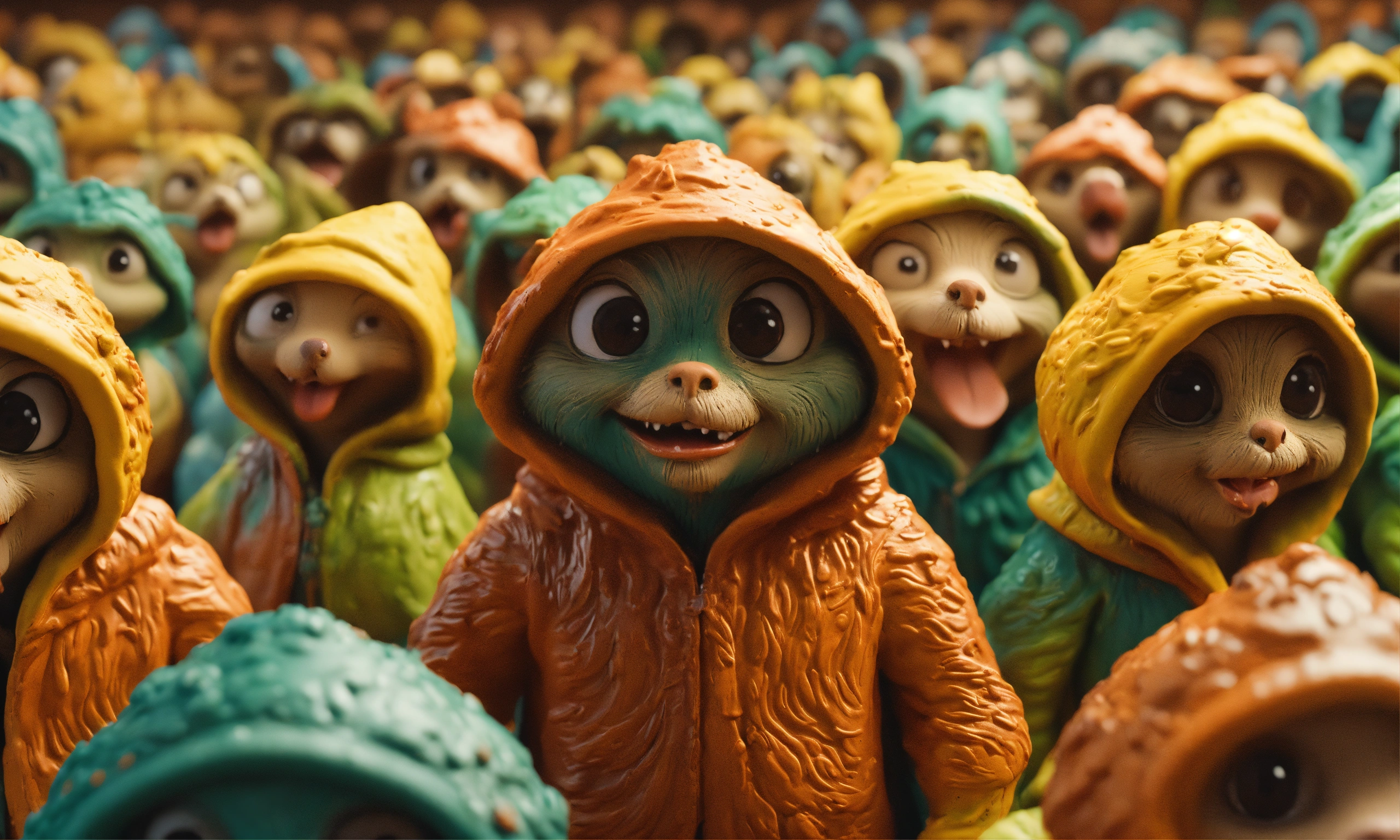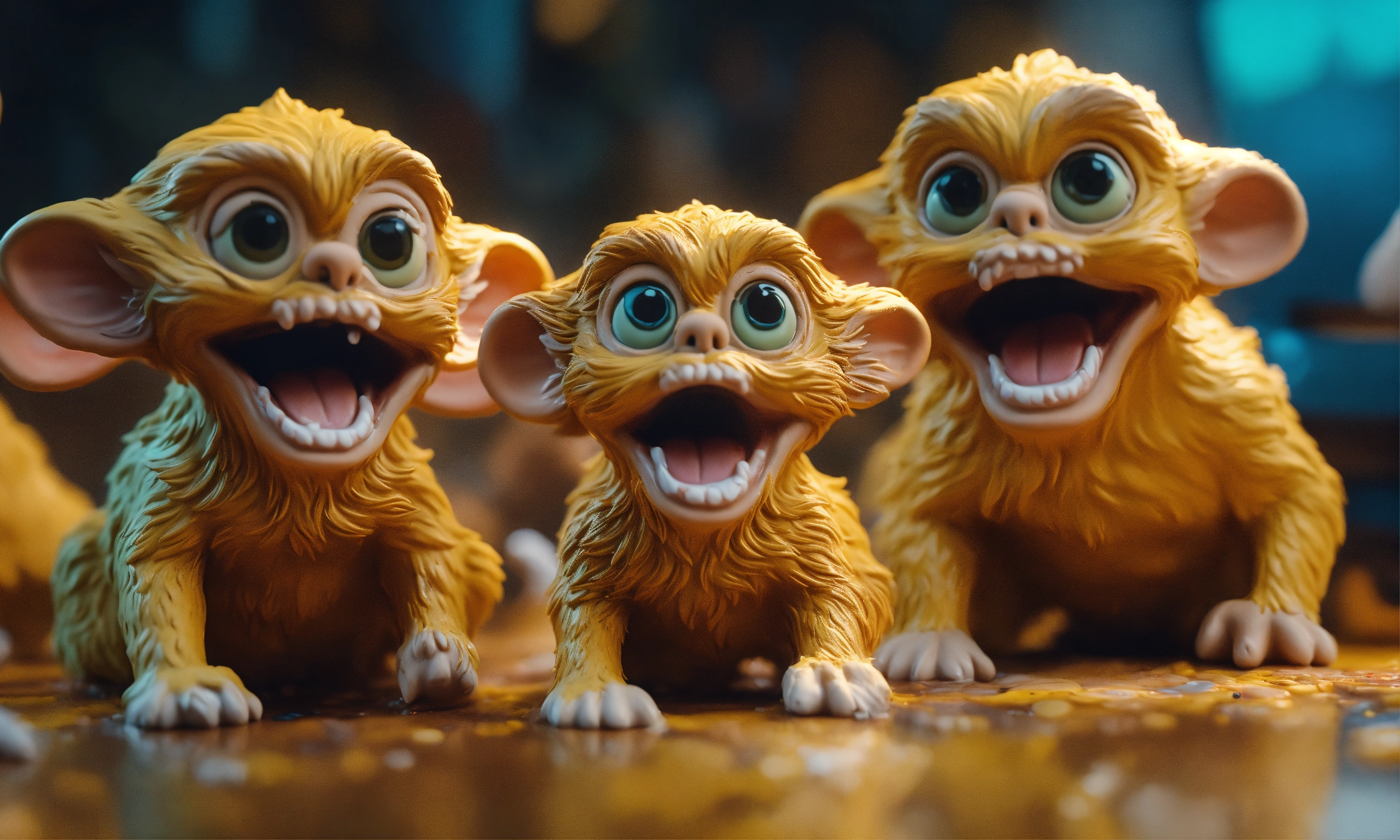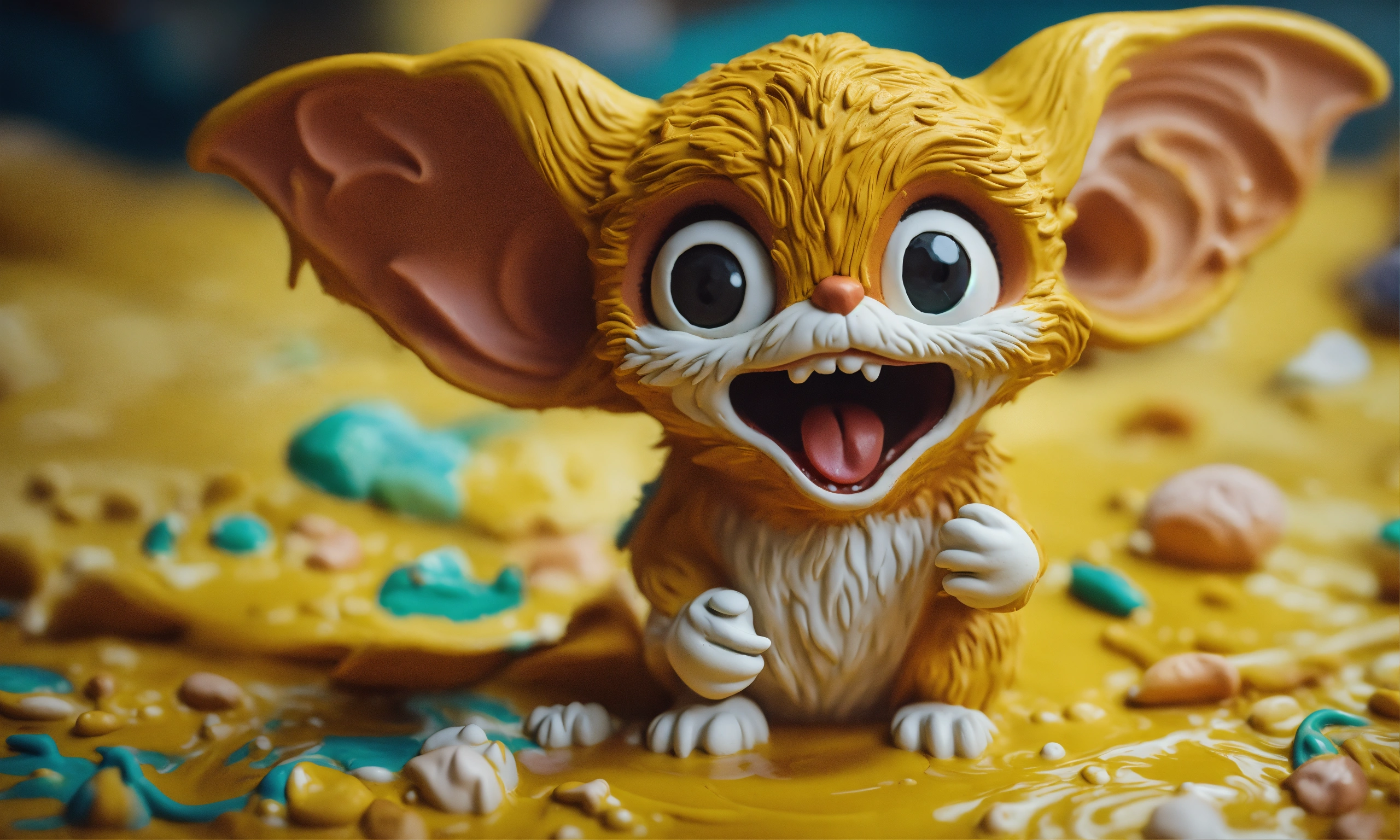3d effect of cute clay gremlins imitating the pose from the famous painting 'the scream' in an overall pattern, the faces of the gremlins are covered in paint, cartoon and claymation style, unreal engine render, 8k, intricate details