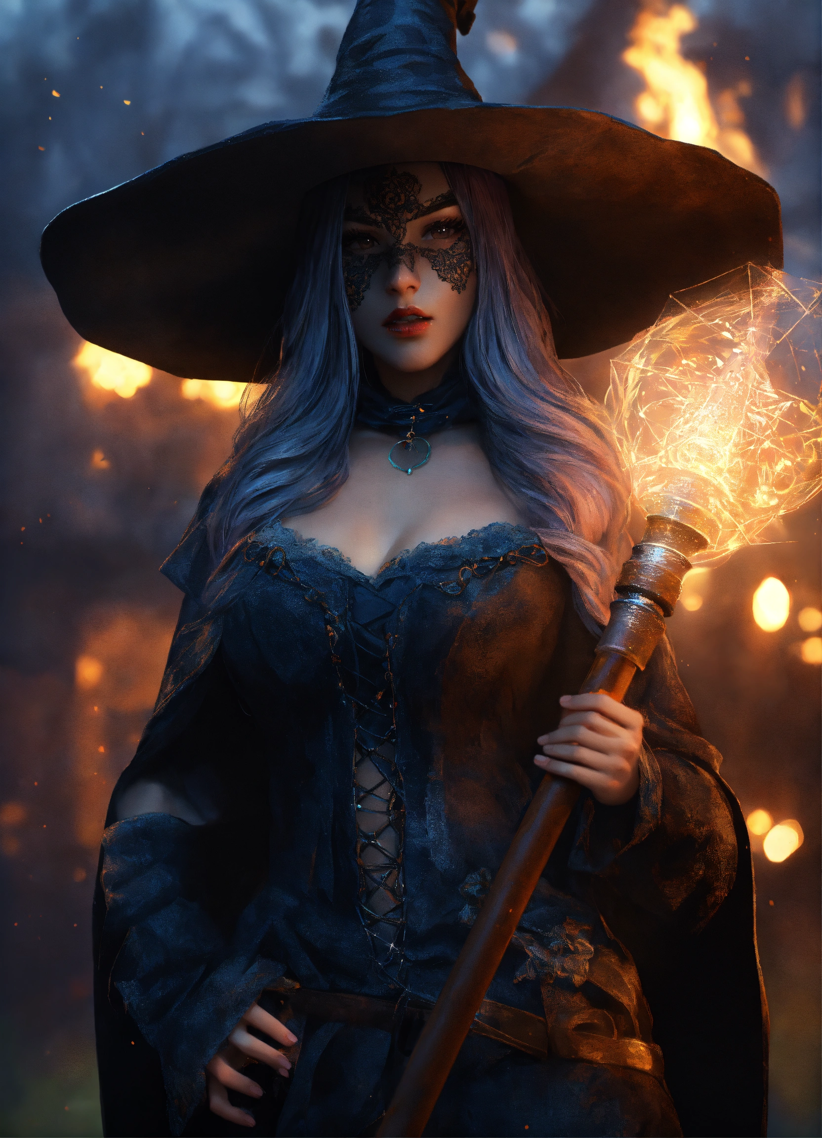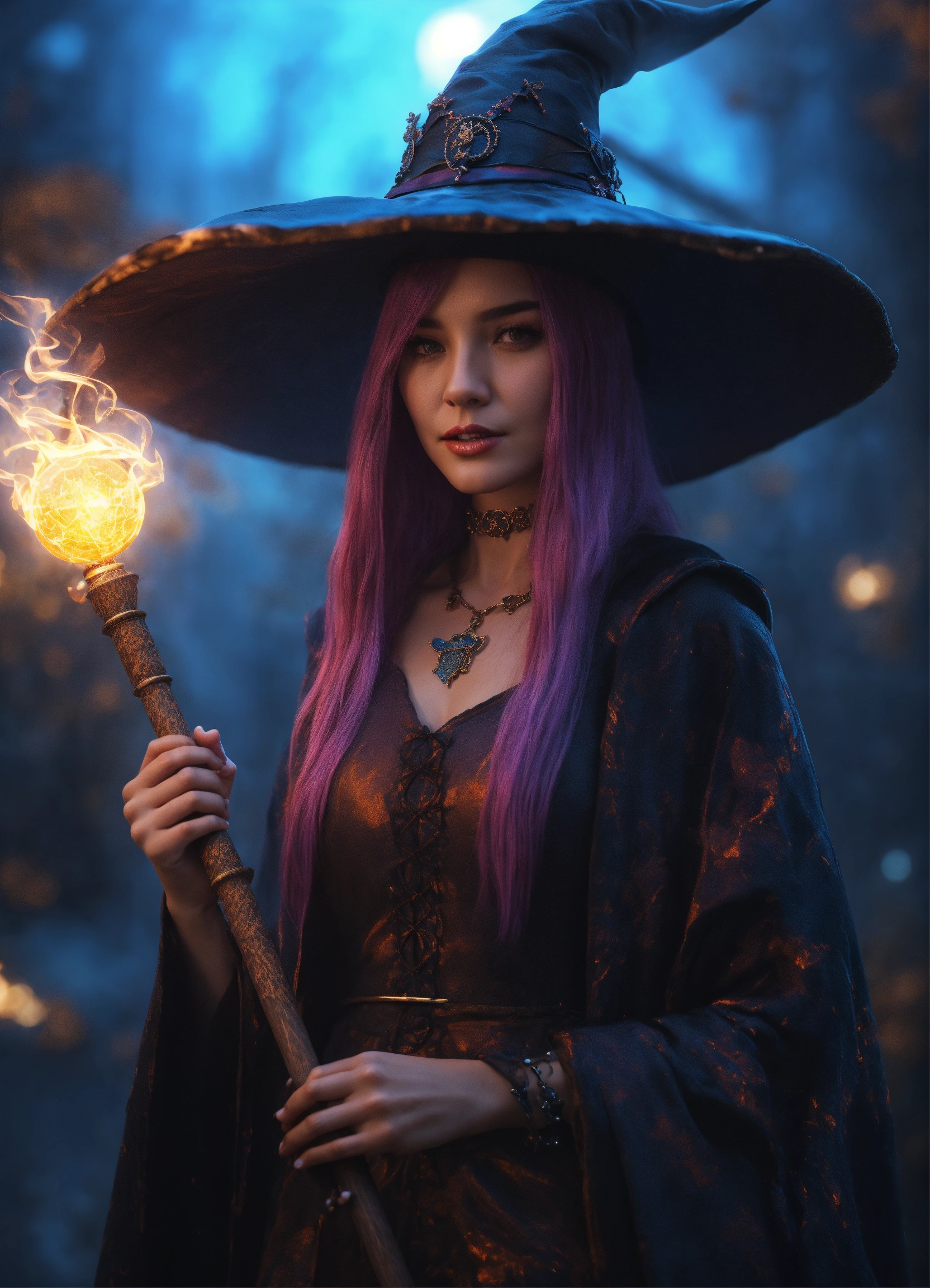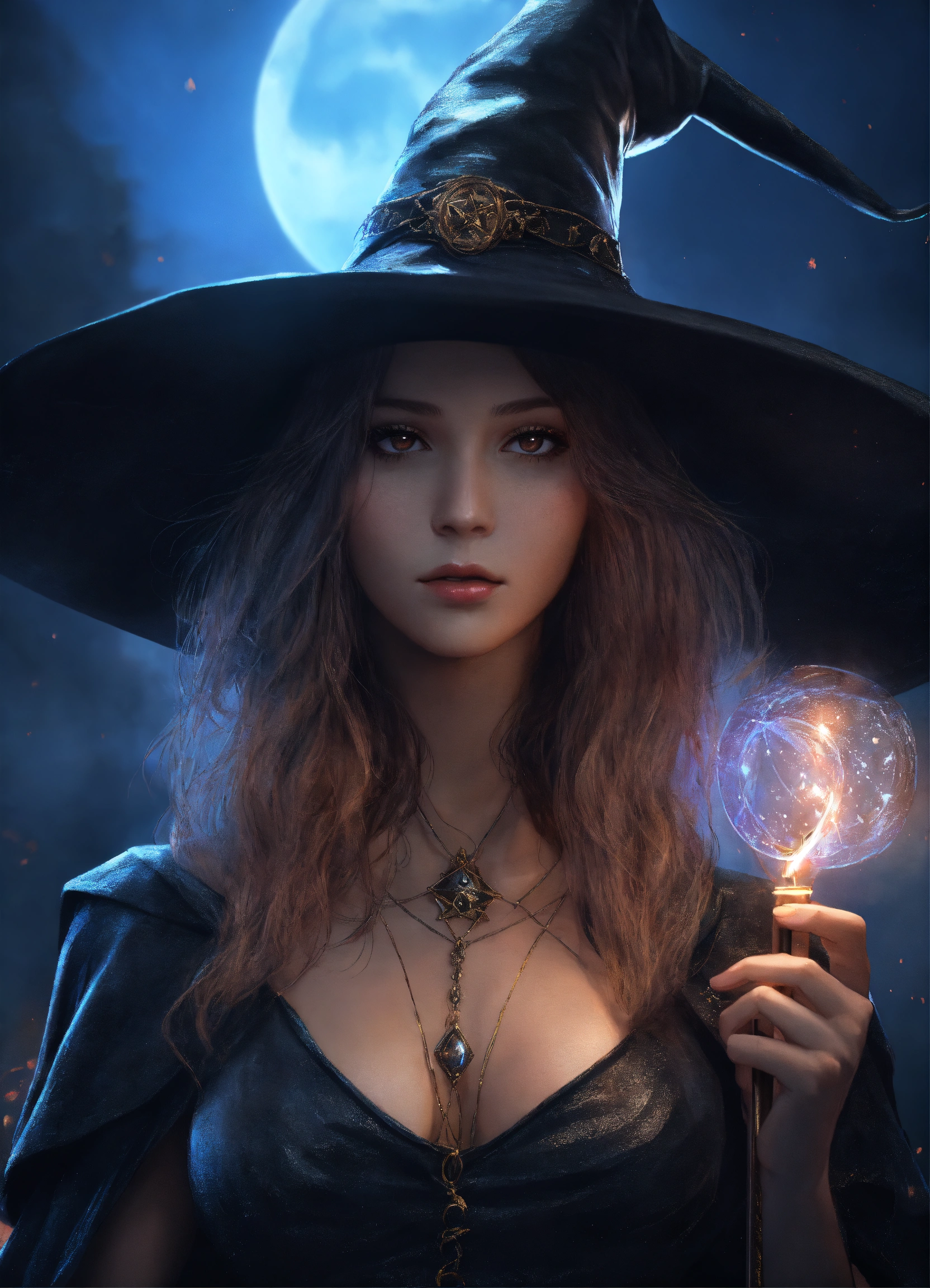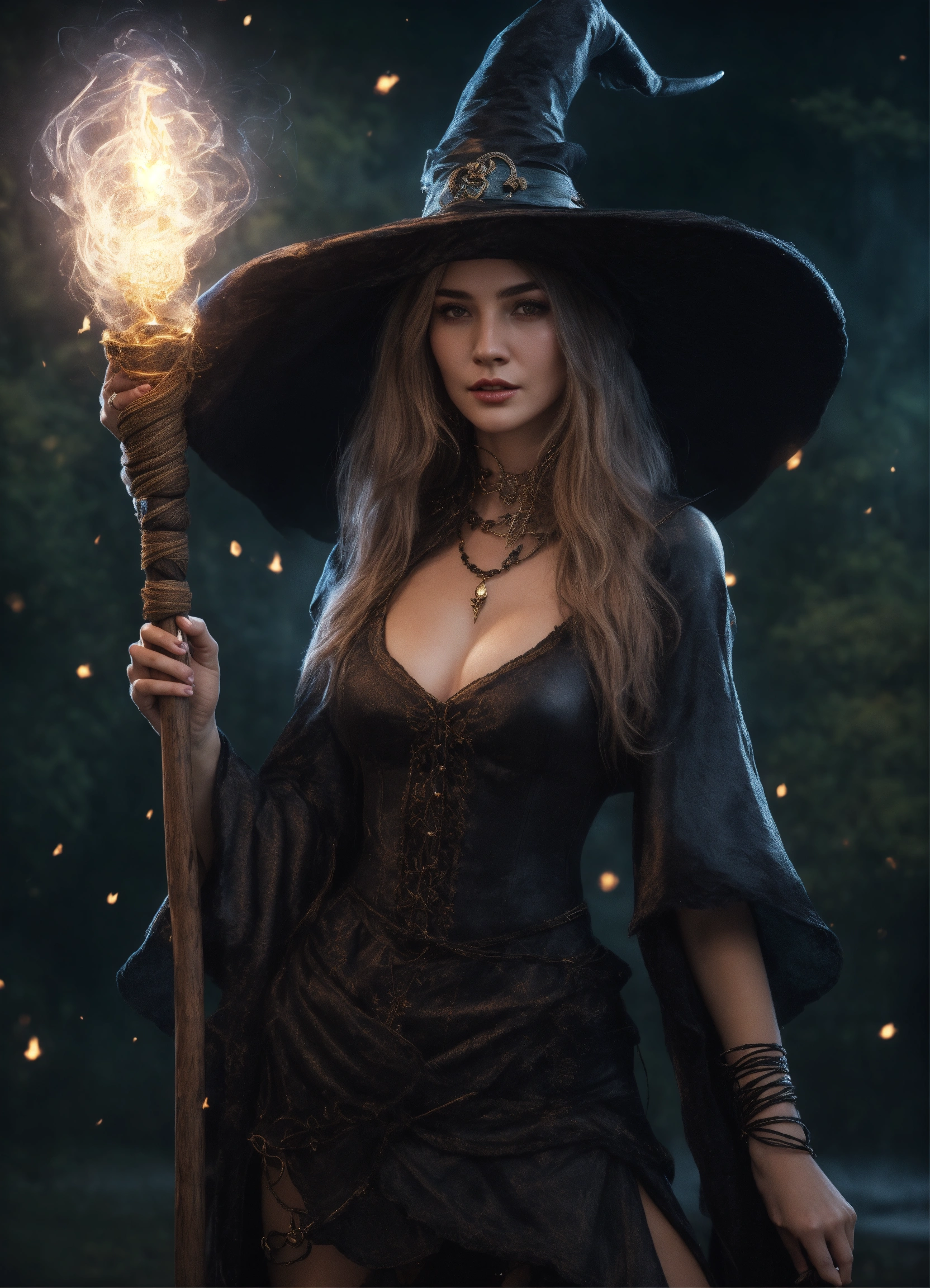 Witch style, witch, witch hat 4k, realistic, clear head, clear face, bizzare background, holding a magic stick, detailed, expressed face, covered neck, no skin, close up, female, clear head, full hat shown, no skin showing, covered shoulders, full body shown, full body