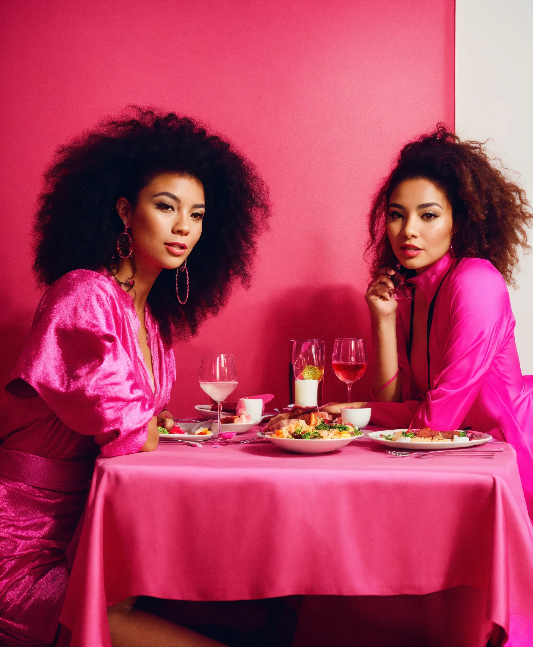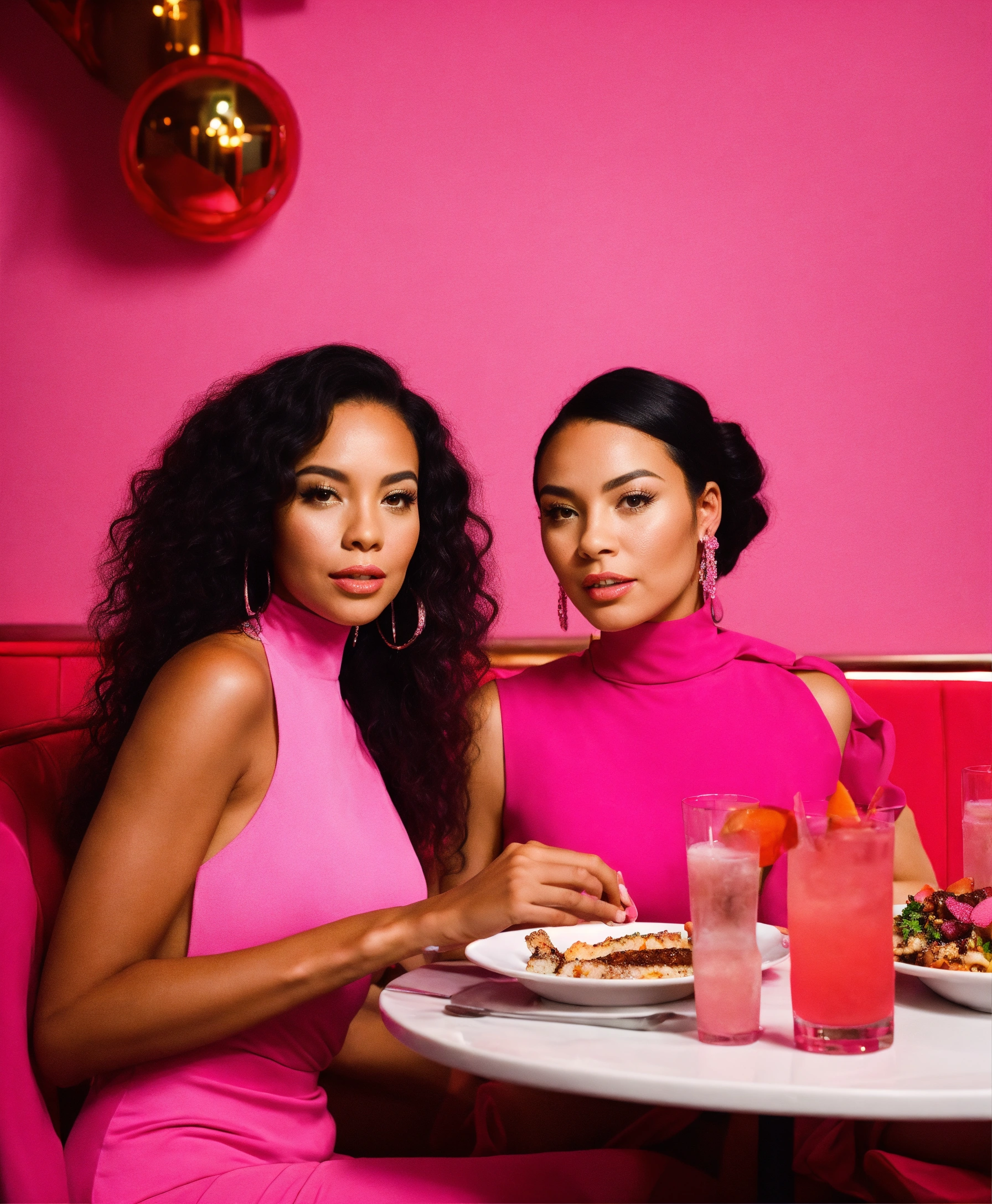 2 mixed race women dressed in all pink at dinner in bright pink in background white walls nightclub daytime