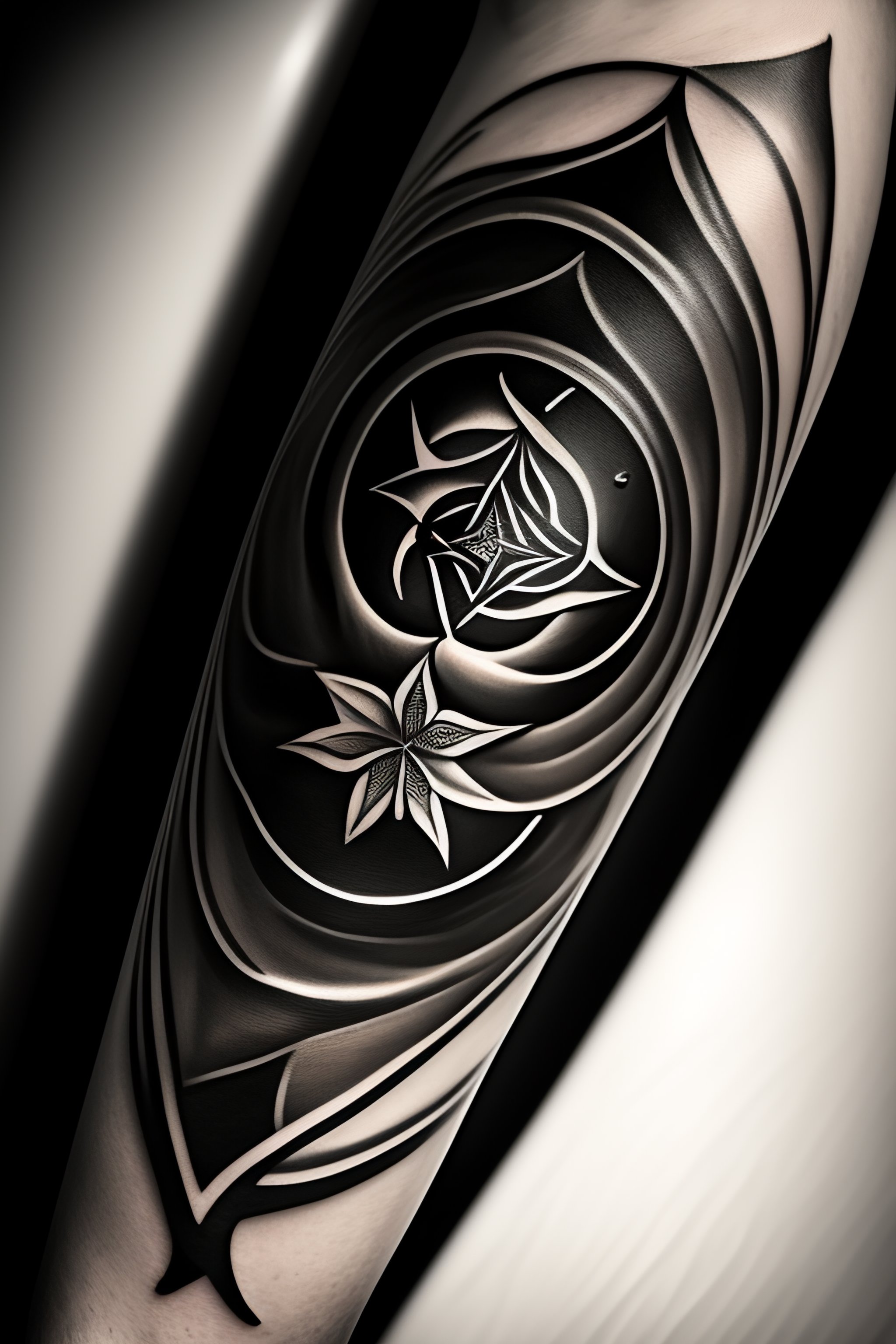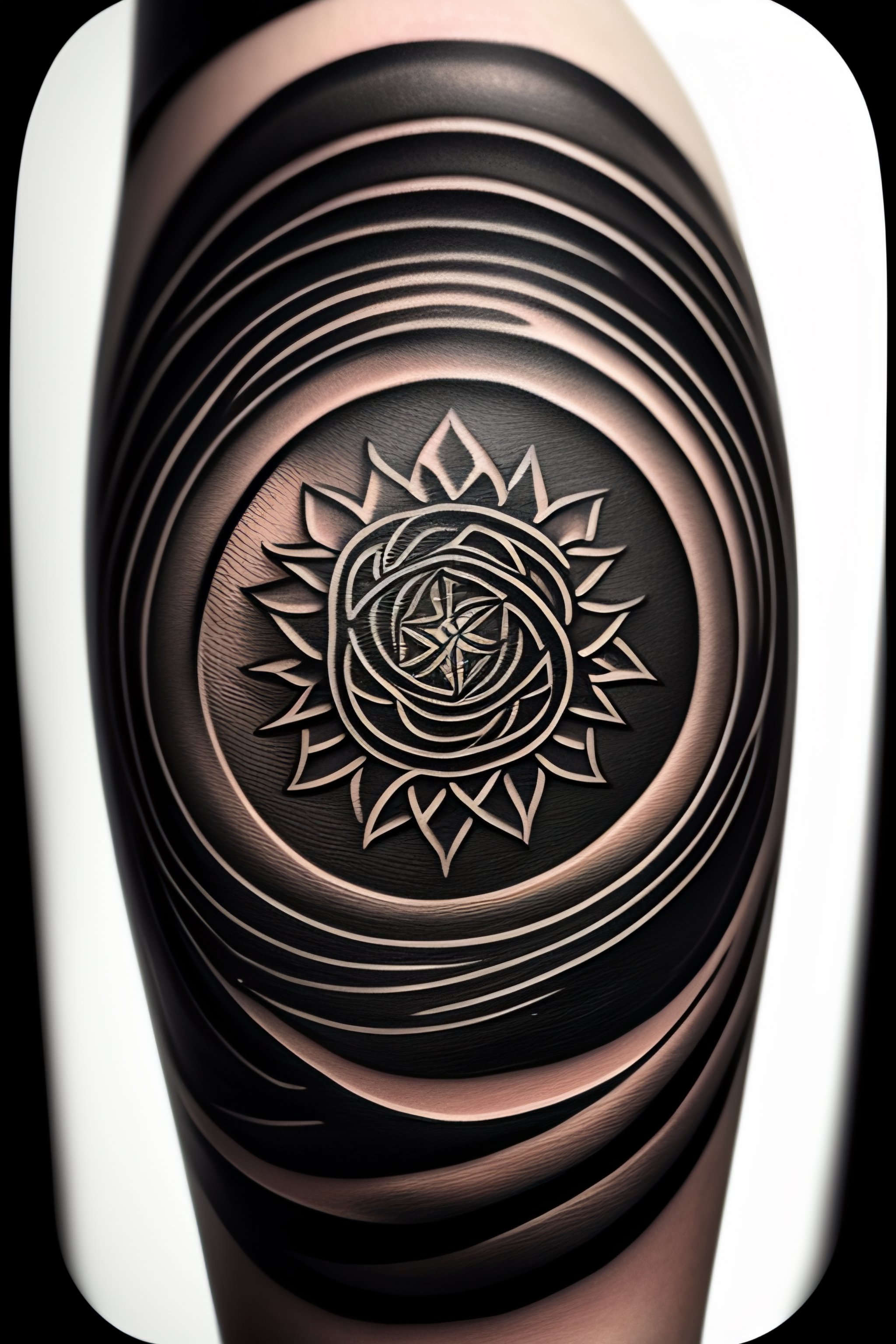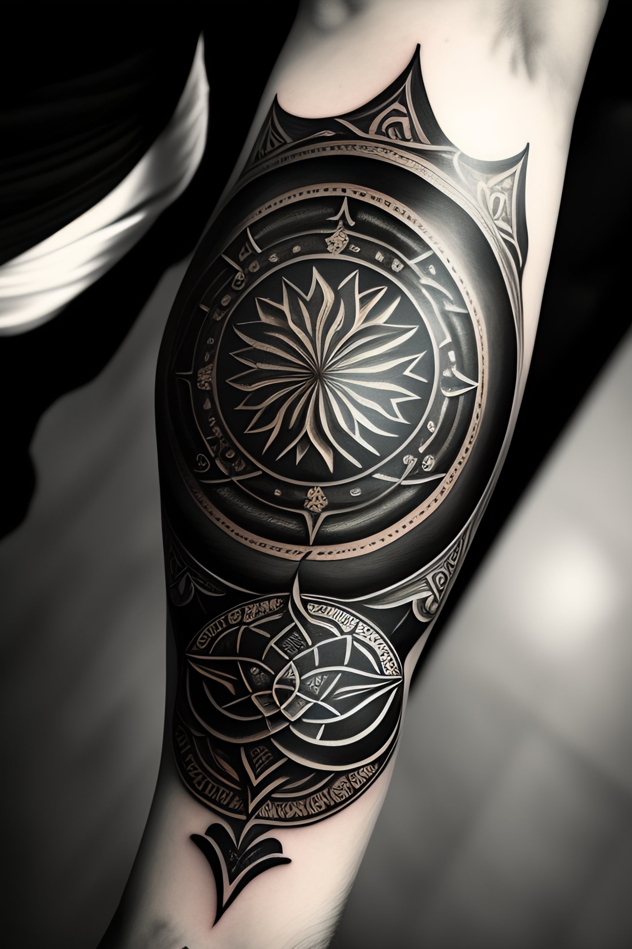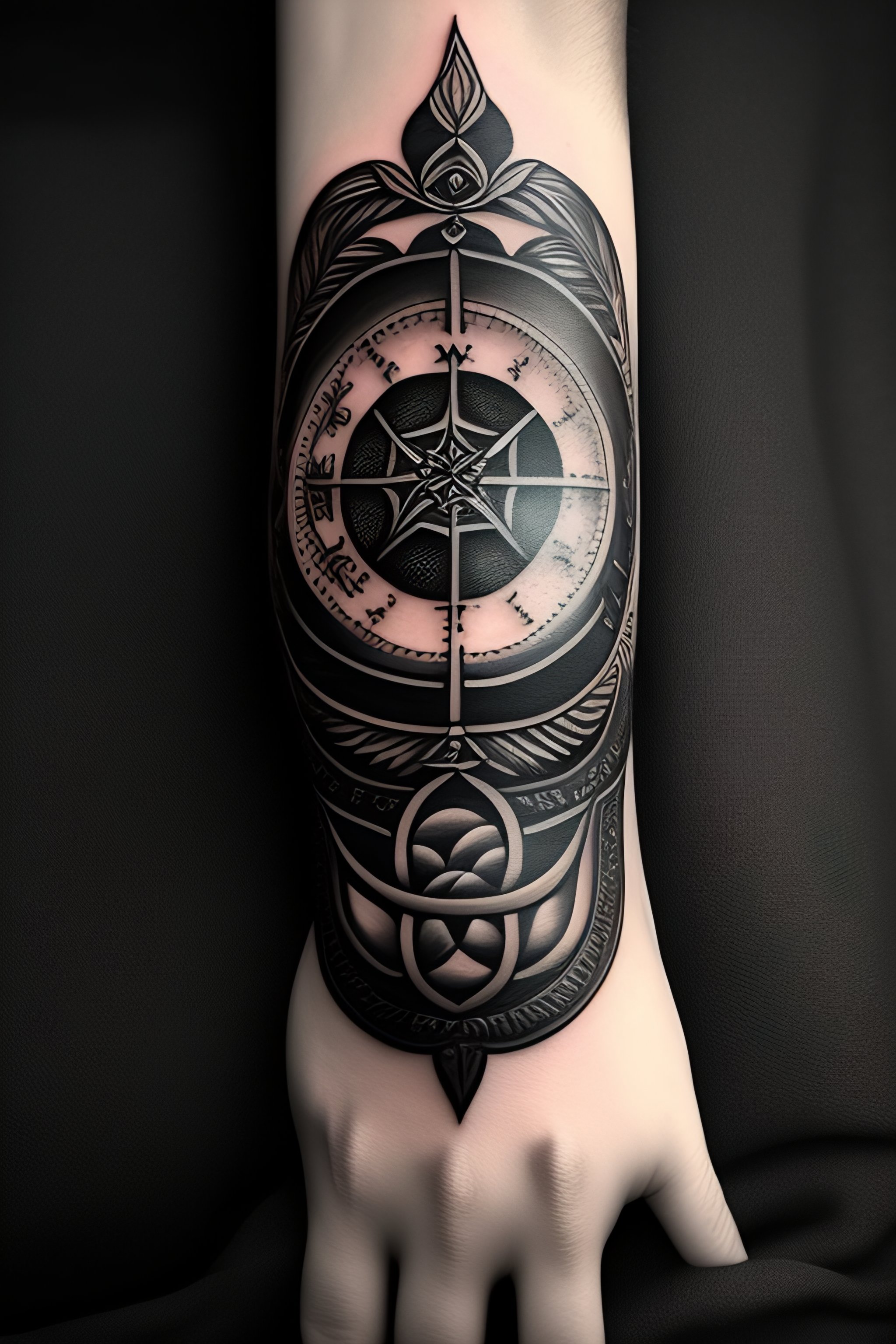 A tattoo on a hand of a wind rose in black and white