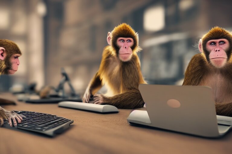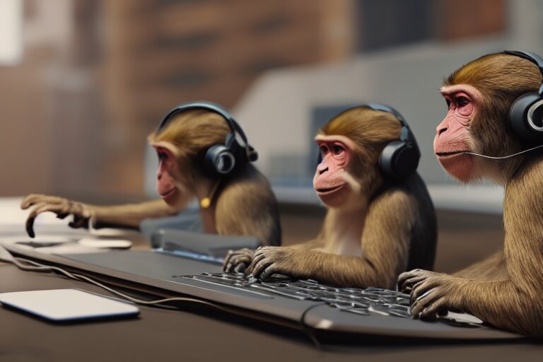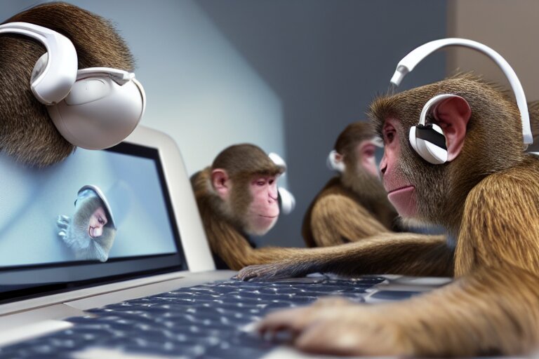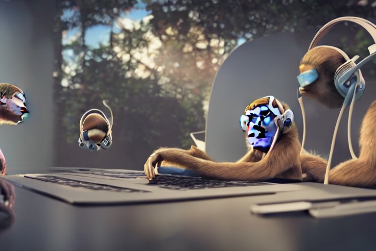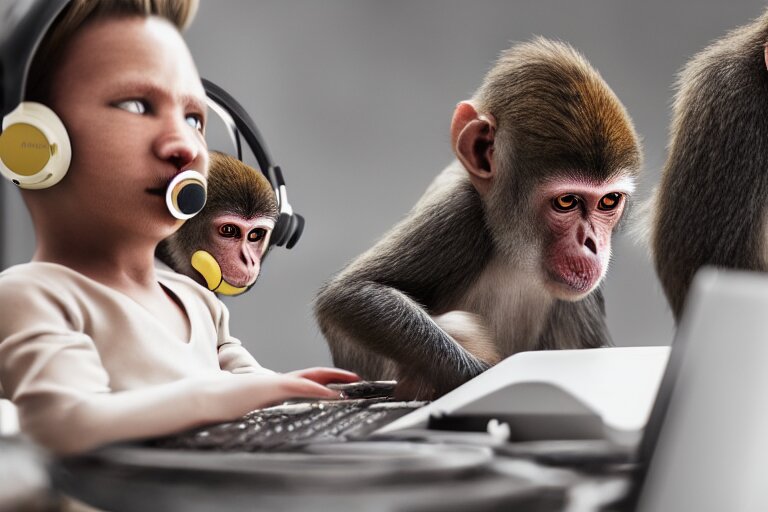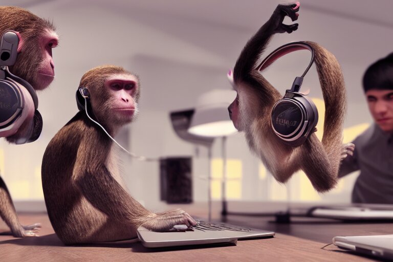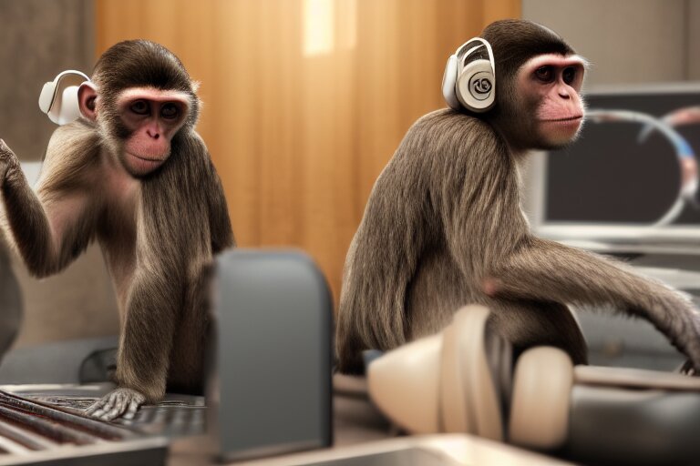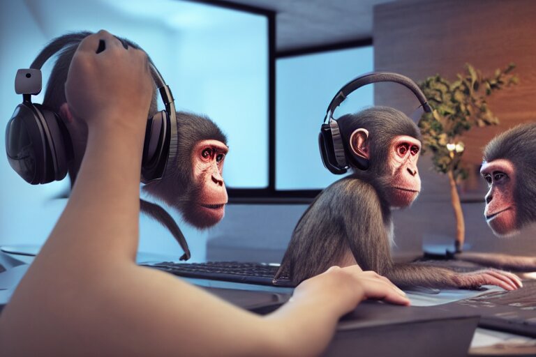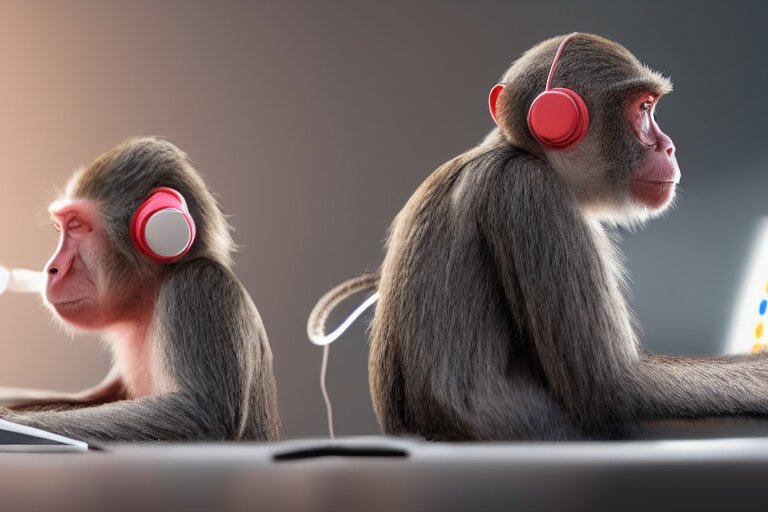 Monkeys playing on computer using headphones. ultra-detailed