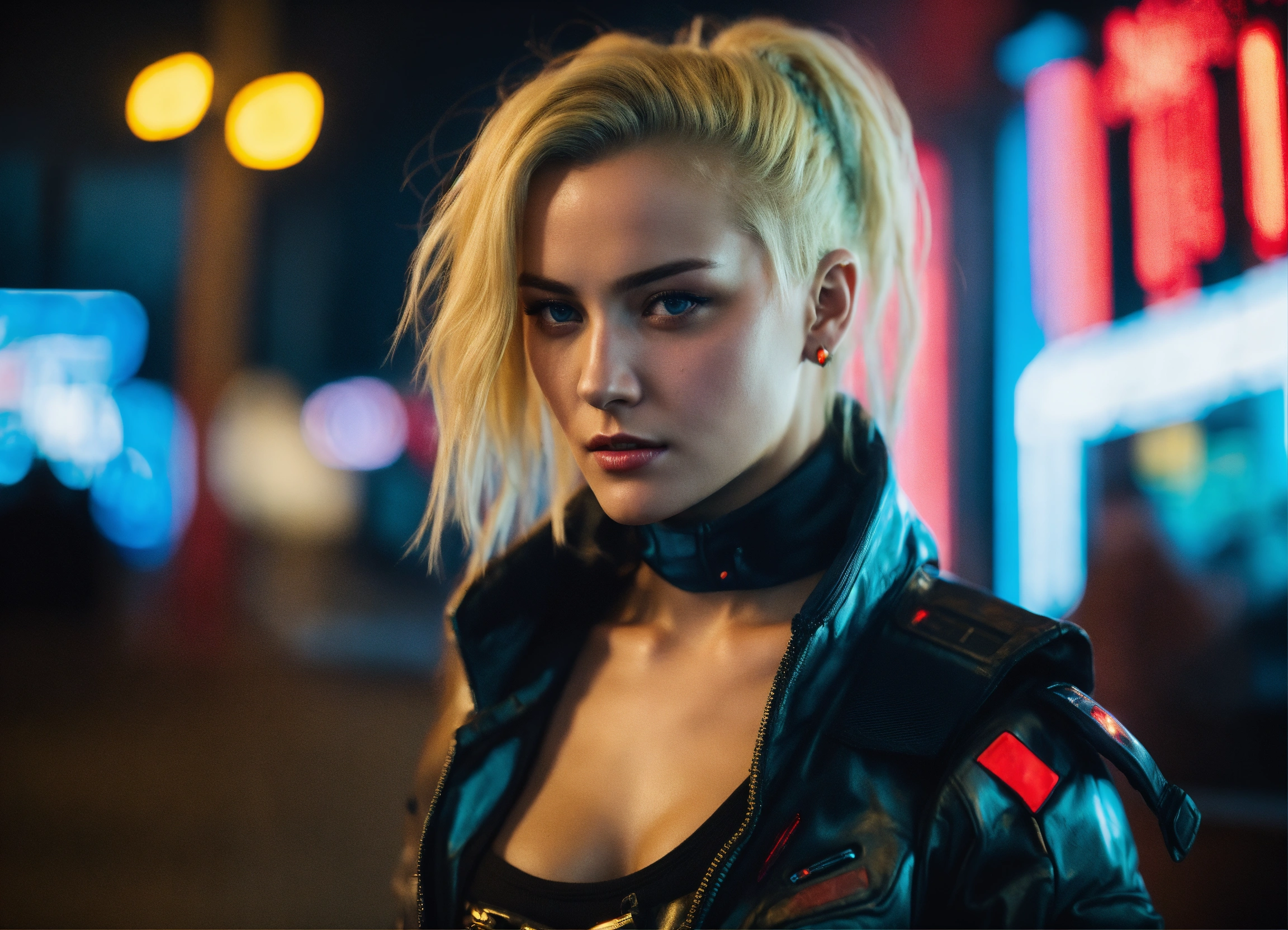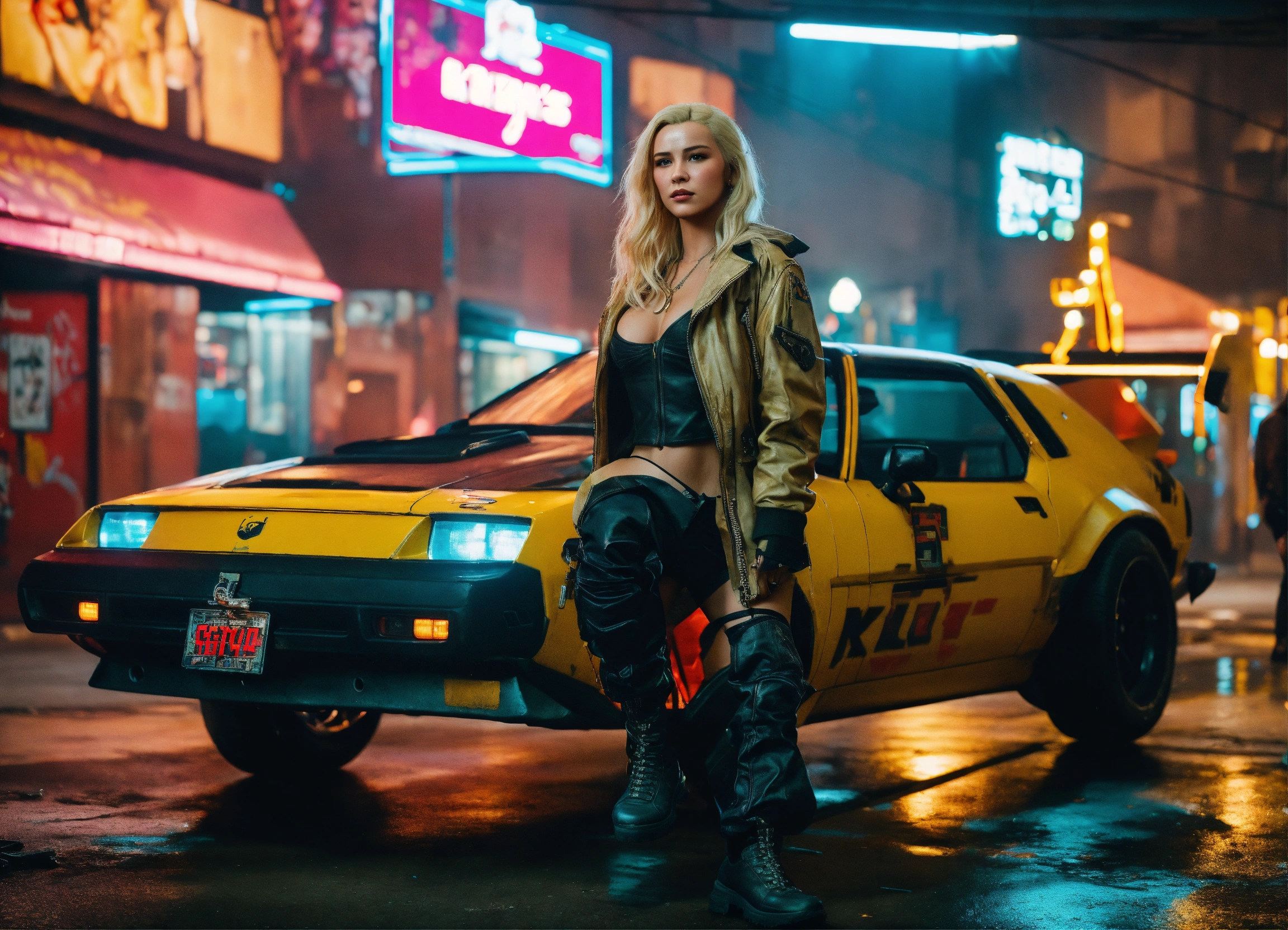 Real life photo of an actor full body front view 25 year old beautiful woman with blond hair has big angelwing's in the ghetto of cyberpunk 2077