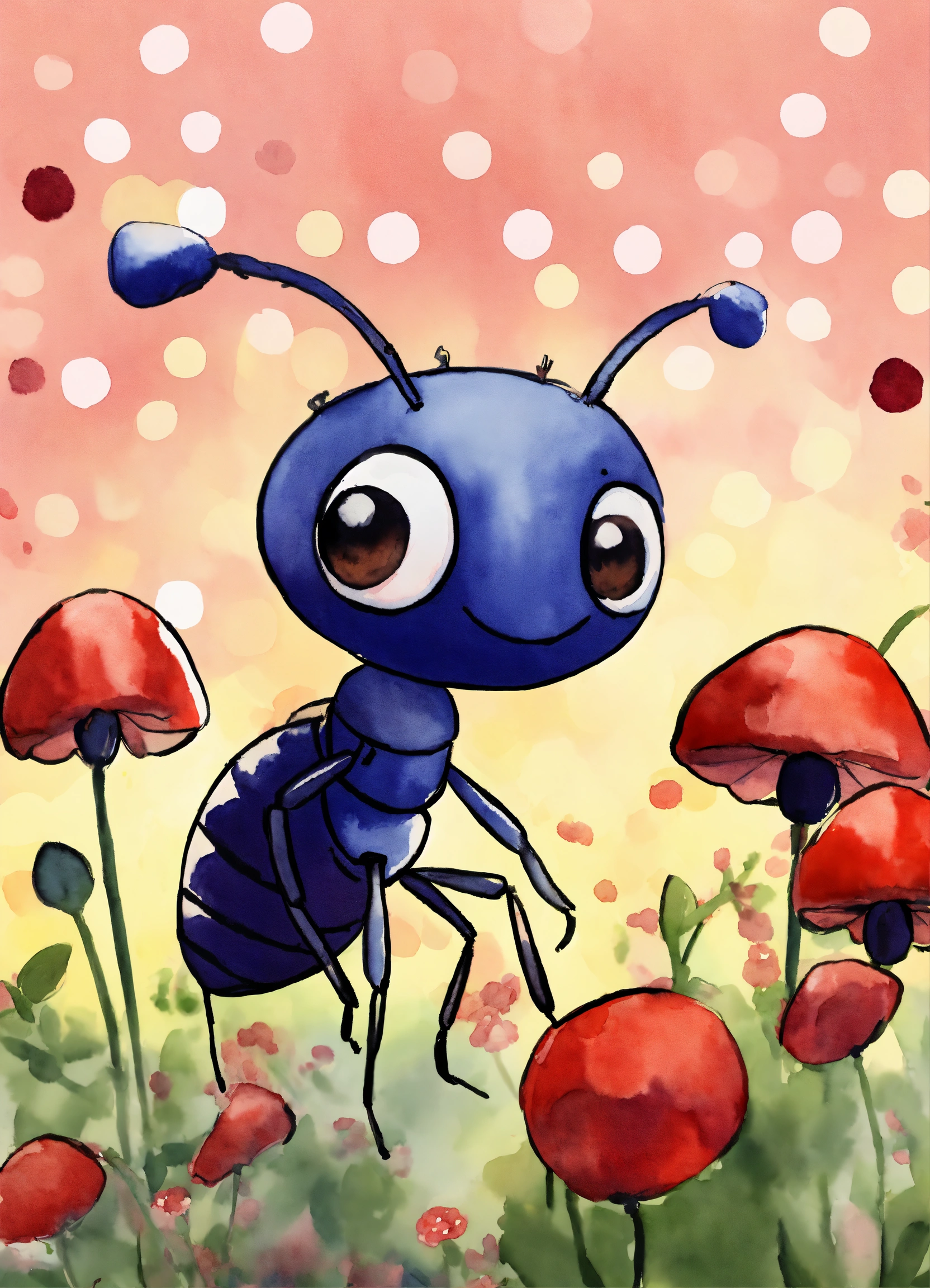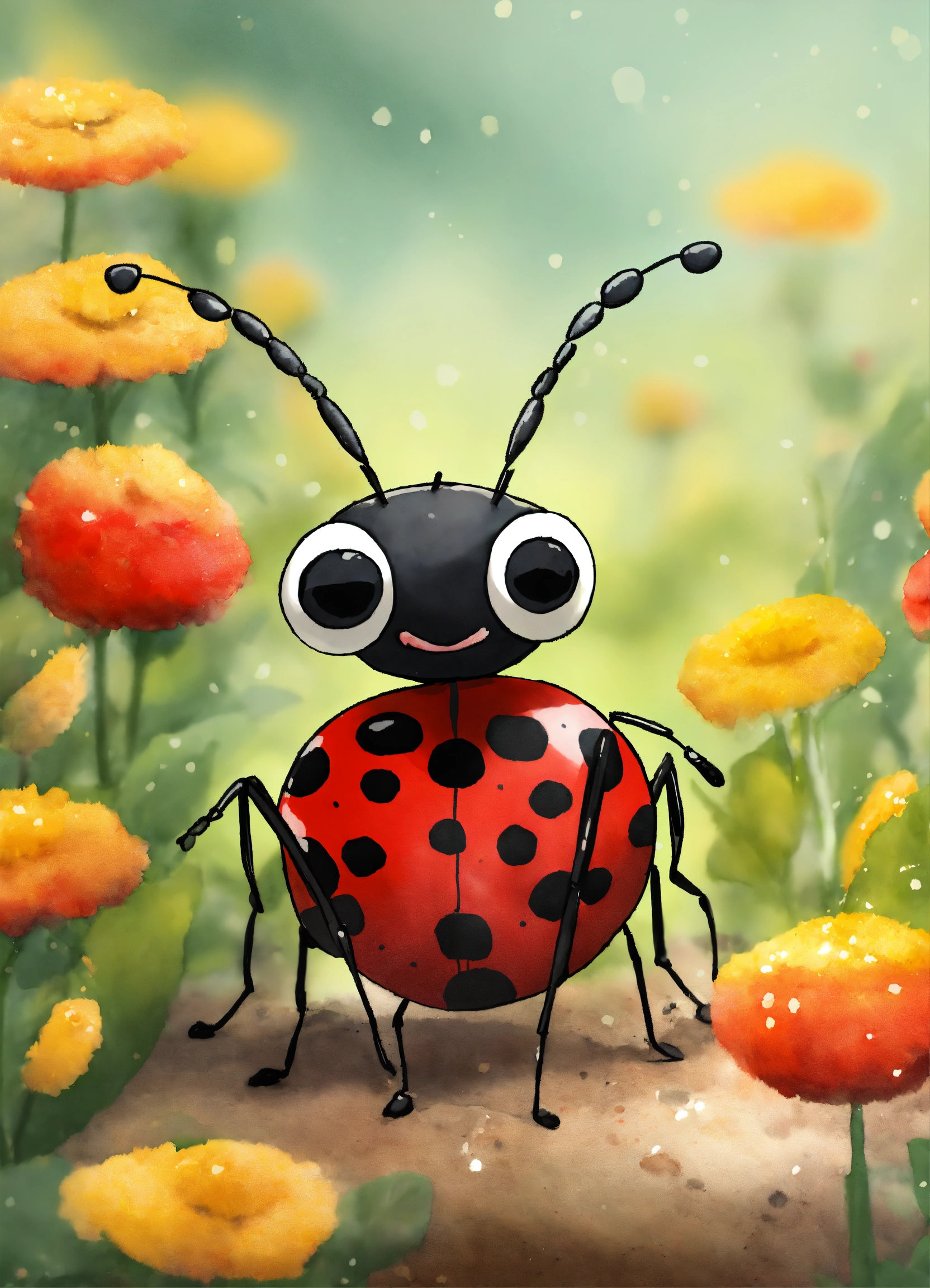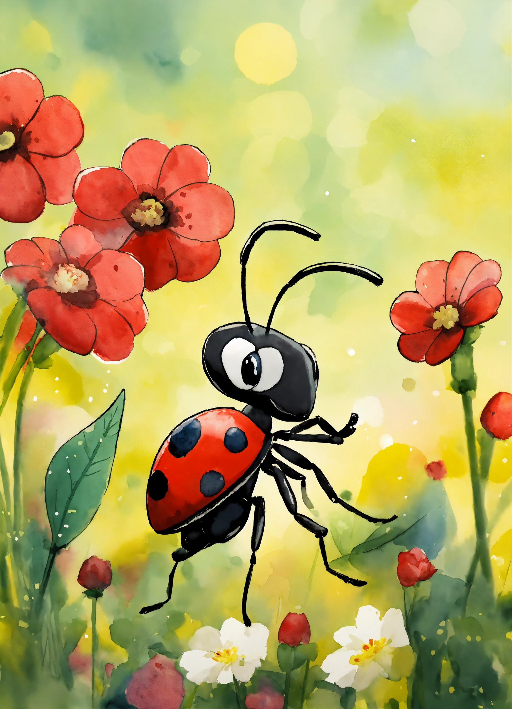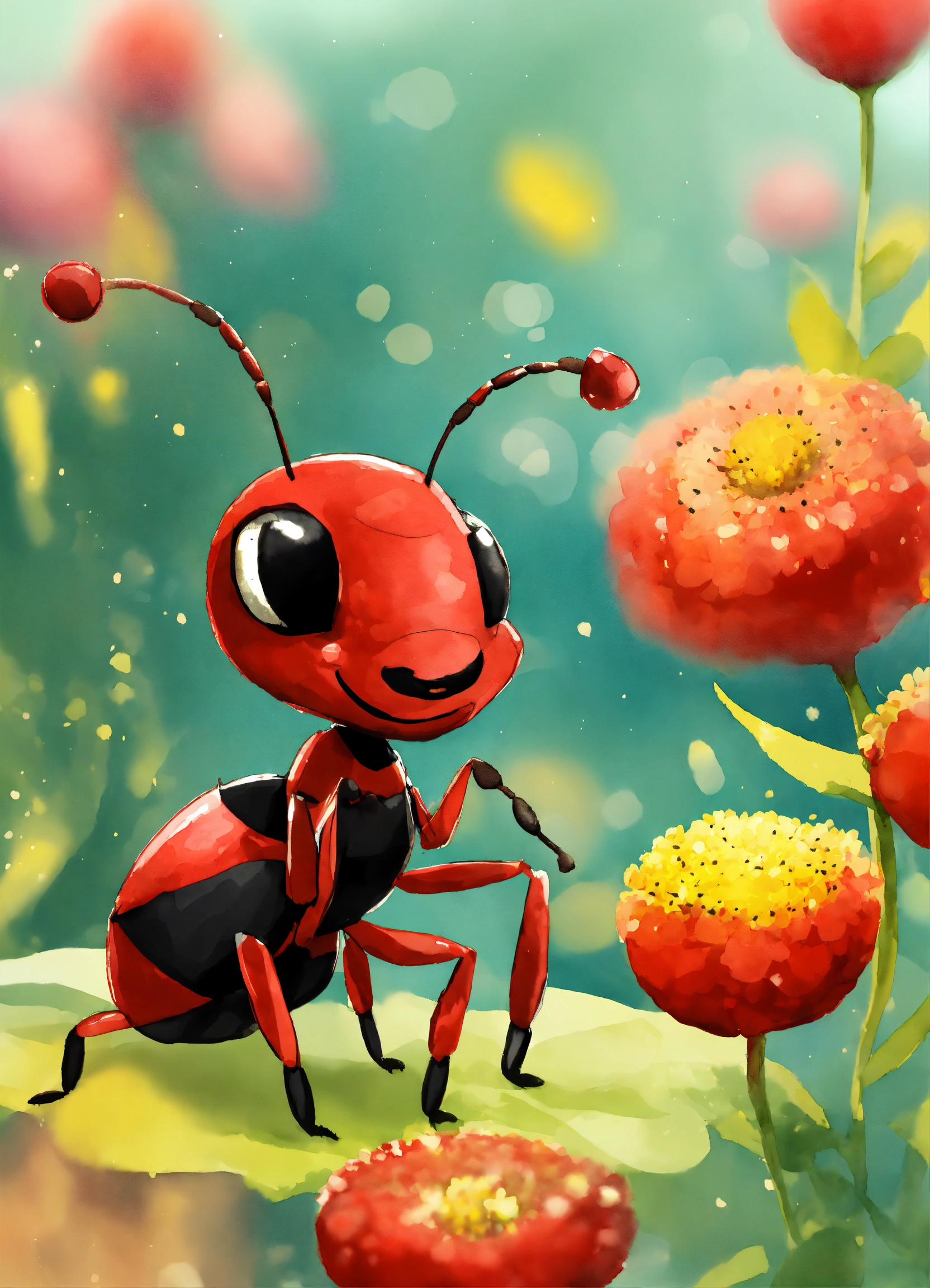Dotty the ant, round spots, cheerful smile, watercolor style, autodesk sketchbook, blooming flower garden scene, red and black with pops of yellow palette, smooth animation style, created by artist ava - - ar 31