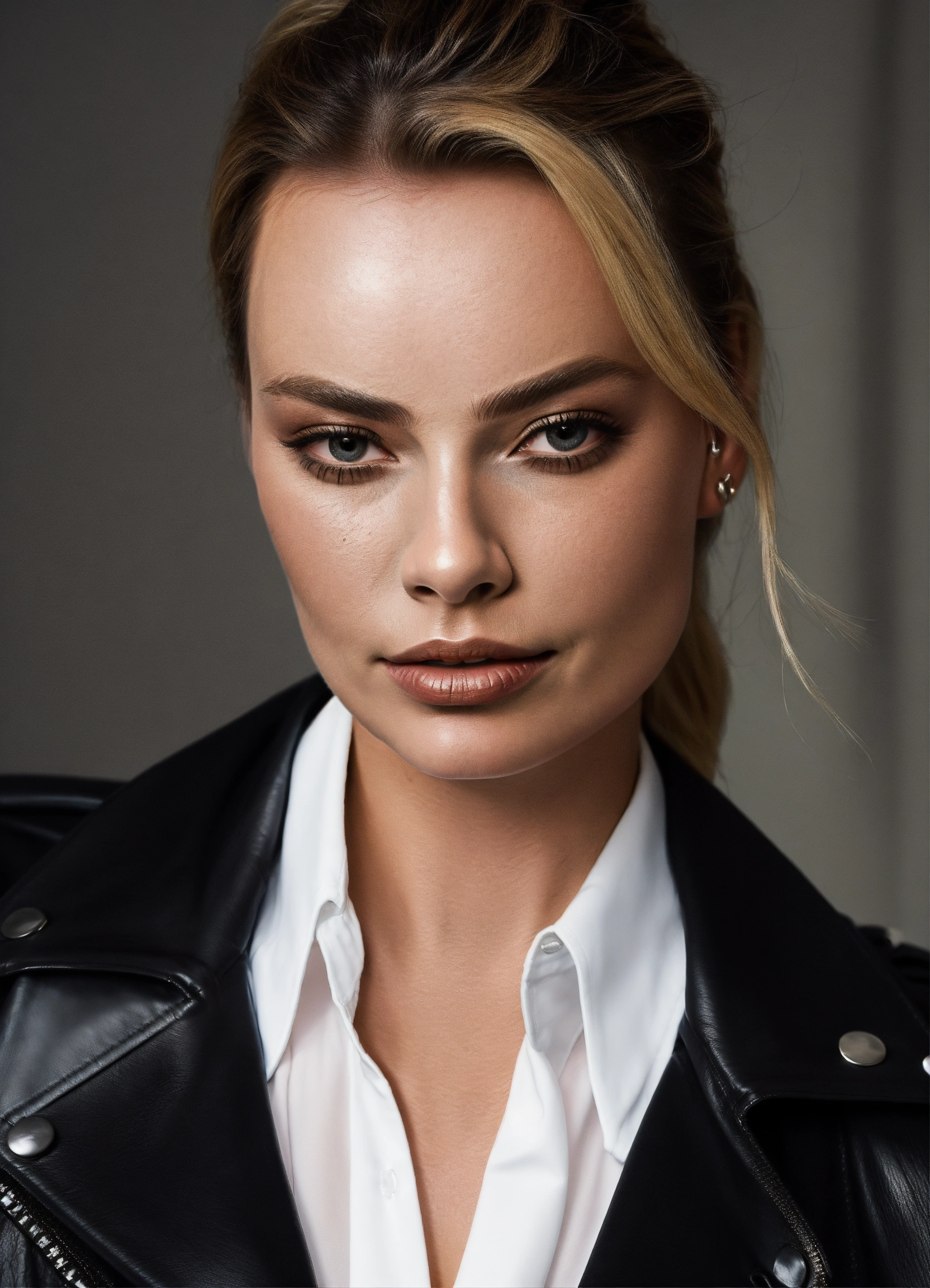 British model, distinctive face, full lips, big mouth, margot robbie, wearing business suit, black leather biker jacket and black leather skirt, white shirt and black necktie, smoky eyes makeup, office room, straight black high ponytail