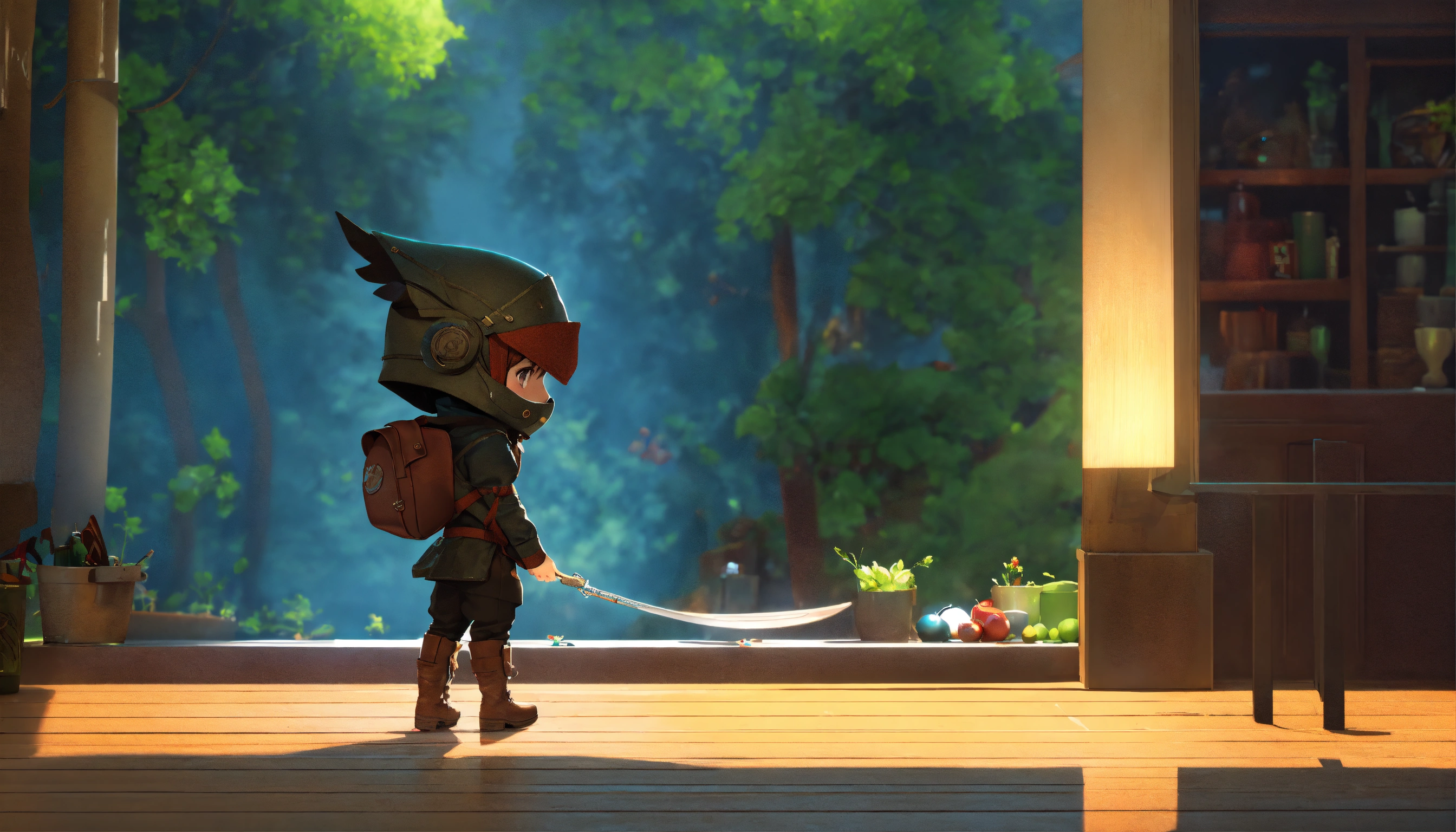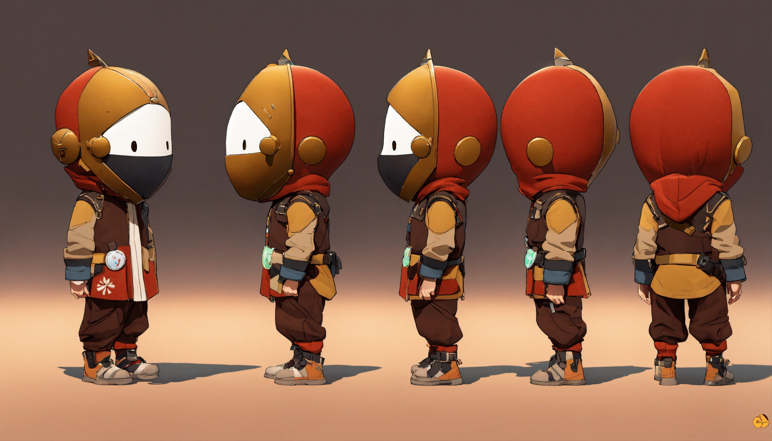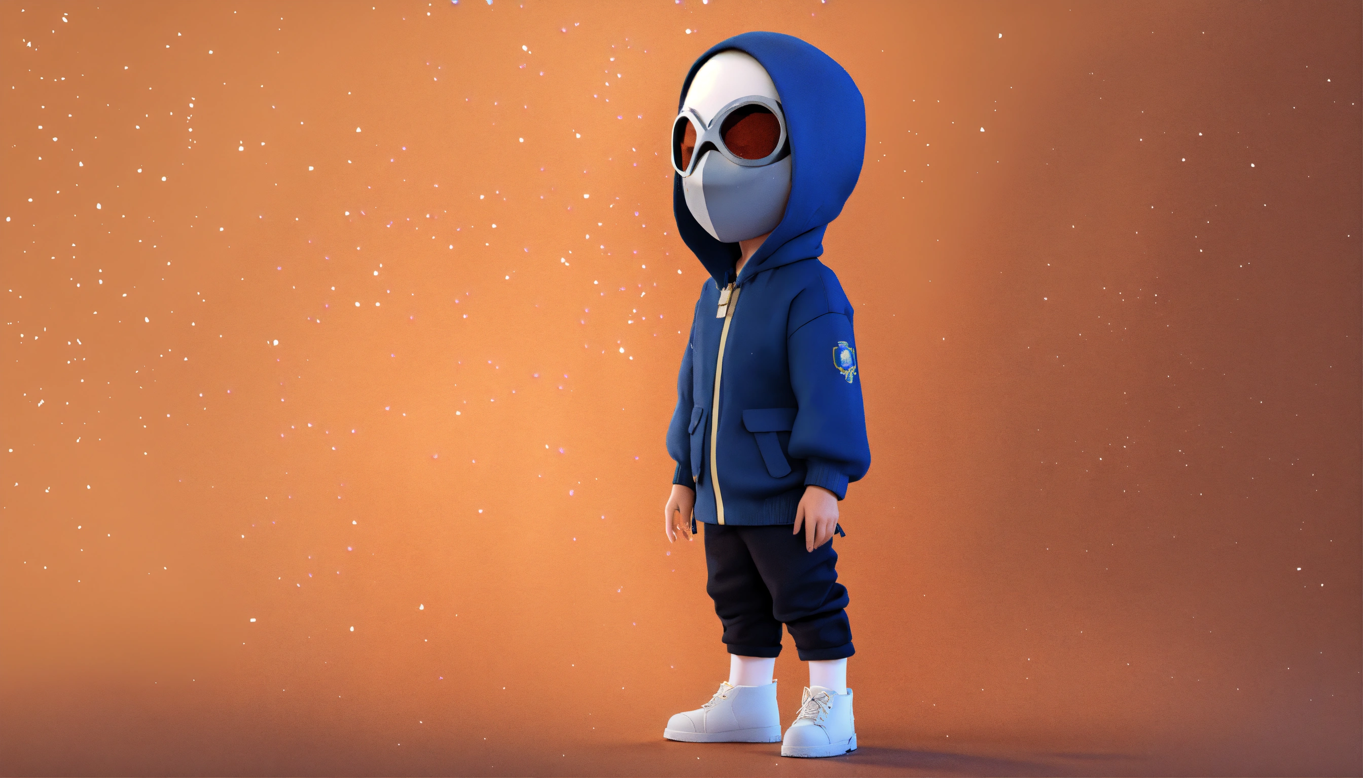 Illustration, concept art, masked, boy, illustration, full body view, side view, chibi proportions, blank background, 3d