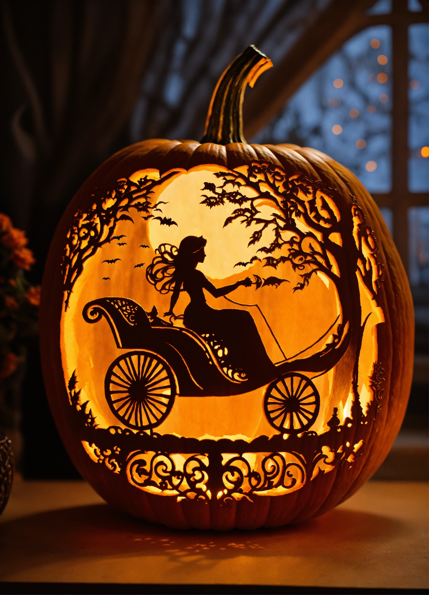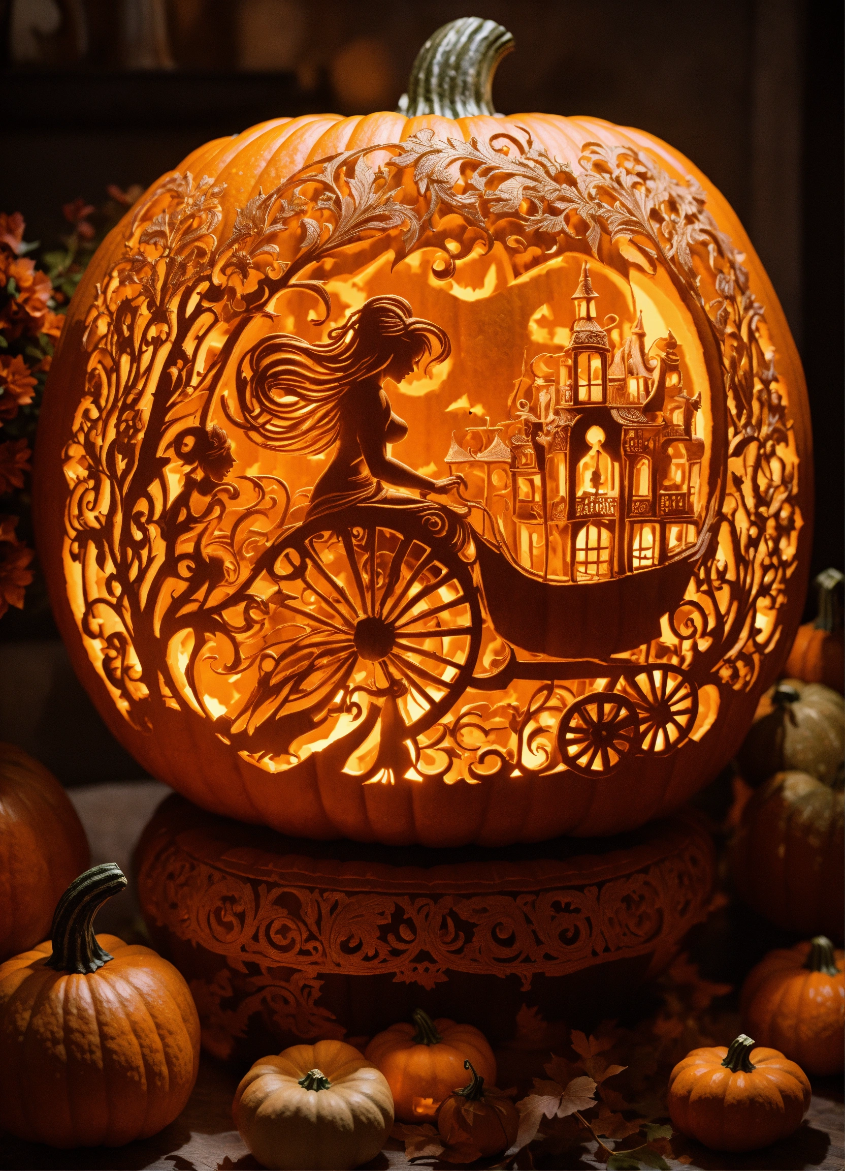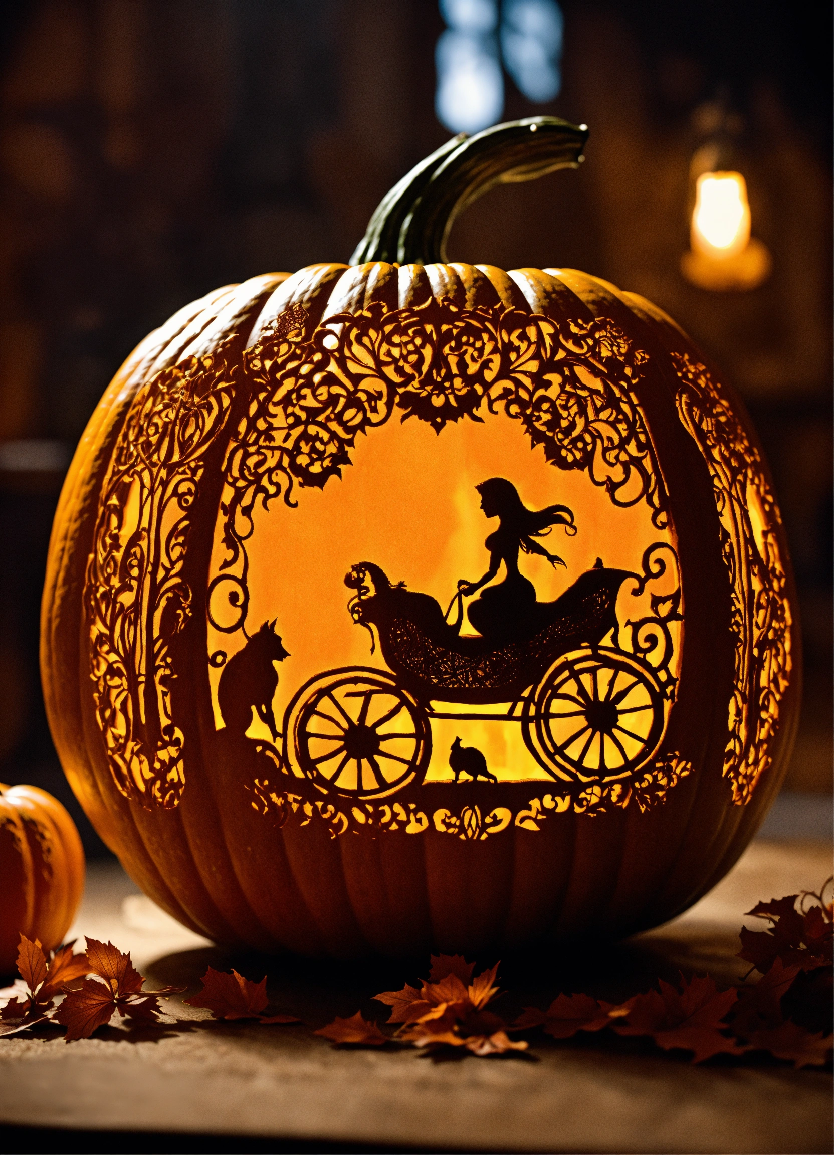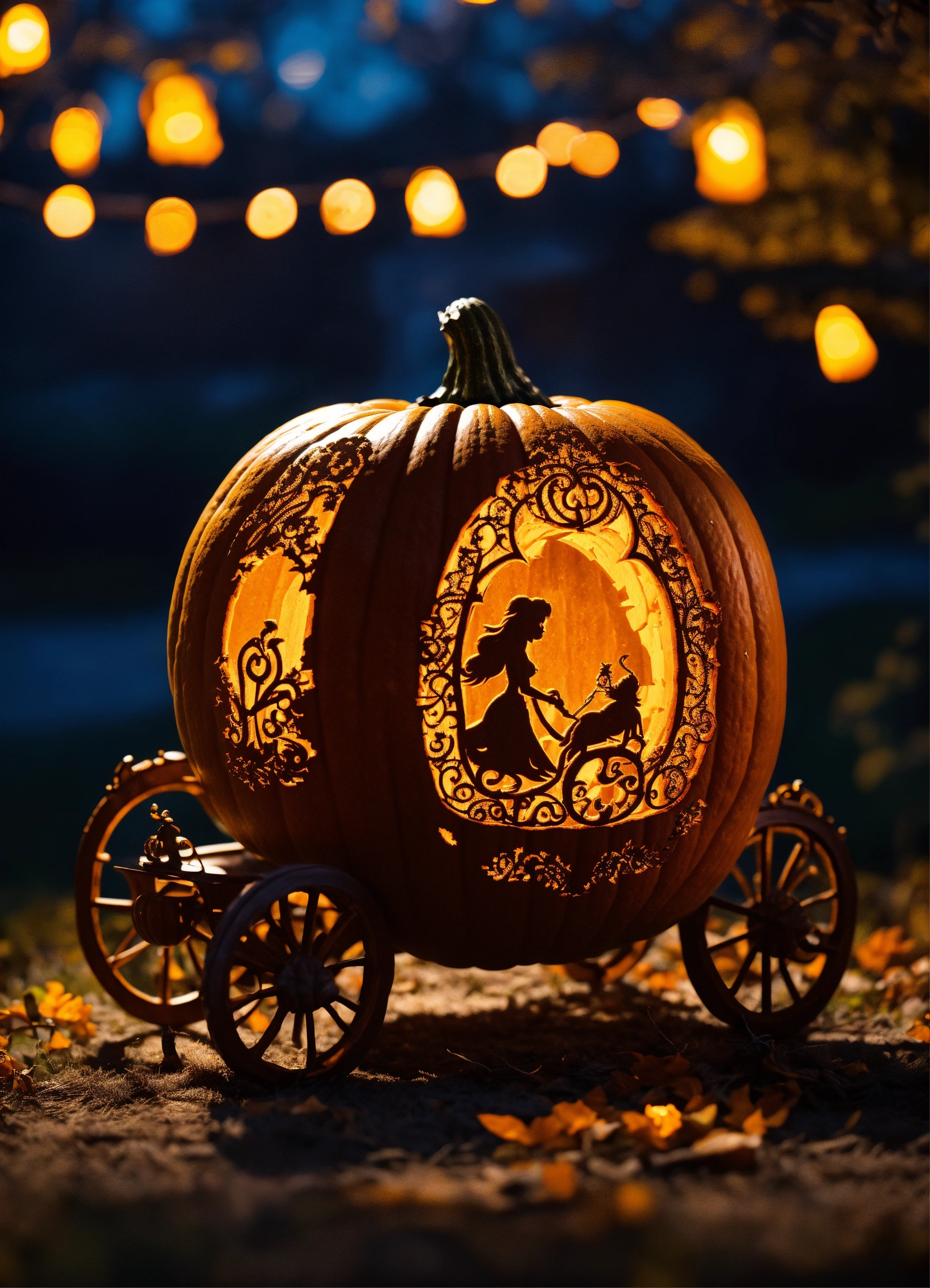 Intricately detailed ariel with a carriage carved into a pumpkin! intricate filigree patterns, detailed ariel in a carriage, detailed carving into pumpkin's surface, cinematic light, relaxing, maniac pumpkin carvers pumpkin favourite behance, a breathtaking storybook illustration, epic dramatic, breathtaking intricate details, background halloween, side light.