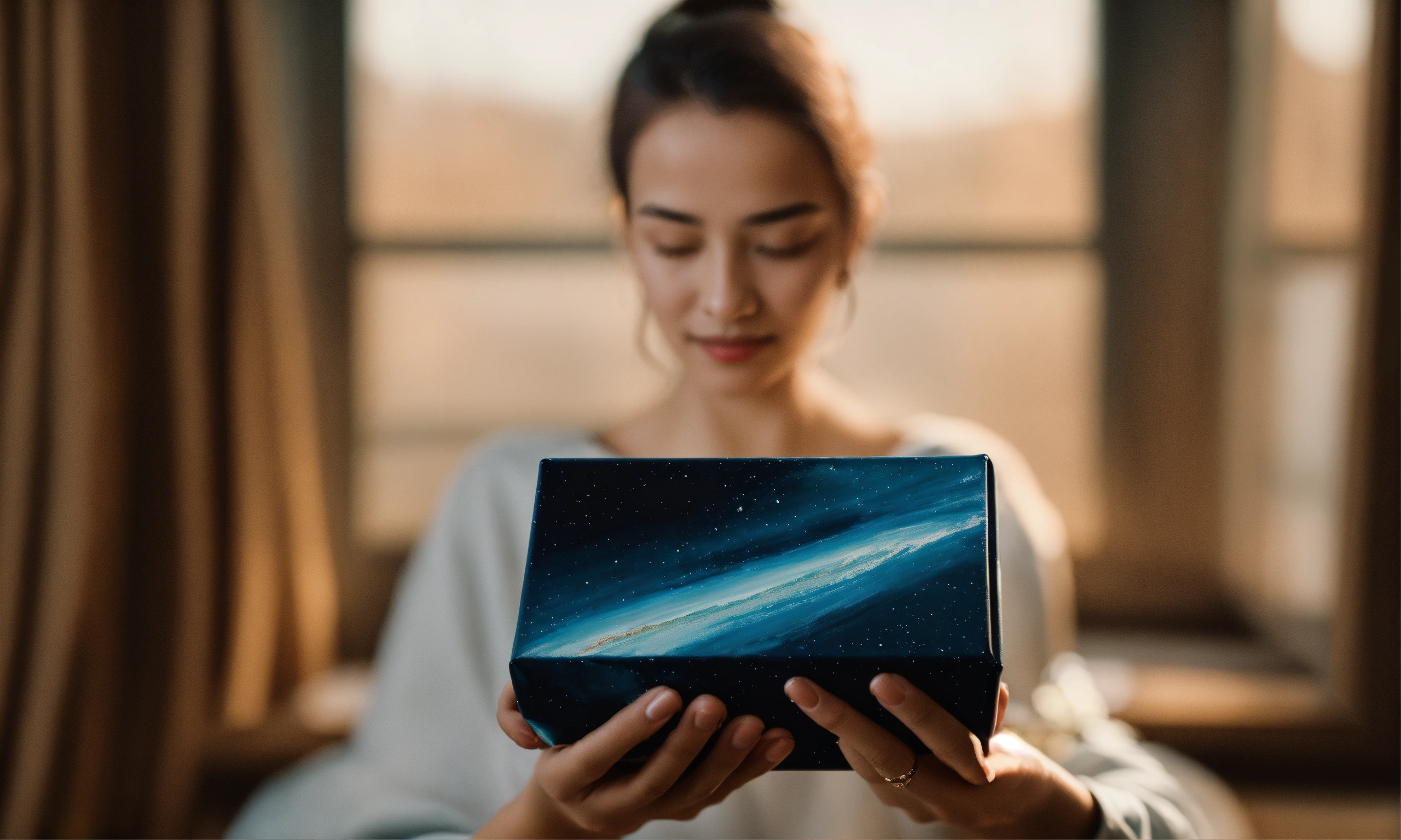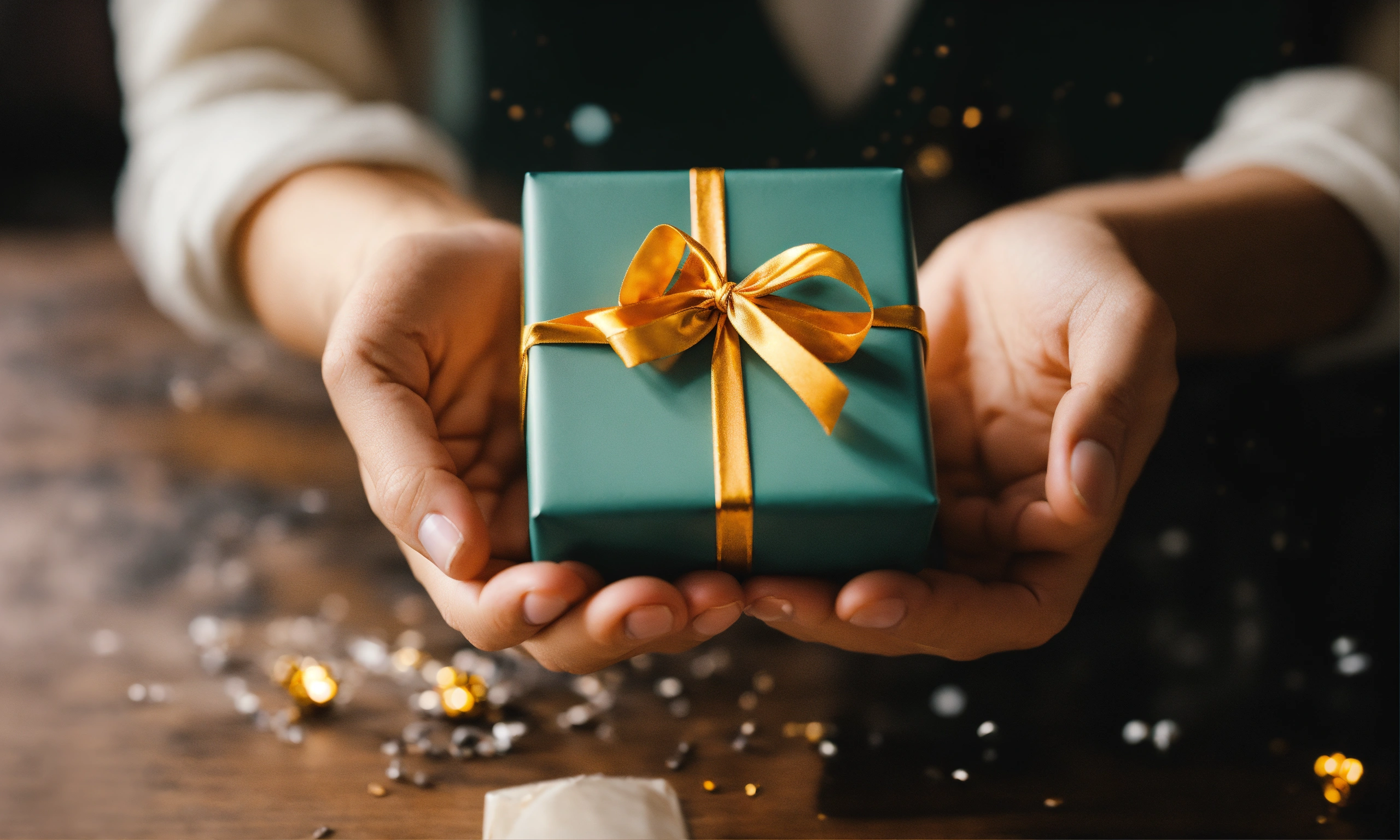 Gifting a wrapped gift, office vibes, minimalist, beautiful, open hands offering gift to camera. the photo generated inside a frame, a painter's canvas