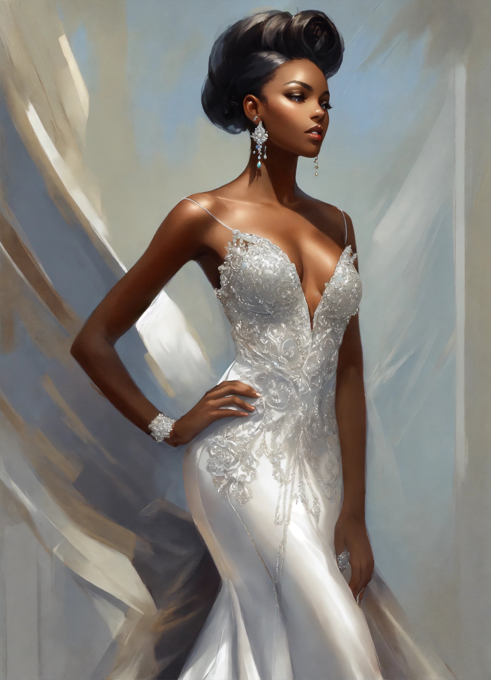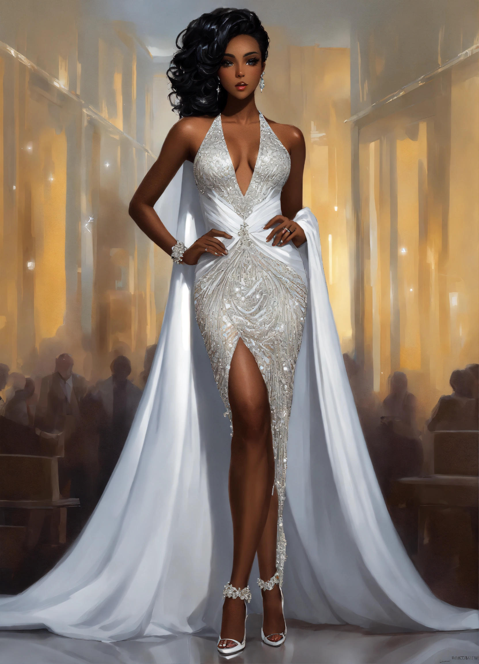 Beautiful dark skin black business woman wearing stylish haute couture wide bridal gown with sheer swarovski crystal dress outfit white clothes, silver stiletto heels, detailed line art, fine details, no background, full body view, top of hair, top of head to toe, center, solid white background, greg rutkowski
