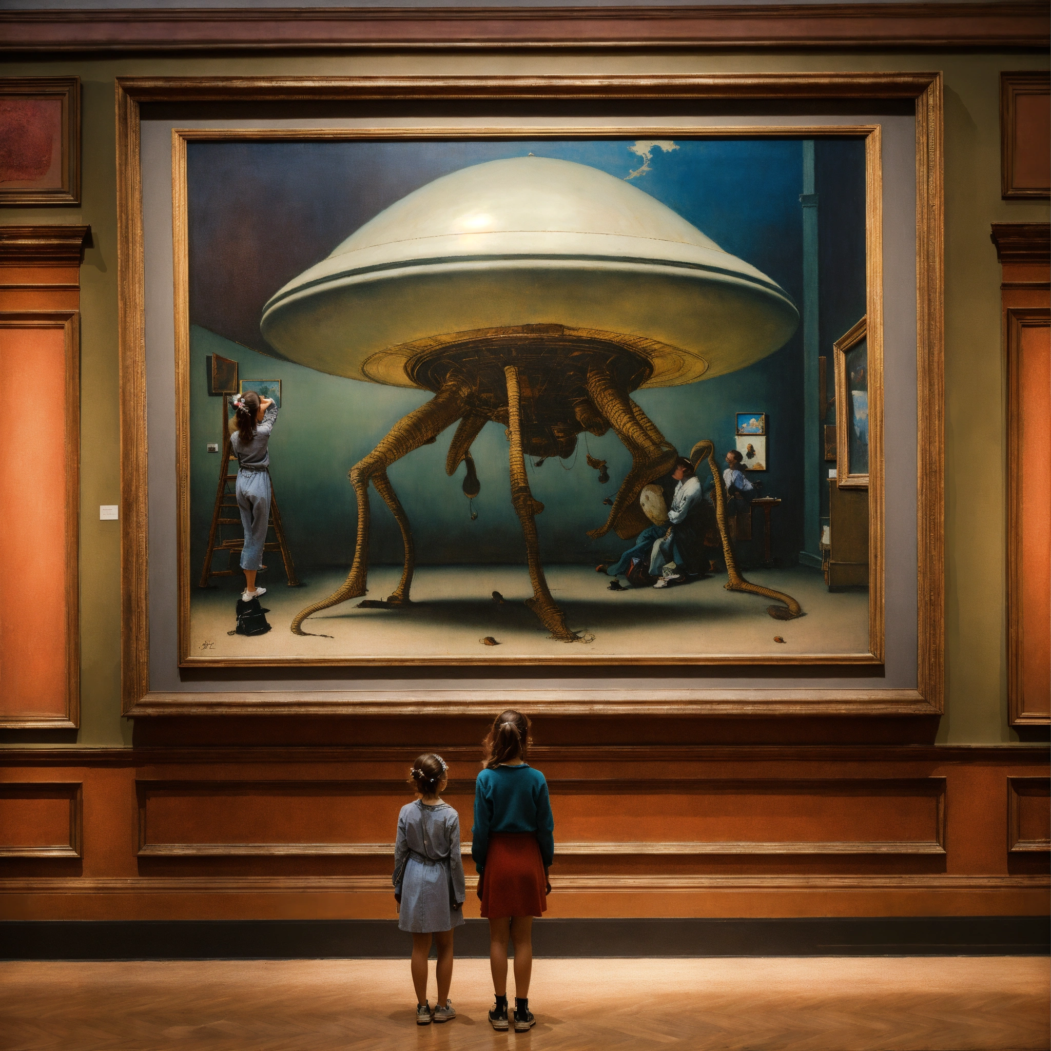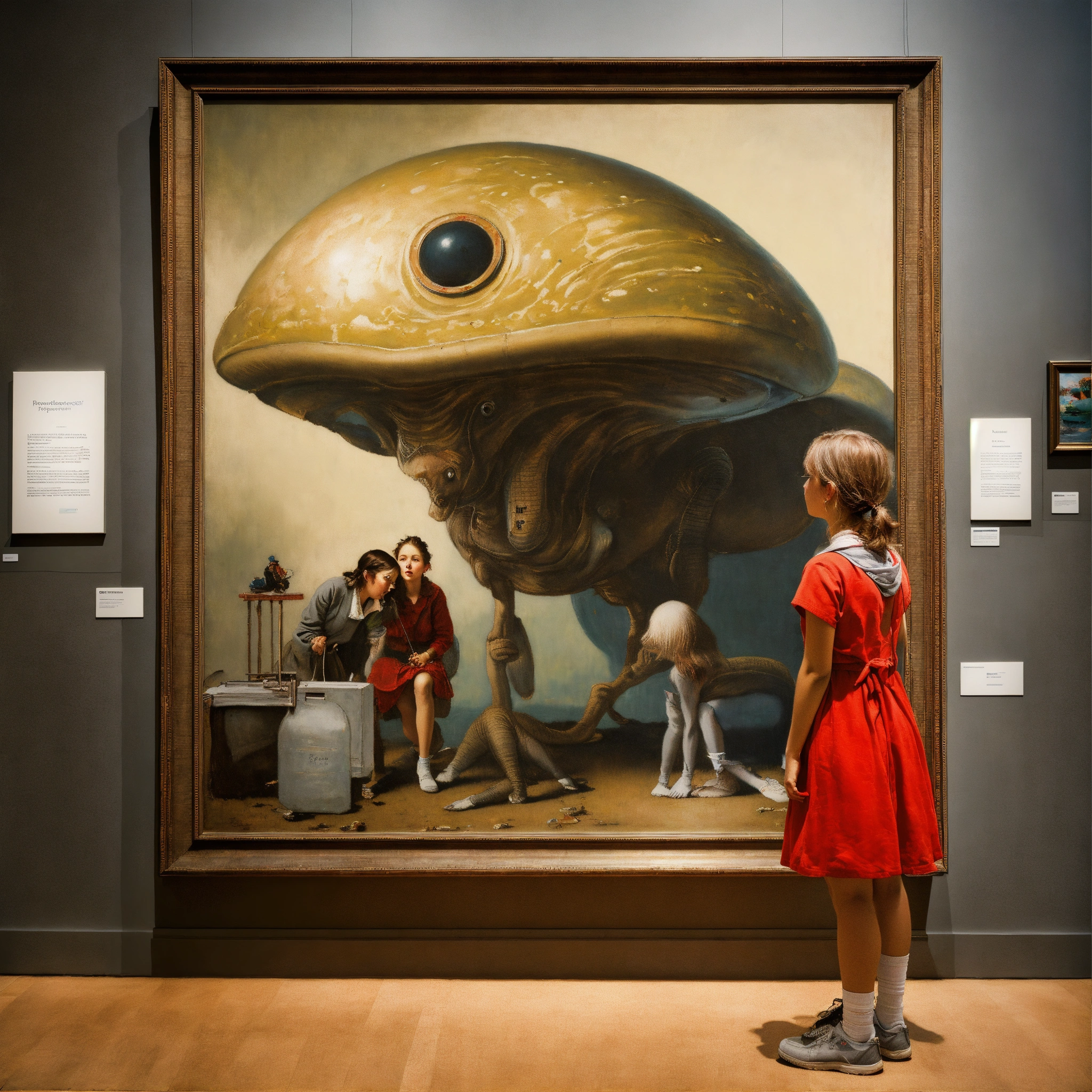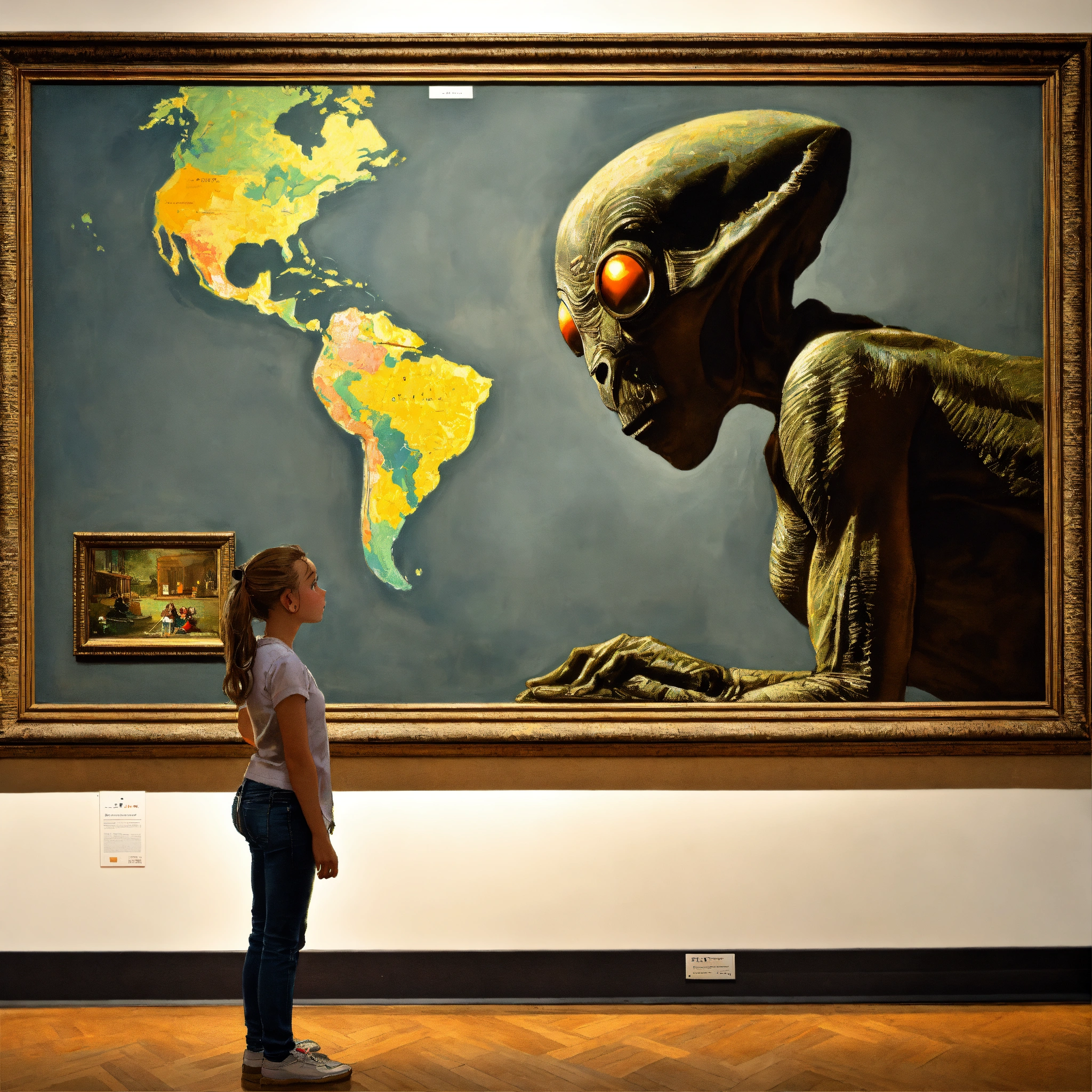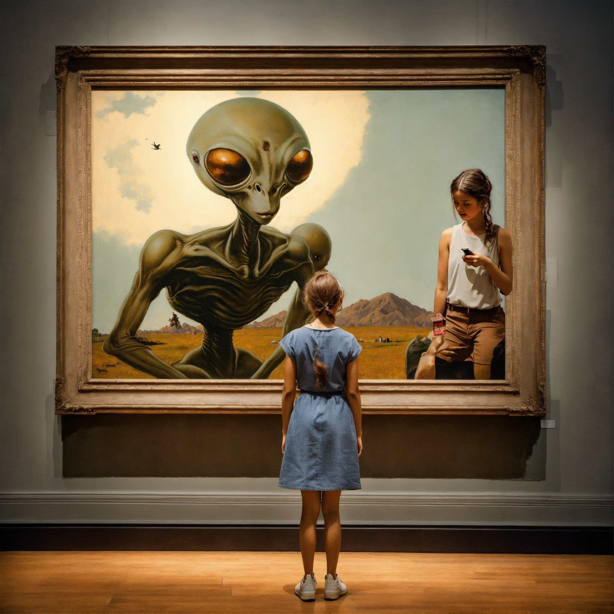 A realistic photograph of a norman rockwell painting, a girl is looking at a large painting of a grey alien on a large canvas in an art gallery