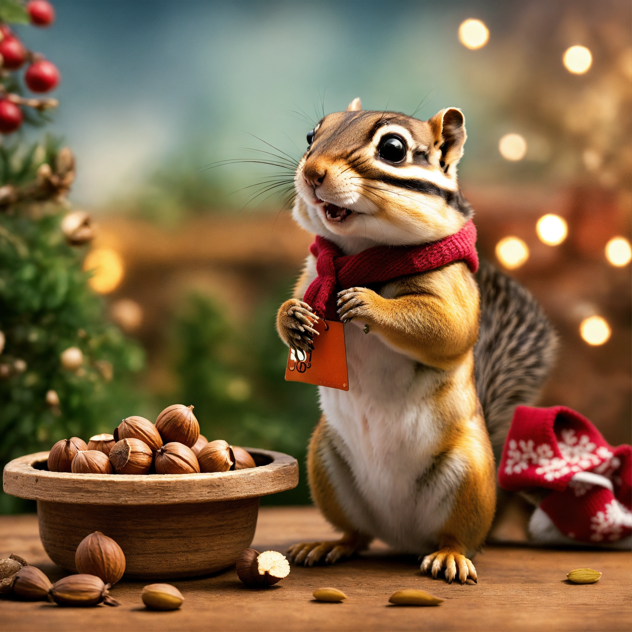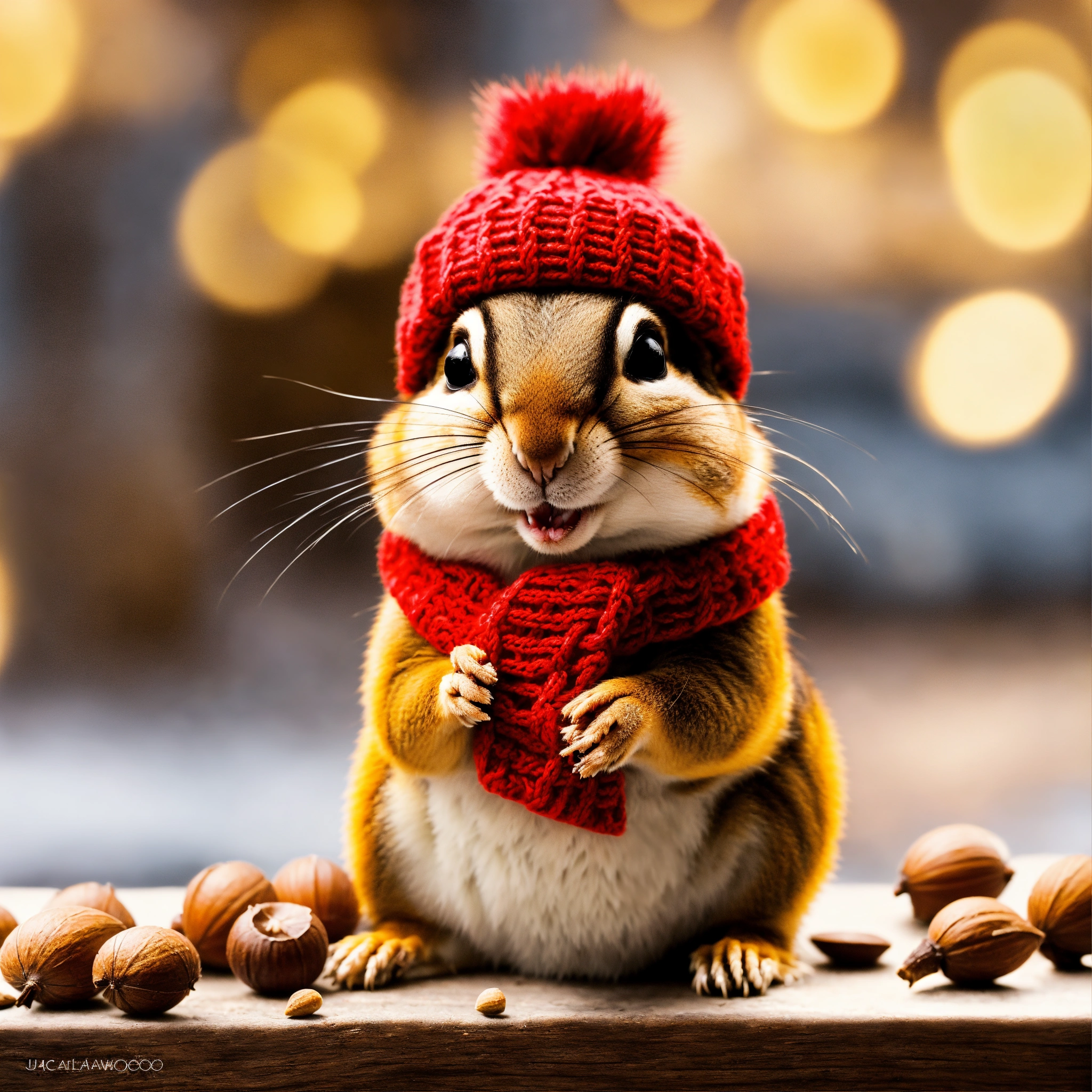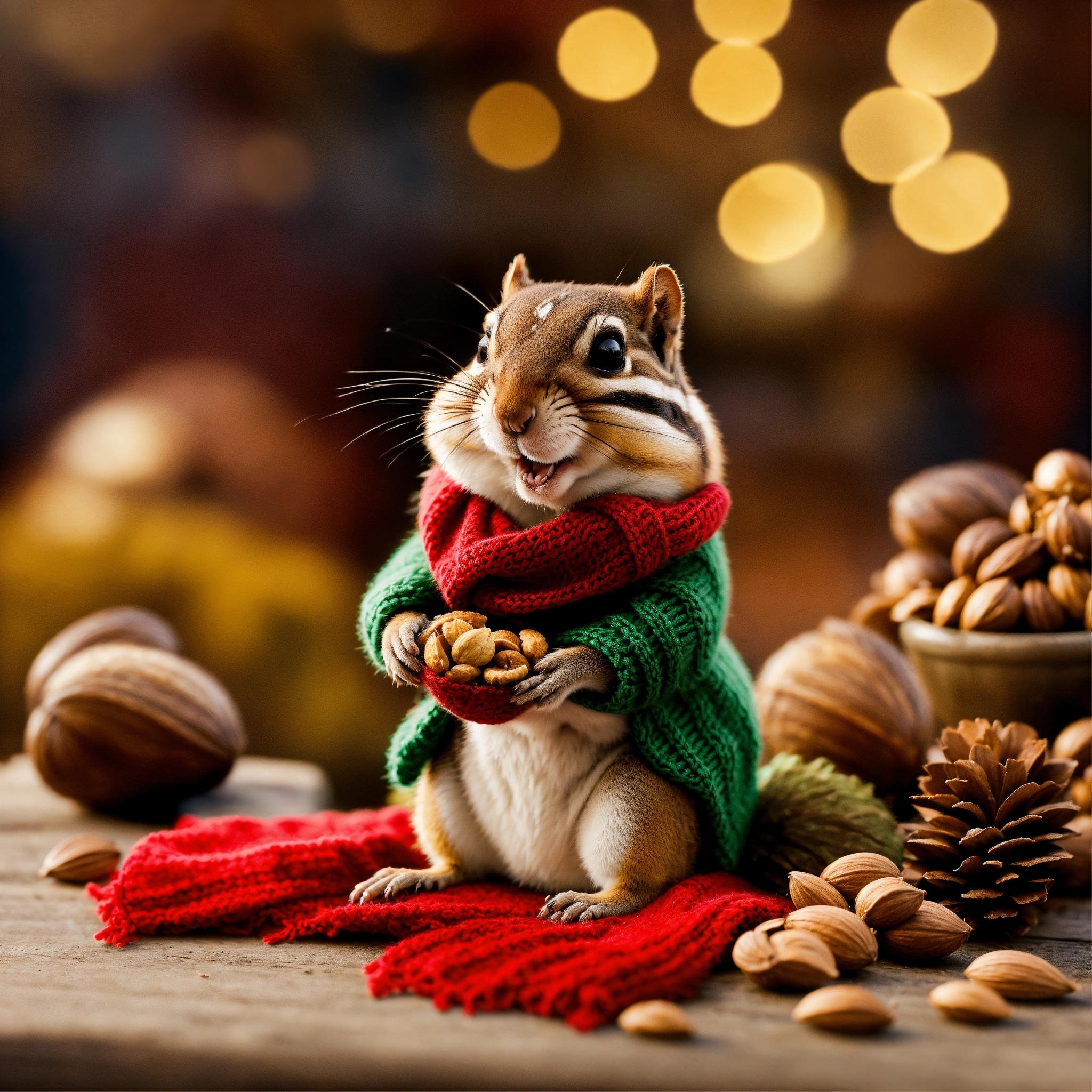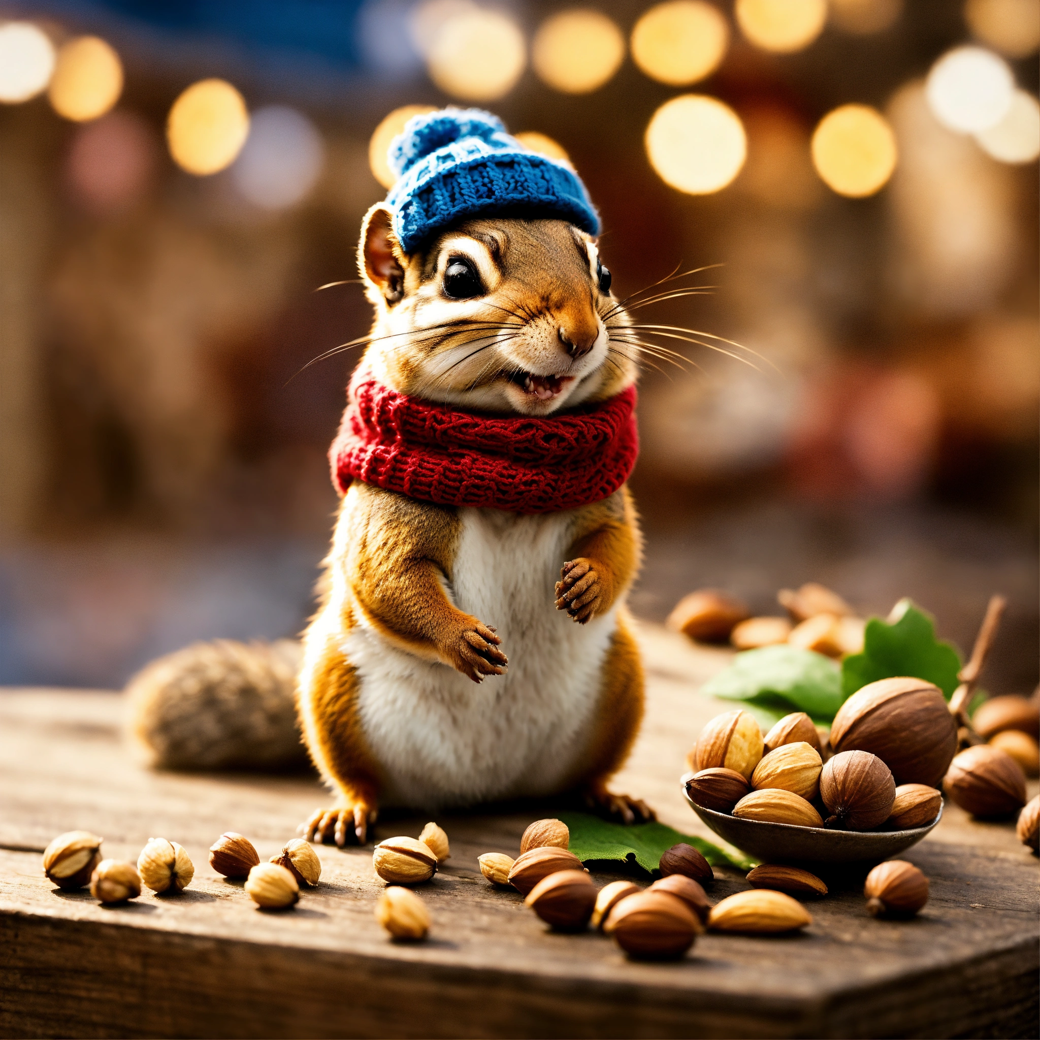 Create a photo-realistic photography image of a chipmunk with a "nuts for sale" stand, trading acorns for cozy winter scarves and hats. product photography, whimsical and playful, warm and light environment, a medium shot ultra realistic
