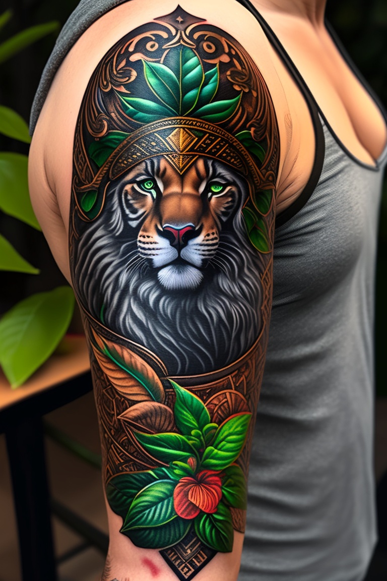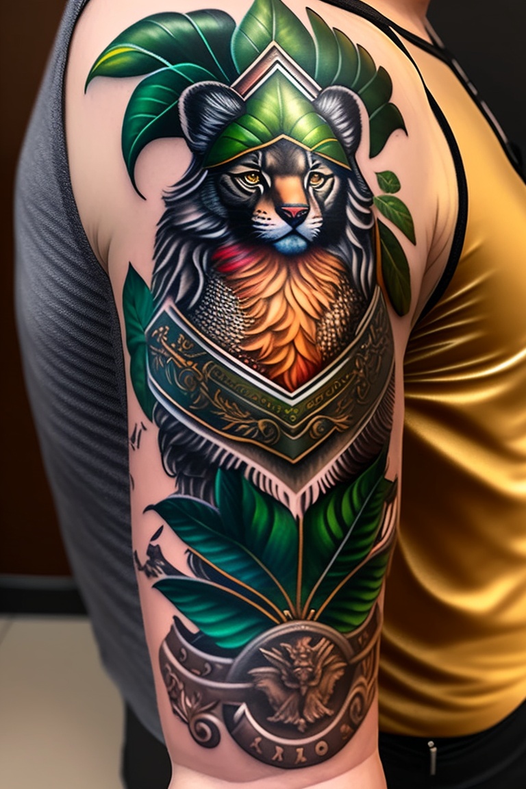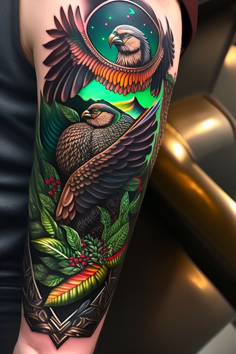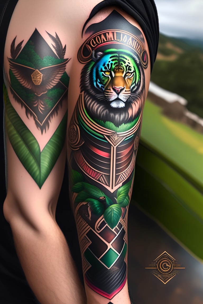 Design full-arm realistic tattoos for men inspired by colombian mythology. draw from rich folklore like the jaguar, a symbol of power, and the condor, representing freedom. include mythical creatures and landscapes from indigenous legends. utilize detailed shading and intricate linework to capture the essence of each myth. integrate elements like emeralds and coffee plants subtly for cultural touch. prioritize realism, ensuring each tattoo flows seamlessly along the arm's contours. your designs should evoke awe and respect for colombia's mythical heritage.