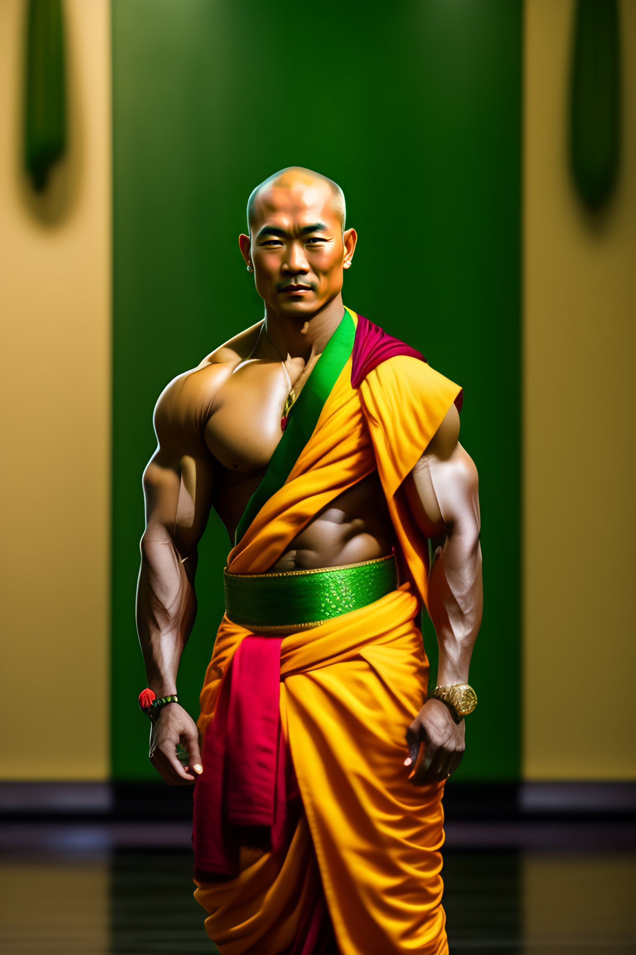 Asian monk with bulging muscles and green and gold cloth pants, the bald head and holding wooden nunchaku in his hands