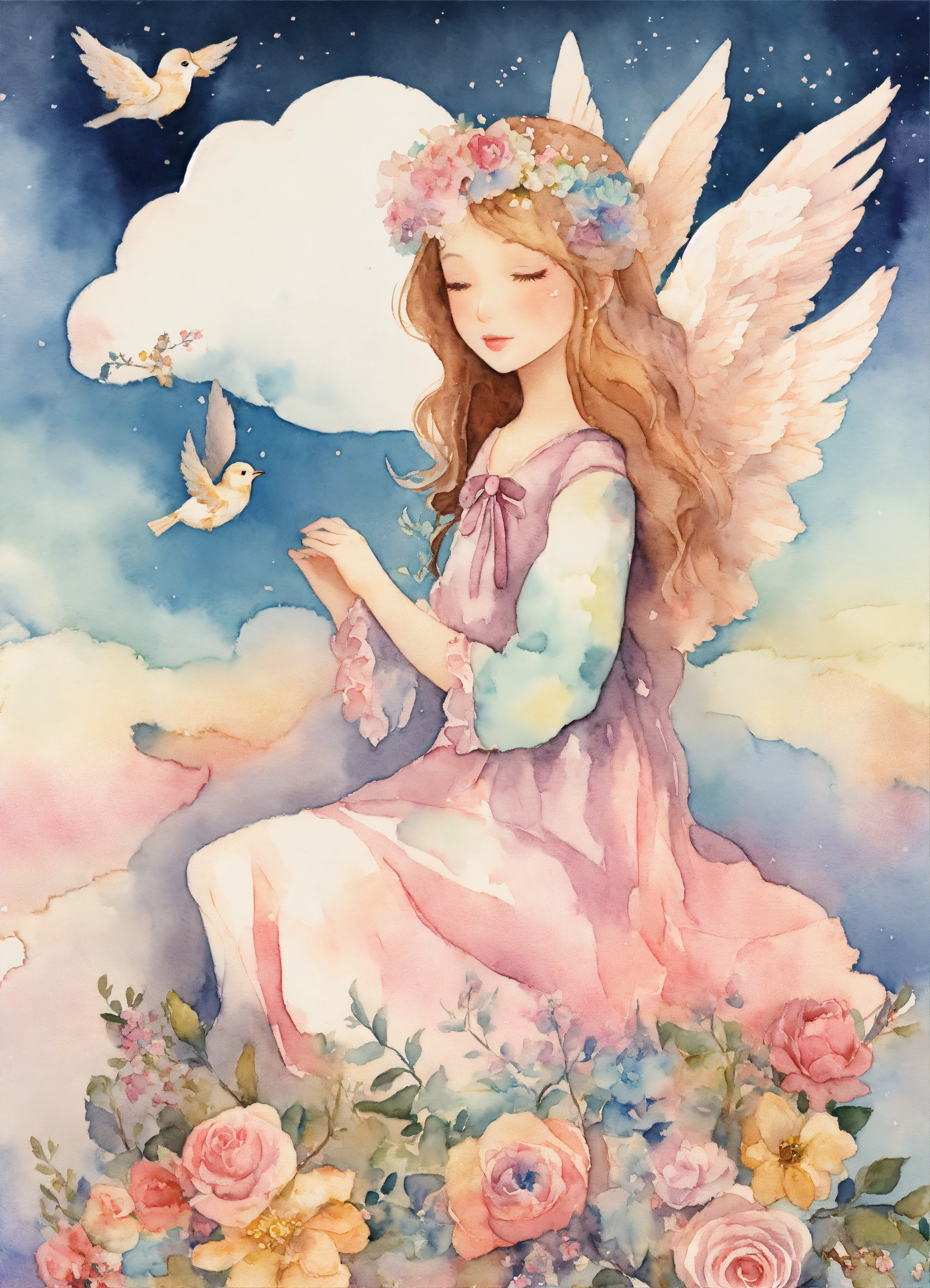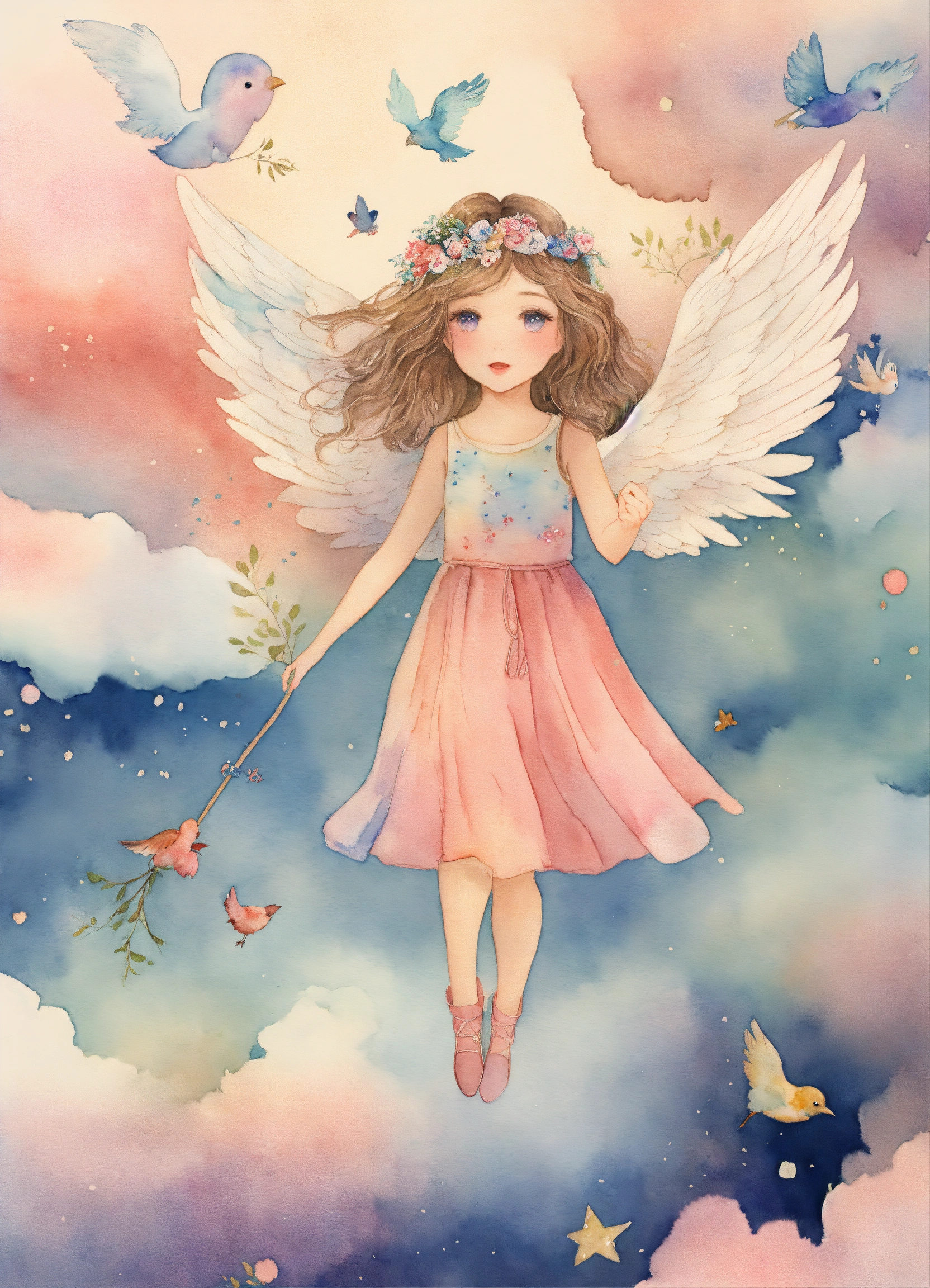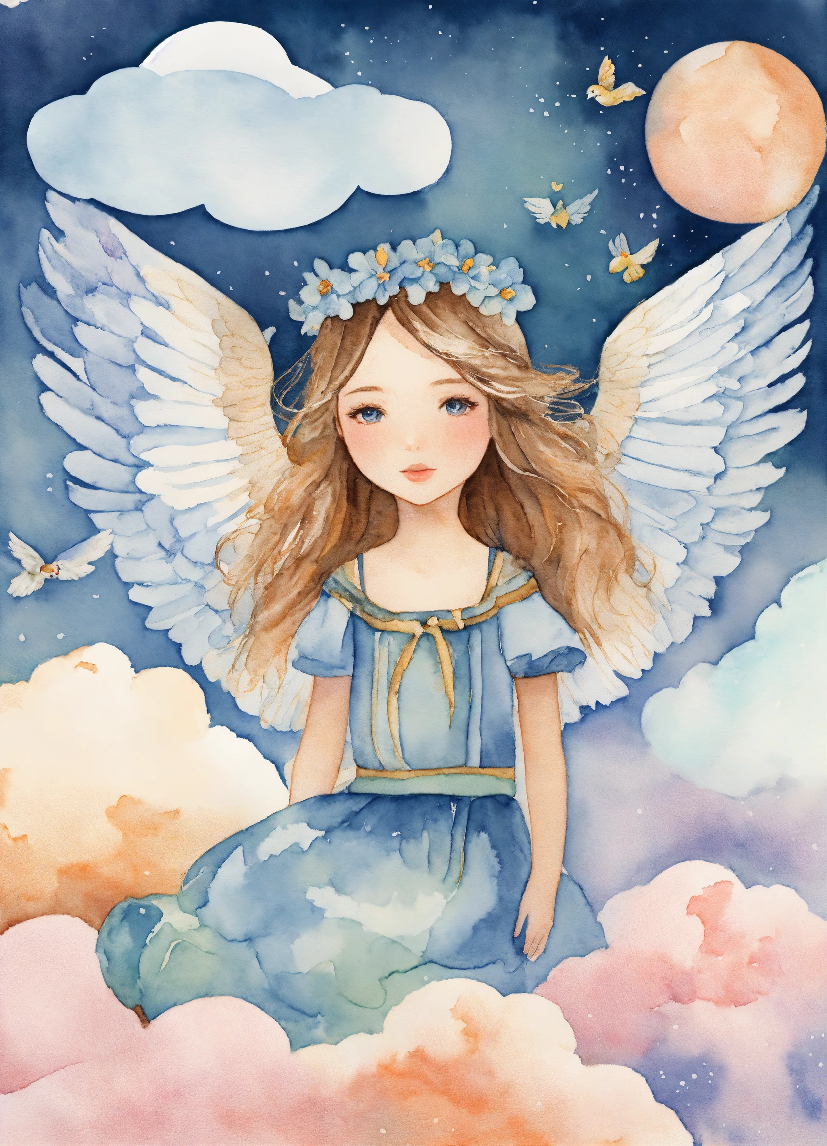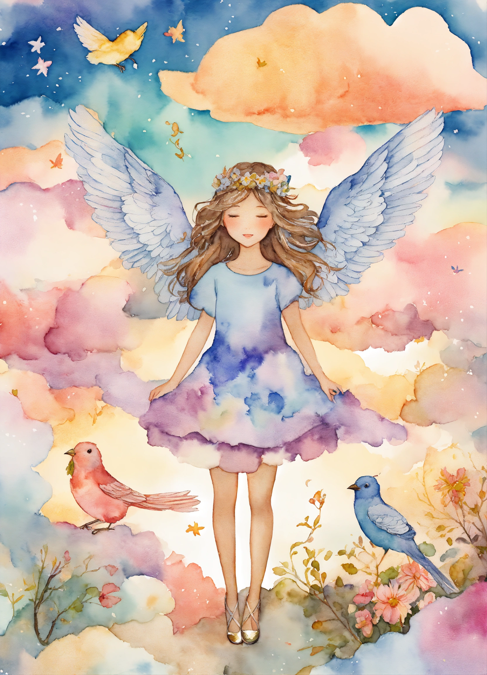 Whimsical clouds and skies angel girl, watercolor clipart, fairytale clipart png, fantasy birds, fantasy art clipart, paper craft - junk journal, scrapbooking