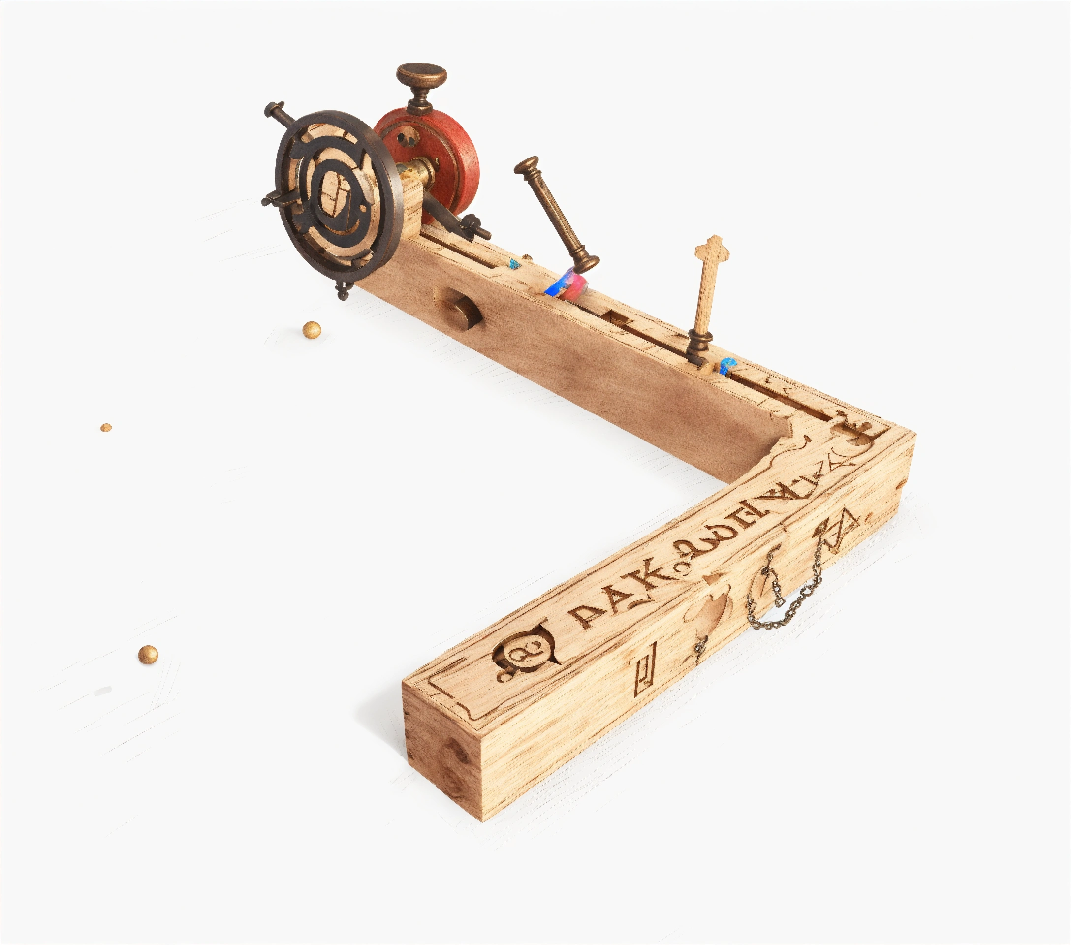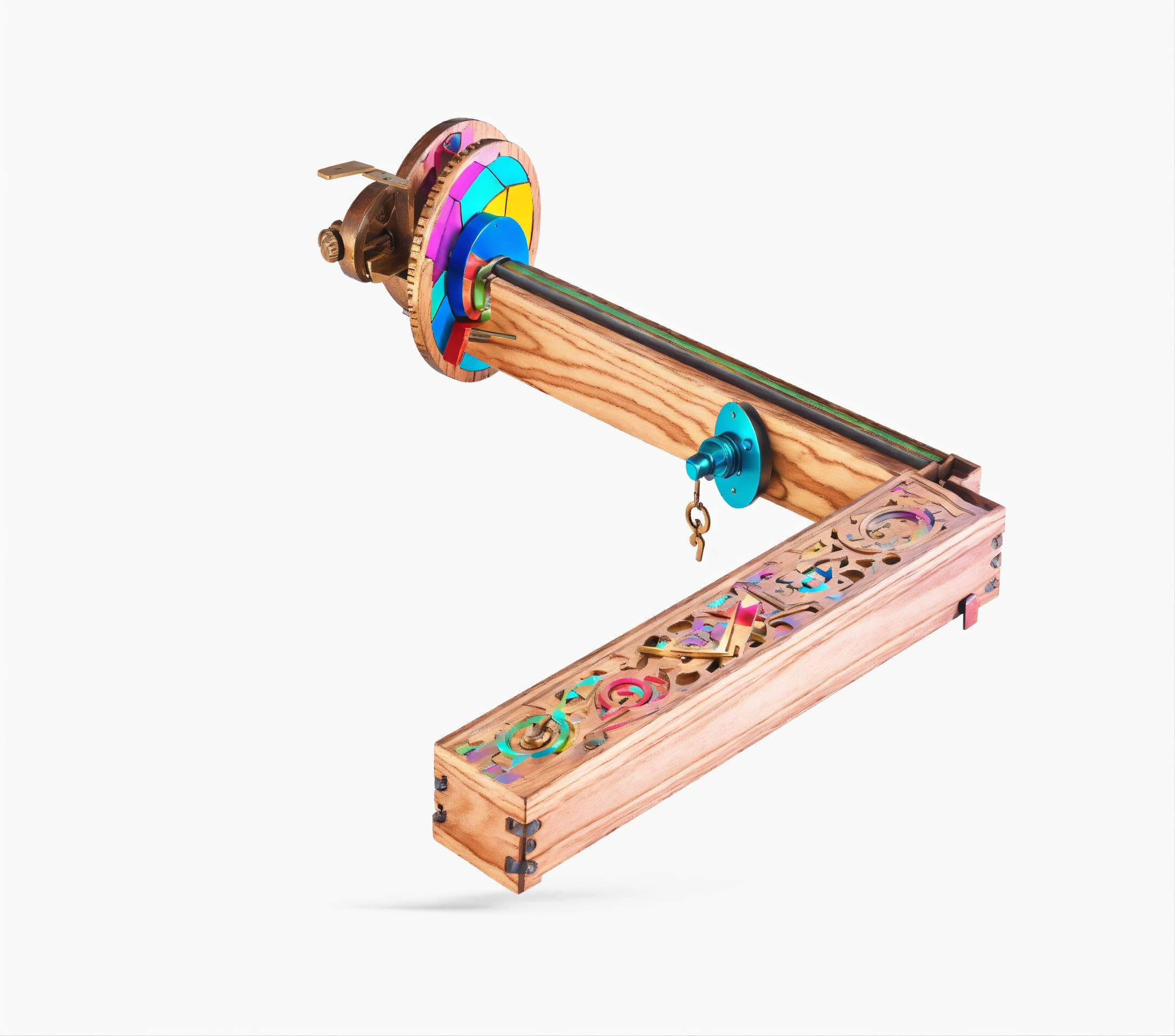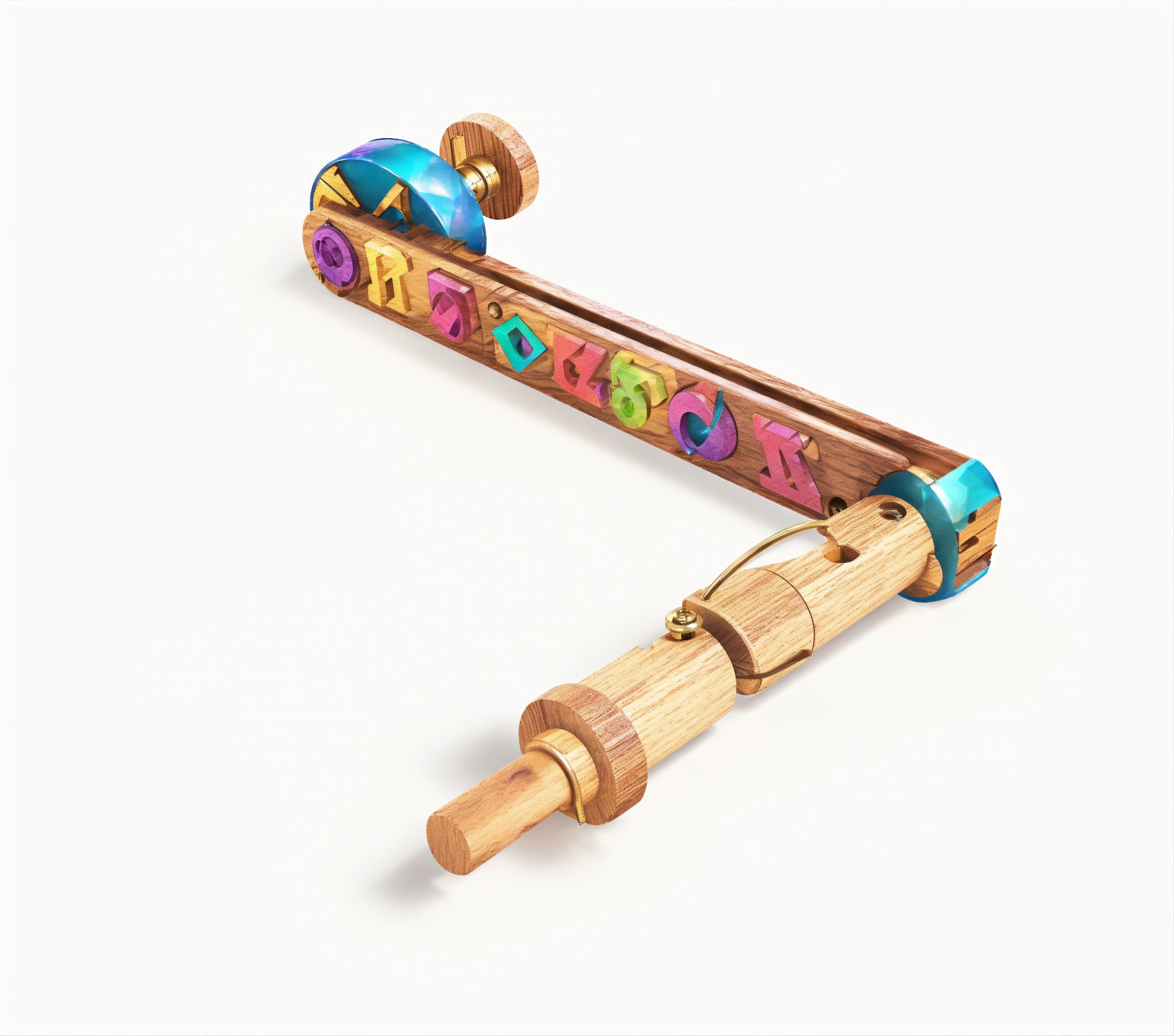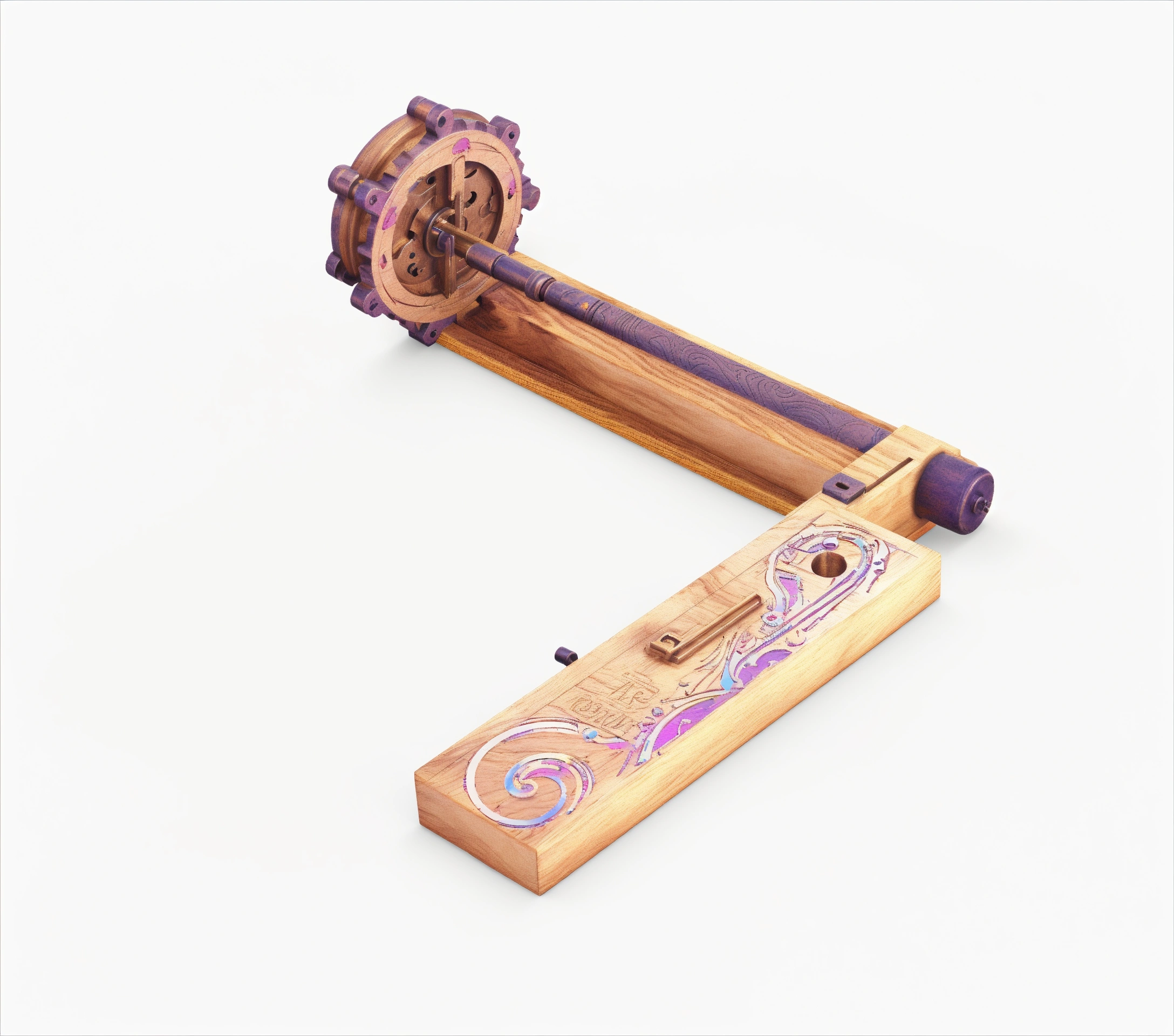 Magical rune engraved wooden crank broken off a jack in the box, crudely carved, wooden hand crank, round handle, air element, magical item, video game concept art, colorful background, artistic render, painterly style