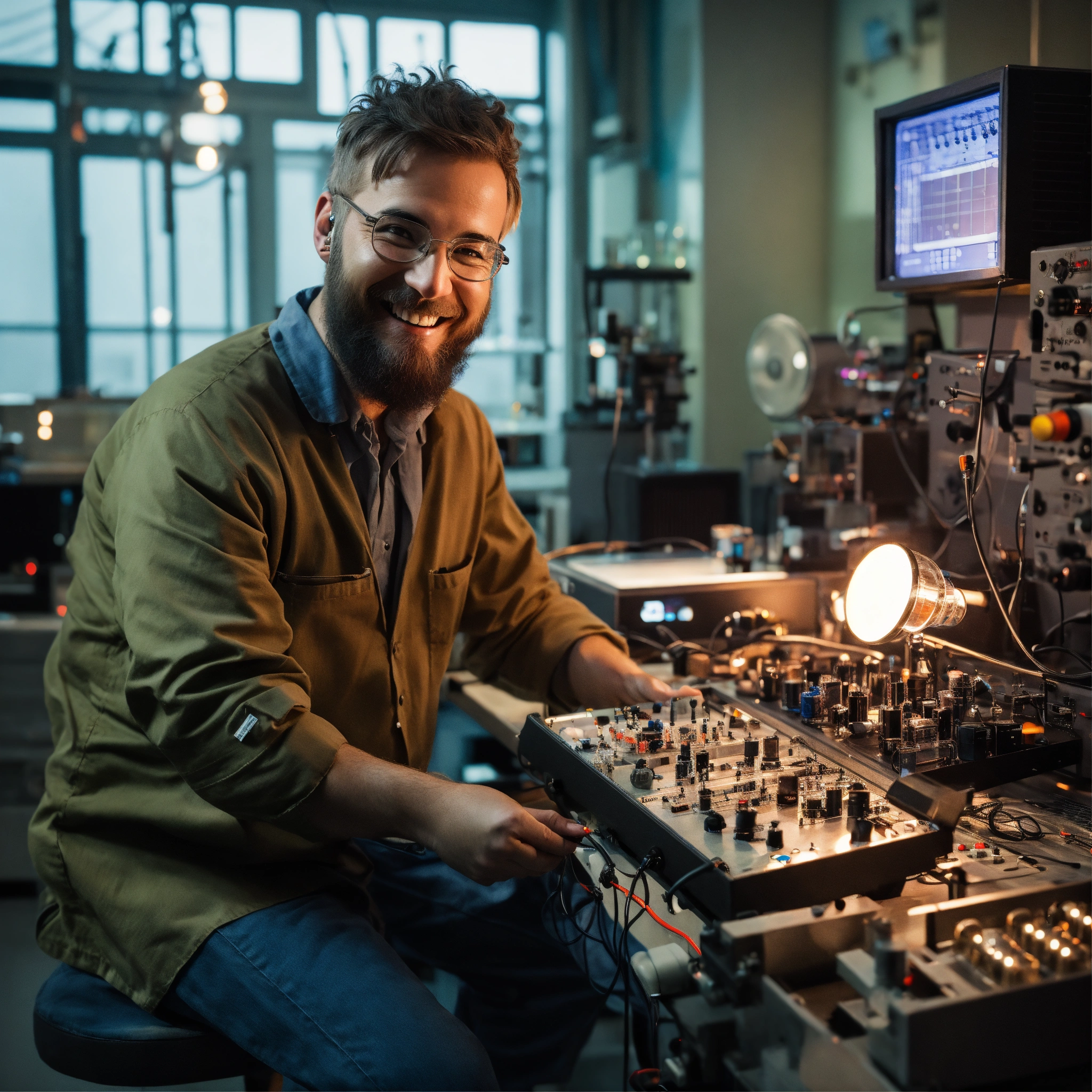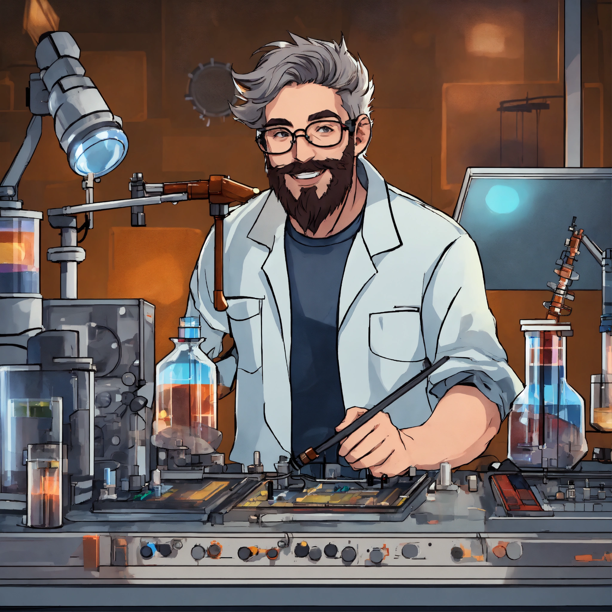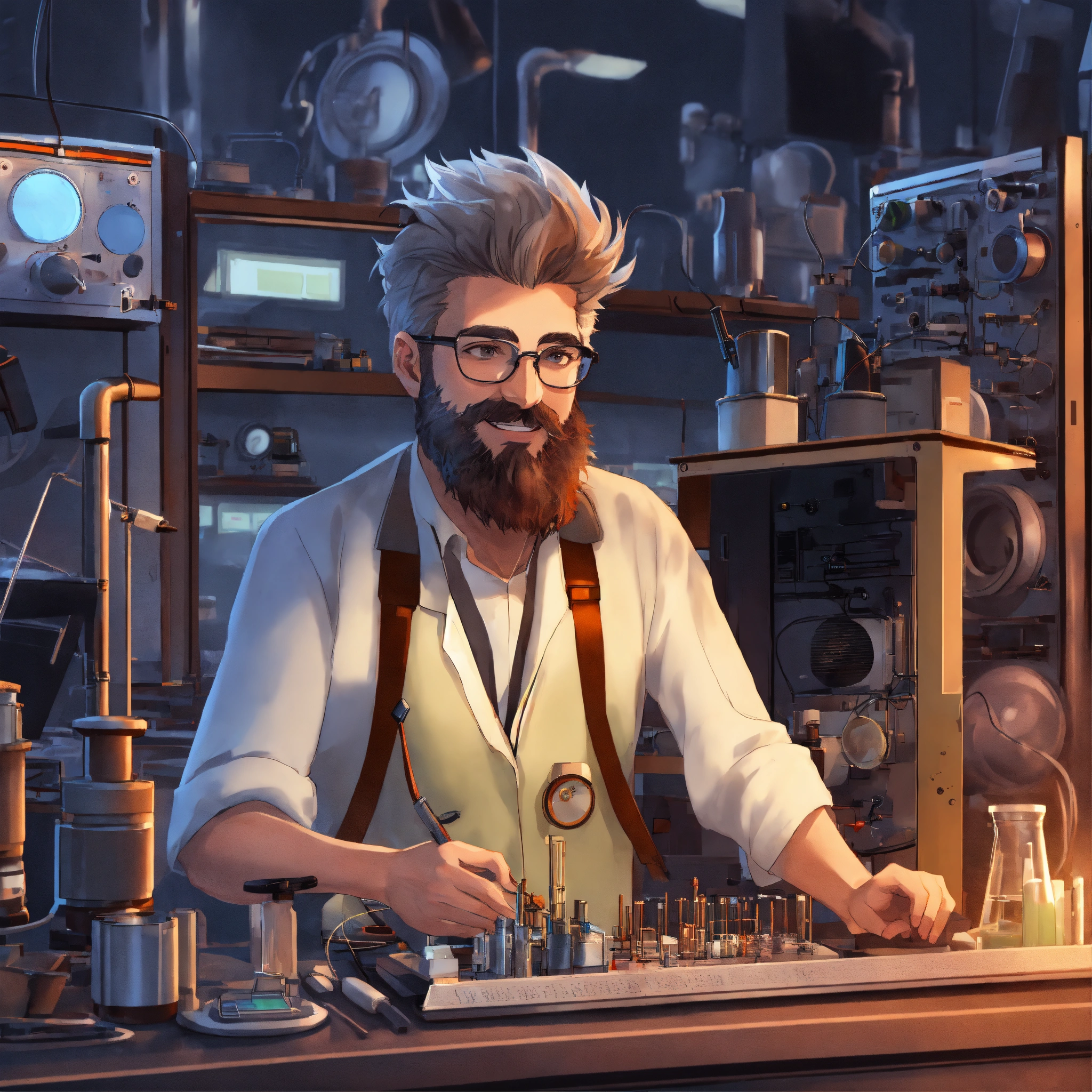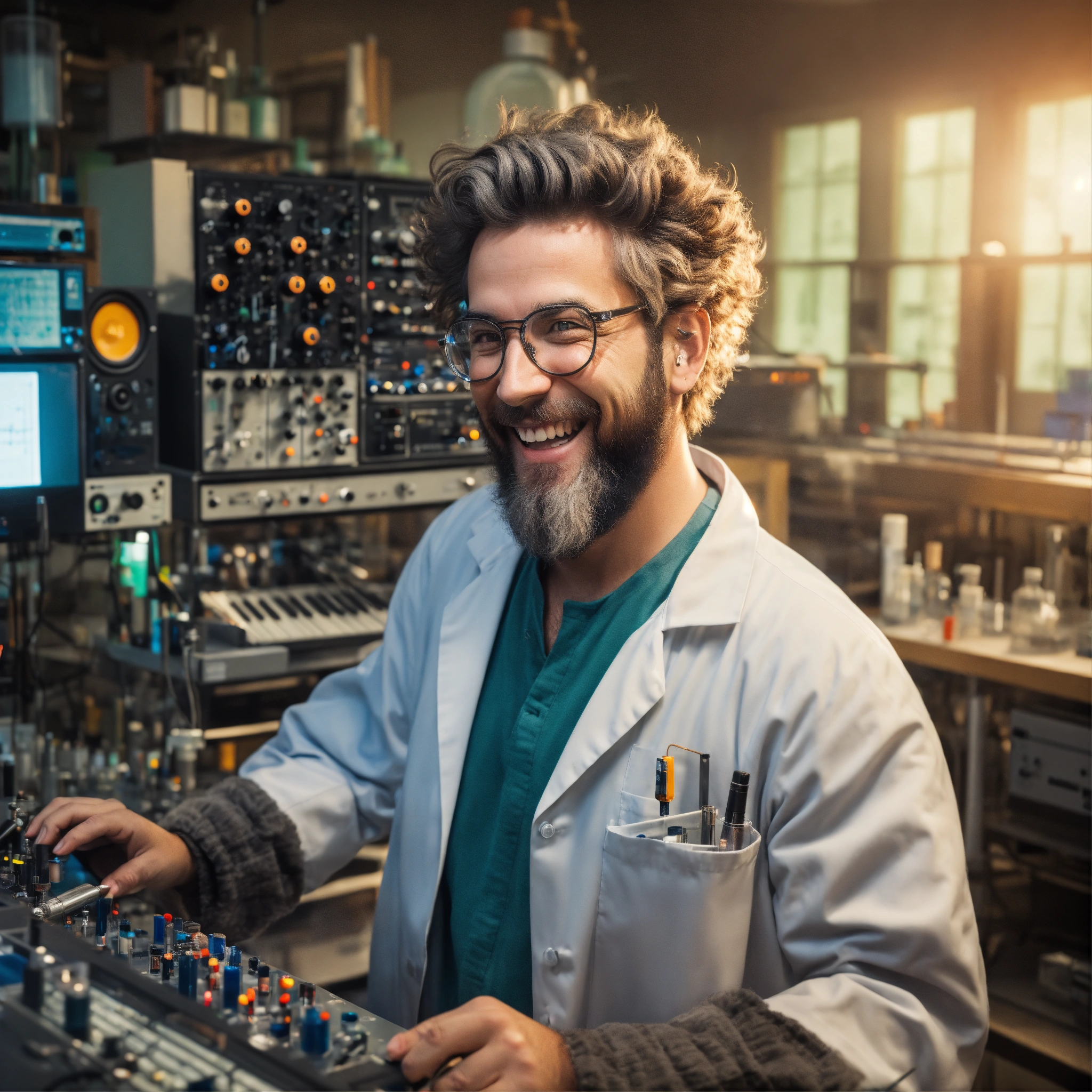 Mad scientist with auburn-gray short hair and beard, in a laboratory with music equipment, working and smiling like a madman