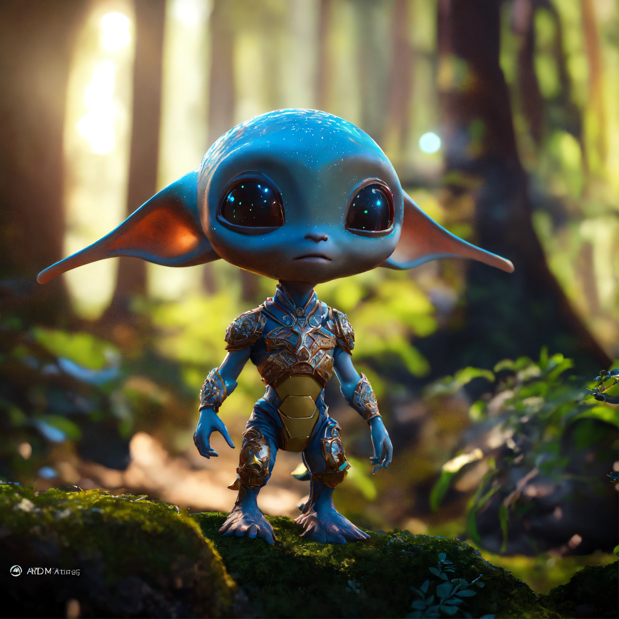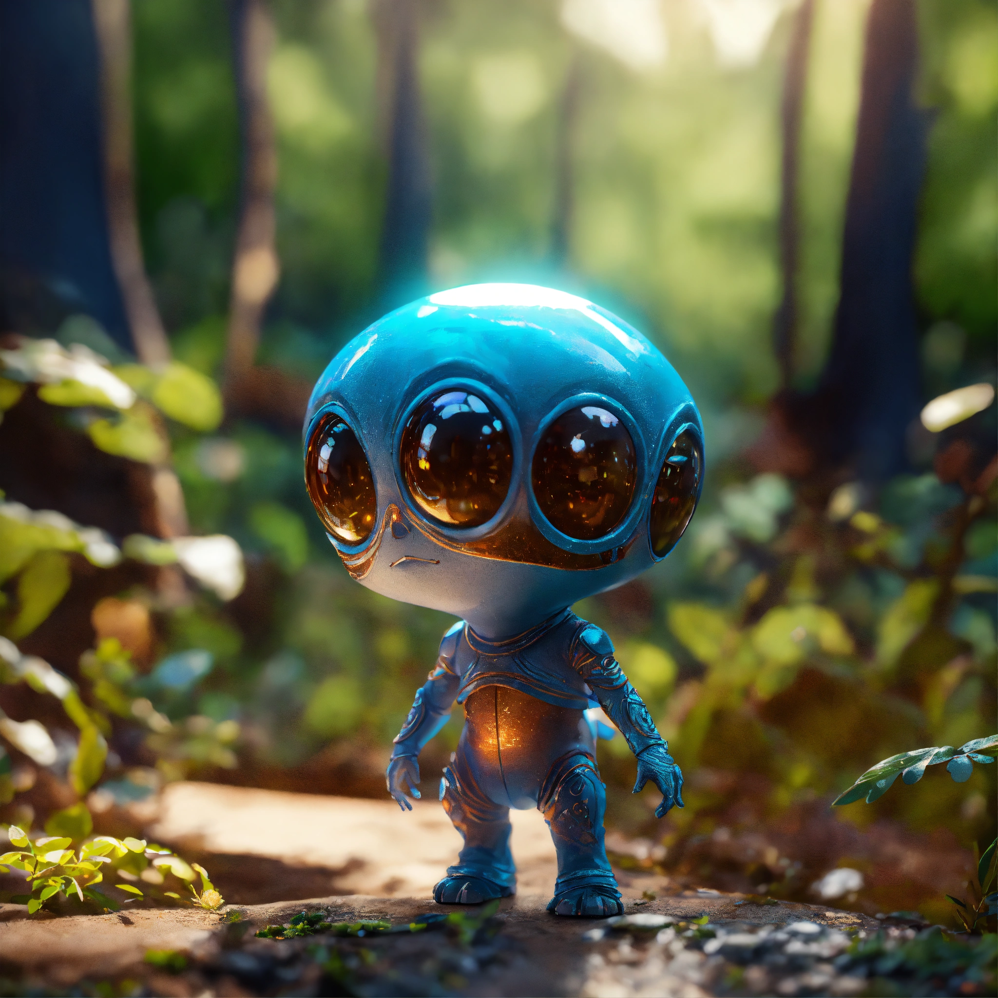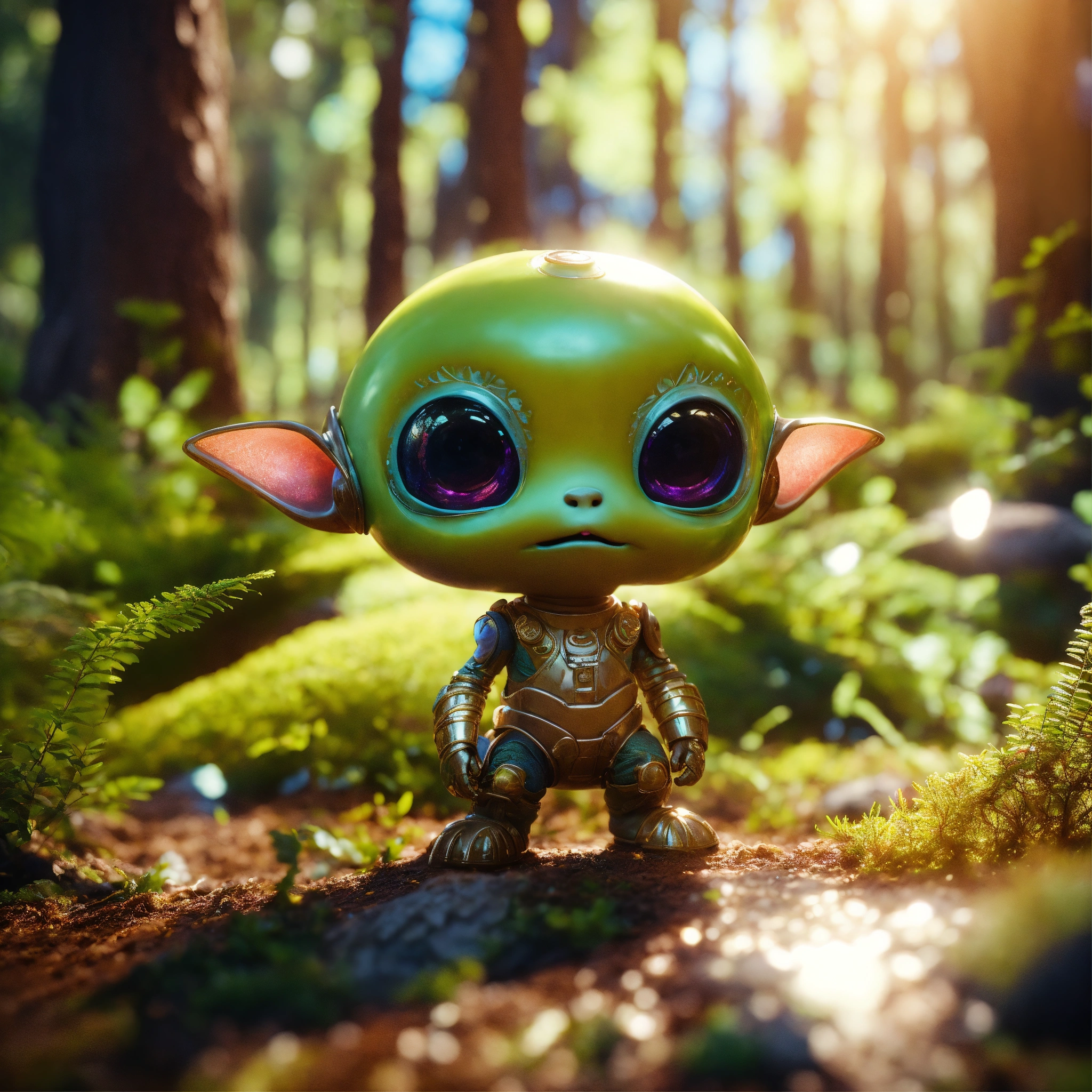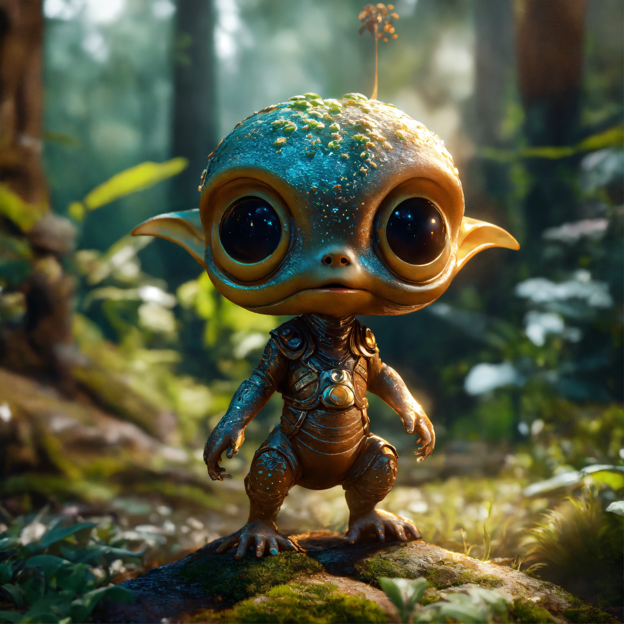 Medium close-up, "cute and adorable cartoon alien baby, fantasy, dreamlike, surrealism, super cute, trending on artstation", moody lighting, best quality, full body portrait, real picture, intricate details, depth of field, in a forest, fujifilm xt3, outdoors, bright day, beautiful lighting, raw photo, 8k uhd, film grain, unreal engine 5, ray tracing