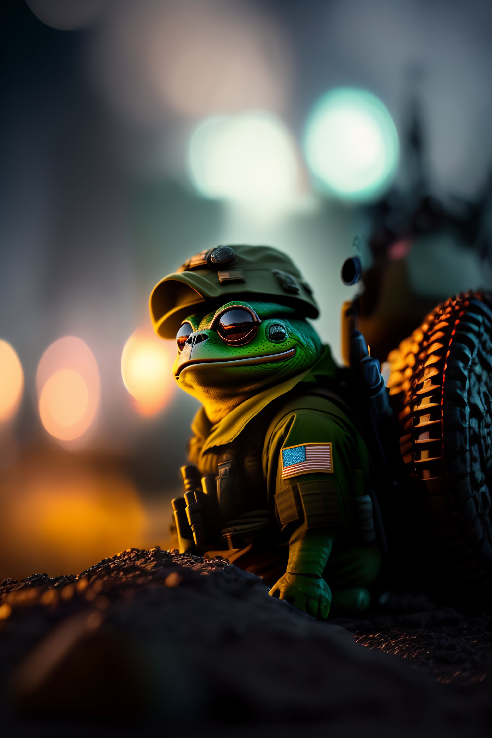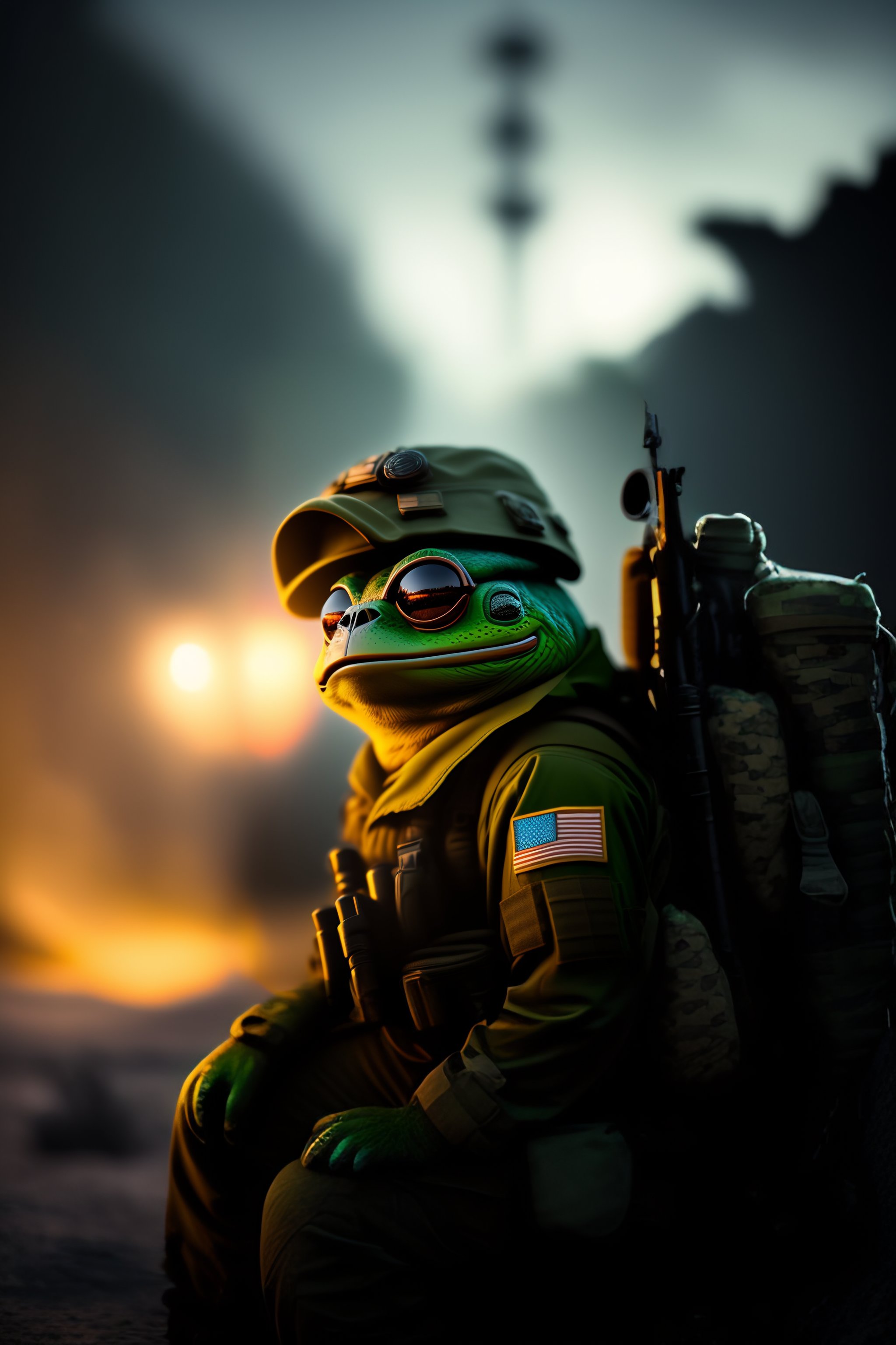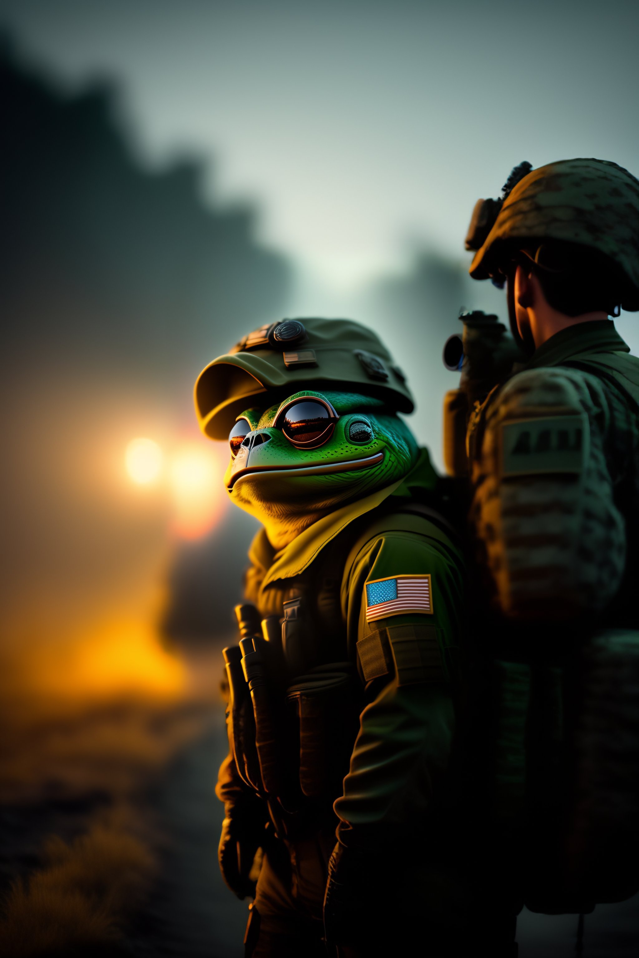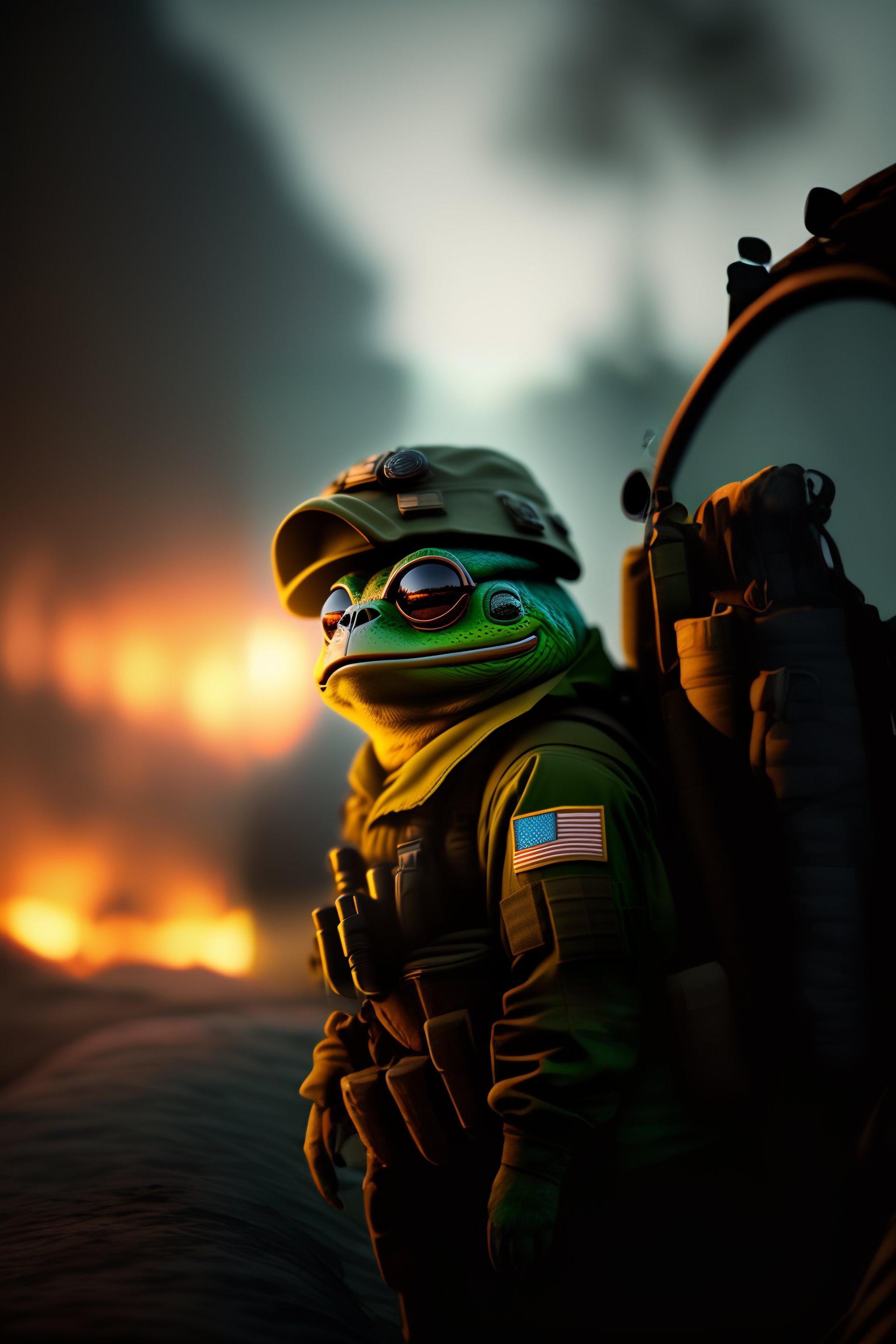 An exhausted pepe the frog at the frontlines in the army at night with his platoon fighting, key lighting, soft lights, foggy, 8 k render, detailed, cute cartoon style, warhammer 40k