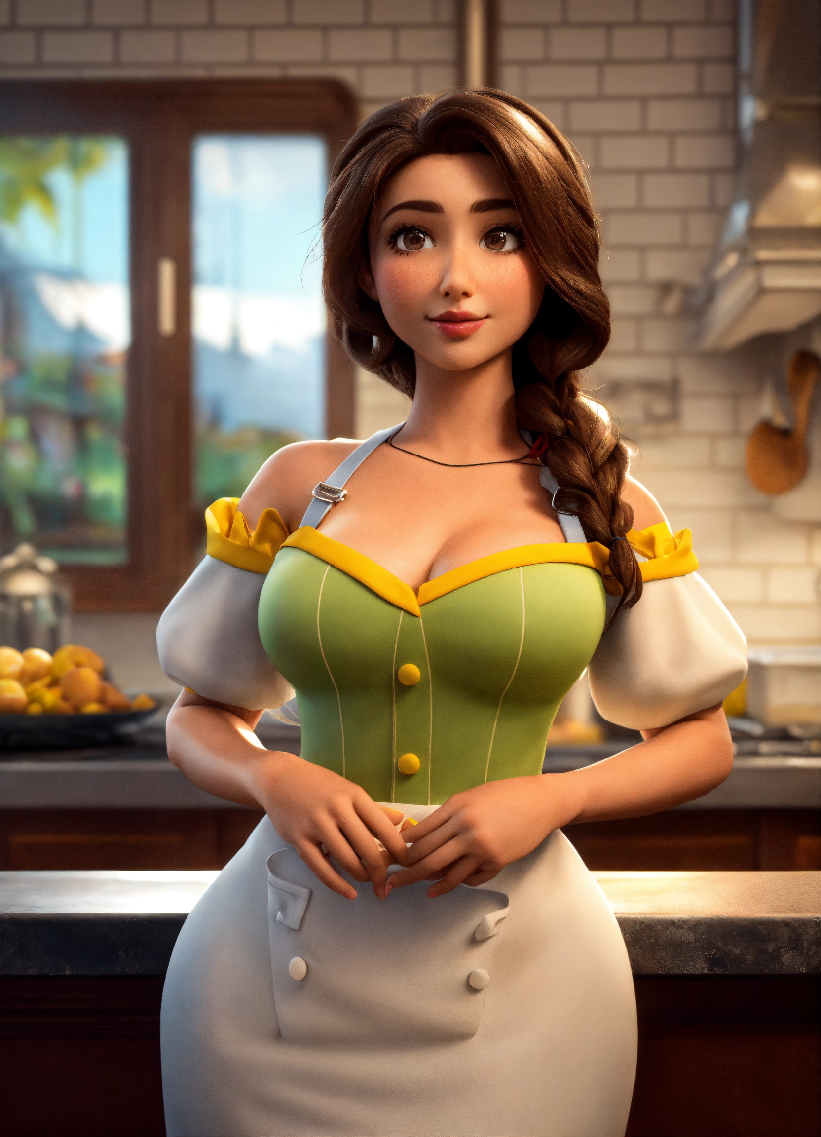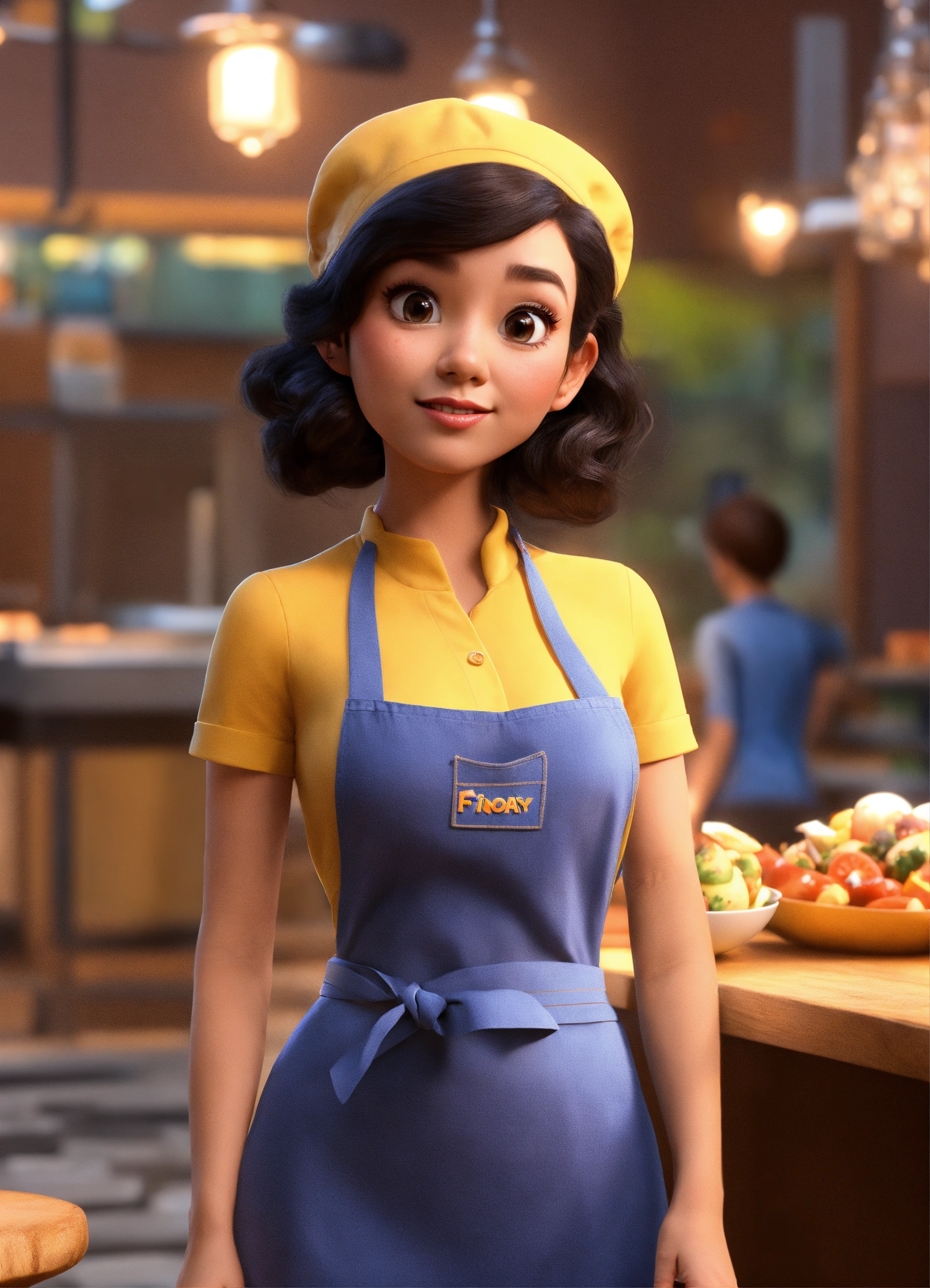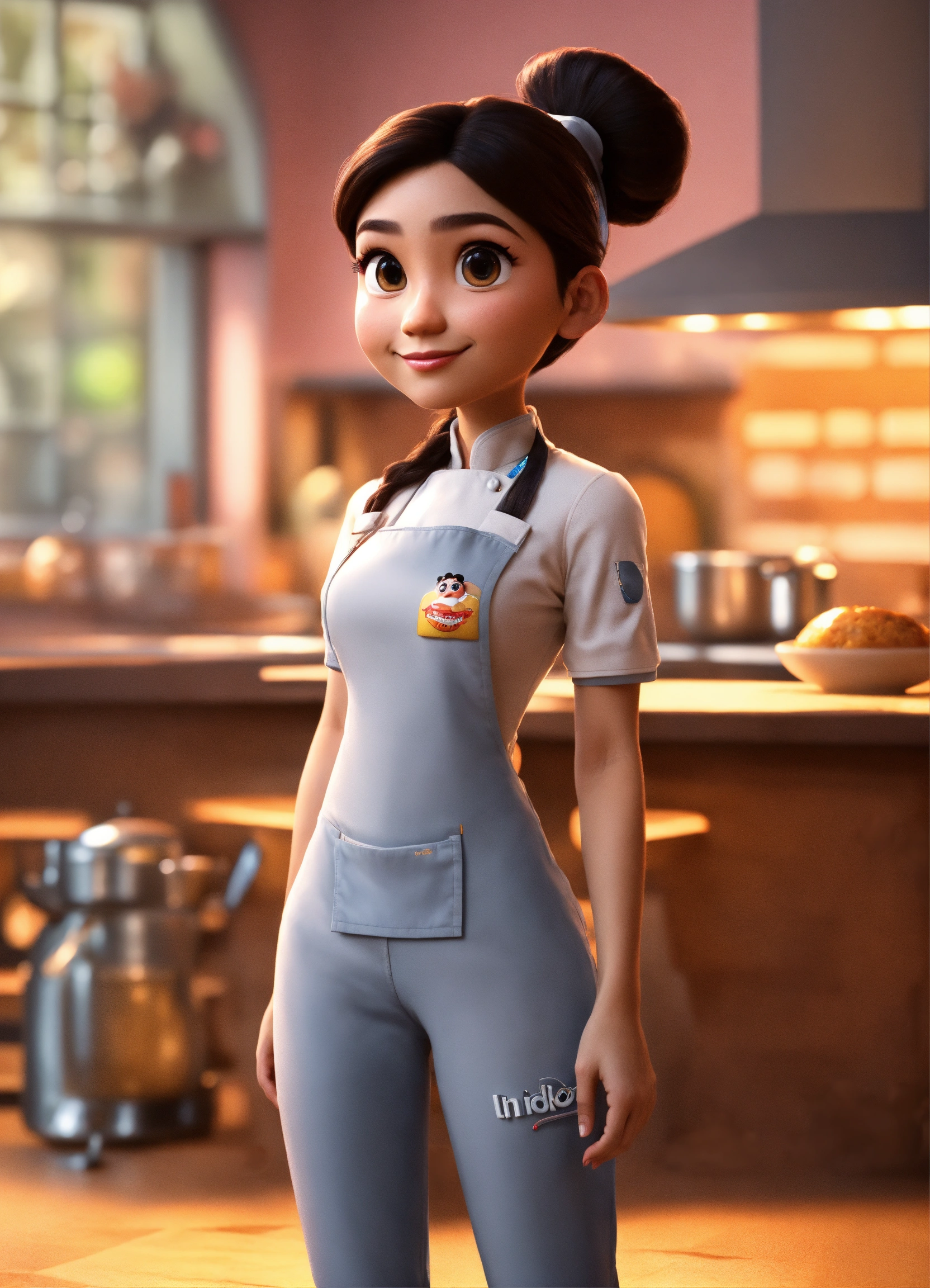 Linda chica, estilo pixar, estilo 3d, estilo disney, 8k, hermosa, vestimenta chef, cuerpo completo, vestimenta blanca y negra, cuerpo de frente