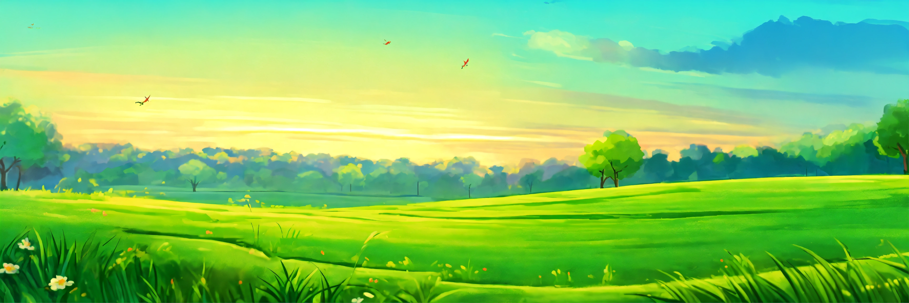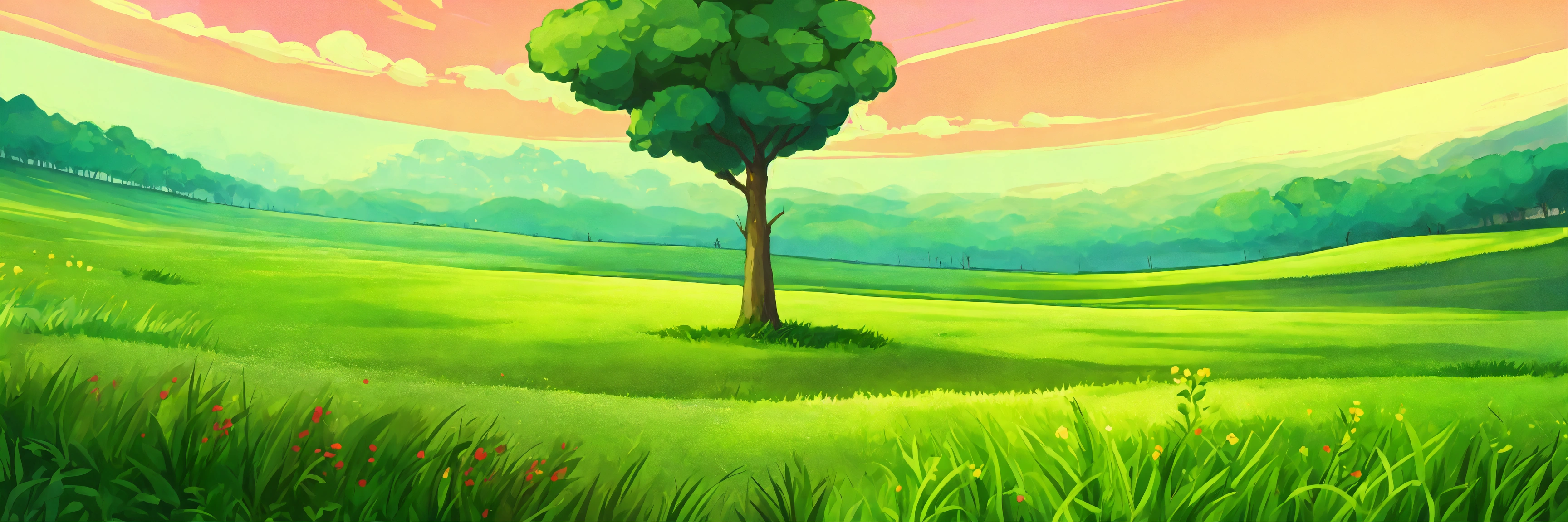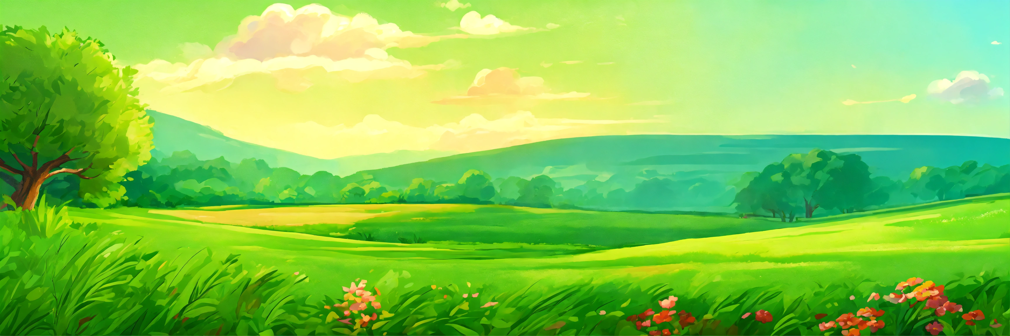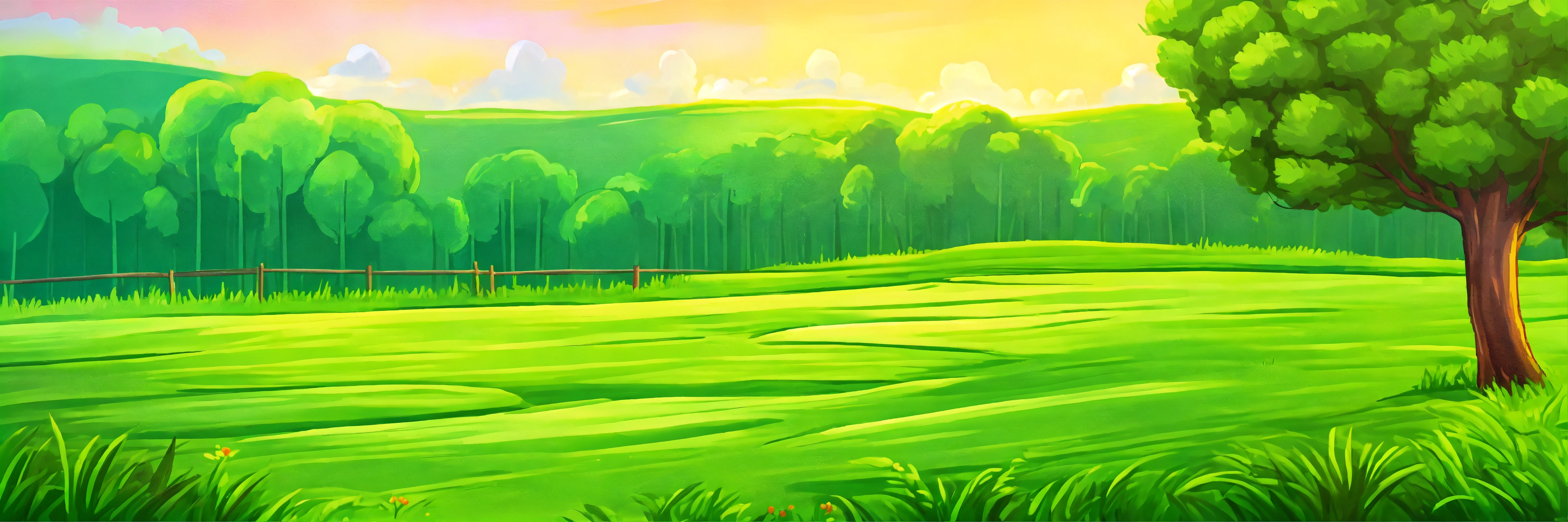 The grass field is green landscape cartoon style painting