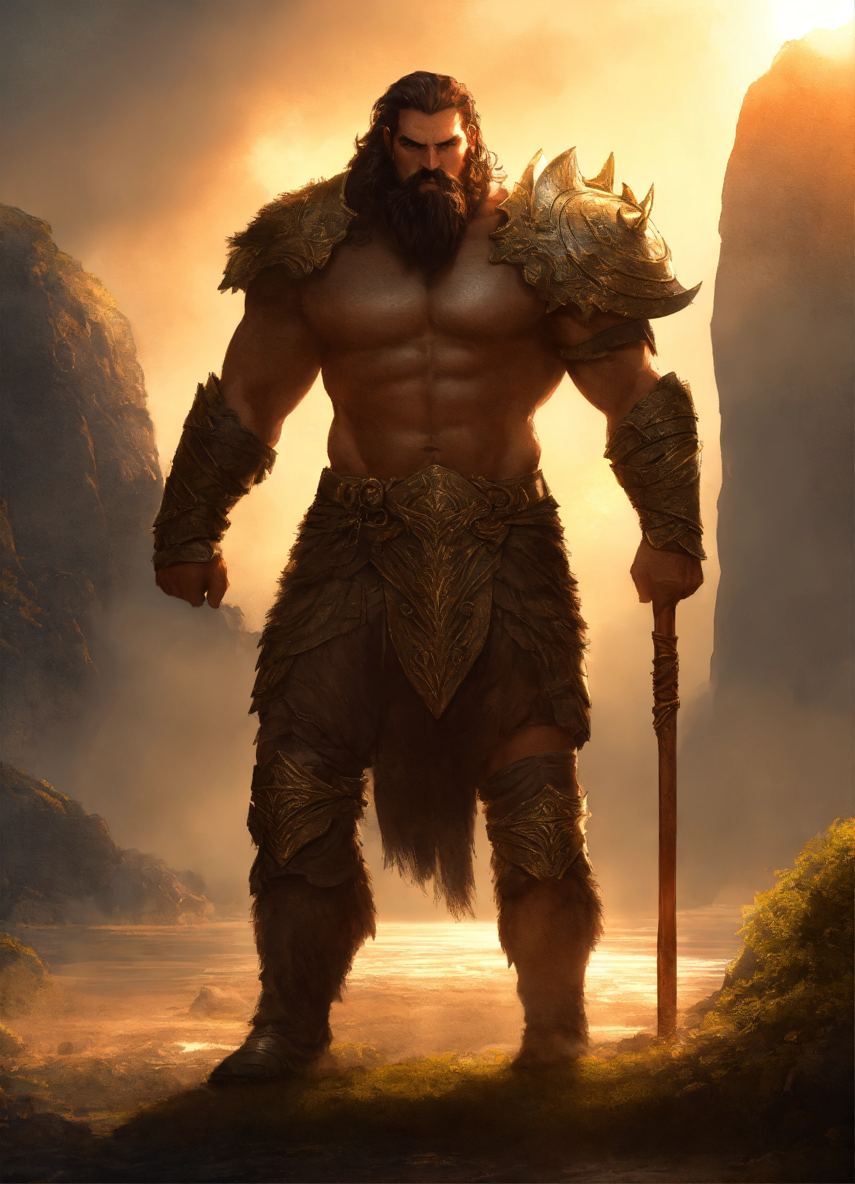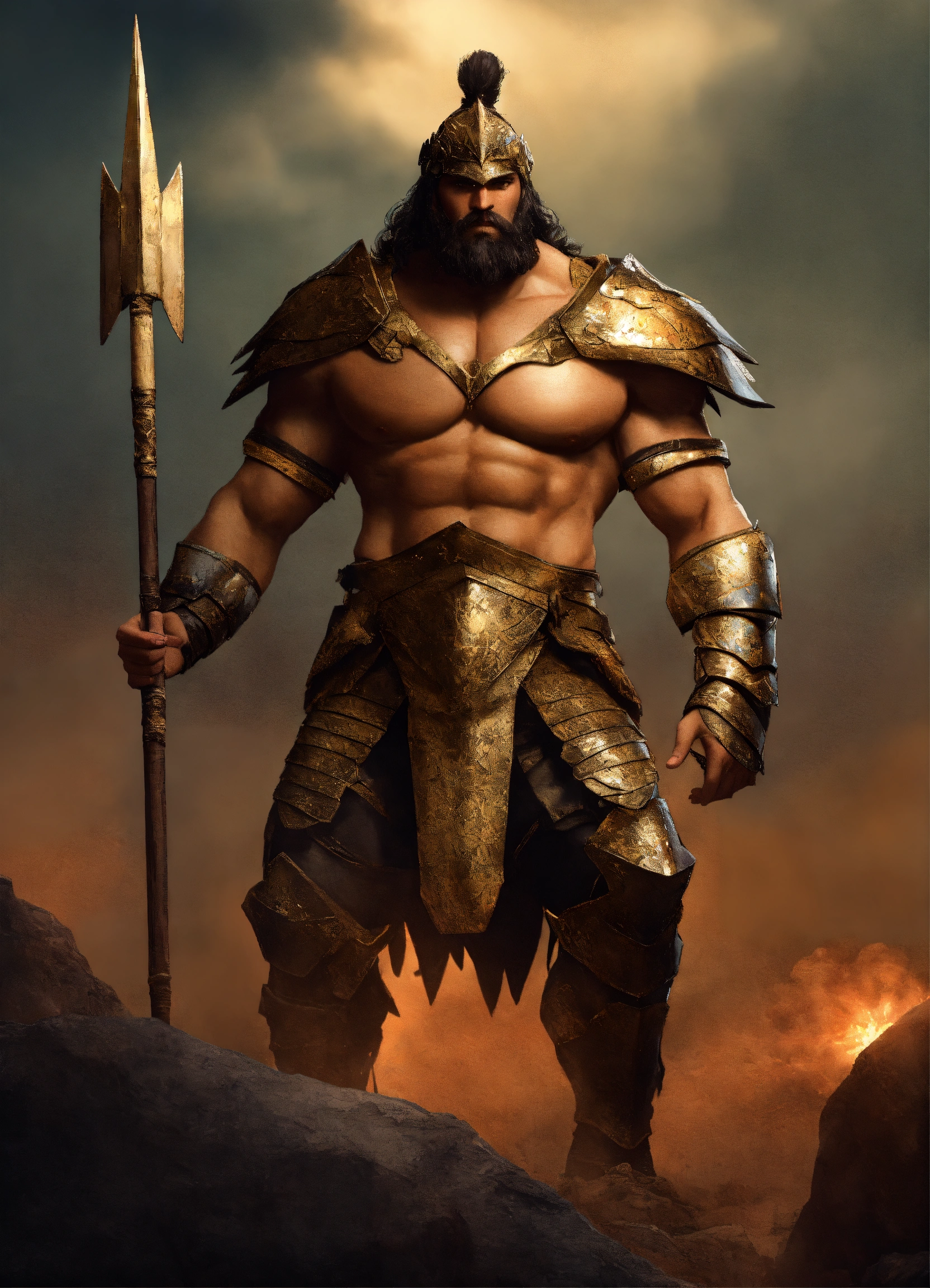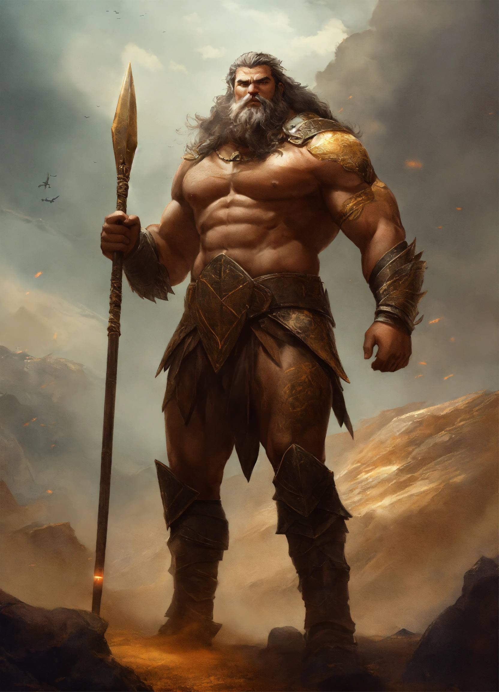 A nephilim giant holding a spear, wearing light leather armor, 14 ft tall in a fighting pose ready to battle 100 men that are 6 ft tall, sharp