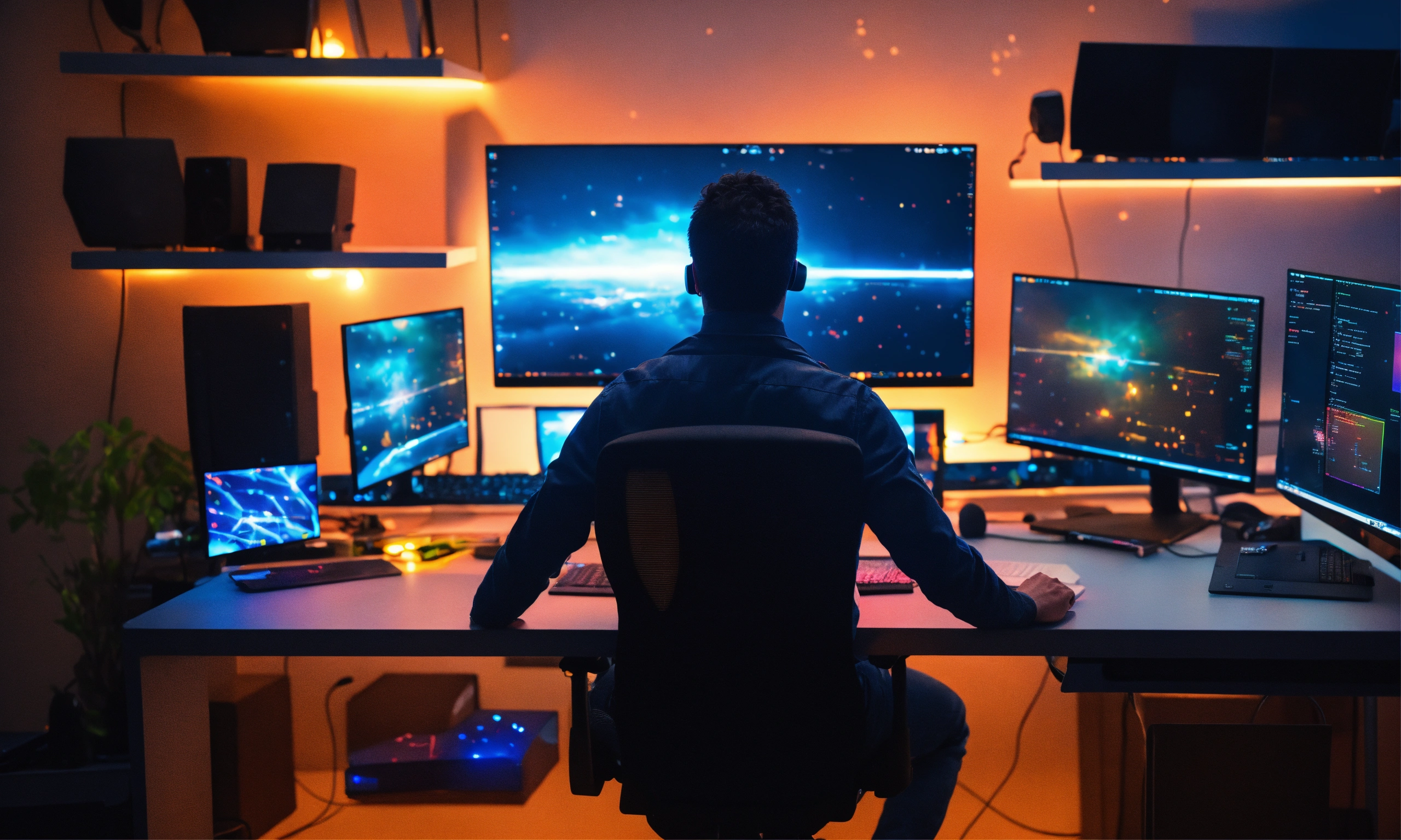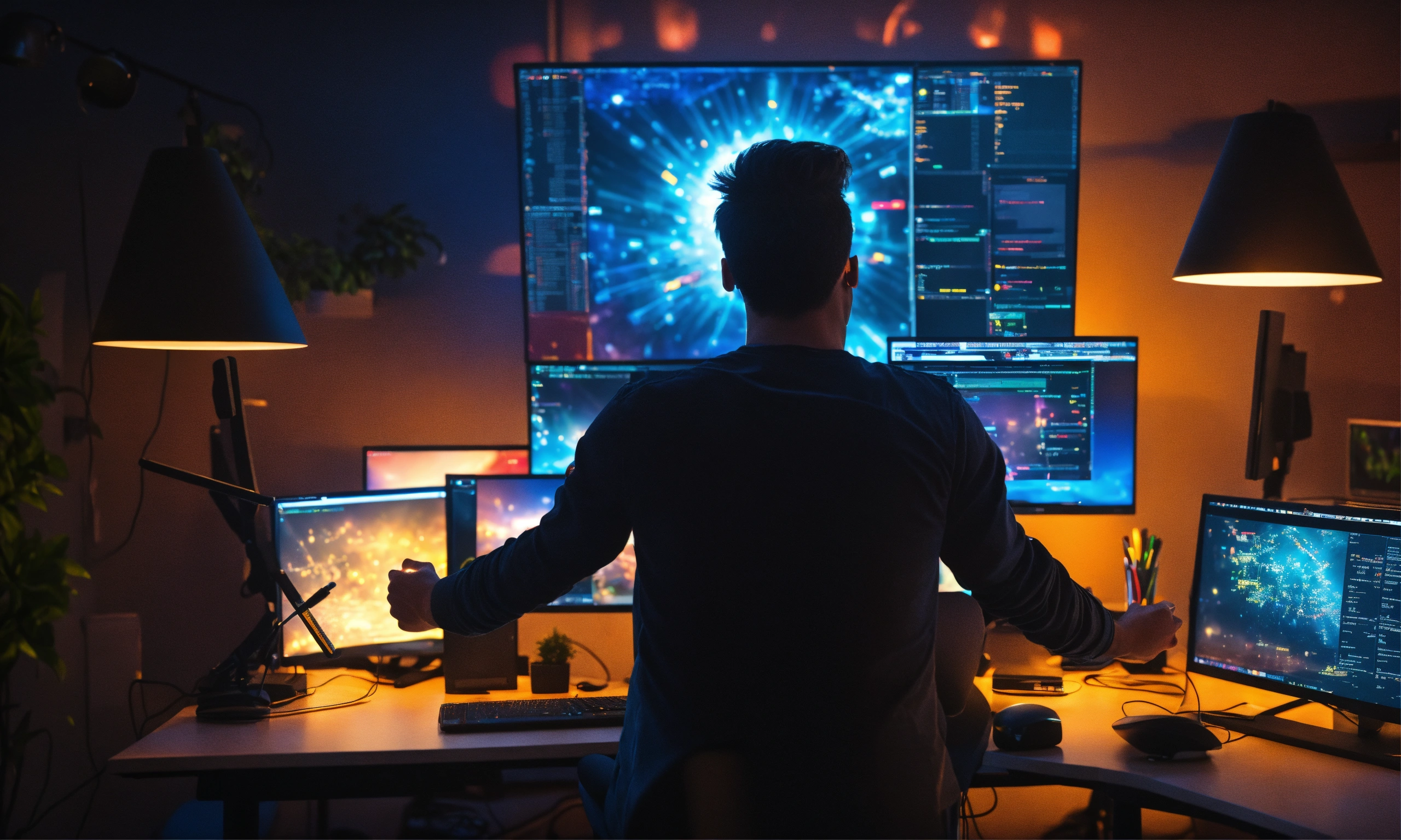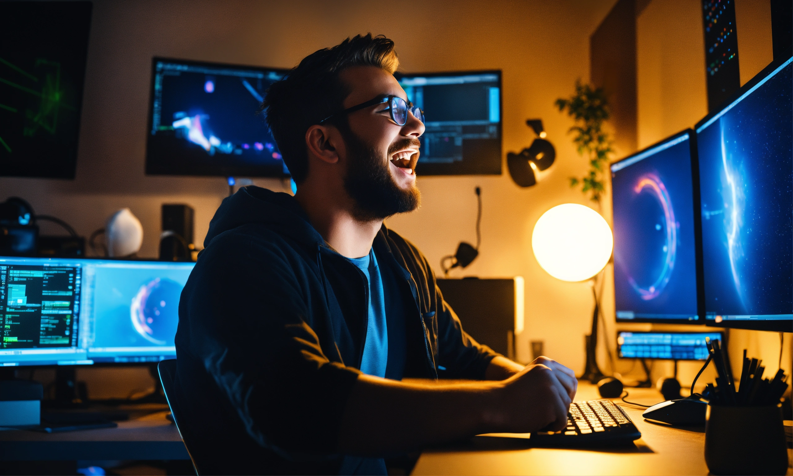 A happy programmer cheering at his desk, surrounded by pc monitors, illuminated by the glow of the screen, celebrating after he fixed a bug, 8k