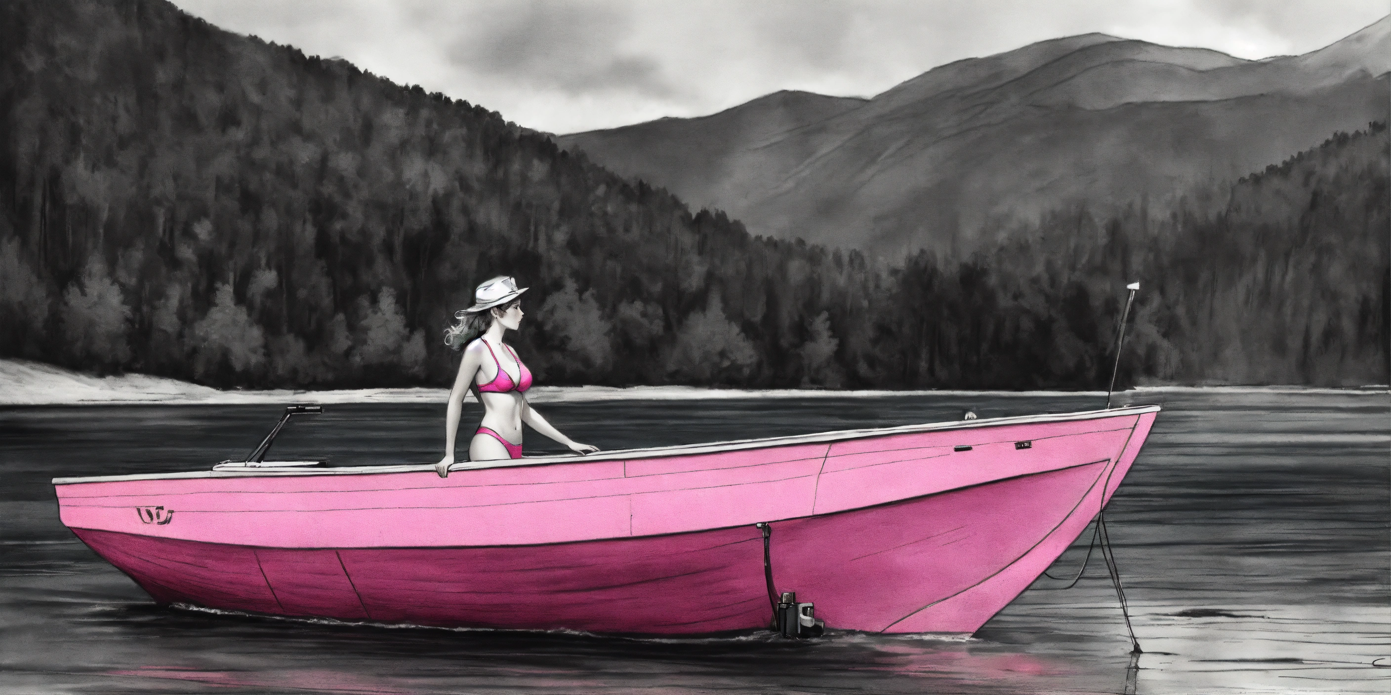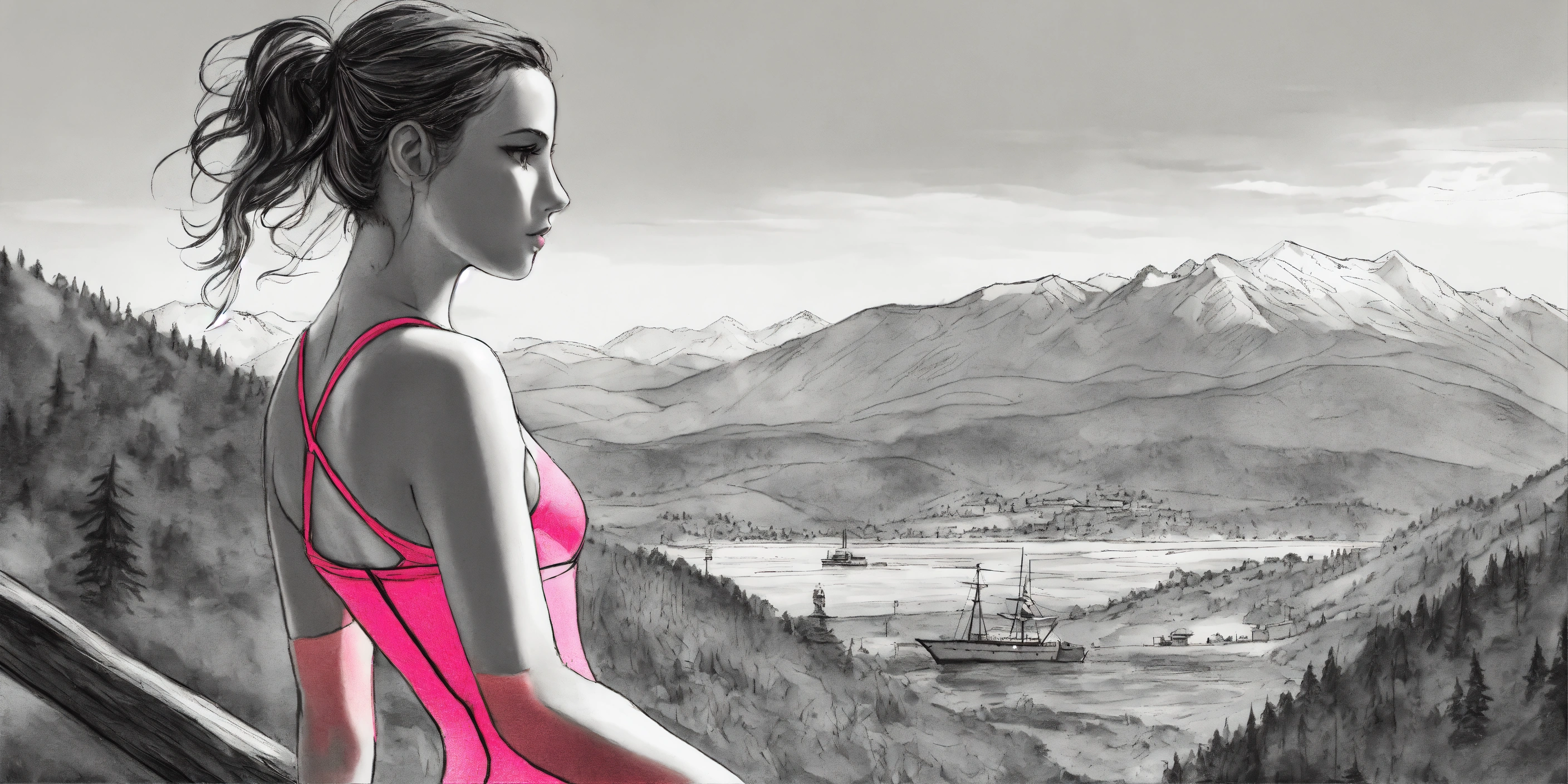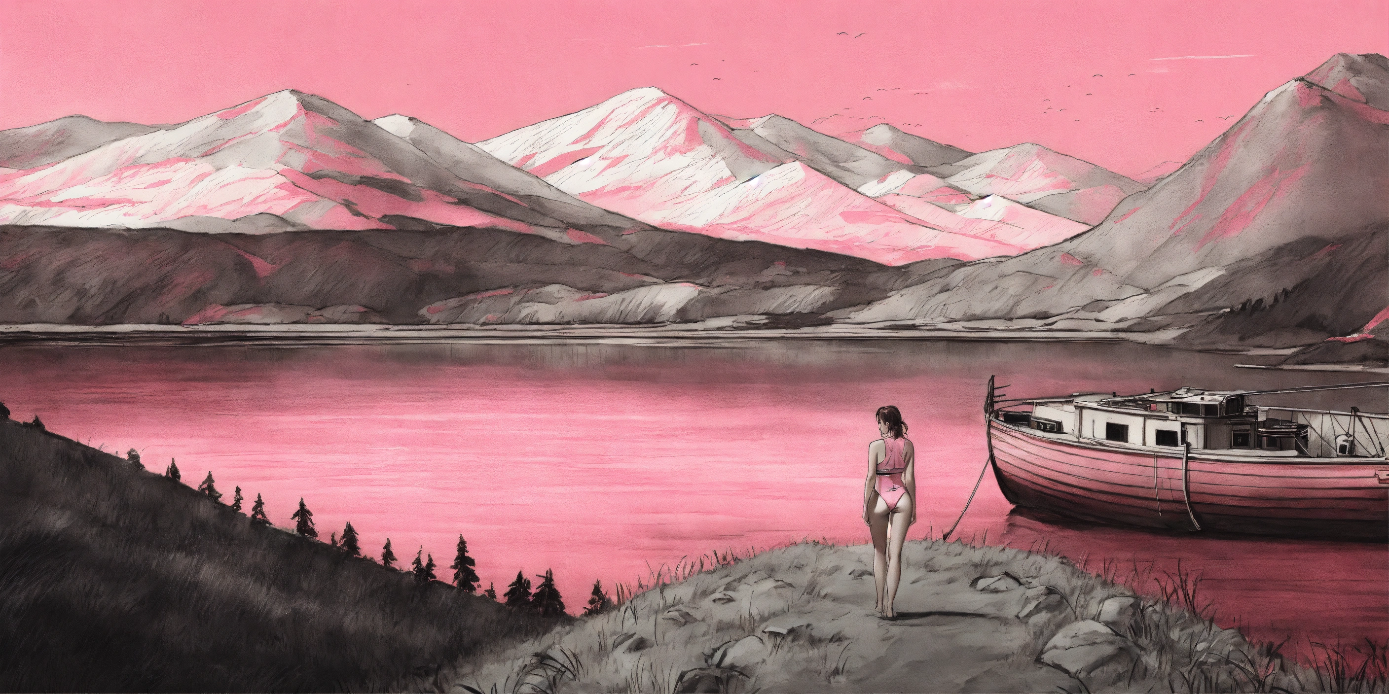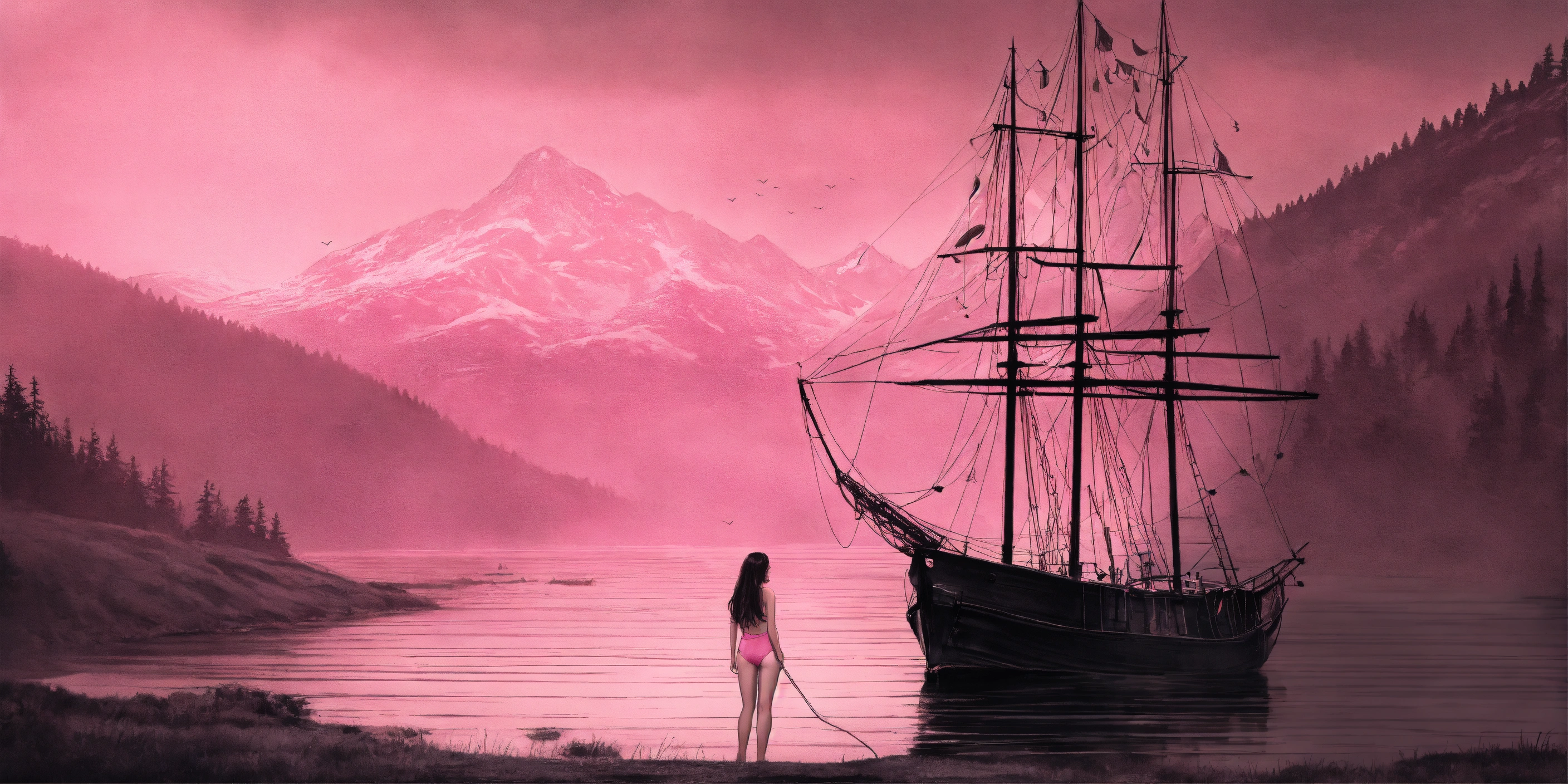 Ship, woman in pink swimsuit shepard, carpathian mountains, ukraine, 8k, taras shevchenko style, pencil drawing, black and white