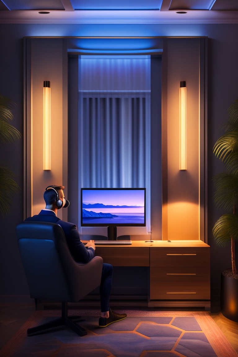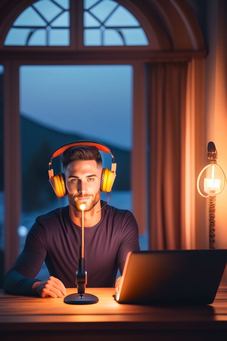 Guy with headphones doing a podcast with a microphone in a luxurious house at deep night, frontal view, looking frontal