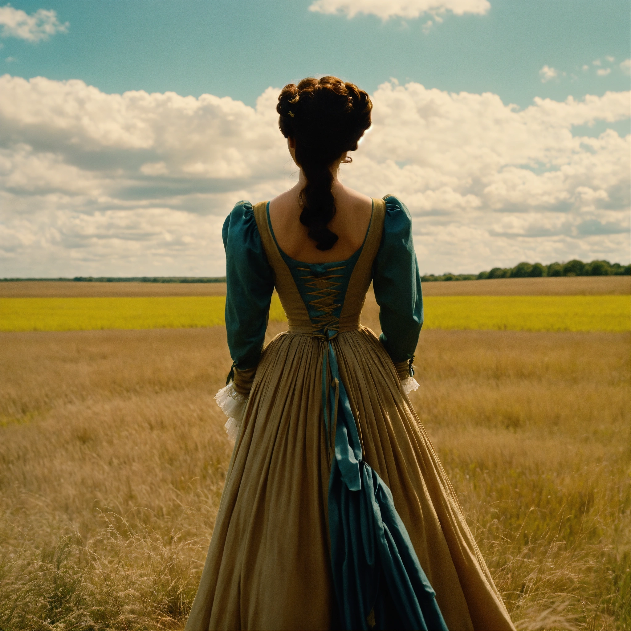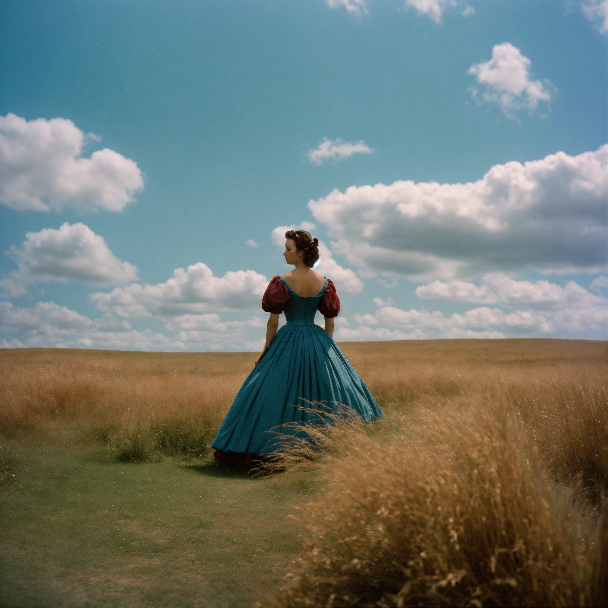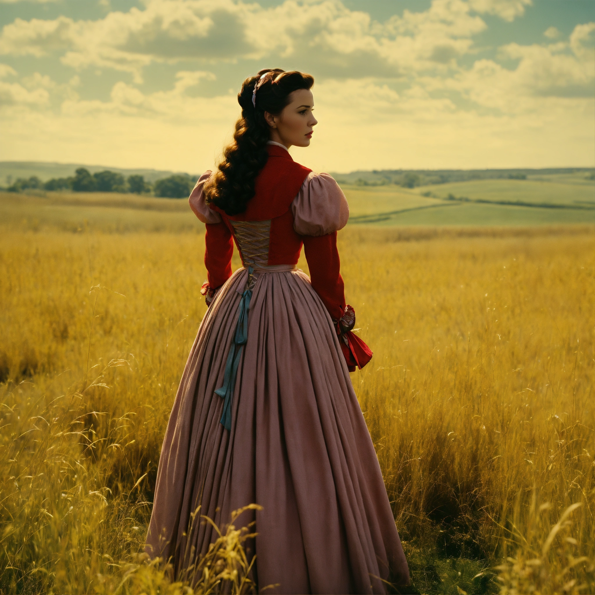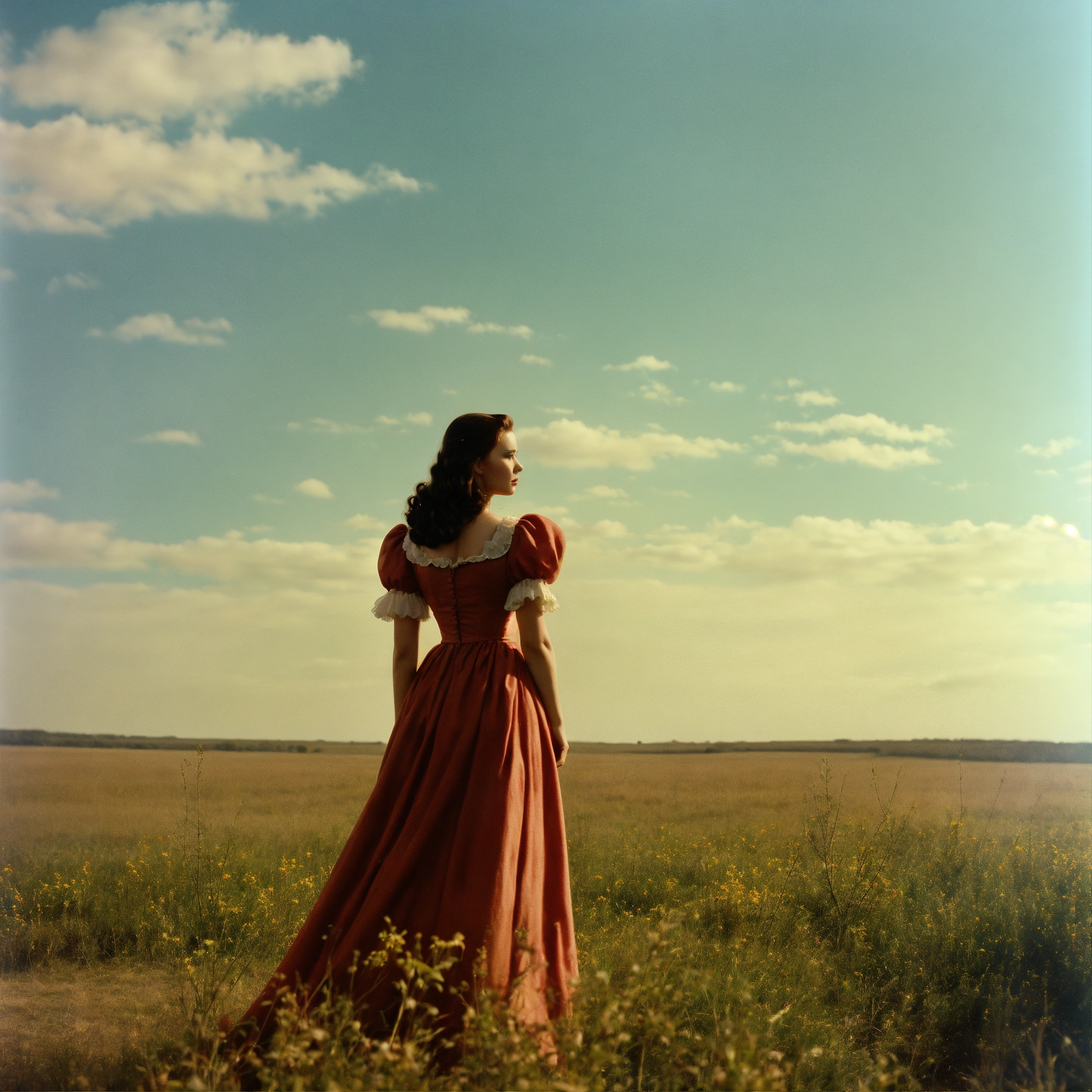 A photographic film still from gone with the wind, scarlett o'hara standing in a vast field looking into the distance, rear view, shot from below, wes anderson colours