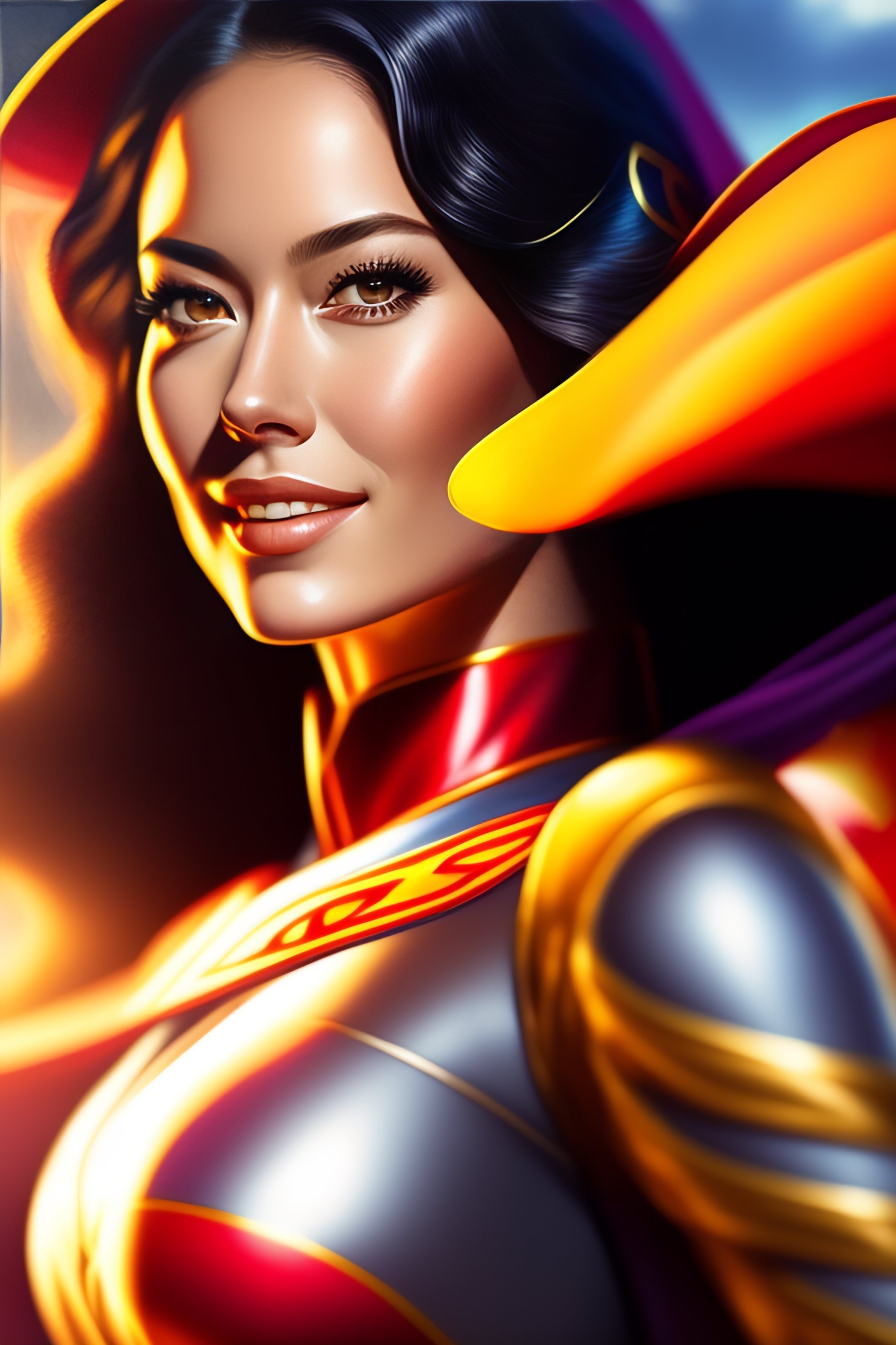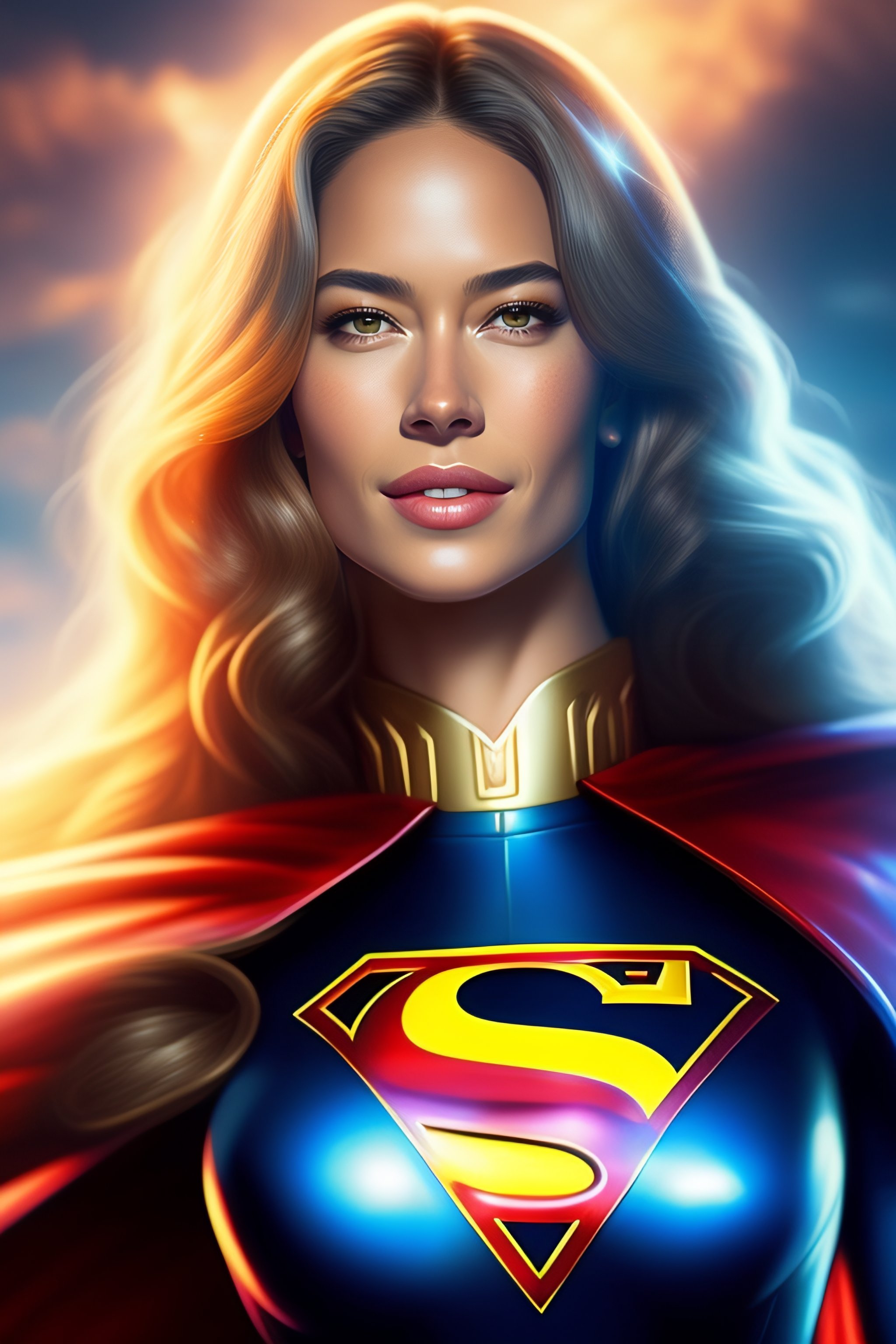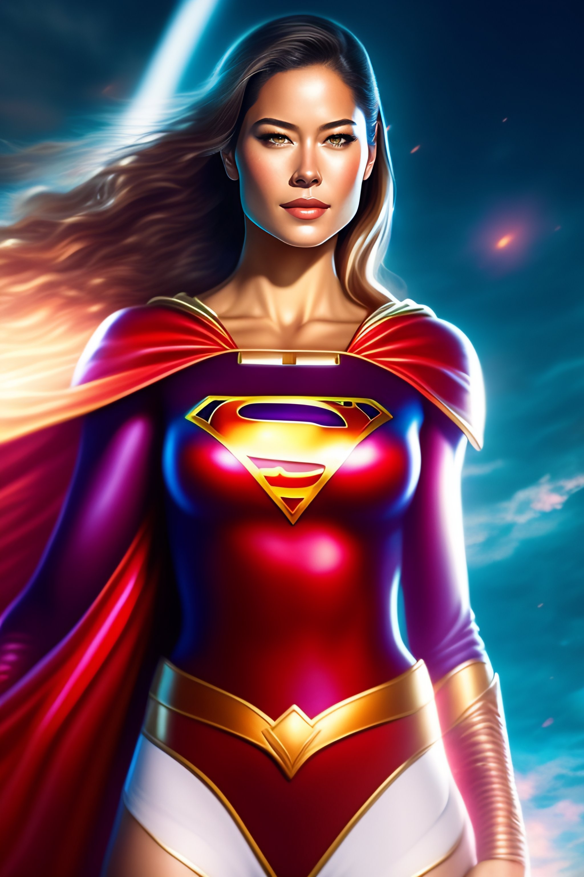 Ultra realistic, beautiful ana ivanovic as supergirl dc comics waist up floating, on stage, symmetrical face symmetrical eyes, smiling, modern anime, fantasy, eerie, intricate details, atmospheric, elegant, super highly detailed, professional digital painting, artstation, concept art, 8k, art by artgerm and eiichiro oda and koyoharu gotouge