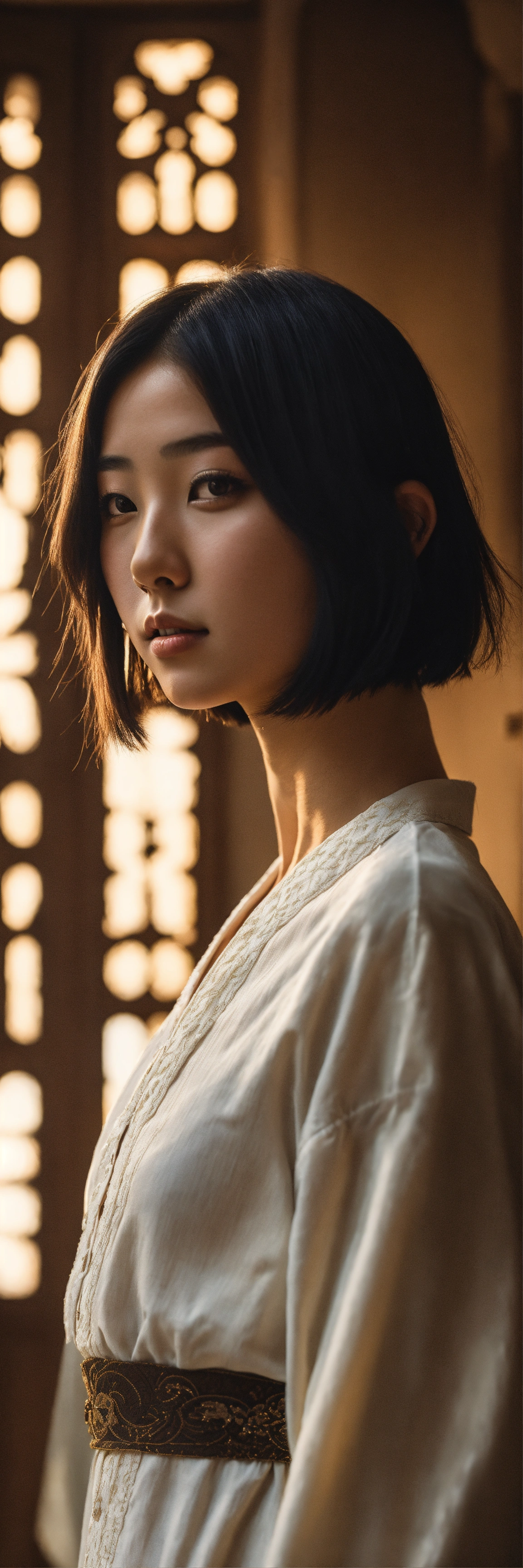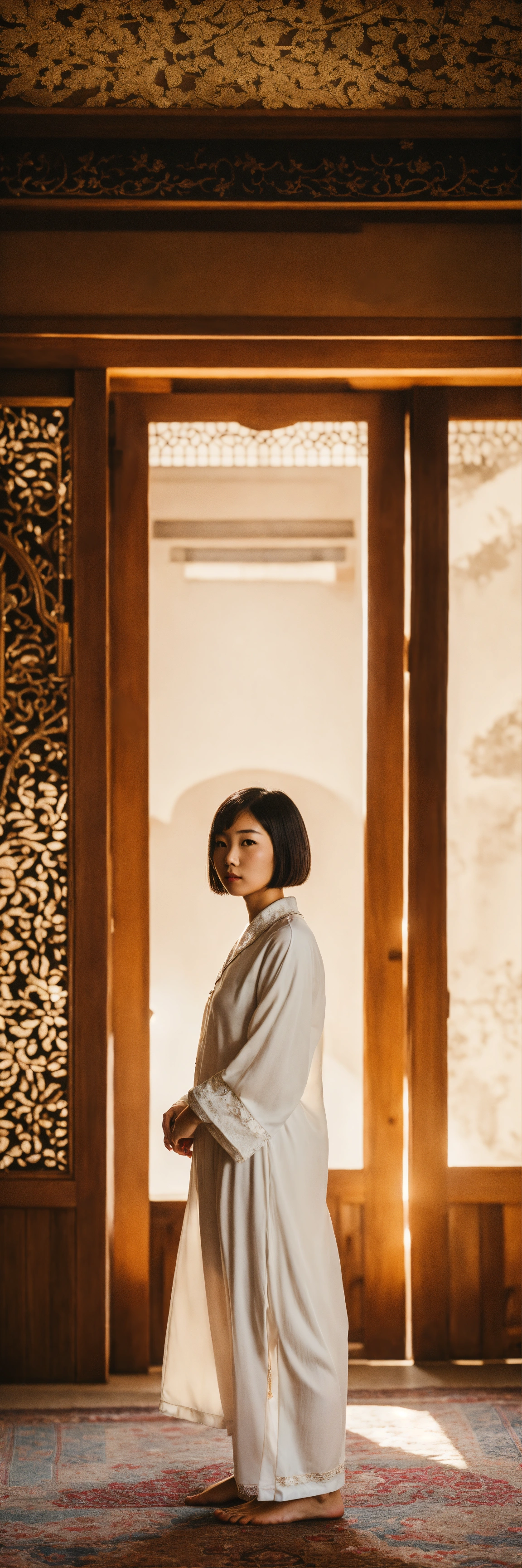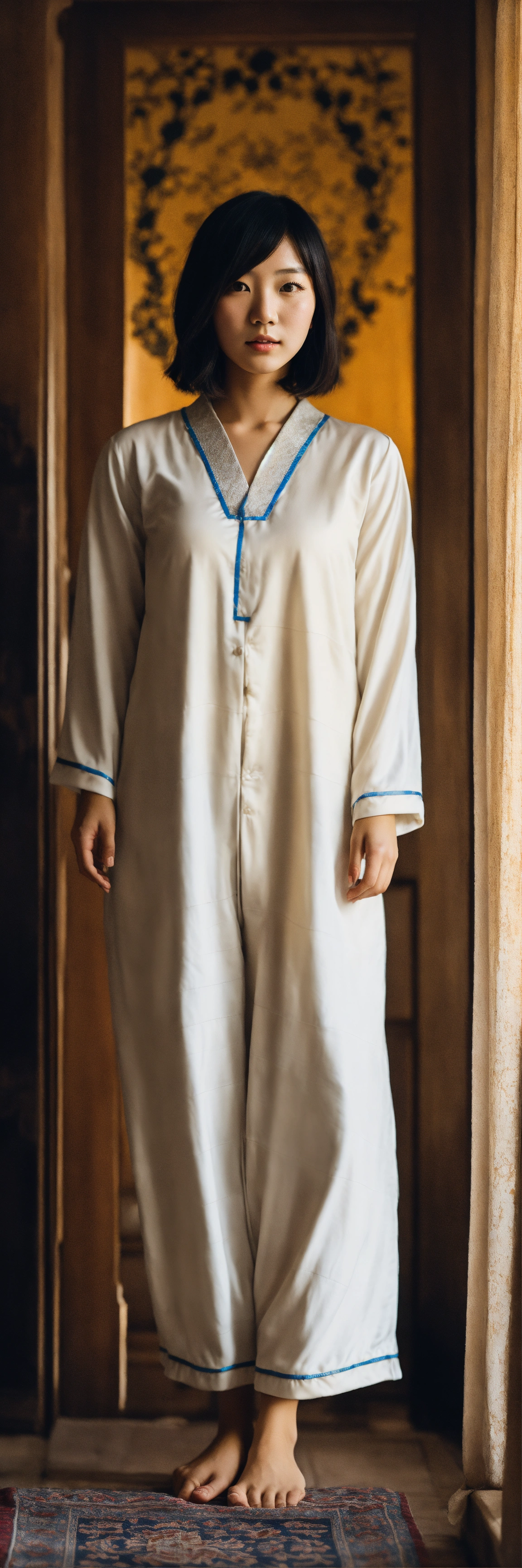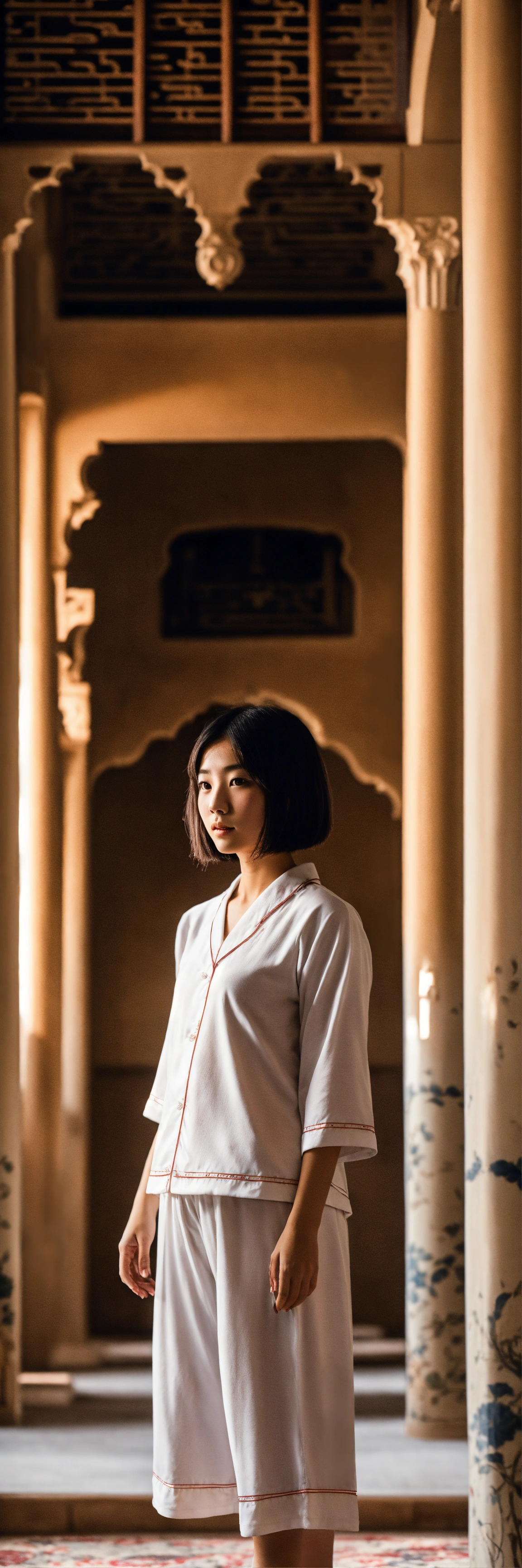 Portrait of an extremely beautiful japanese schoolgirl with bob cut hair, wearing white short european pajamas, standing in a vintage house in yazd with neutral tones, highly detailed, 32k resolution, cinematic lighting, dramatic lighting, vertical shot, iranian architecture, persian culture background.