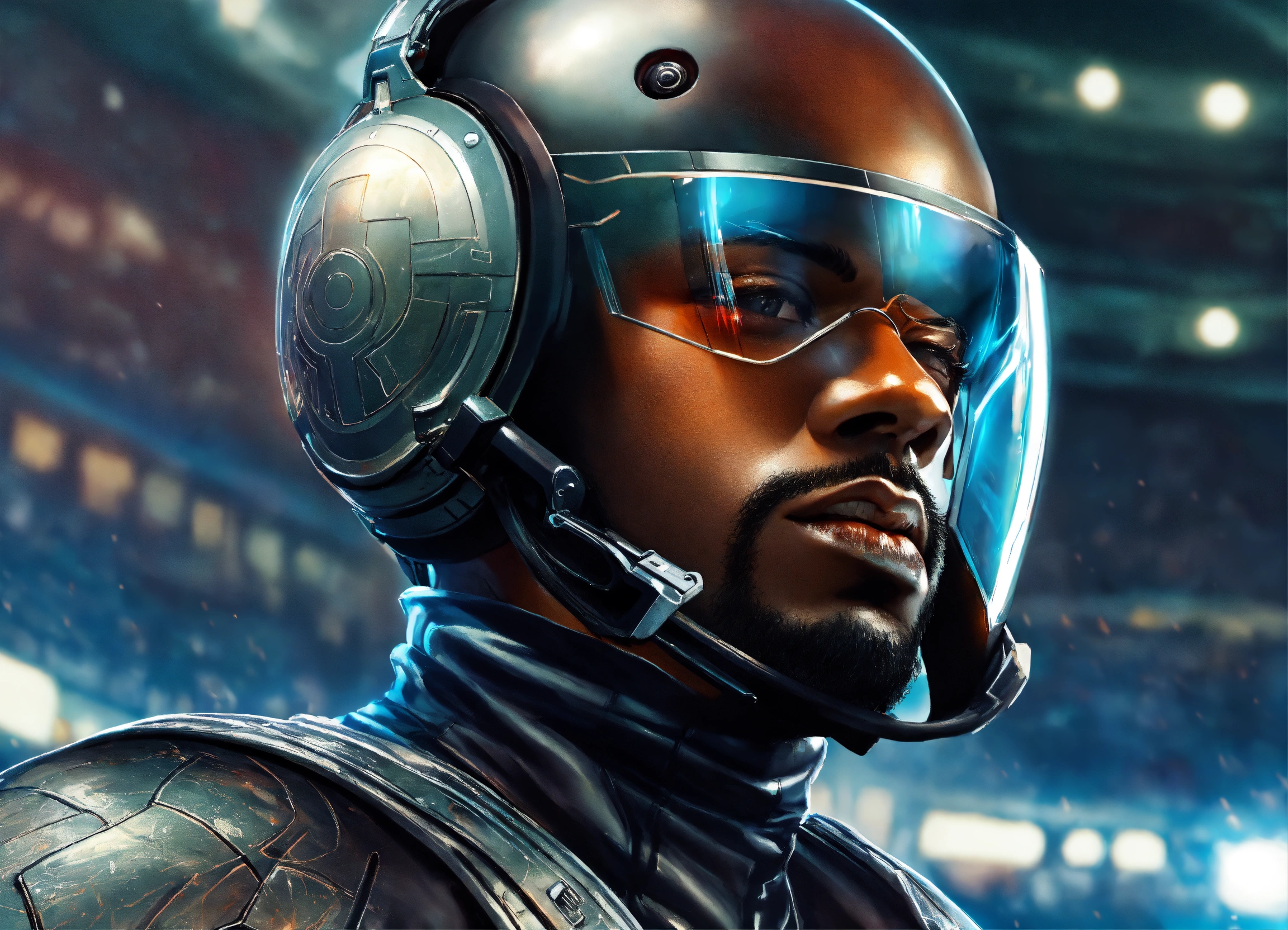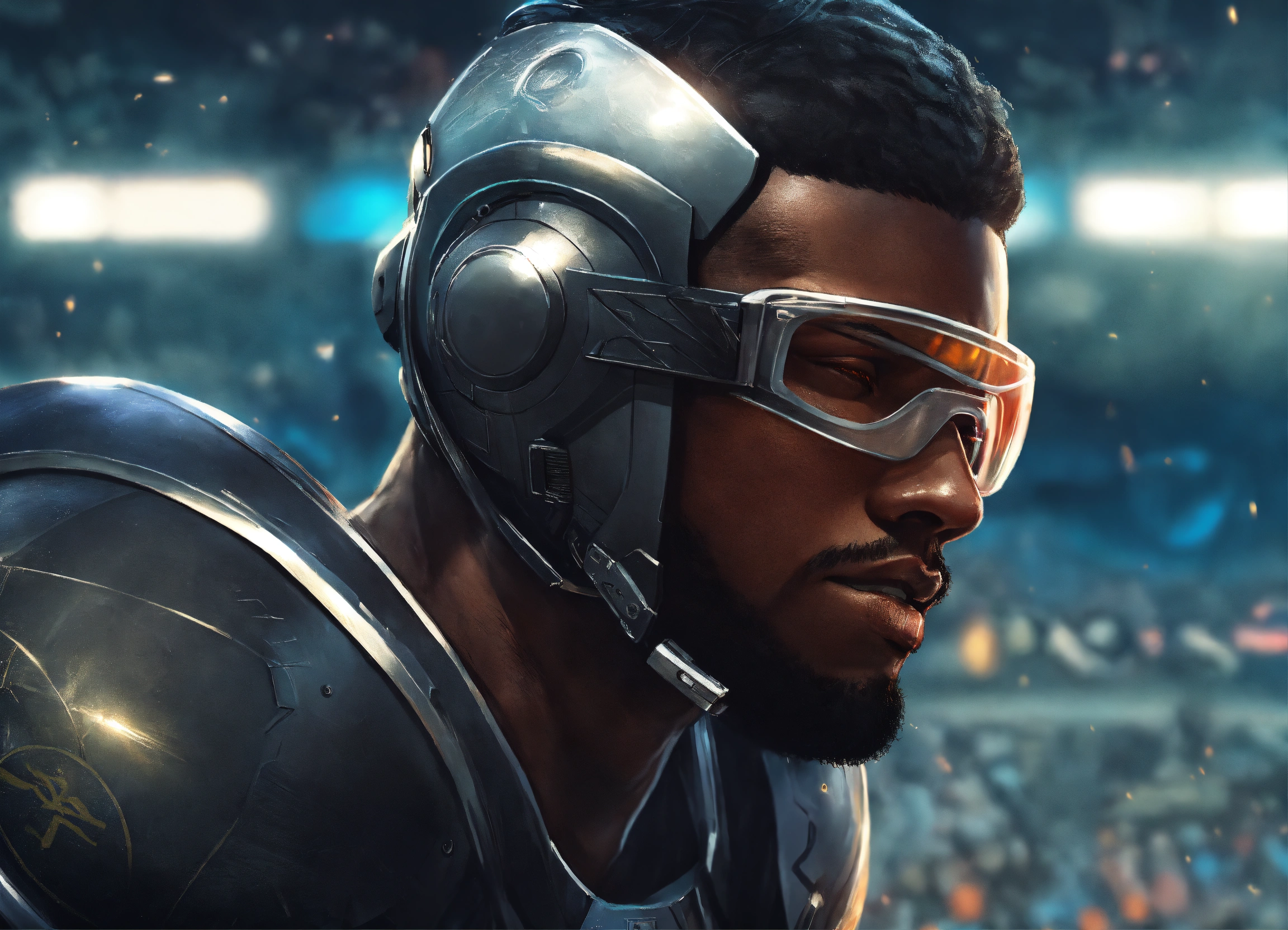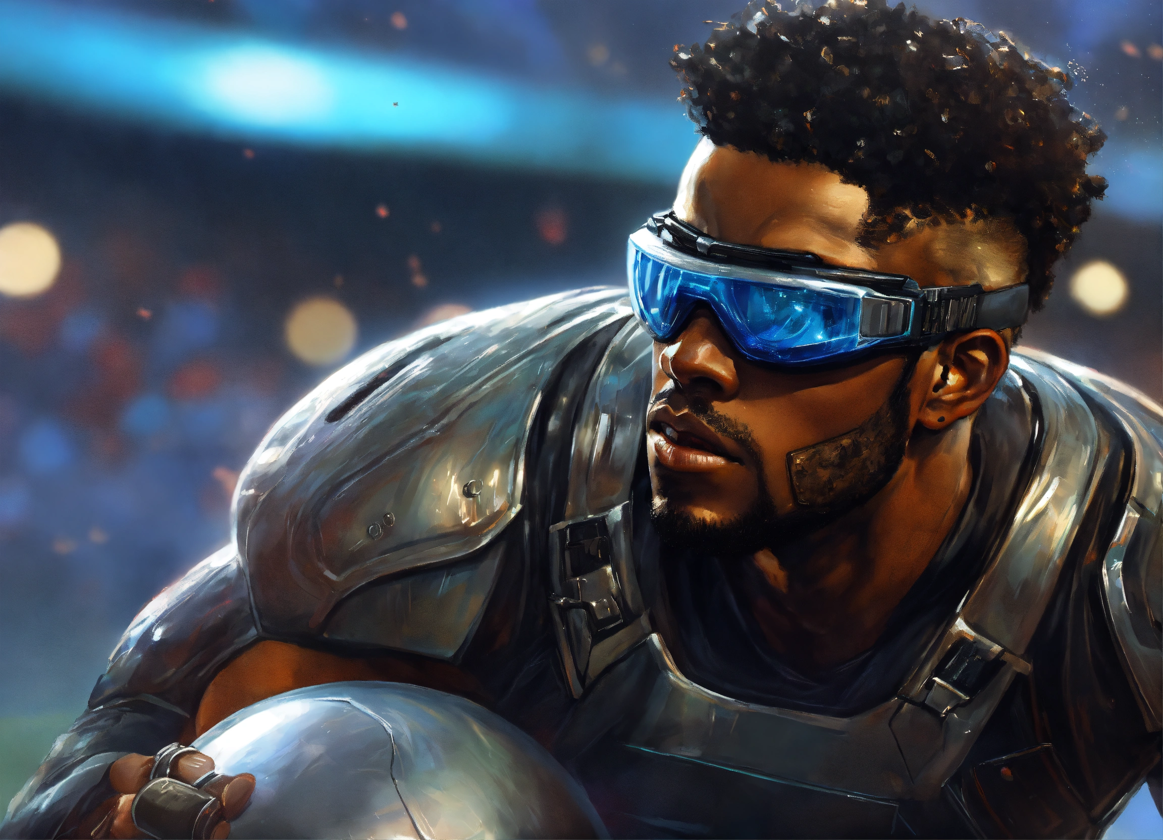 Close up, muscular black male defiant speedball scifi player on a steel game field, scifi stadium background, laying unconcious on the ground after being tackled, closed eyes, wearing a retro futuristic spandex sport uniform black and silver, wearing cyberpunk glasses, highly detailed, scifi, fantasy, speedball, rollerball, fantasy football, art by donnato giancola, greg rutkowsky