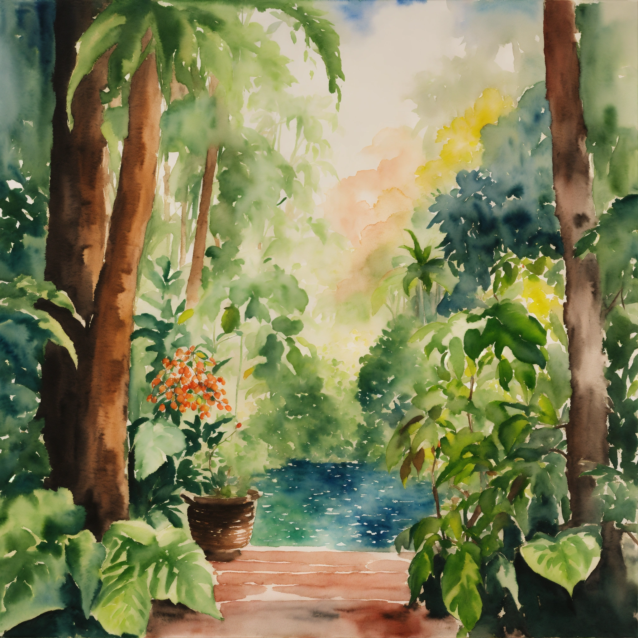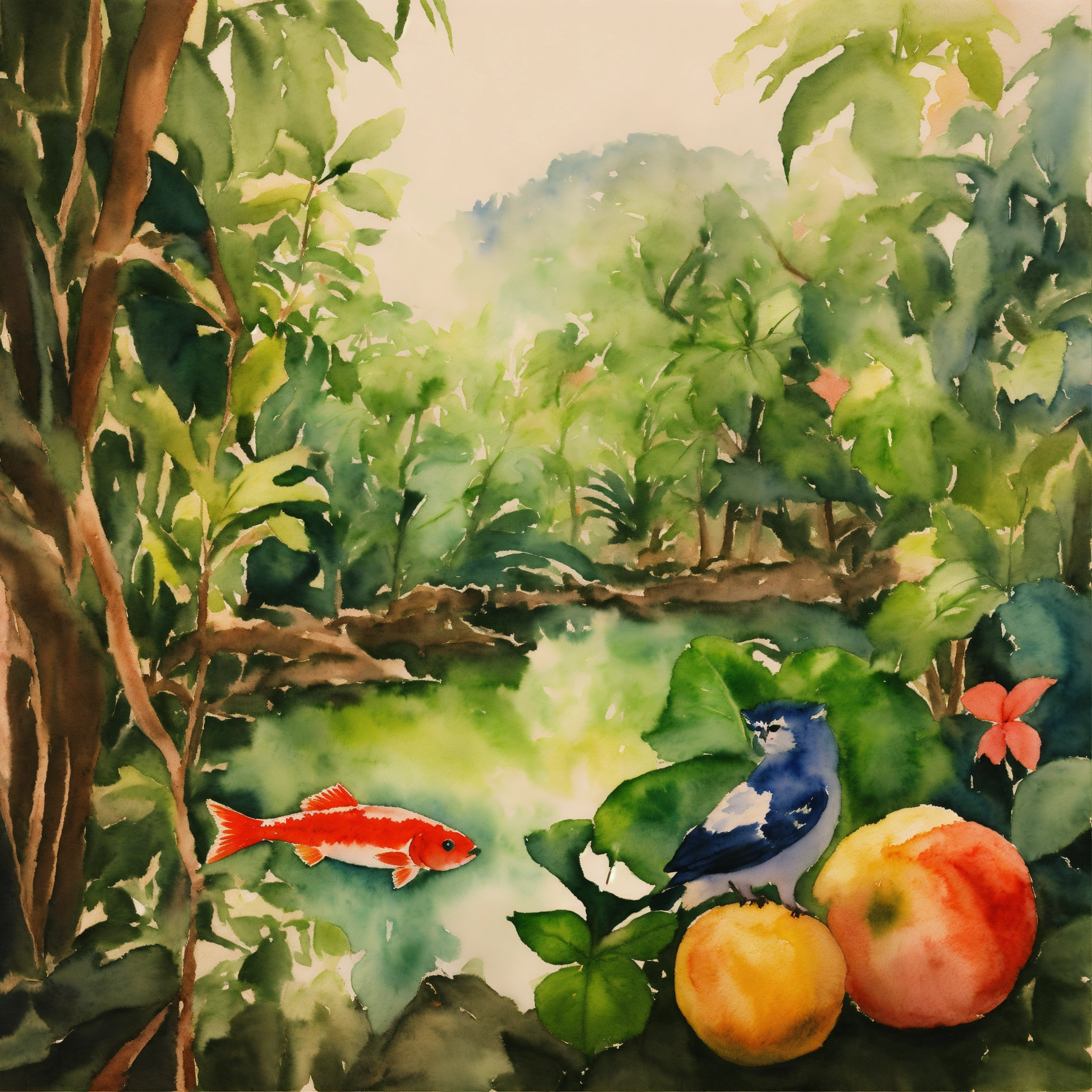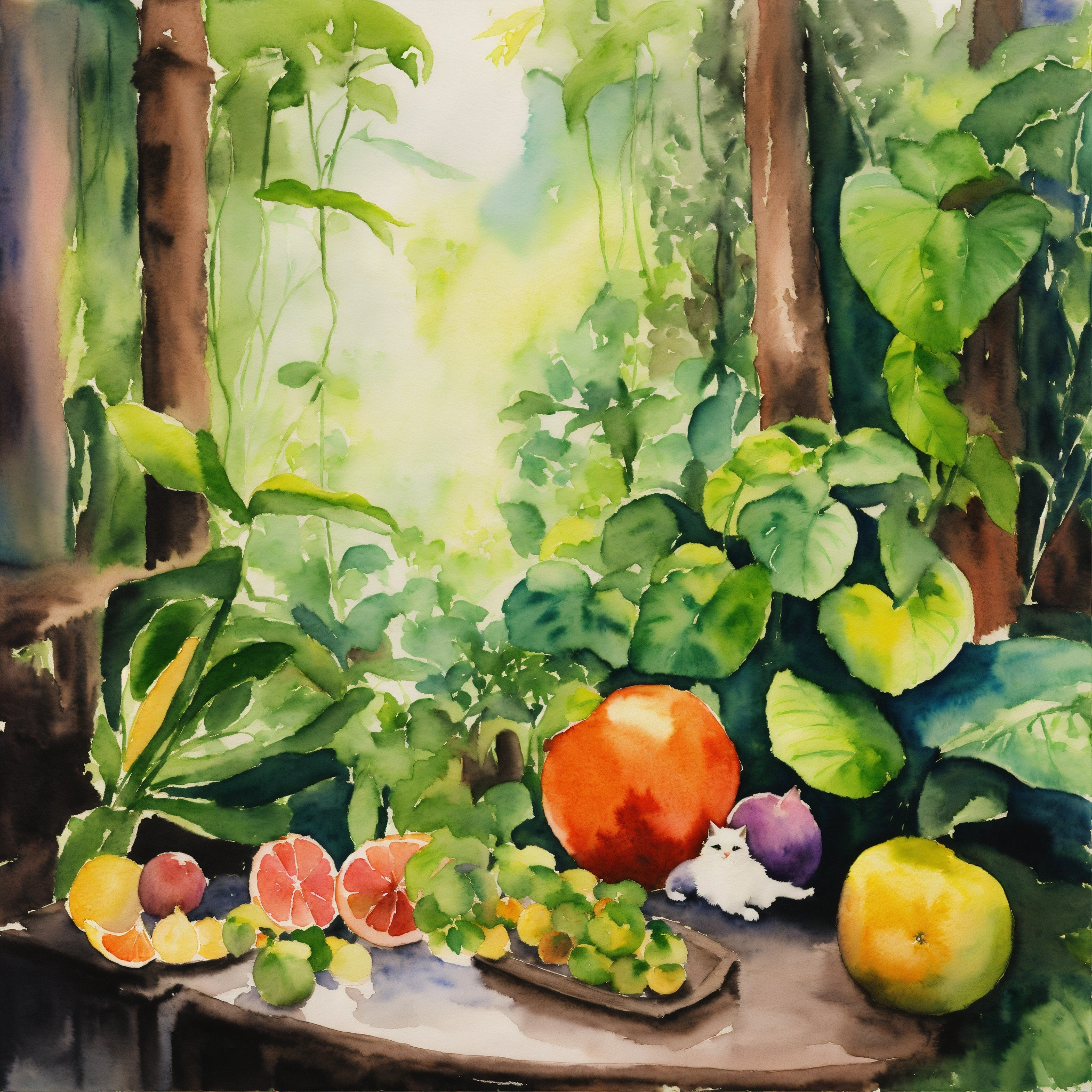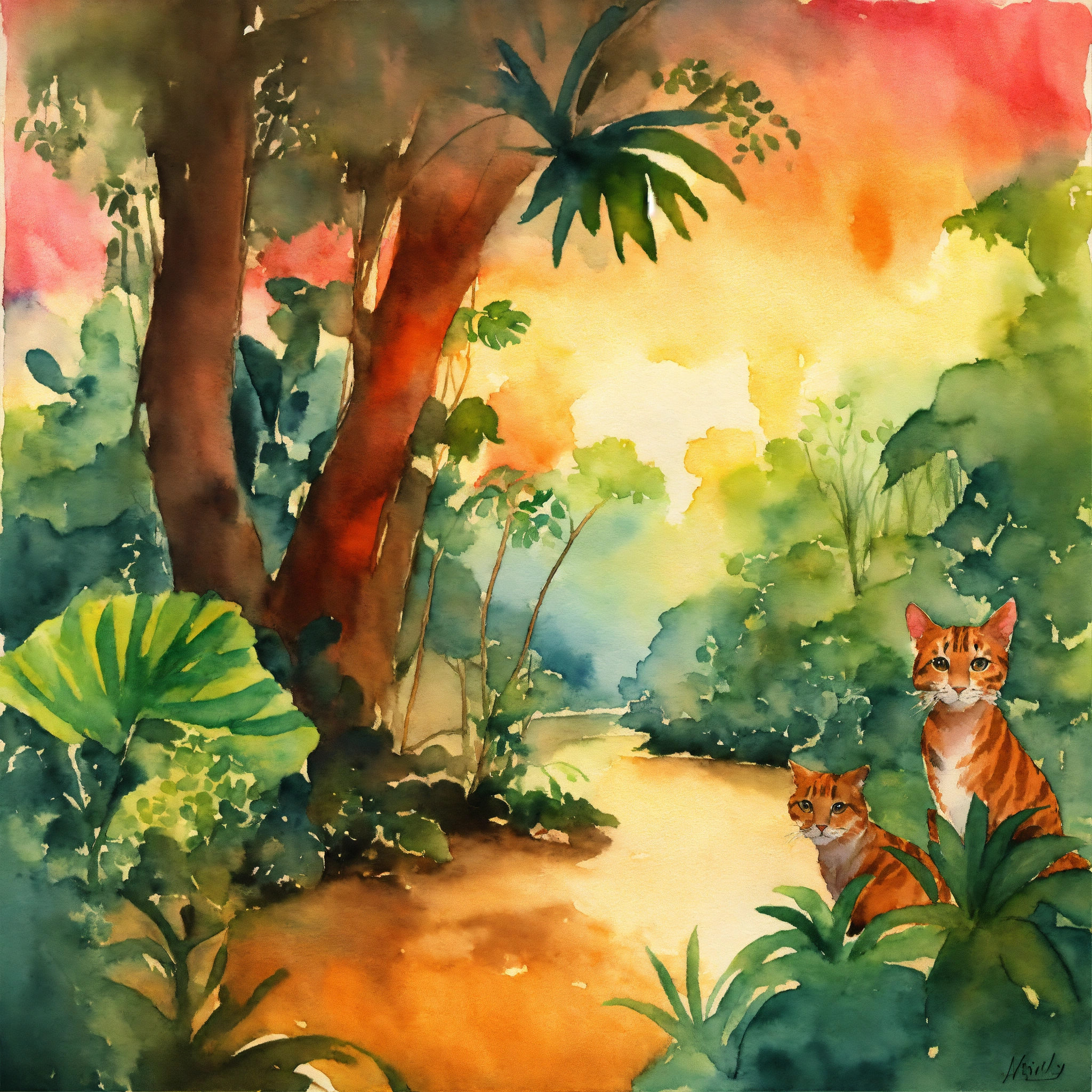 Amateur watercolor painting, high school art, basic watercolor, simple watercolor on canvas, vivid colors, bright colors, rainforest, bad art, simple, abstracted, cowboys, big feast, sitting at a table full of food and fruit and fish, cats, sitting cats, kittens, overgrown jungle, vines, leaves, lush, dense rainforest, streams, mist, soft glow, highly detailed, complex, vines, lush, tropical, misty glow