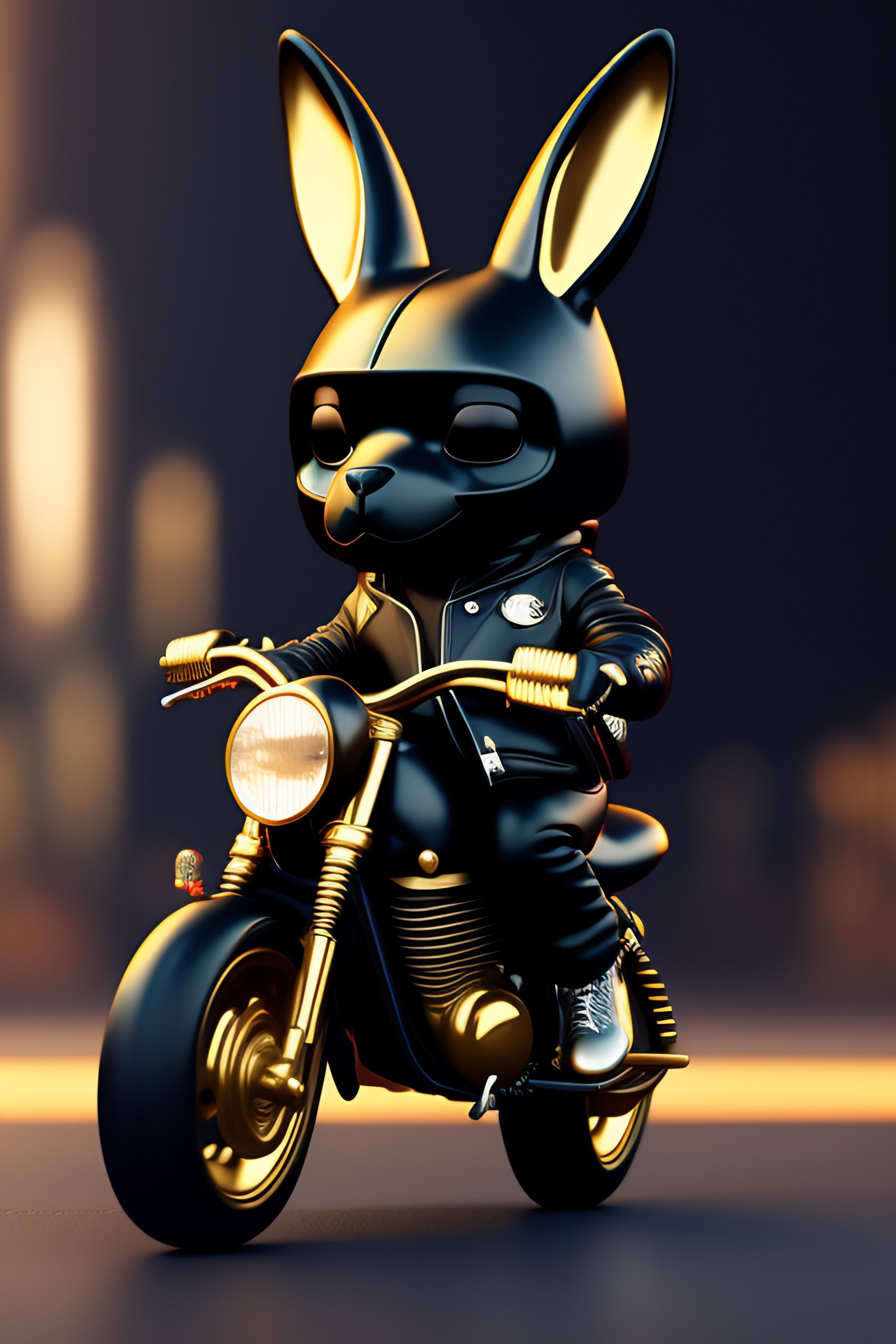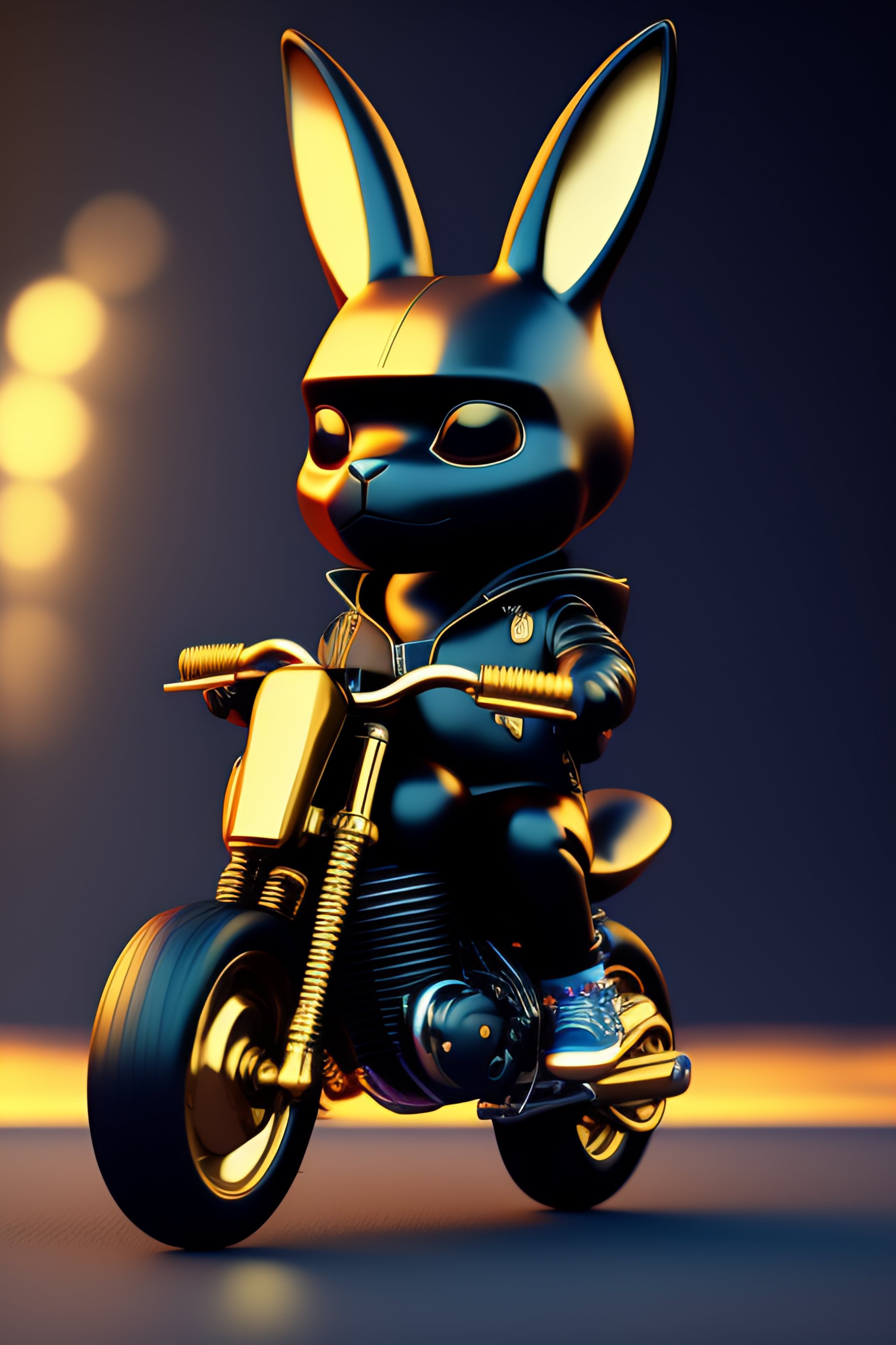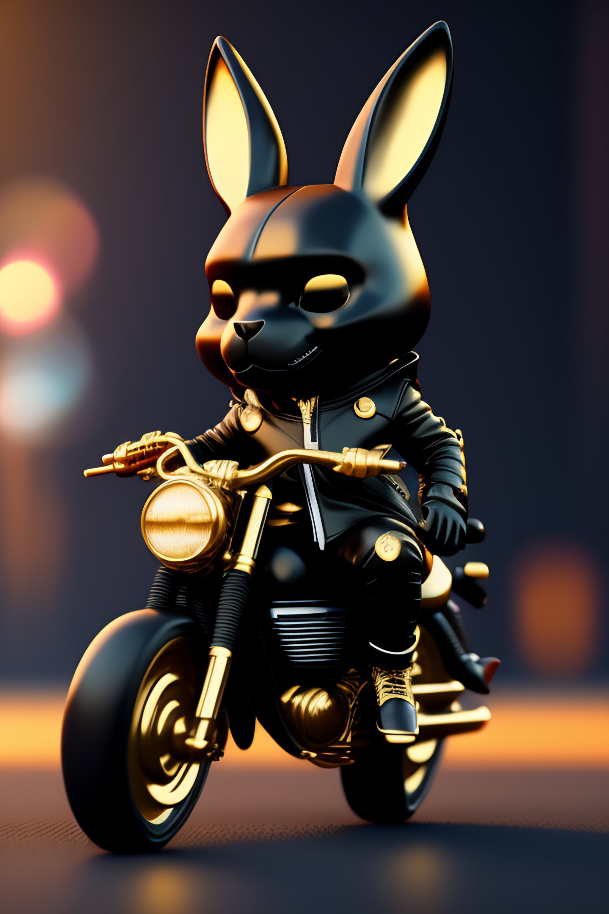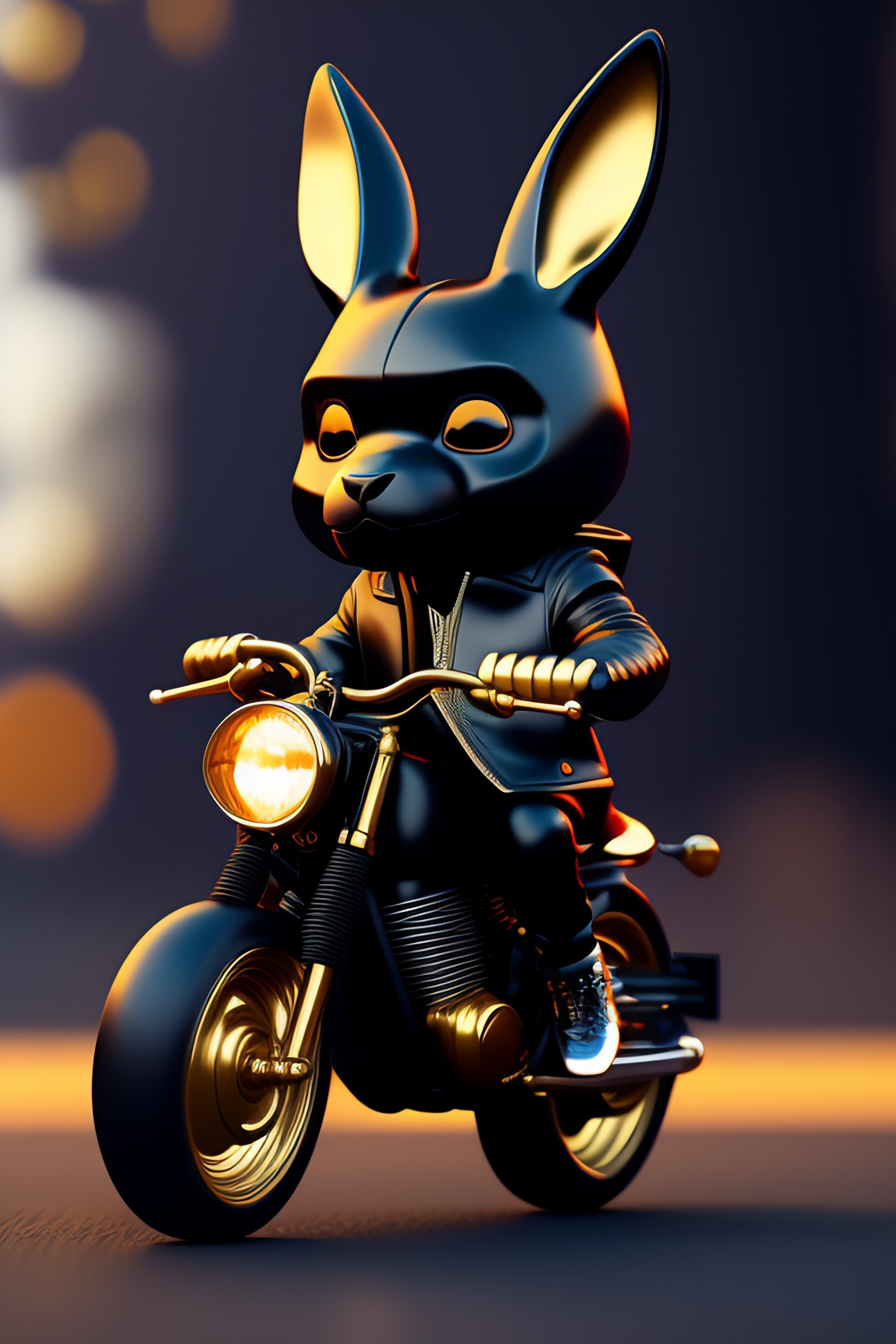 Black humanoid rabbit with large white eyes leather jacket, ripped skinny jeans and gold front teeth riding a suzuki 3d render jamie hewitt gorillaz style