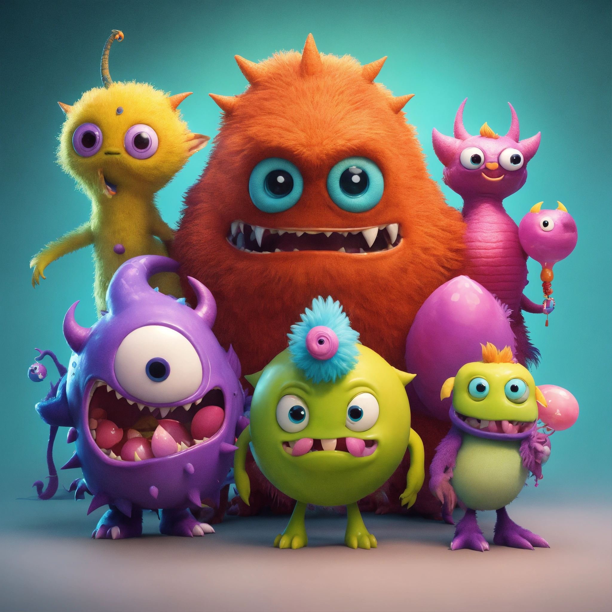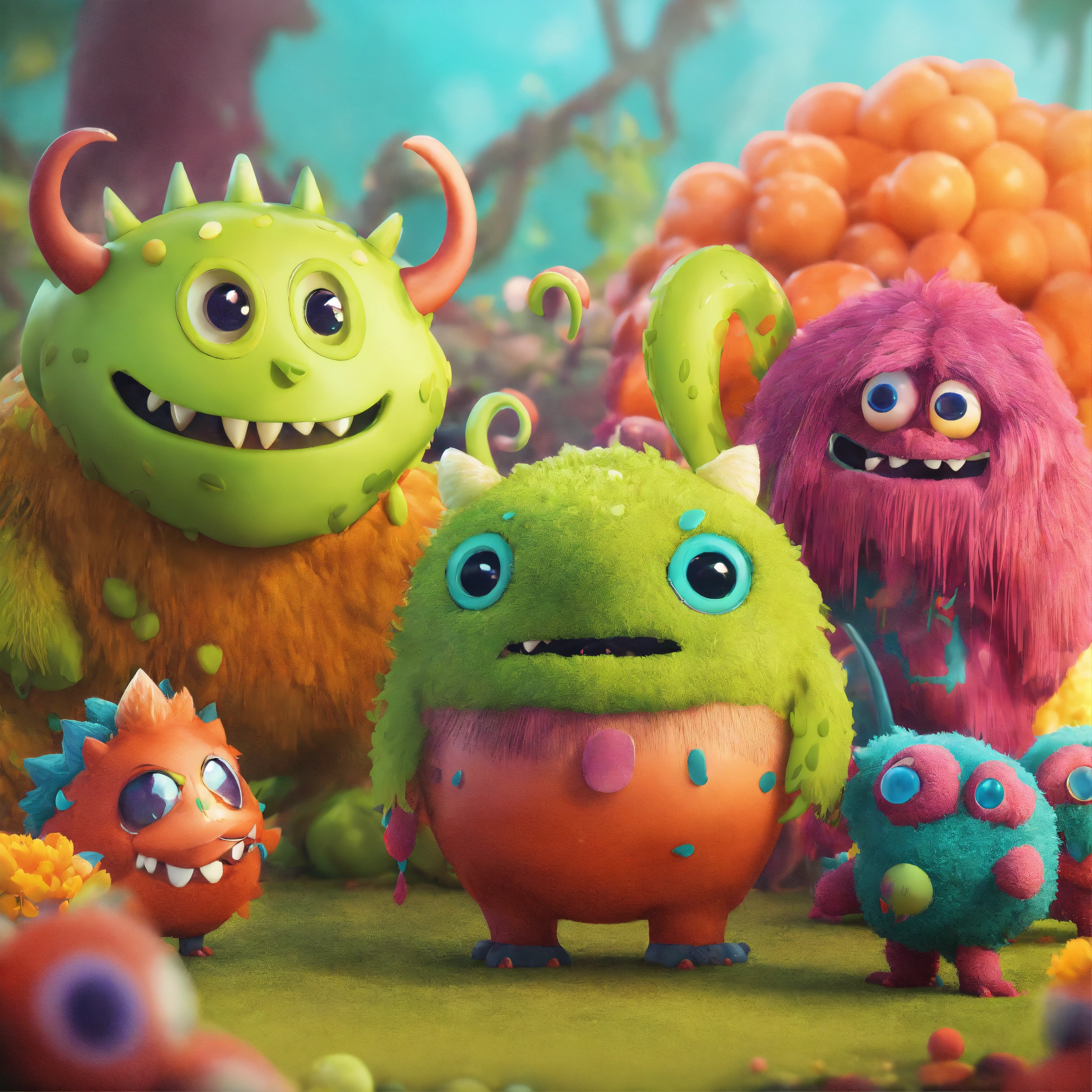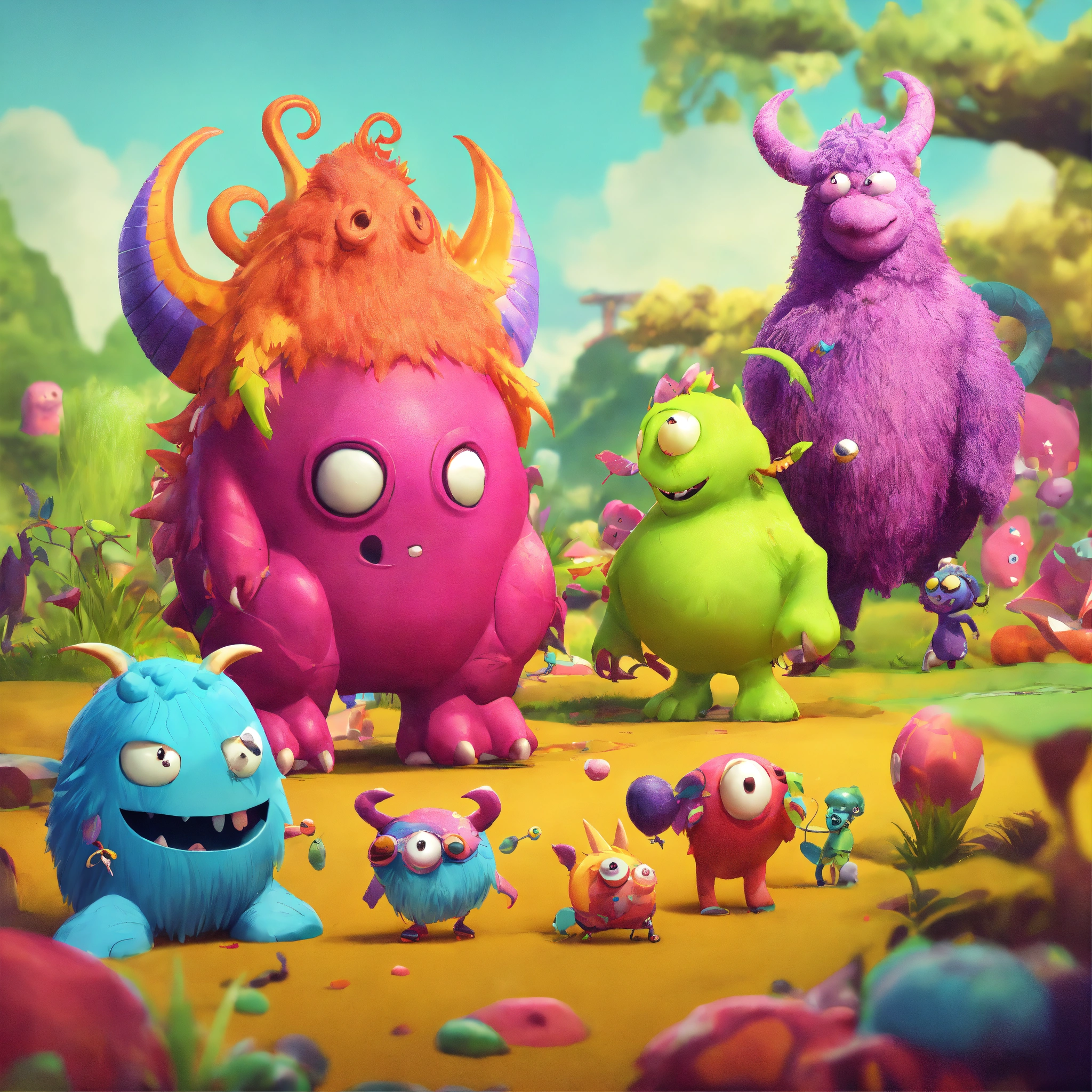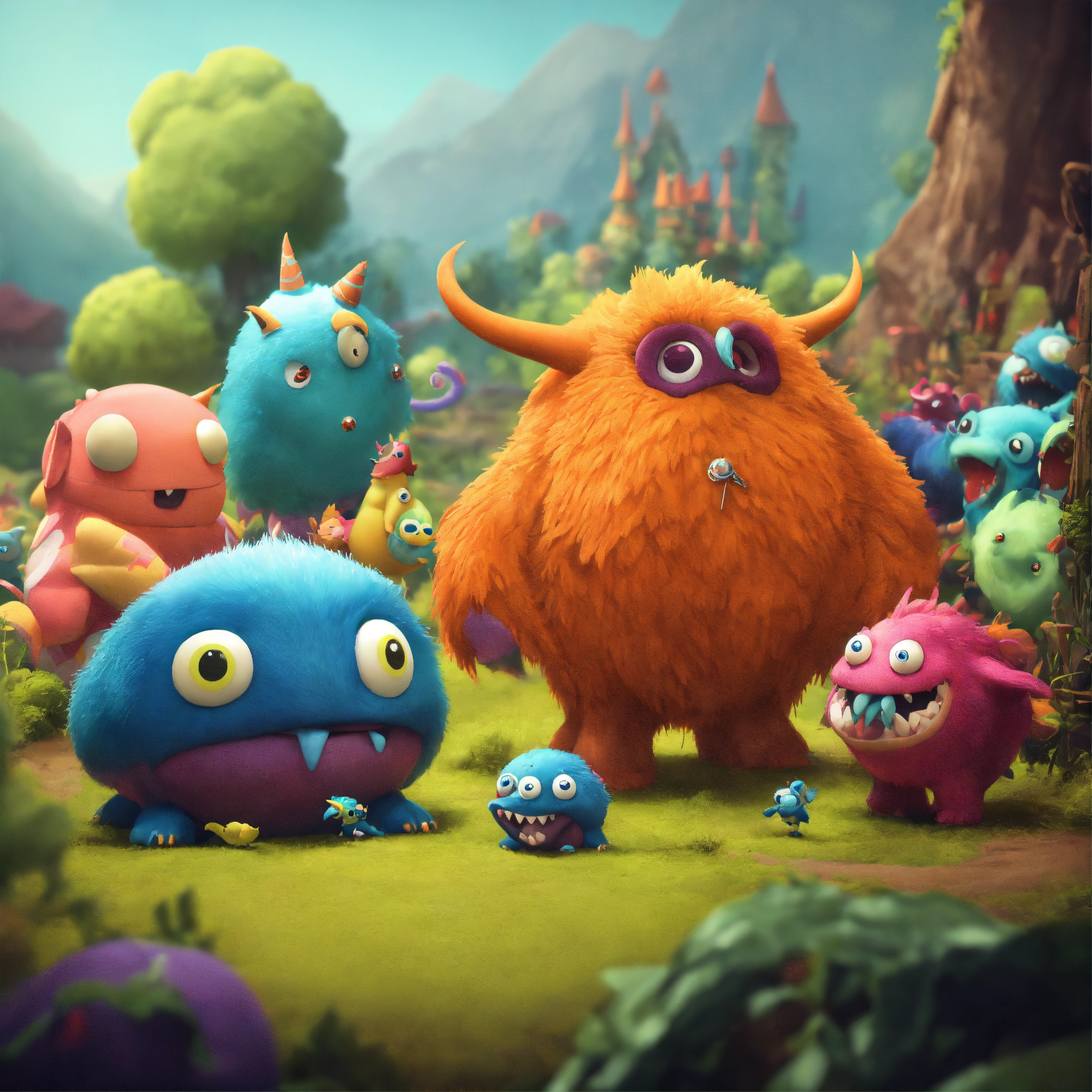 Create 3d-rendered group of monsters, big and small, that are playful and cartoonish. the color palette should be cool with a touch of vibrant creature characteristics. aim for a design synergy that's reminiscent of a pixar-style, yet having a unique charm and softer diffusion. the monsters should all be working a farm/field and the background should have a slight out of focus effect.