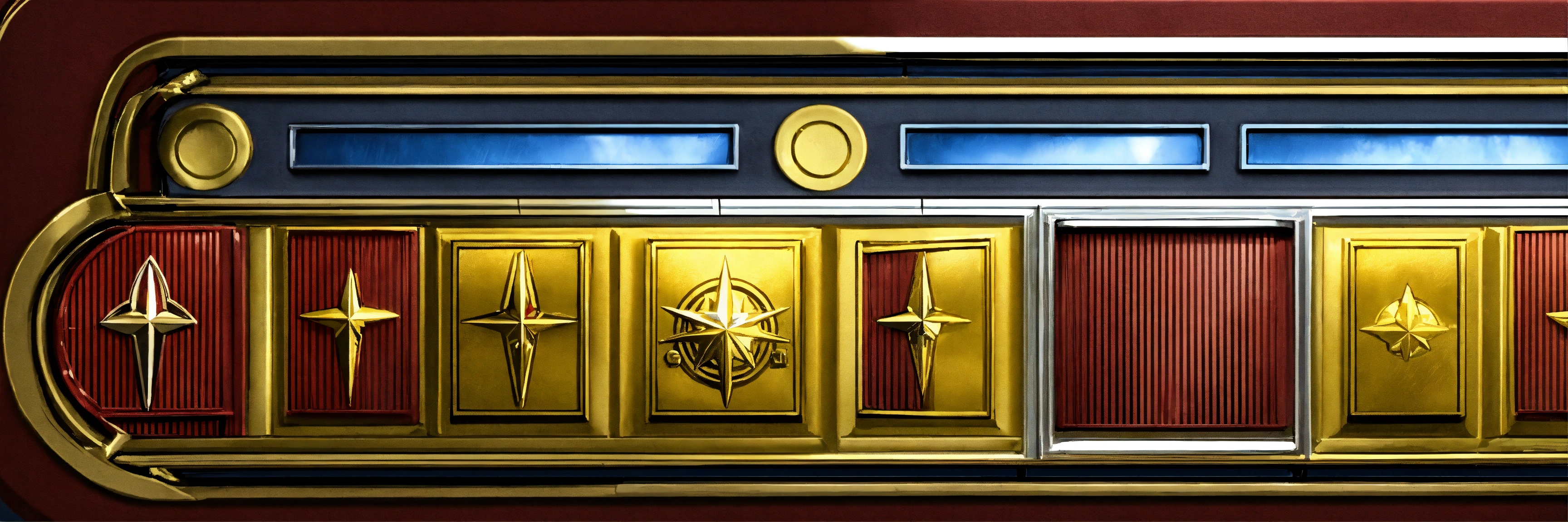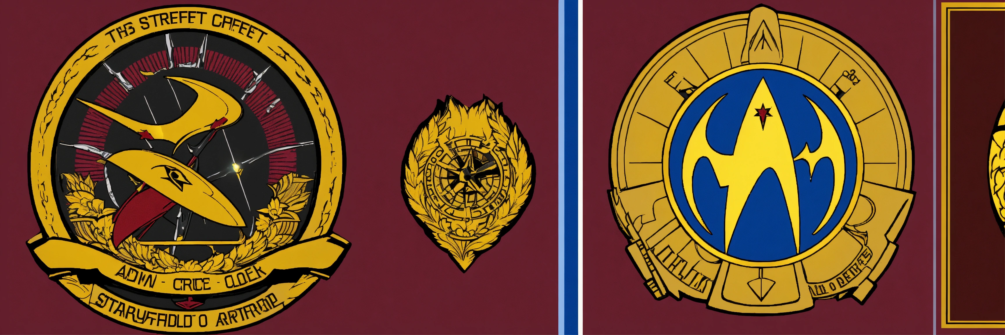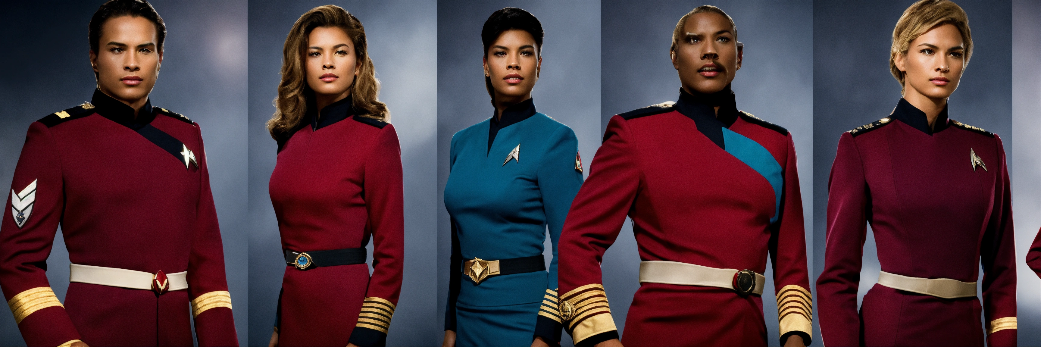 Create an image depicting the crew of a starfleet ship. the crew should consist of men and women wearing 'monster maroon' style uniforms from the movie era. the uniforms should be burgundy (dark red) in color and feature a double-breasted jacket with a black stripe along a sealing mechanism. officers should have a stylized gold rank pin behind the starfleet emblem (the arrowhead) on the left chest, while enlisted personnel should not. all crew members should wear a colored strap over the right shoulder to close the tunic, to which a rank pin is attached. additionally, there must be an andorian among the crew members. all crew members should wear a black belt with a buckle shaped like the starfleet arrowhead enclosed in a circle, all in gold, complete with the original series (tos) starfleet emblem on the buckle.