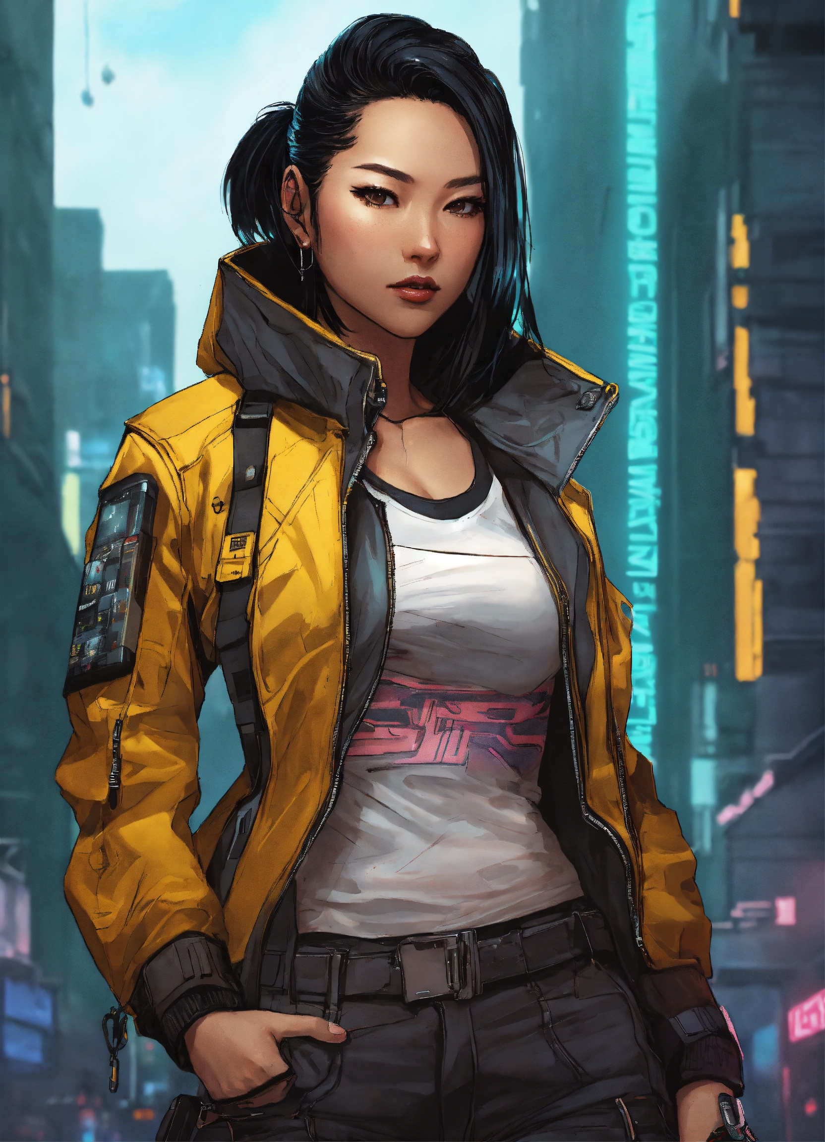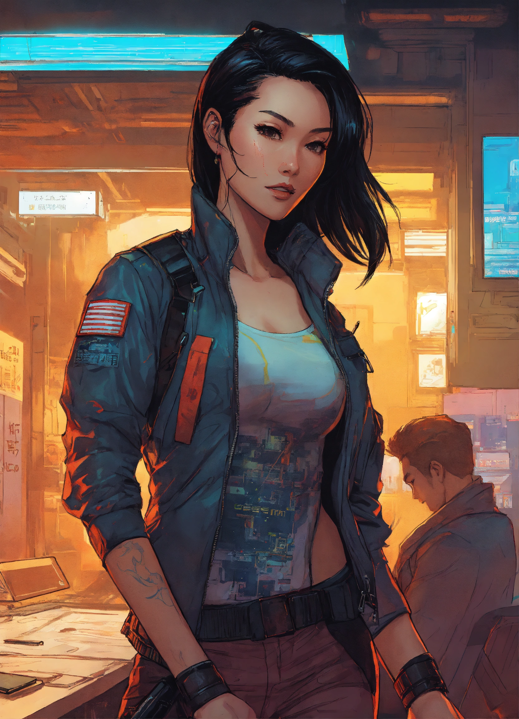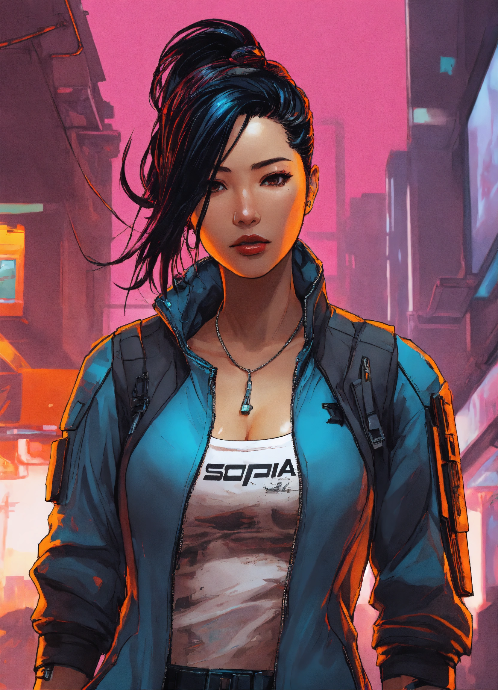 Cyberpunk sophia liu from assassin nation, jacket and half t-shirt, high tech corporate operative in gritty comic book style art.