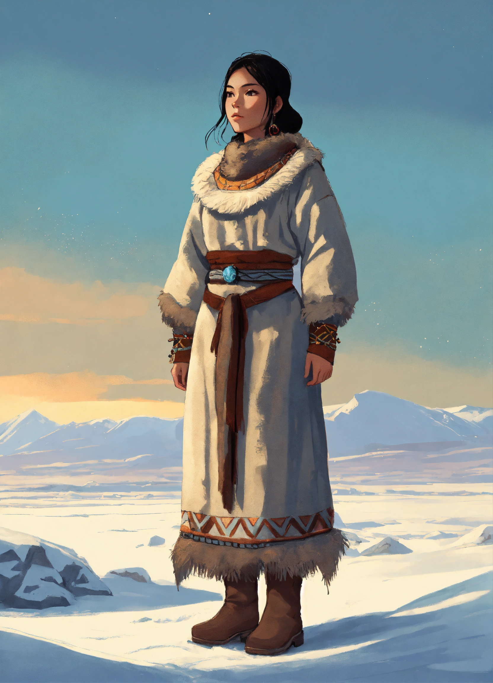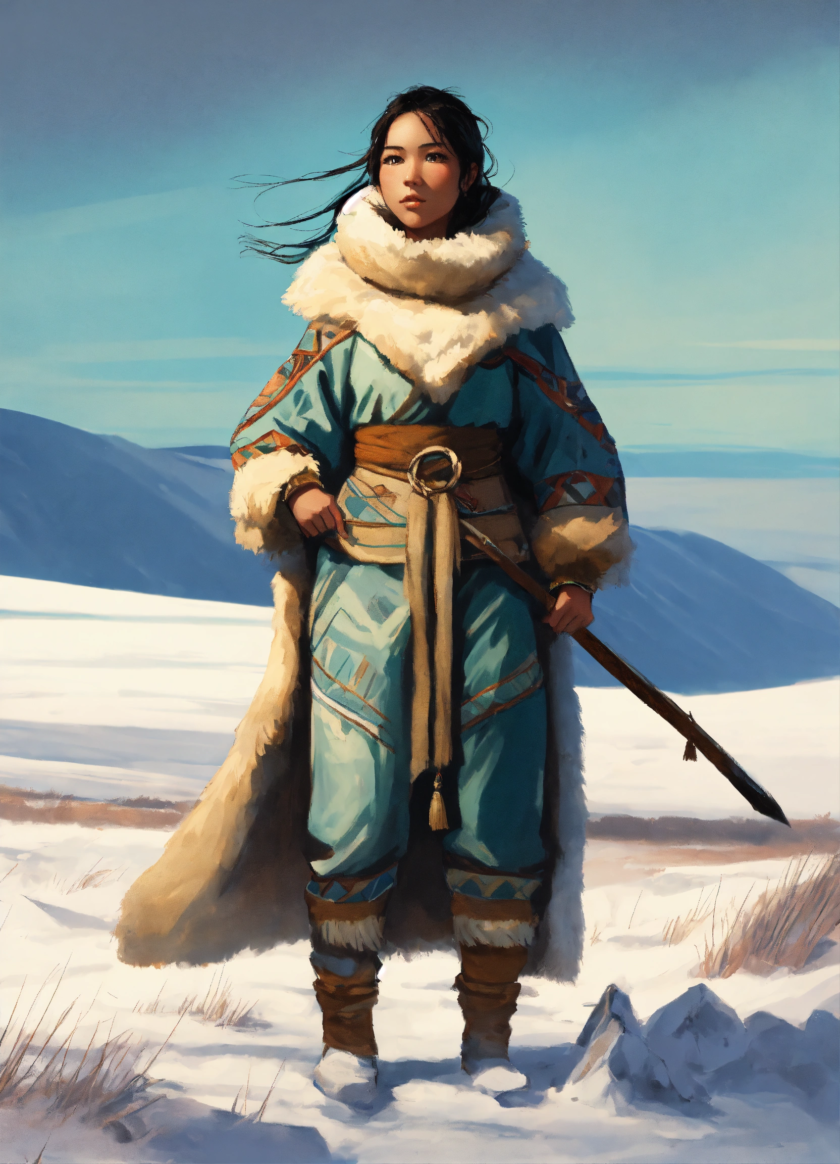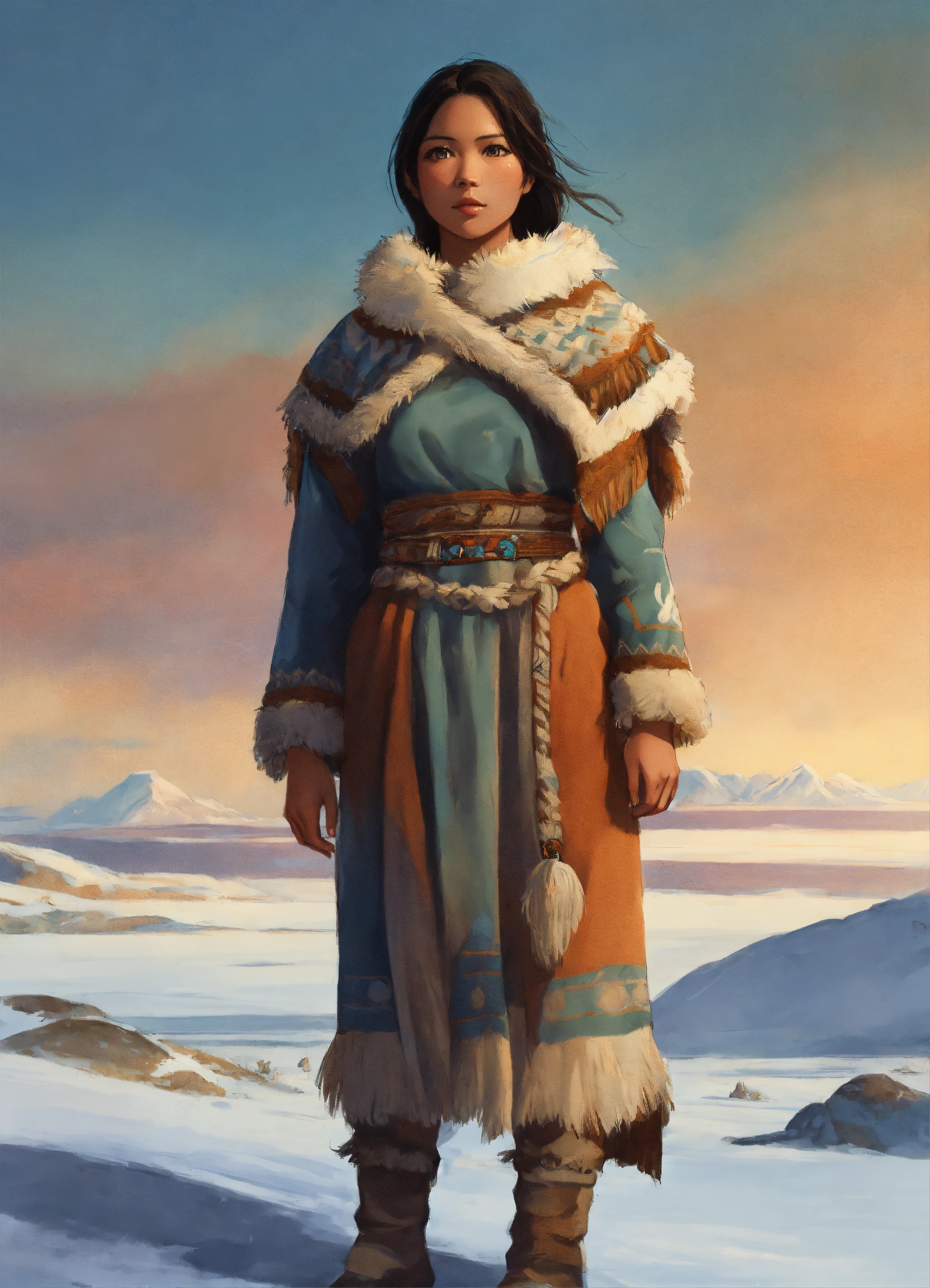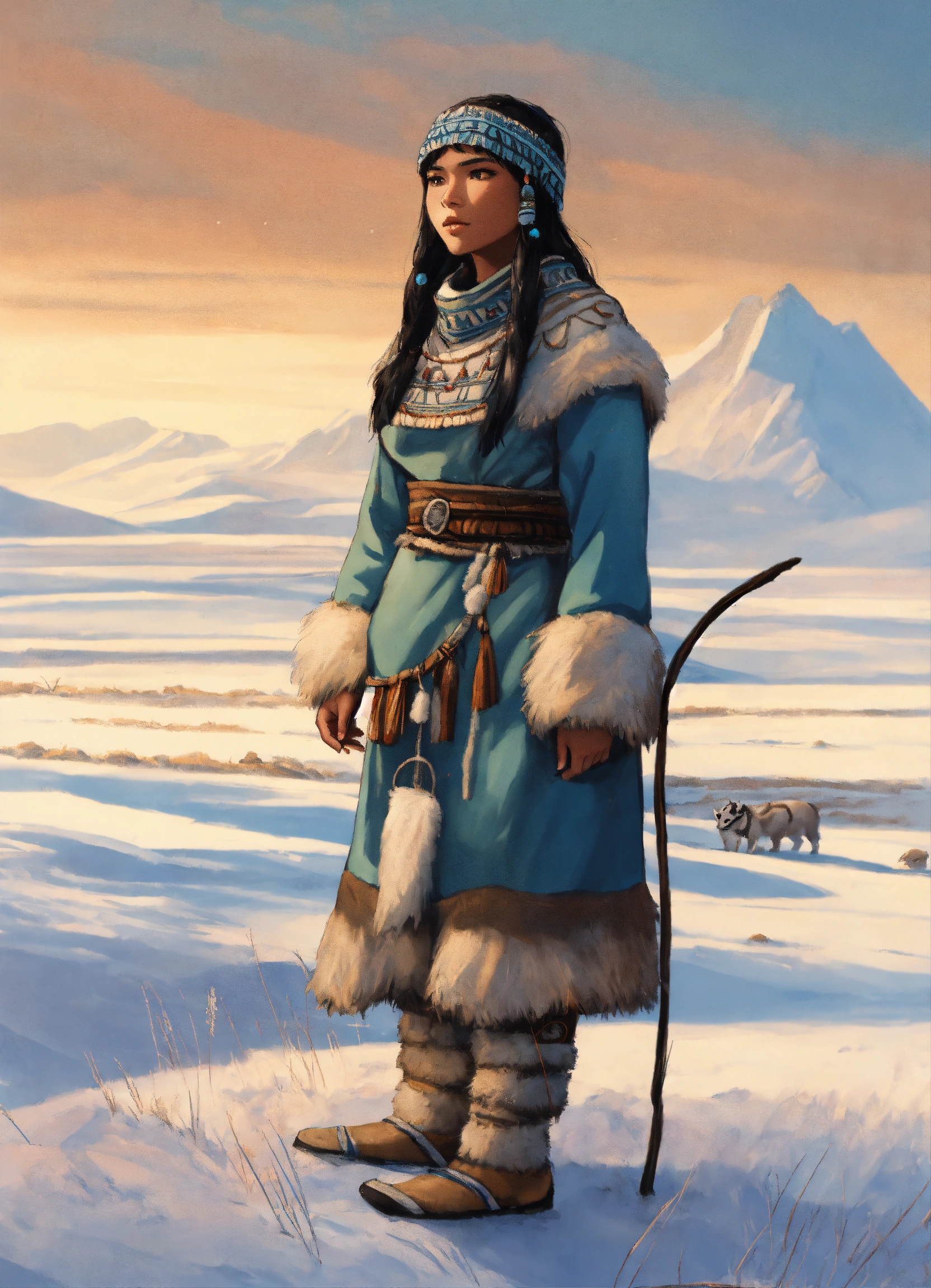 Full body illustration of an inuit woman, young, 18 years old, beautiful, wearing stone age clothing, stading on the tundra steppe, cool colors, artwork by tom björklund