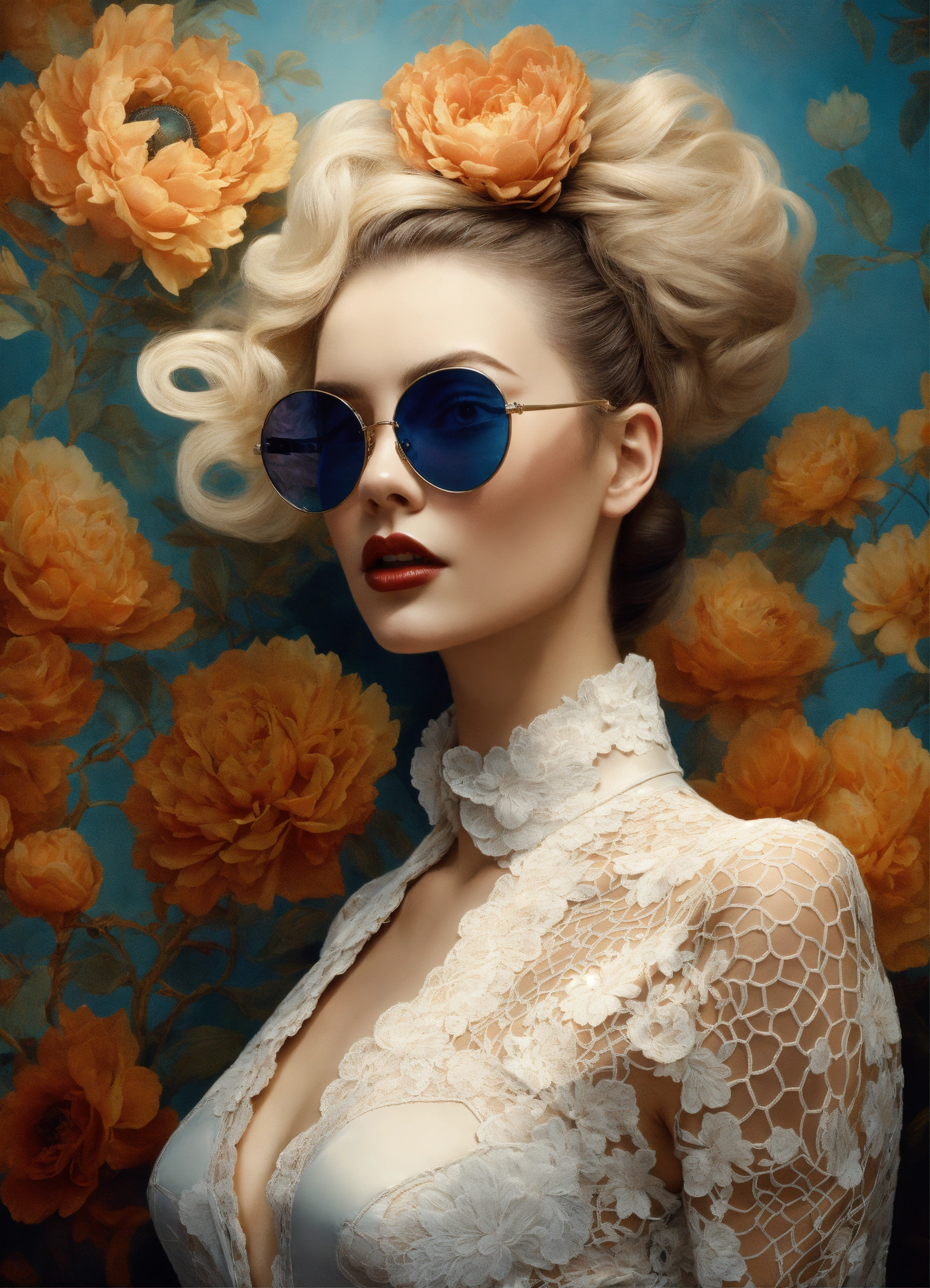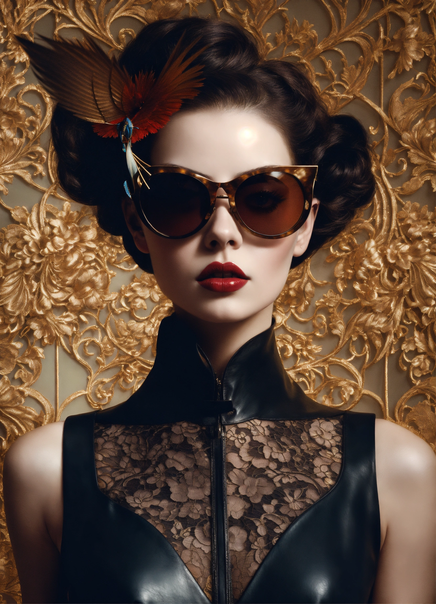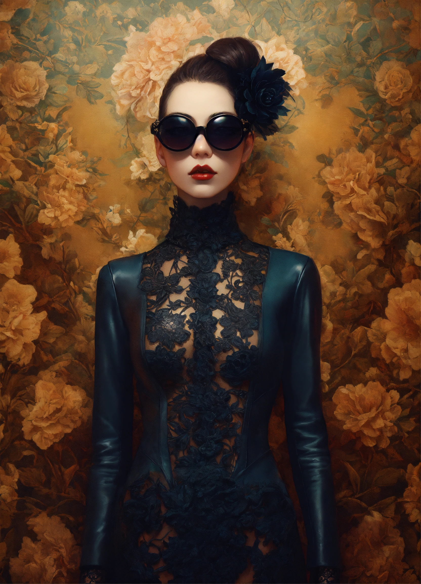 Front profile half body photography, of a sophisticated elegant woman in a leather lace dress, and big sunglasses, bird's eye view, art by sergio lopez, natalie shau, james jean and salvador dali